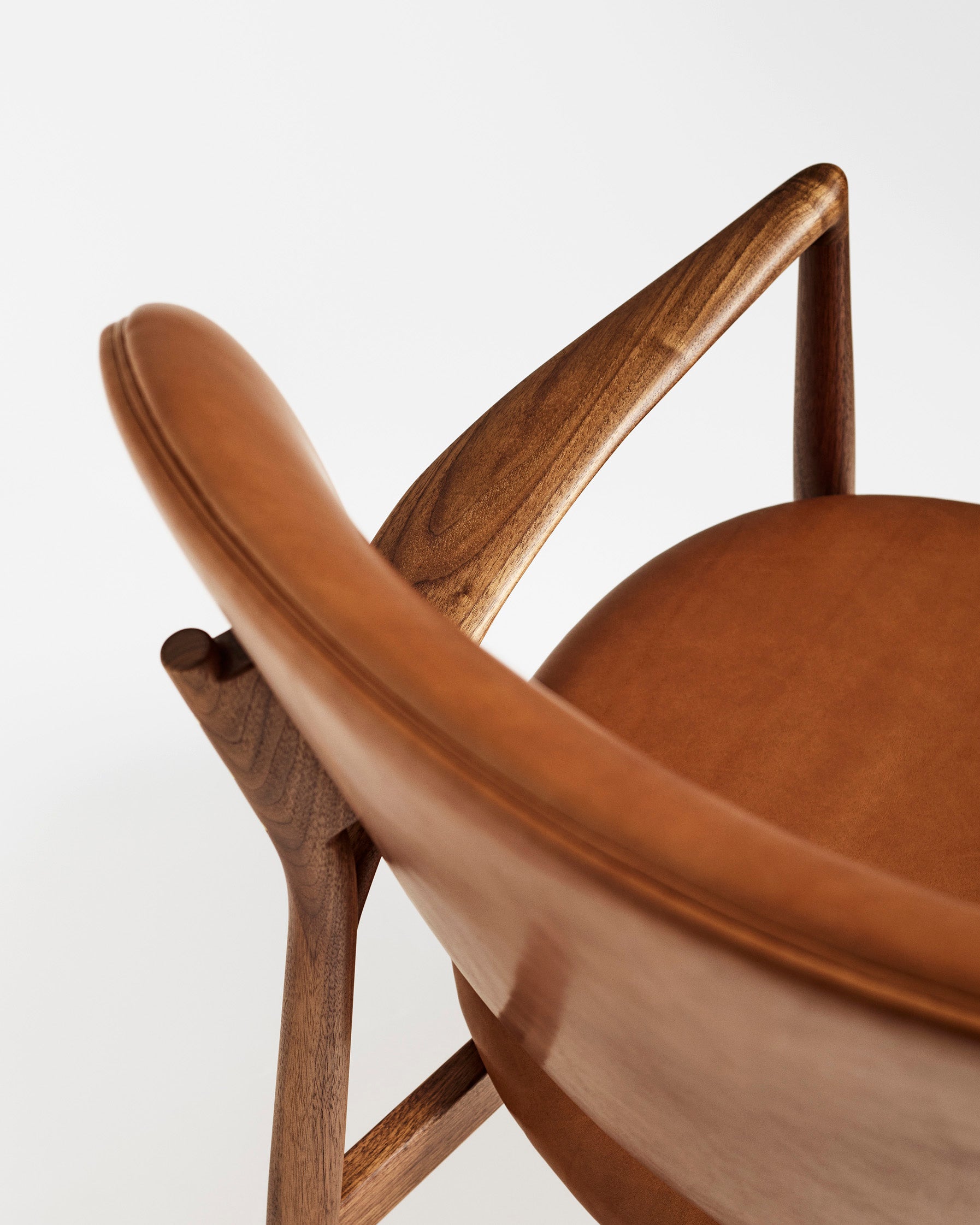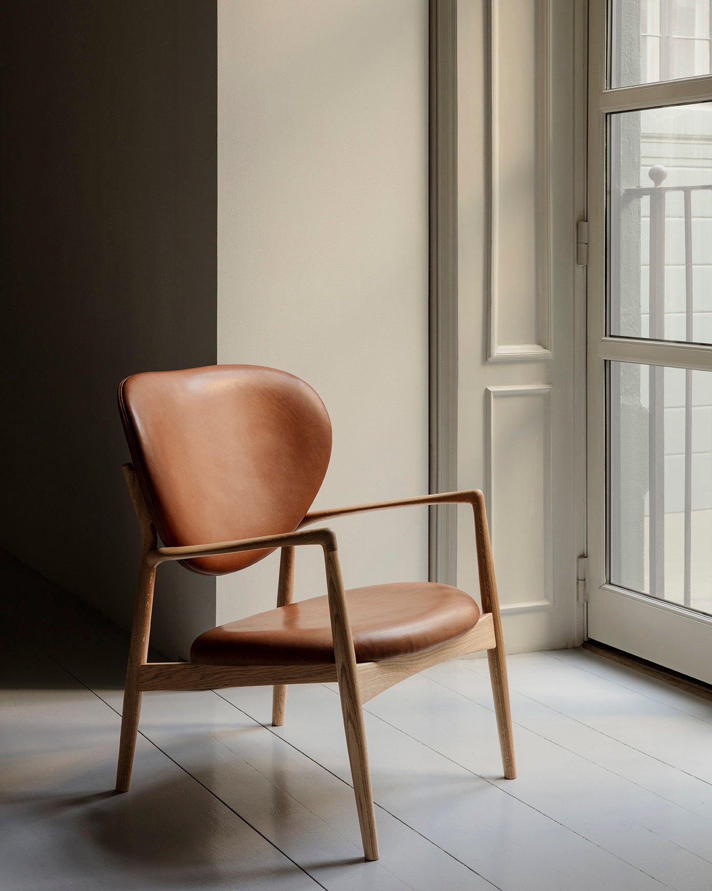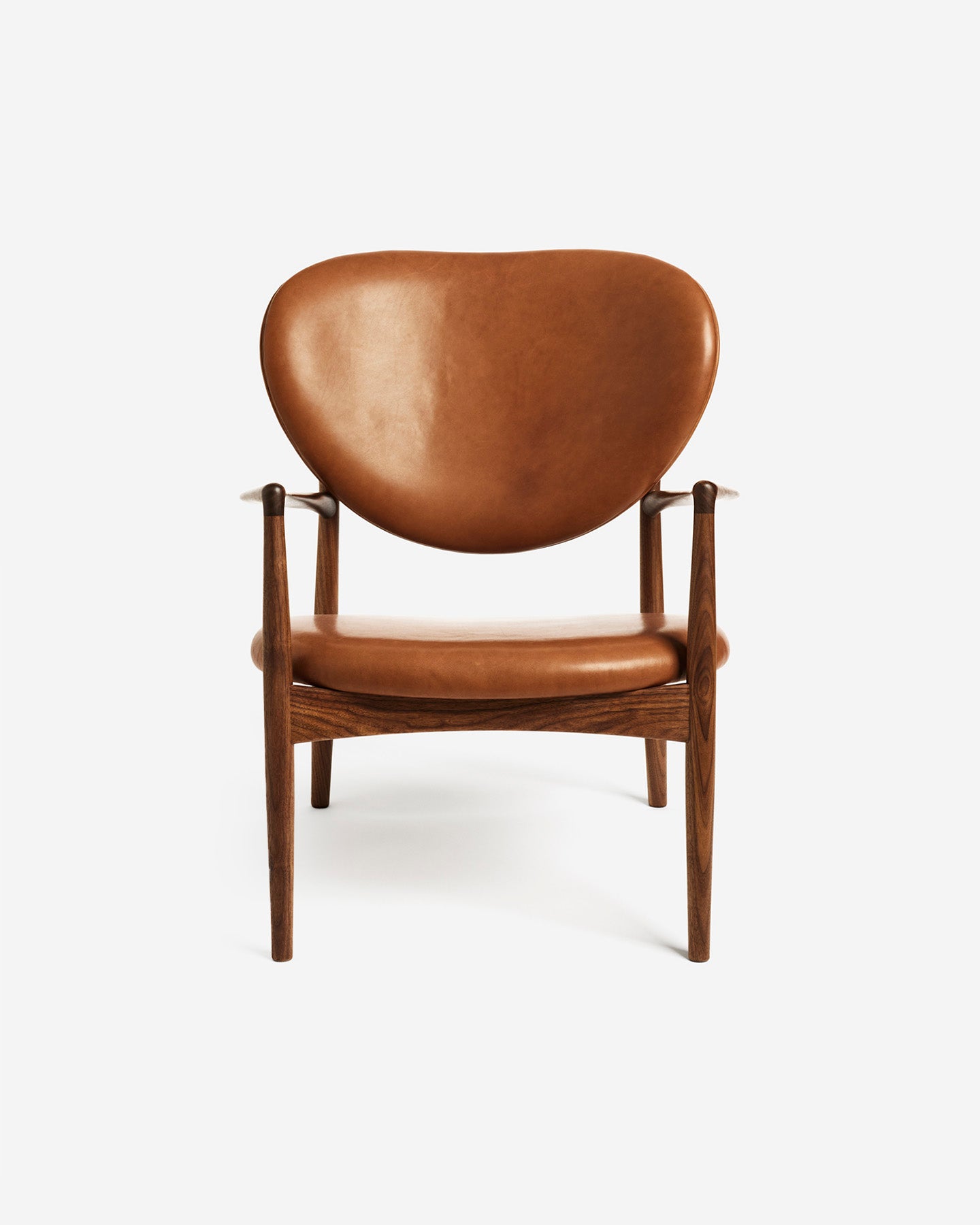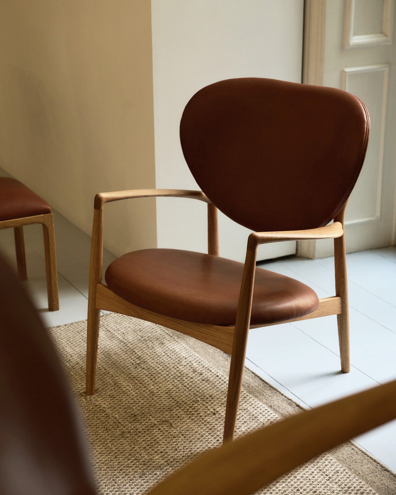 Now exclusively reissued by Dagmar as the Medallion Chair, this sculptural piece is distinguished by its blade-like arms and flowing organic curves. Available in Walnut or Oiled Oak, and upholstered in Cognac brown aniline leather.