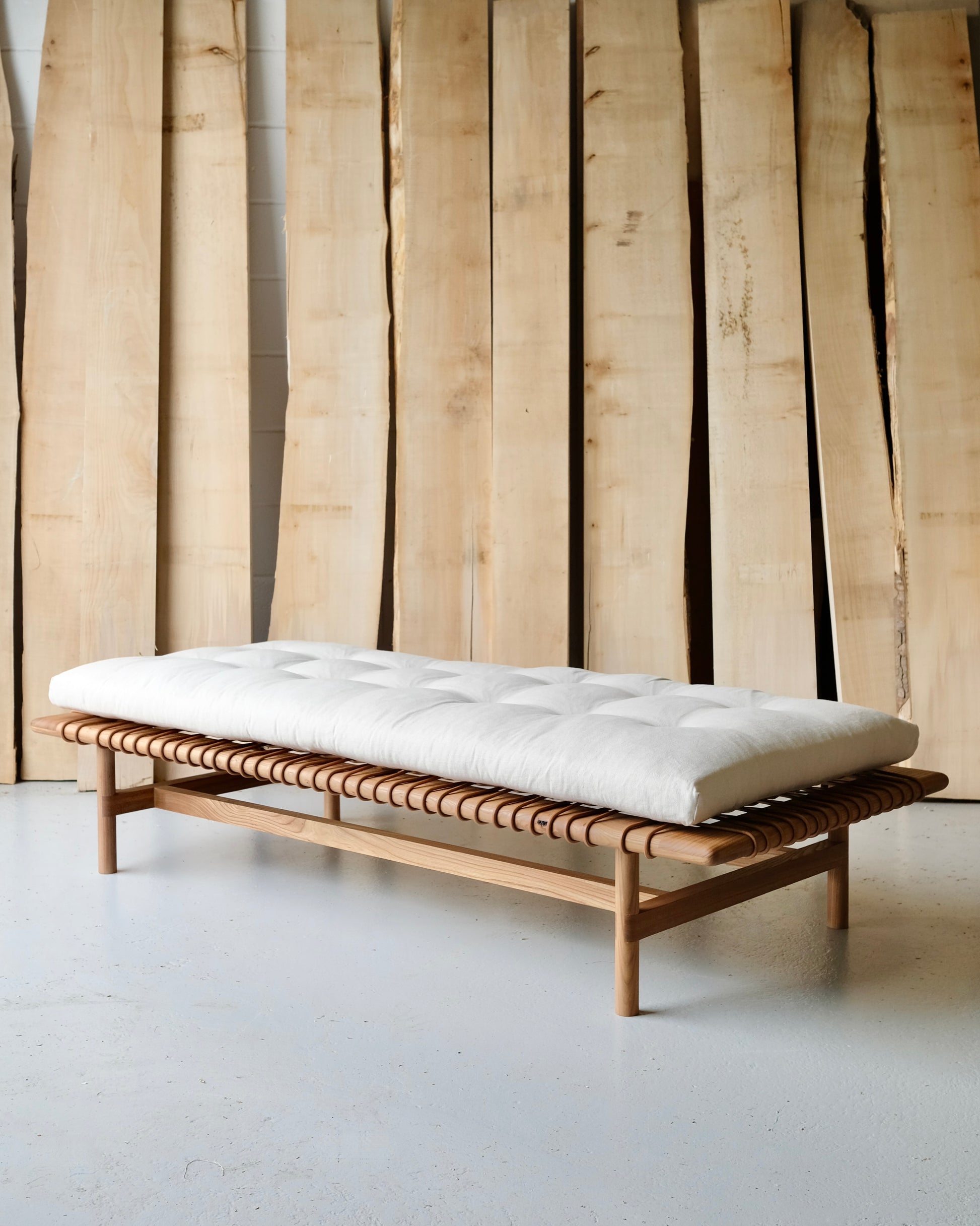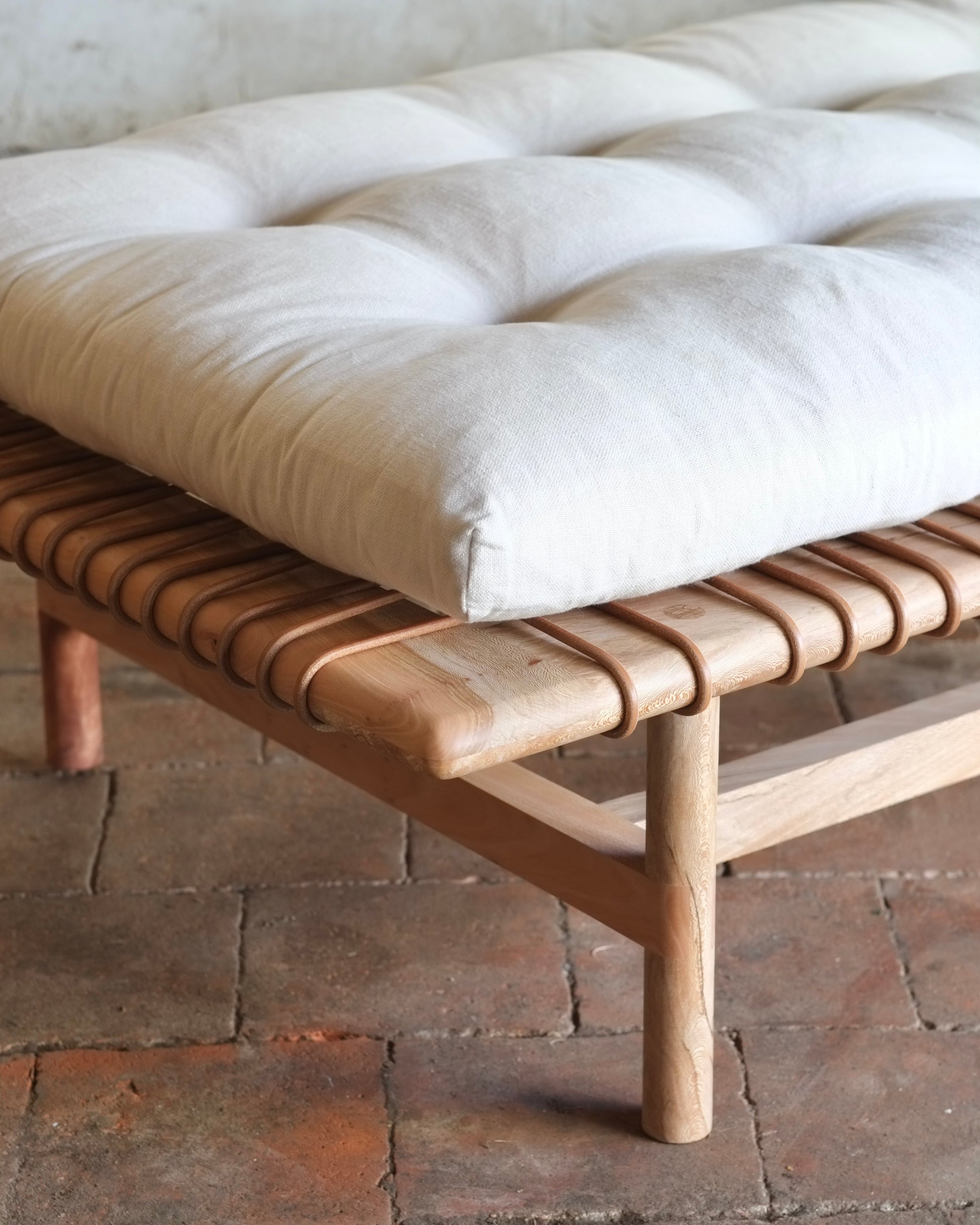 The Mesa Daybed celebrates contemporary craftsmanship in its rich detail and gathering of techniques. Exposed on the corners and bridle joints on the legs accentuate the rich grain in the timber, while heavy leather cord, painstakingly tacked to the frame with traditional steel nails, provides strong, yet comfortable and forgiving support. Leather panels are carefully selected, cut, and prepared by hand before being carefully sewn. The tufted cushion offers an elegant counterpoint, sitting above the frame in reference to the iconic midcentury modern daybeds.