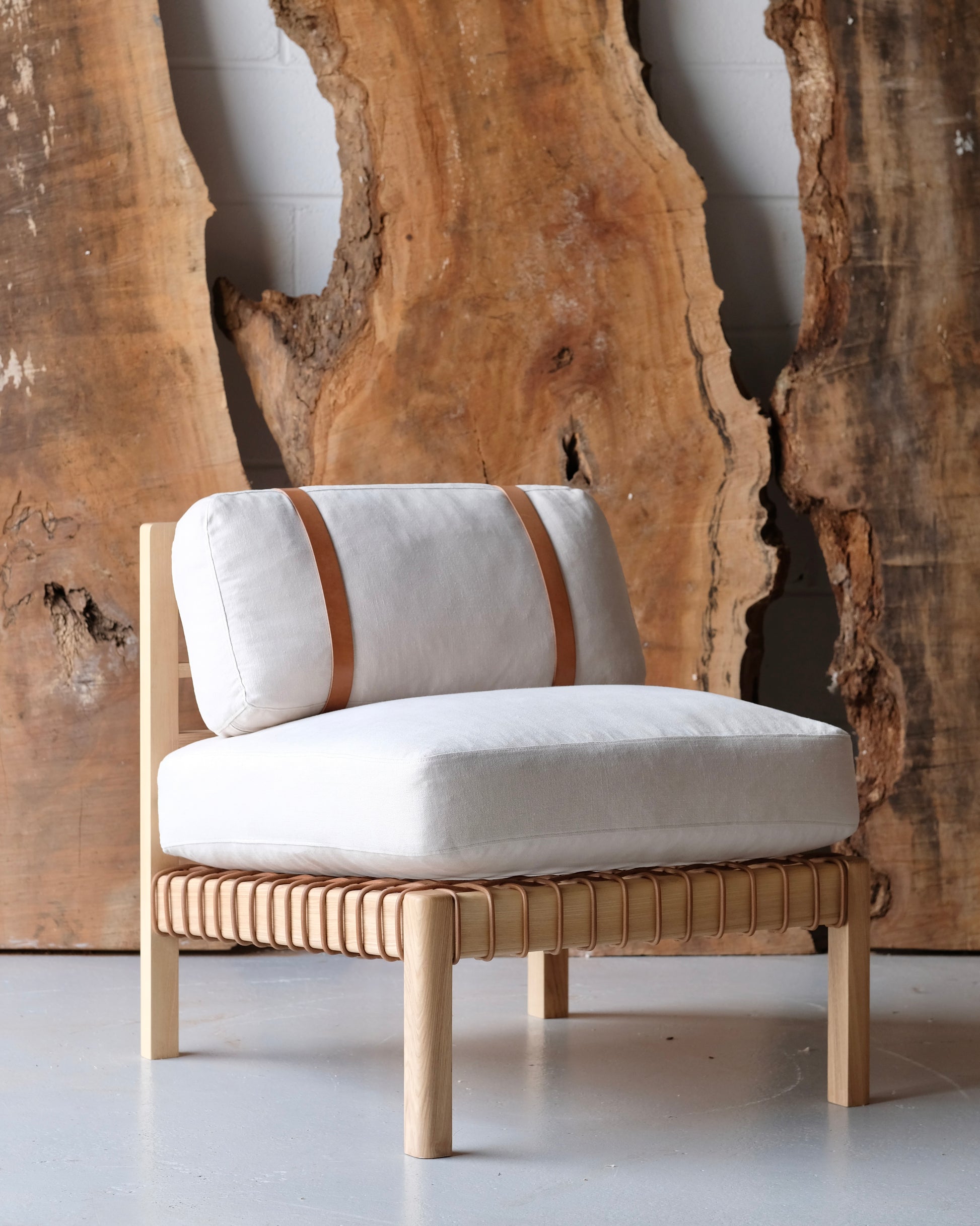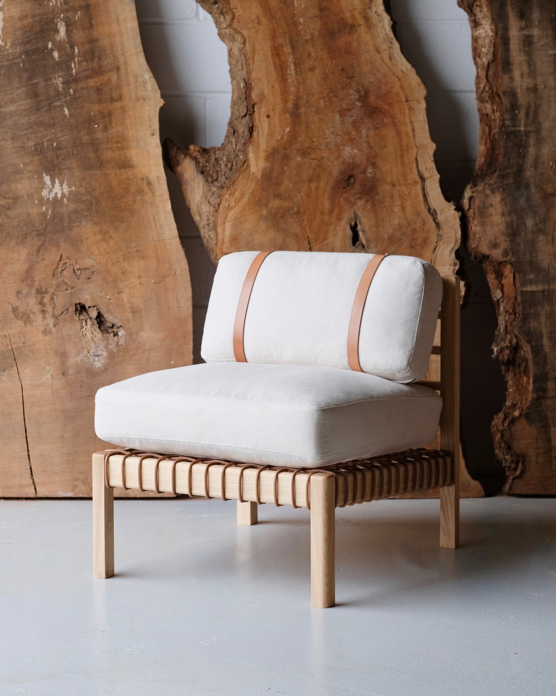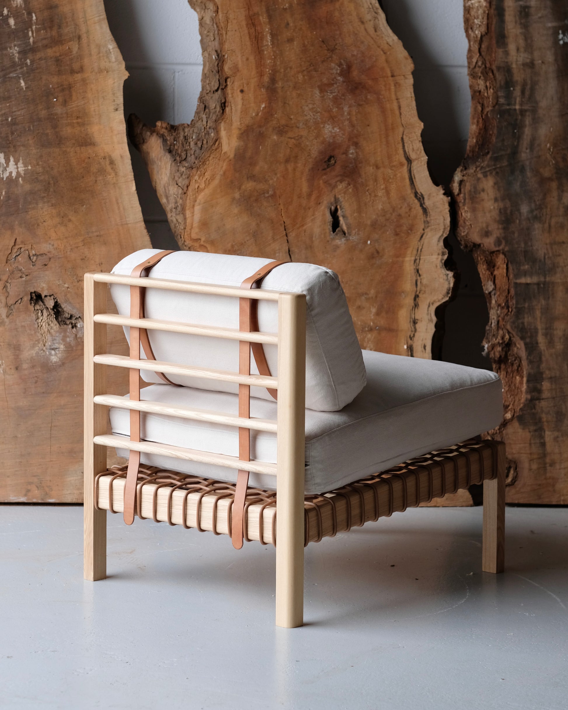 The Mochi easy chair draws on traditional and varied types of leatherwork to create a deceptively simple, truly versatile piece suitable to almost any room. Used in a pair or as a standalone, it offers a welcoming and comfortable accent to a master bedroom, lounge, or hall. Upholstered in cozy shearling, large panels of material offset the Mochi’s exposed, timber frame. Woven leather cord offers comfortable support to the upholstery, wrapped whole around the interior to achieve the seamless appearance that gives the Mochi its quiet elegance. Heavy straps on the backrest anchor the cushion to its solid wooden frame, giving the piece a contemporary feel even as they draw on the tradition of the early 20th century.