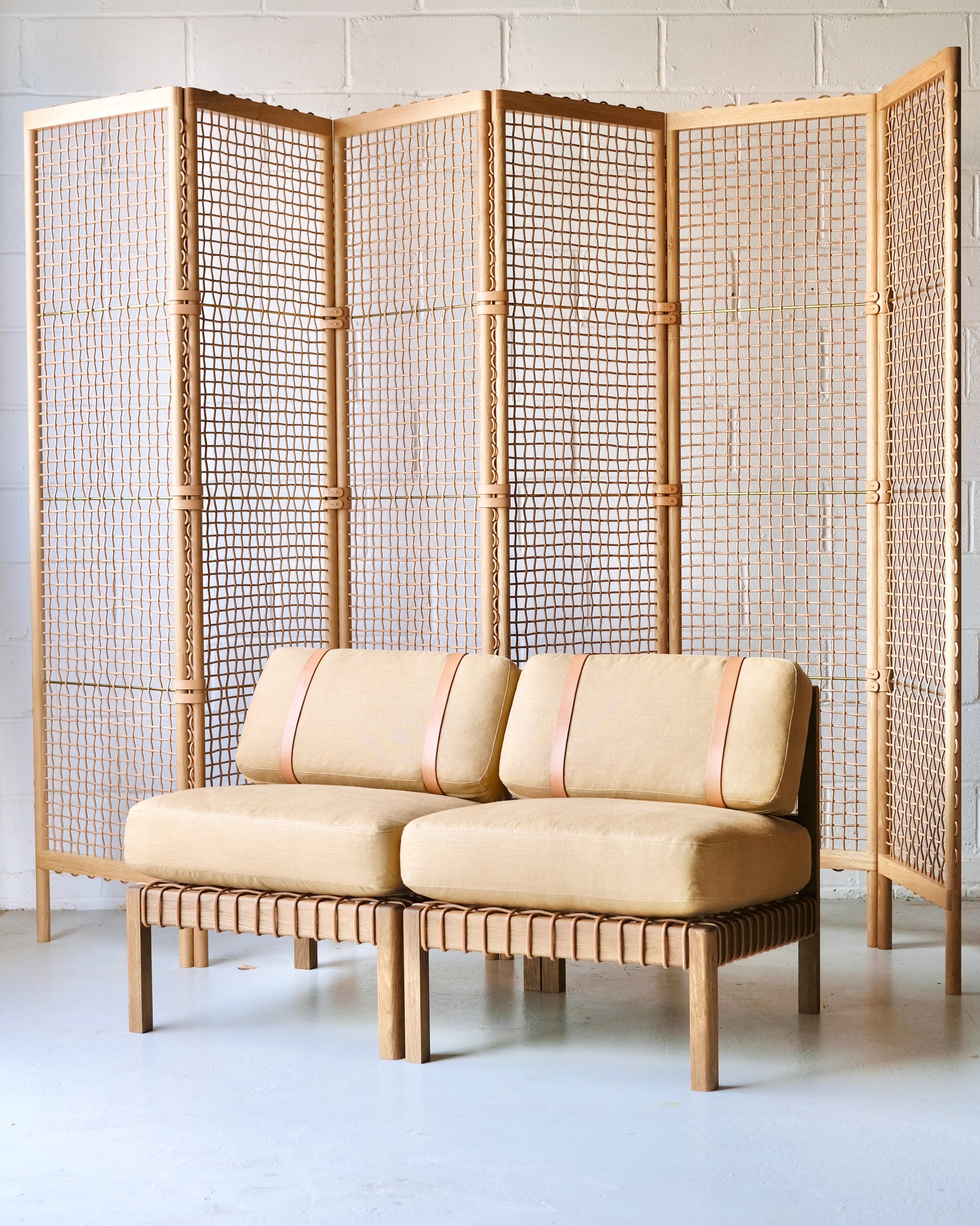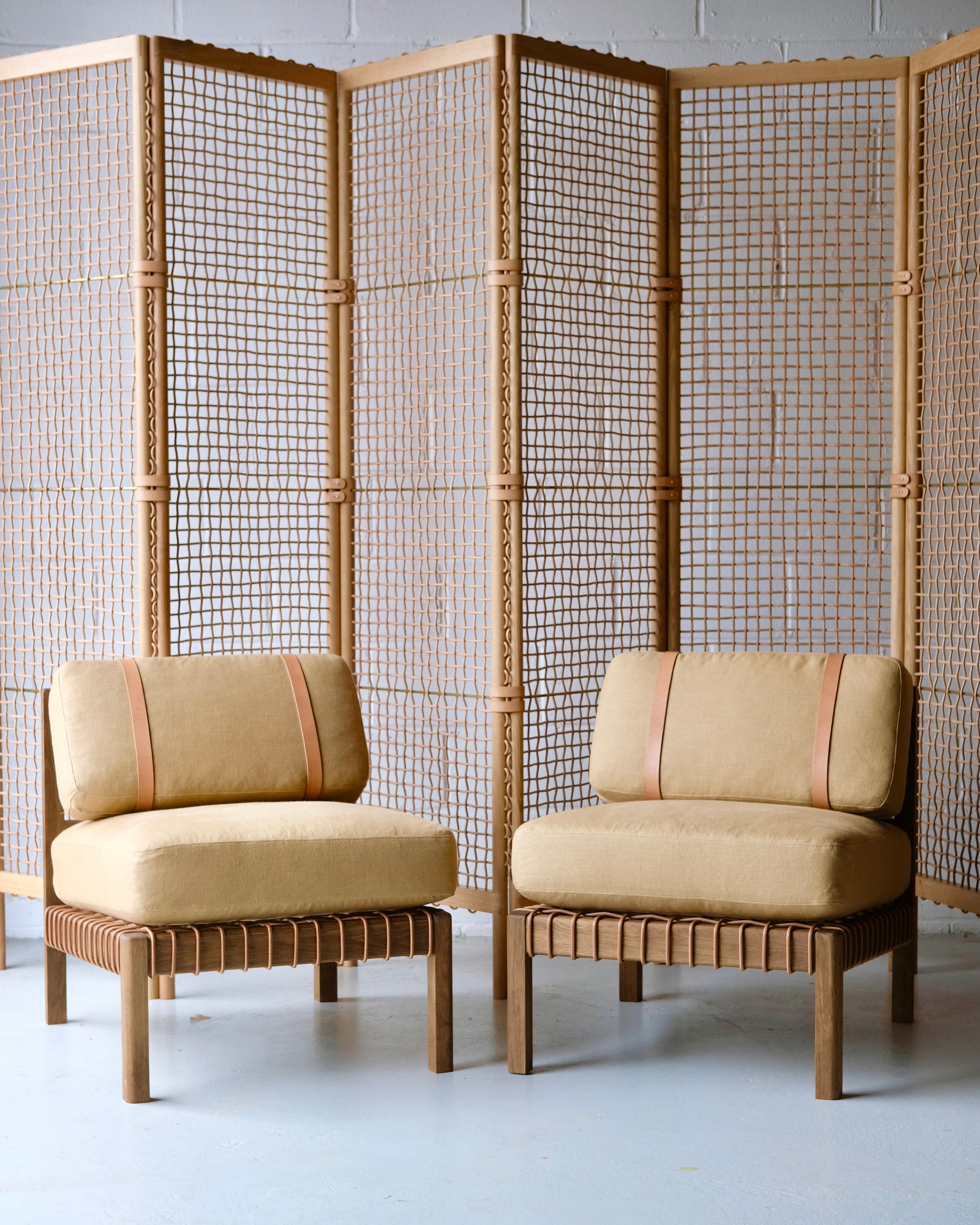 The Mochi easy chair draws on traditional and varied types of leatherwork to create a deceptively simple, truly versatile piece suitable to almost any room. Used in a pair or as a standalone, it offers a welcoming and comfortable accent to a master bedroom, lounge, or hall. Upholstered in cozy shearling, large panels of material offset the Mochi’s exposed, timber frame. Woven leather cord offers comfortable support to the upholstery, wrapped whole around the interior to achieve the seamless appearance that gives the Mochi its quiet elegance. Heavy straps on the backrest anchor the cushion to its solid wooden frame, giving the piece a contemporary feel even as they draw on the tradition of the early 20th century.