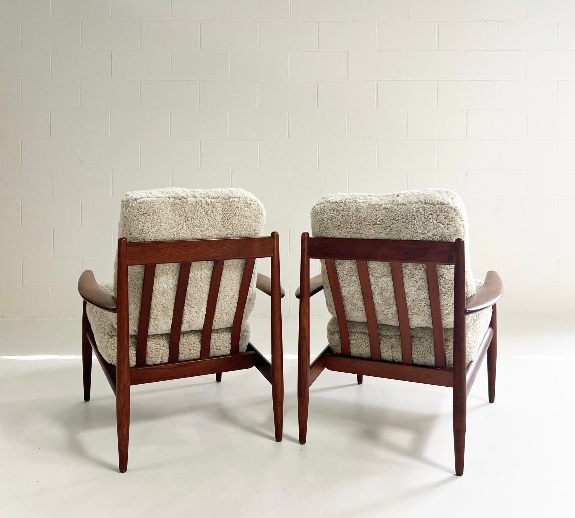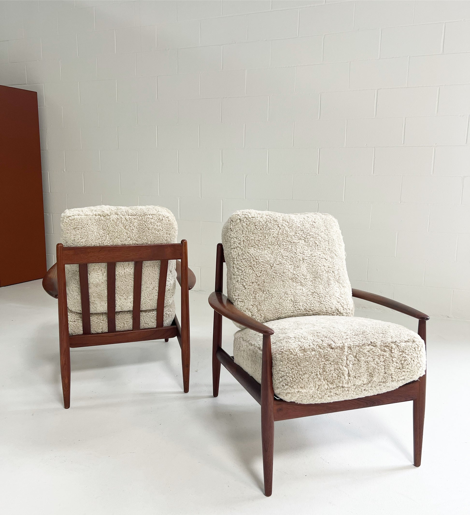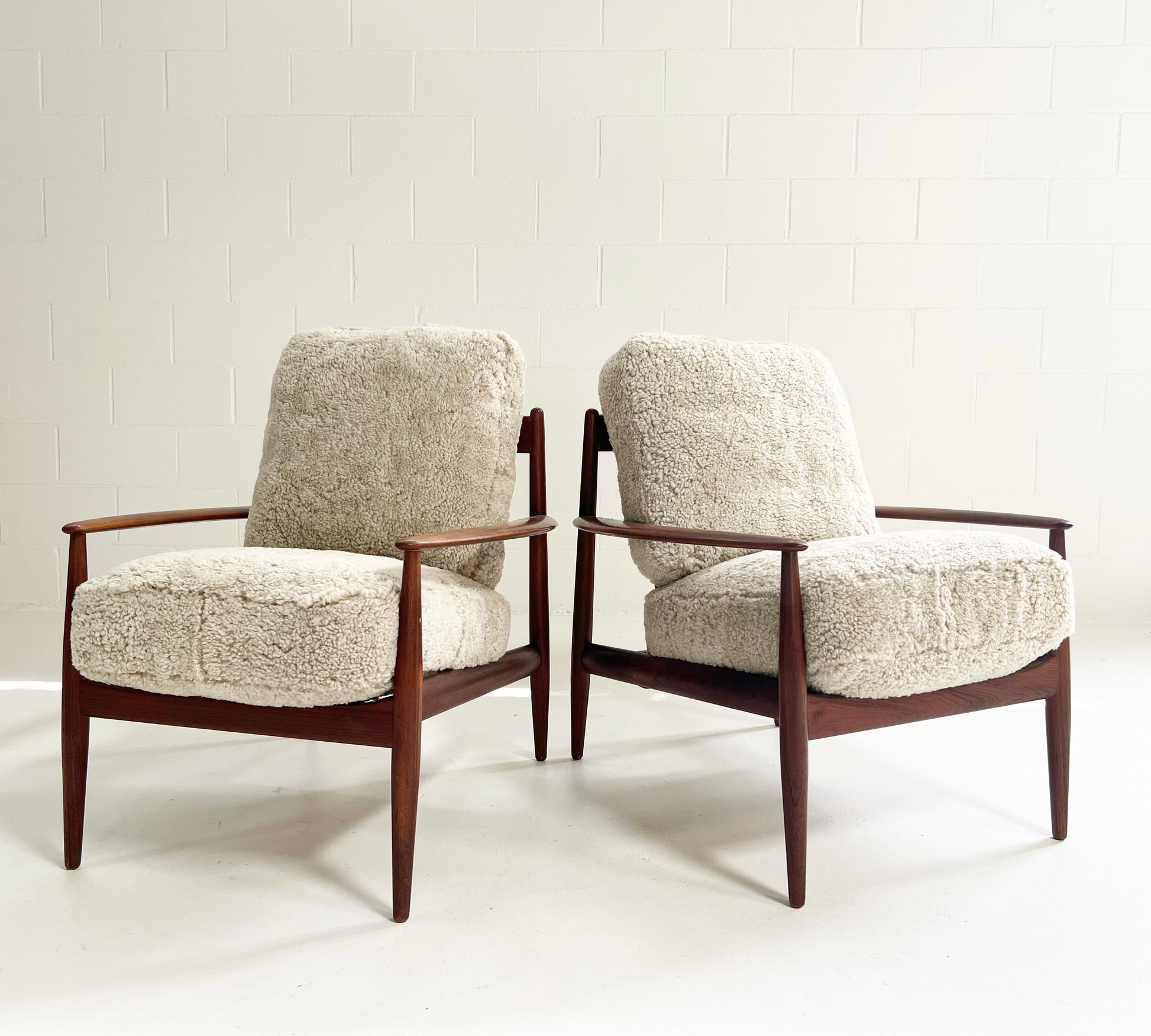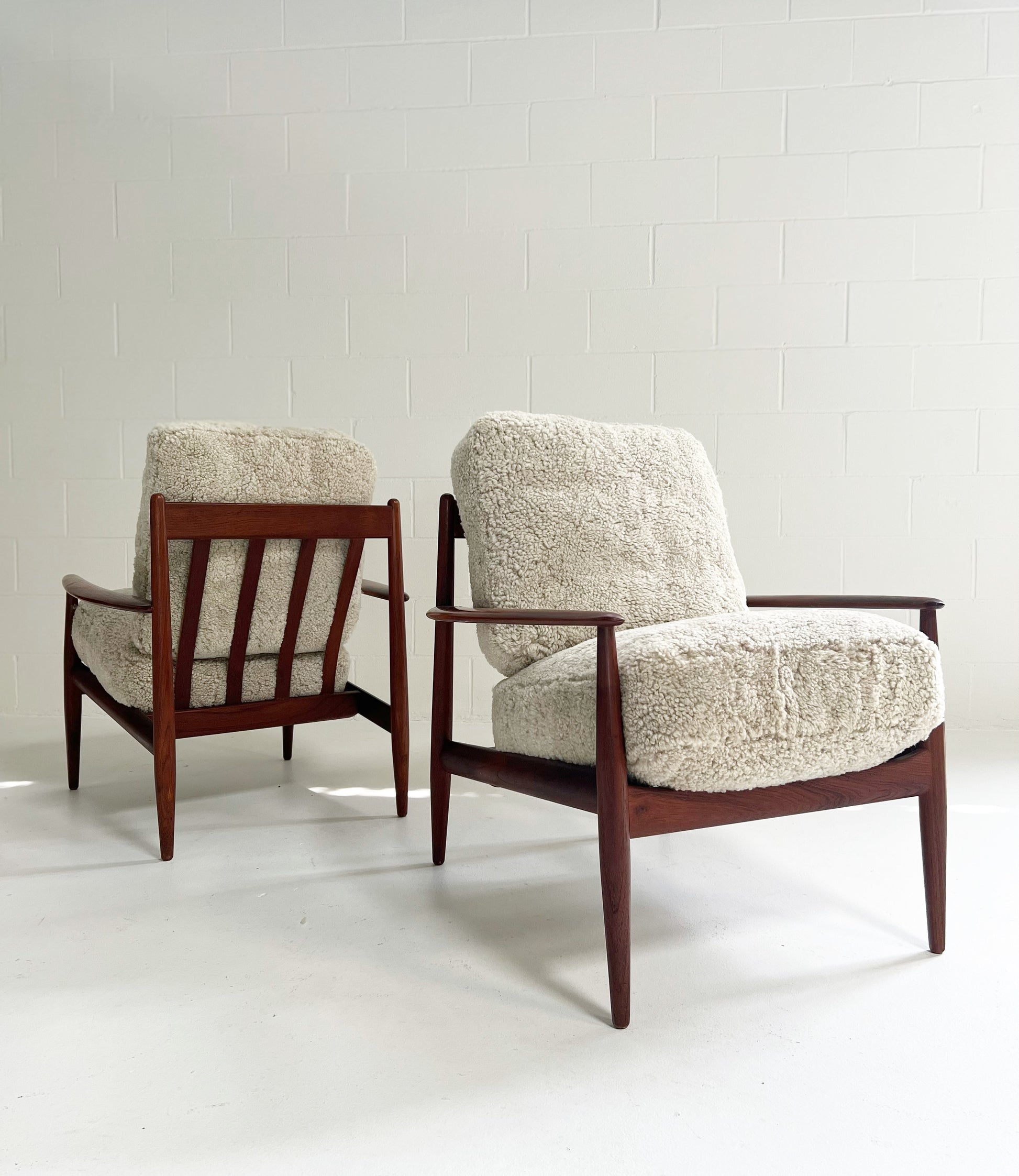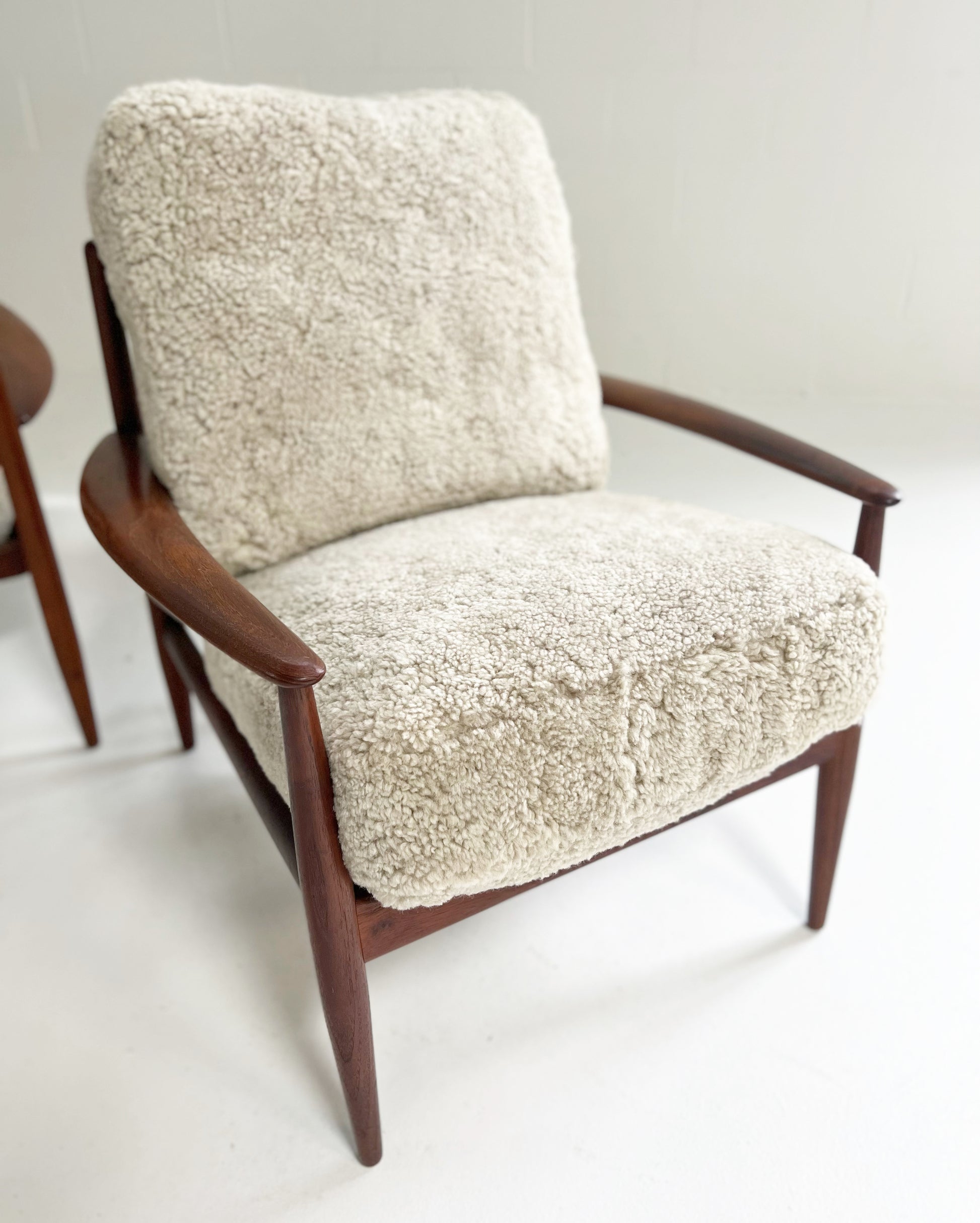 When women were rarely seen in the mid-century design world, Grete Jalk was a visionary. A leader in Danish modernism, her designs are simple with lines that are comfortable and clear. We love these Model 118 teak lounge chairs. For the cushions, our designers chose a neutral taupe shearling. Each 4-inch cushion is generously stuffed with feathers for our signature, sink-into, very comfortable seat.