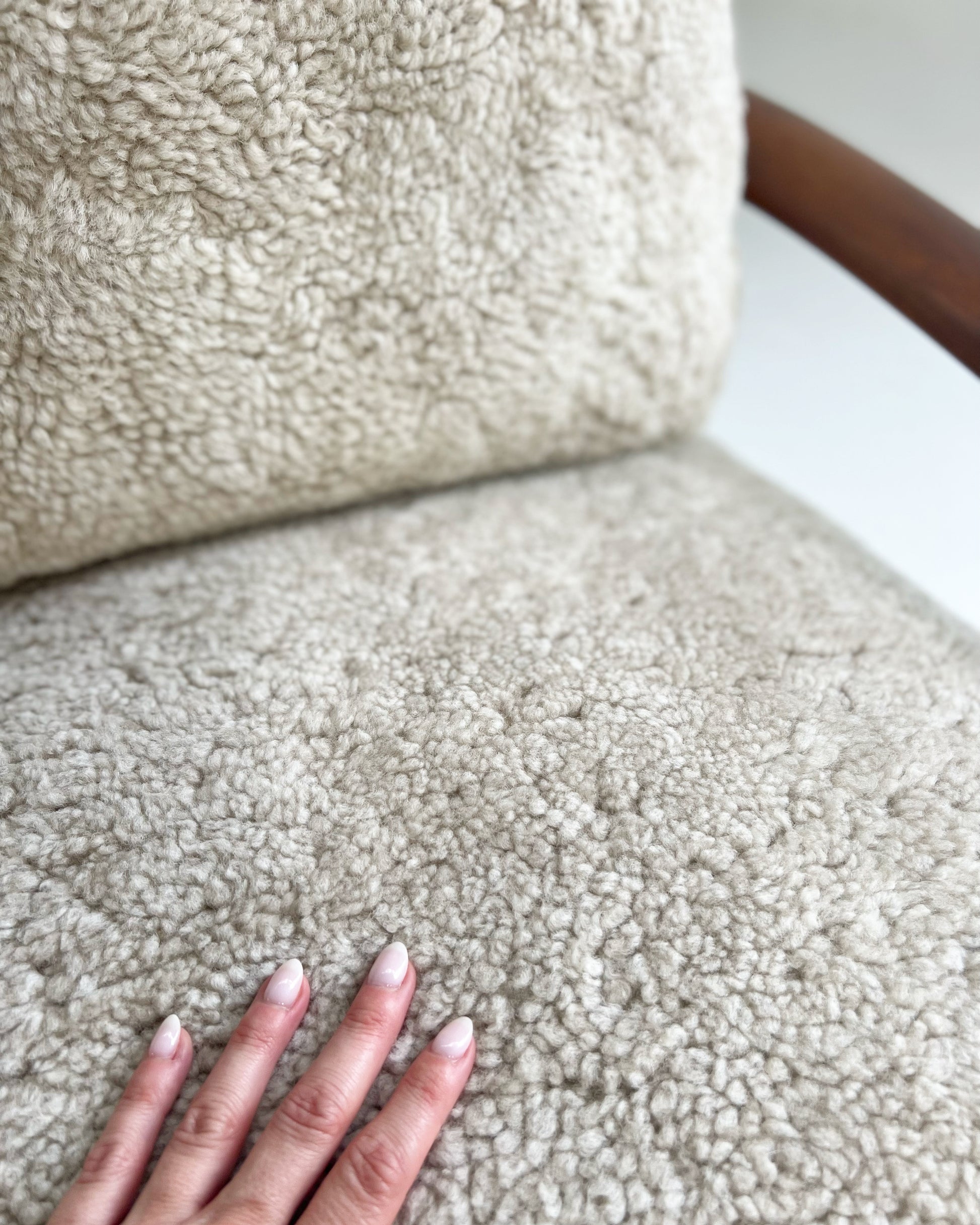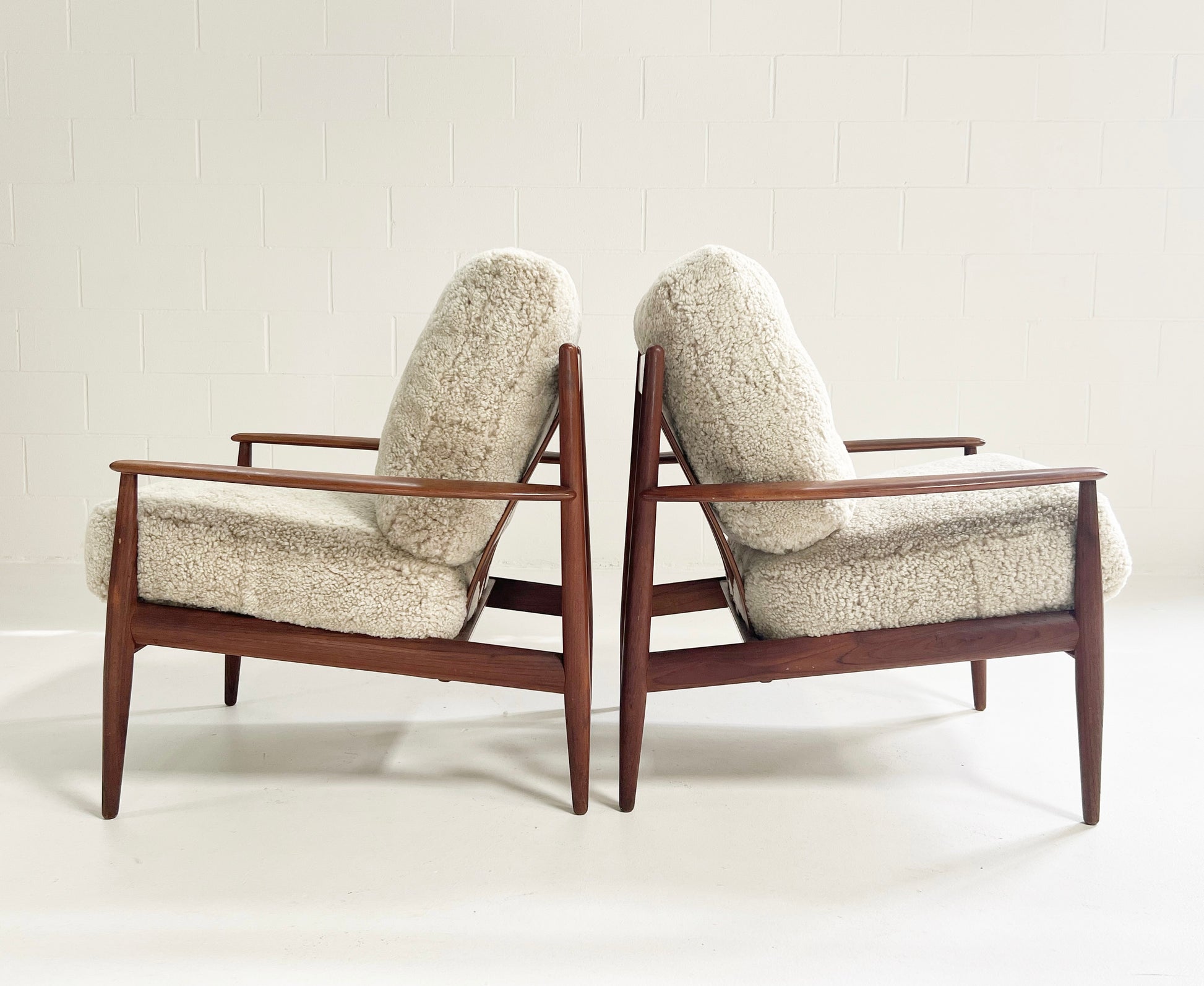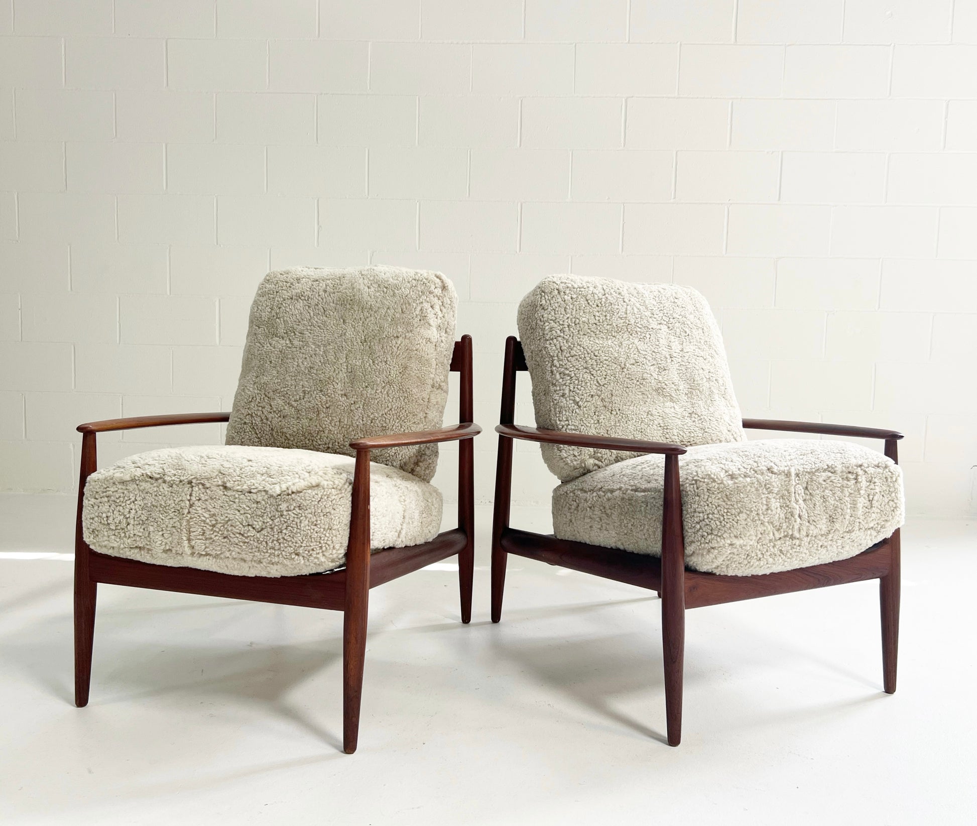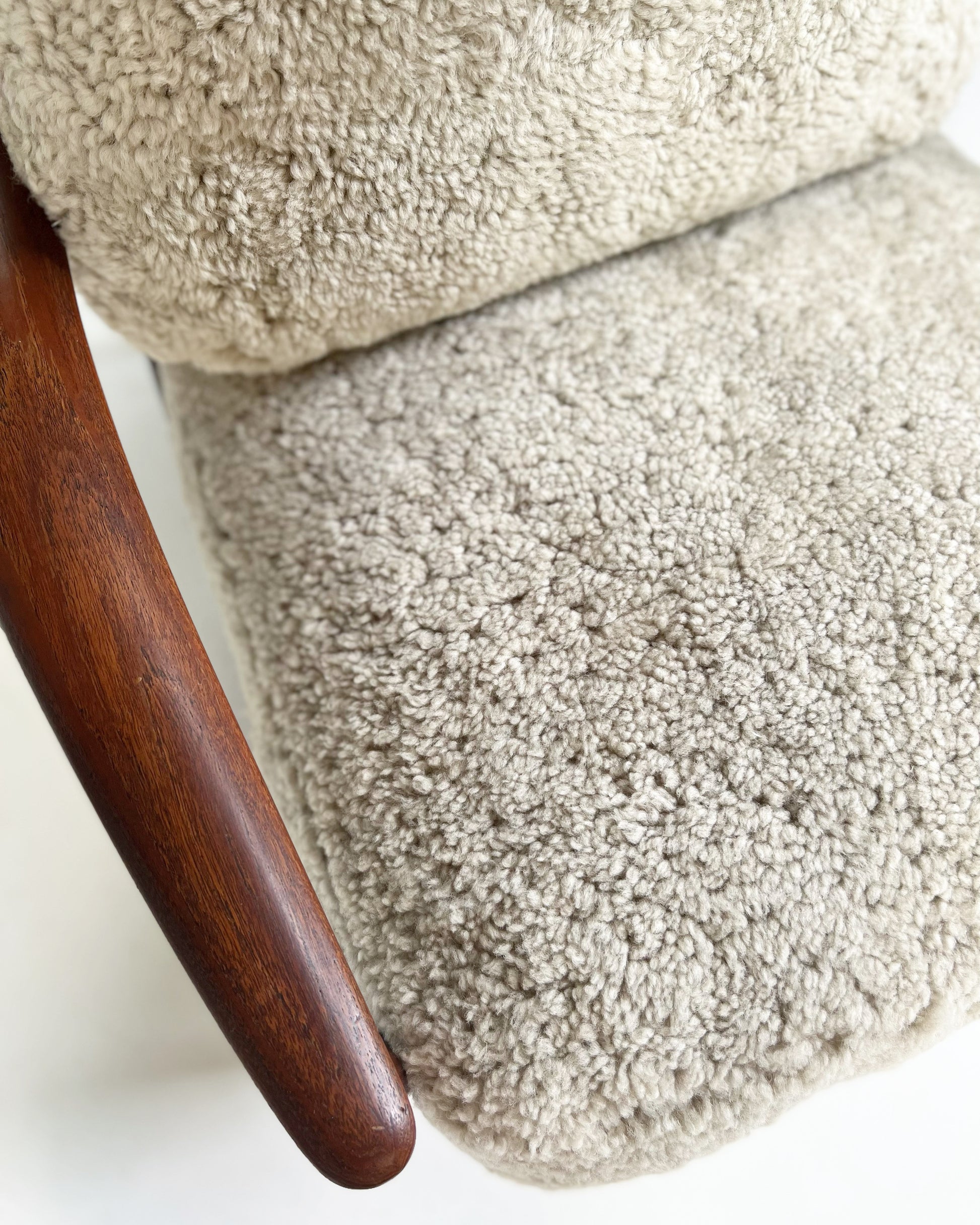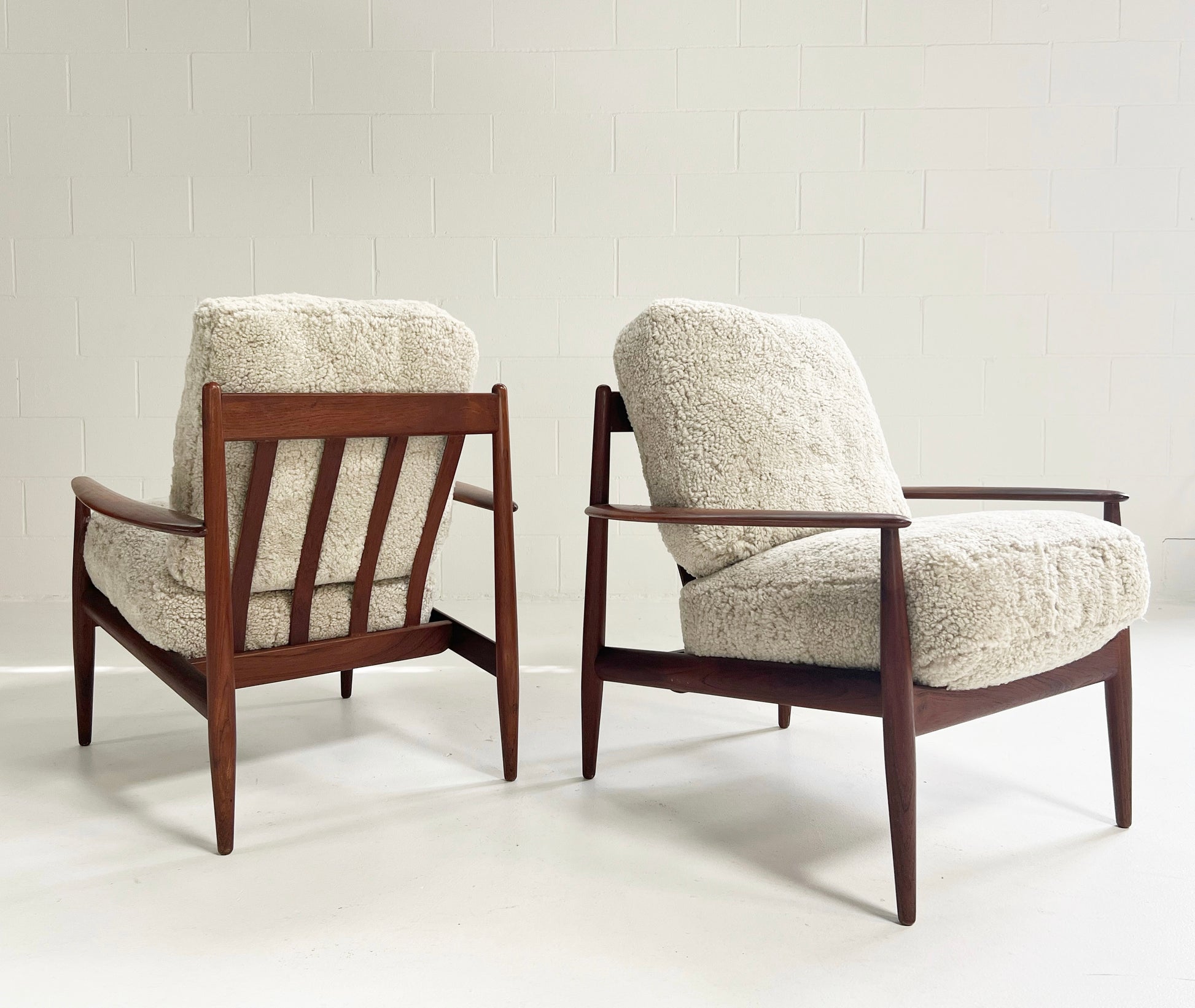When women were rarely seen in the mid-century design world, Grete Jalk was a visionary. A leader in Danish modernism, her designs are simple with lines that are comfortable and clear. We love these Model 118 teak lounge chairs. For the cushions, our designers chose a neutral taupe shearling. Each 4-inch cushion is generously stuffed with feathers for our signature, sink-into, very comfortable seat.