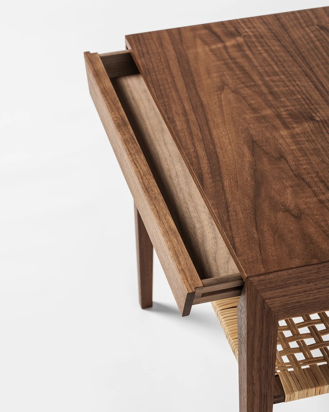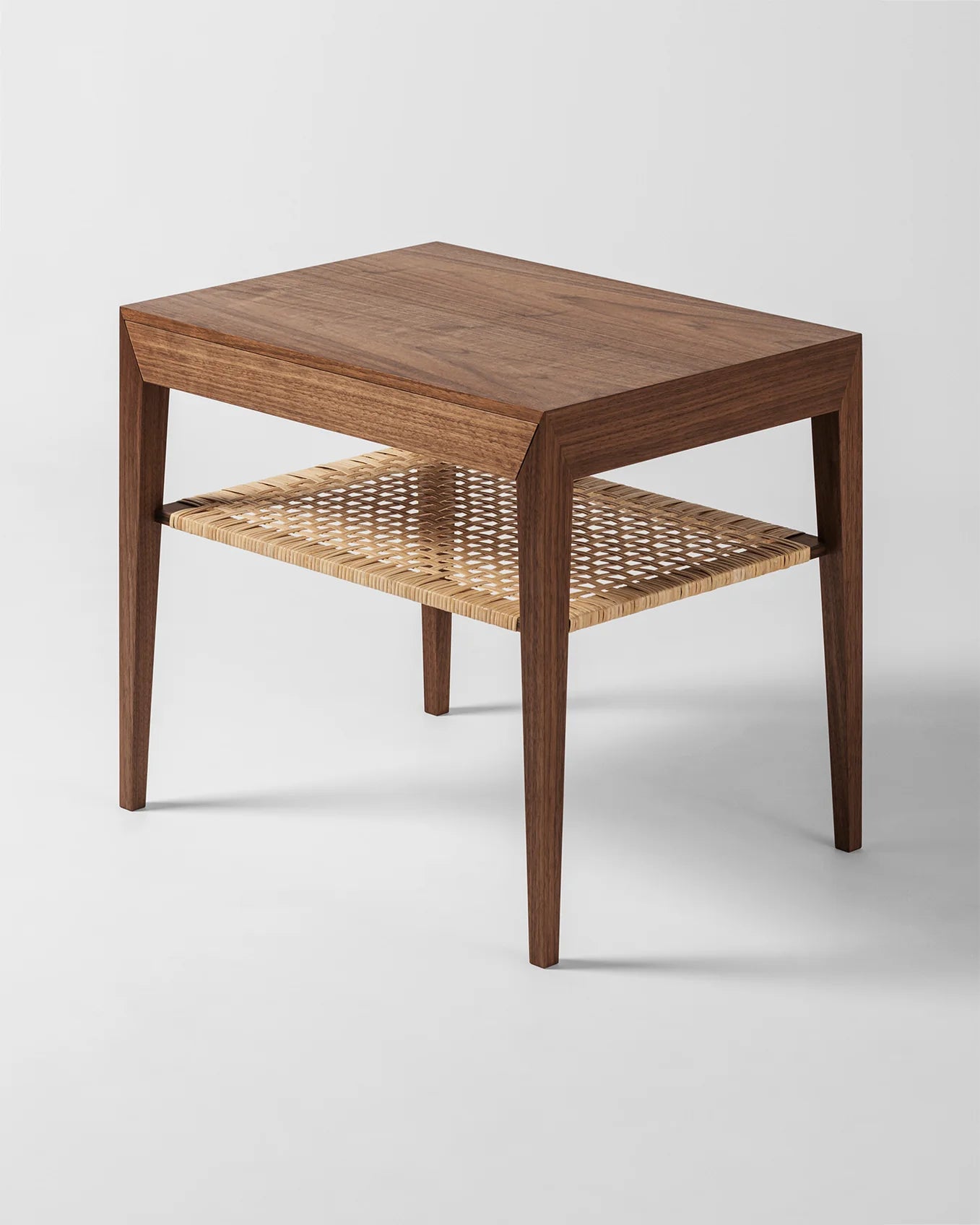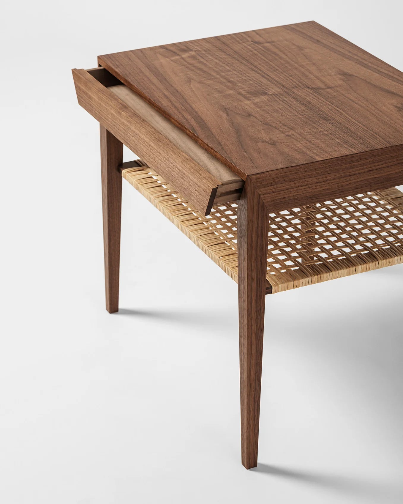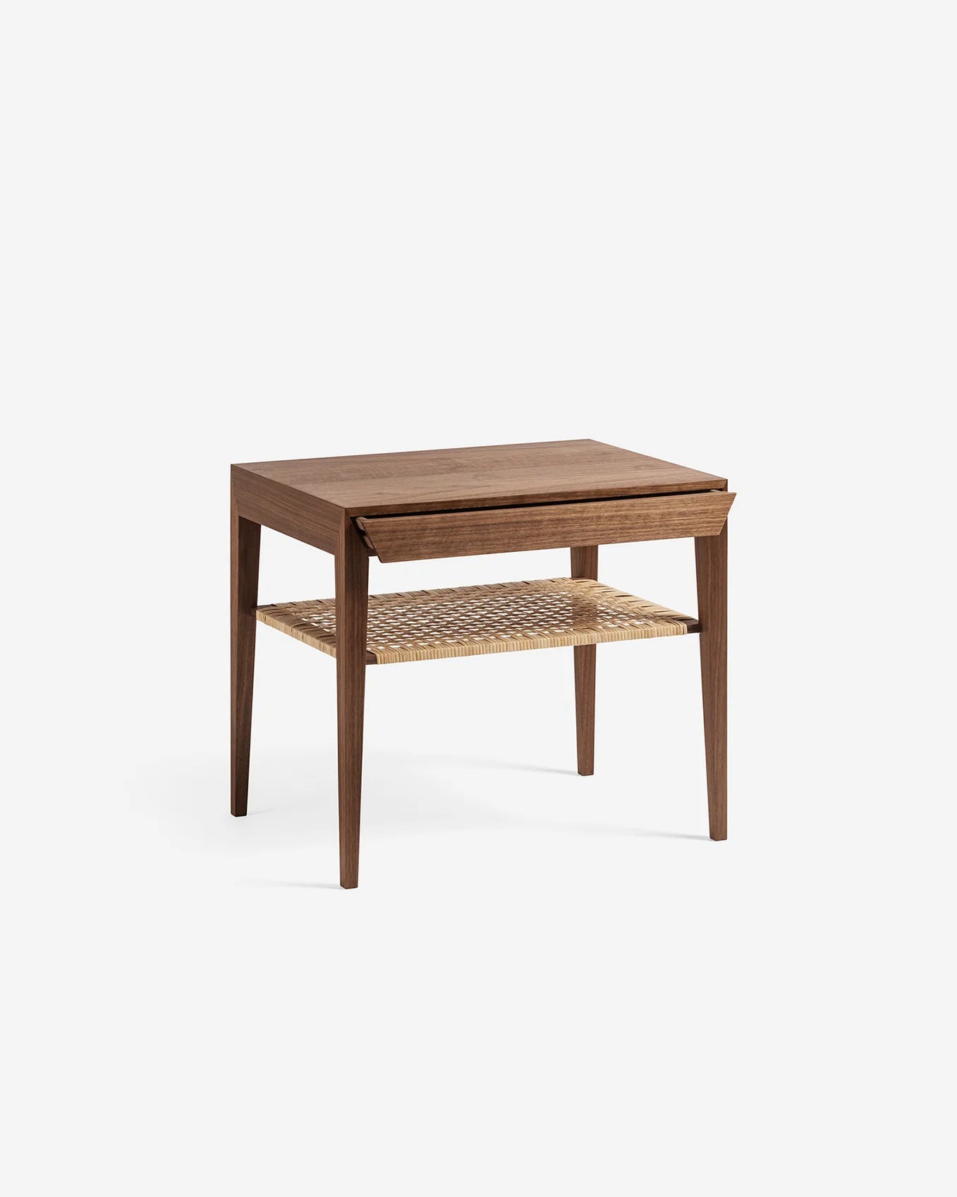 Danish designer Severin Hansen had a fearless approach to design and his forward-thinking concepts quickly captured international attention. Reissued as part of the Margrethe Collection, these elegant Margrethe Bedside Tables feature Hansen’s signature 3-way mitred joints and tapering legs. Available in oak or walnut, with a choice of wood or cane shelf options.