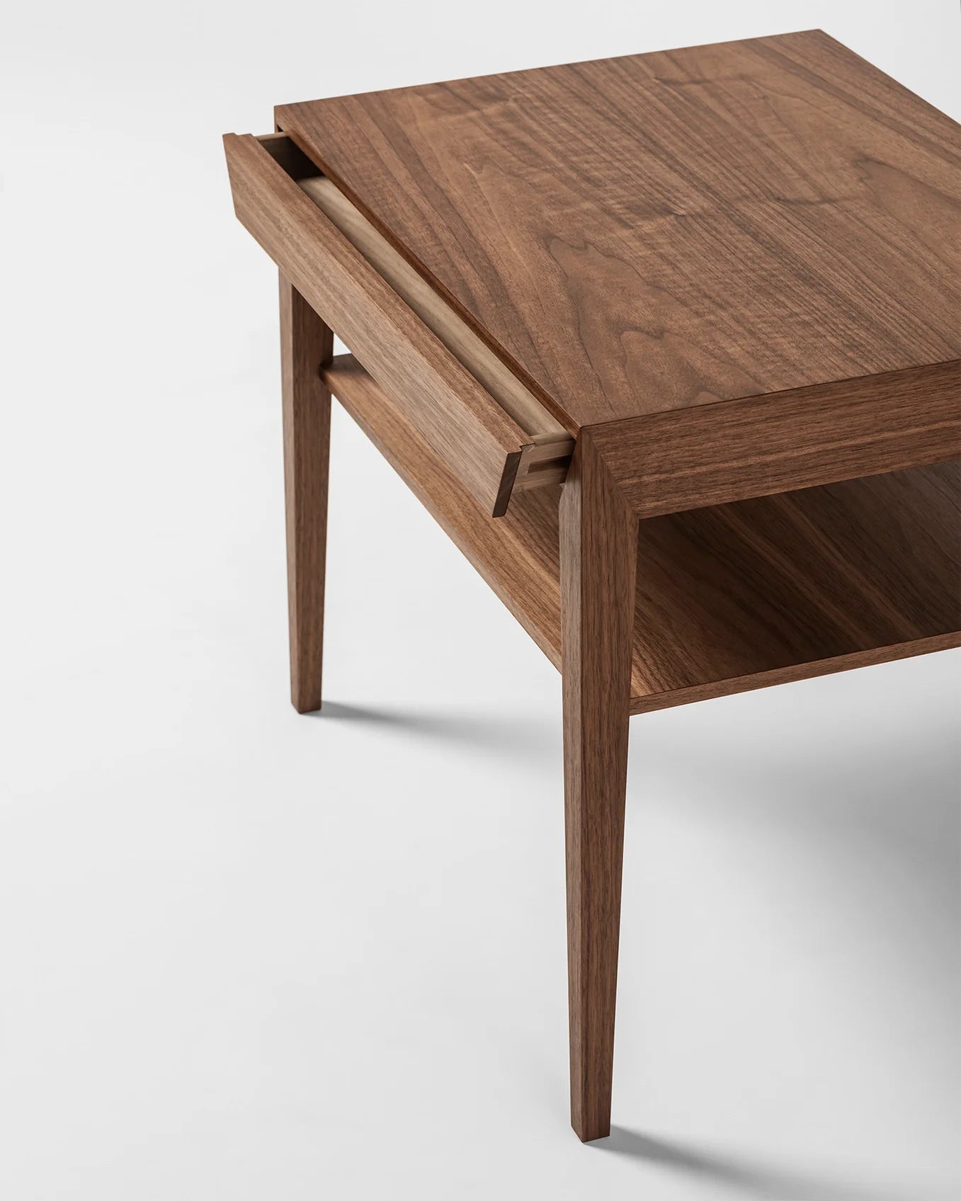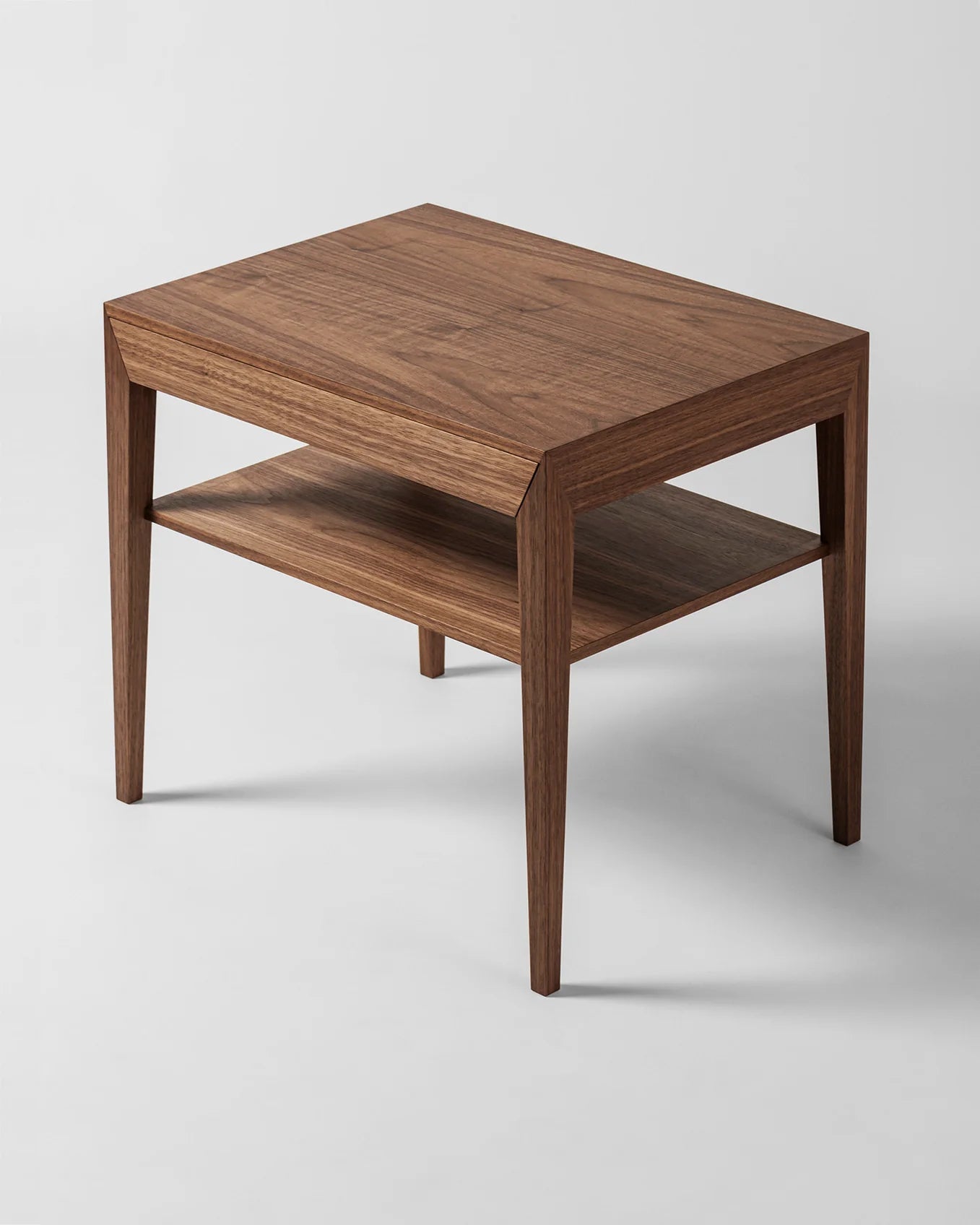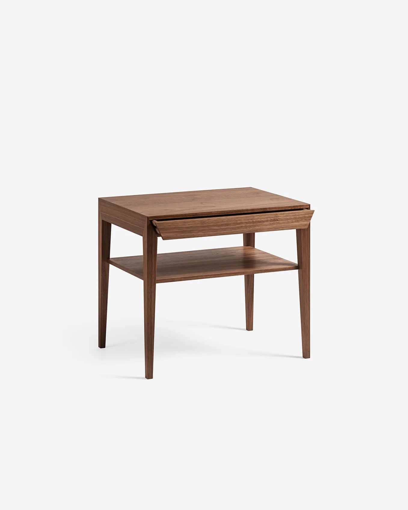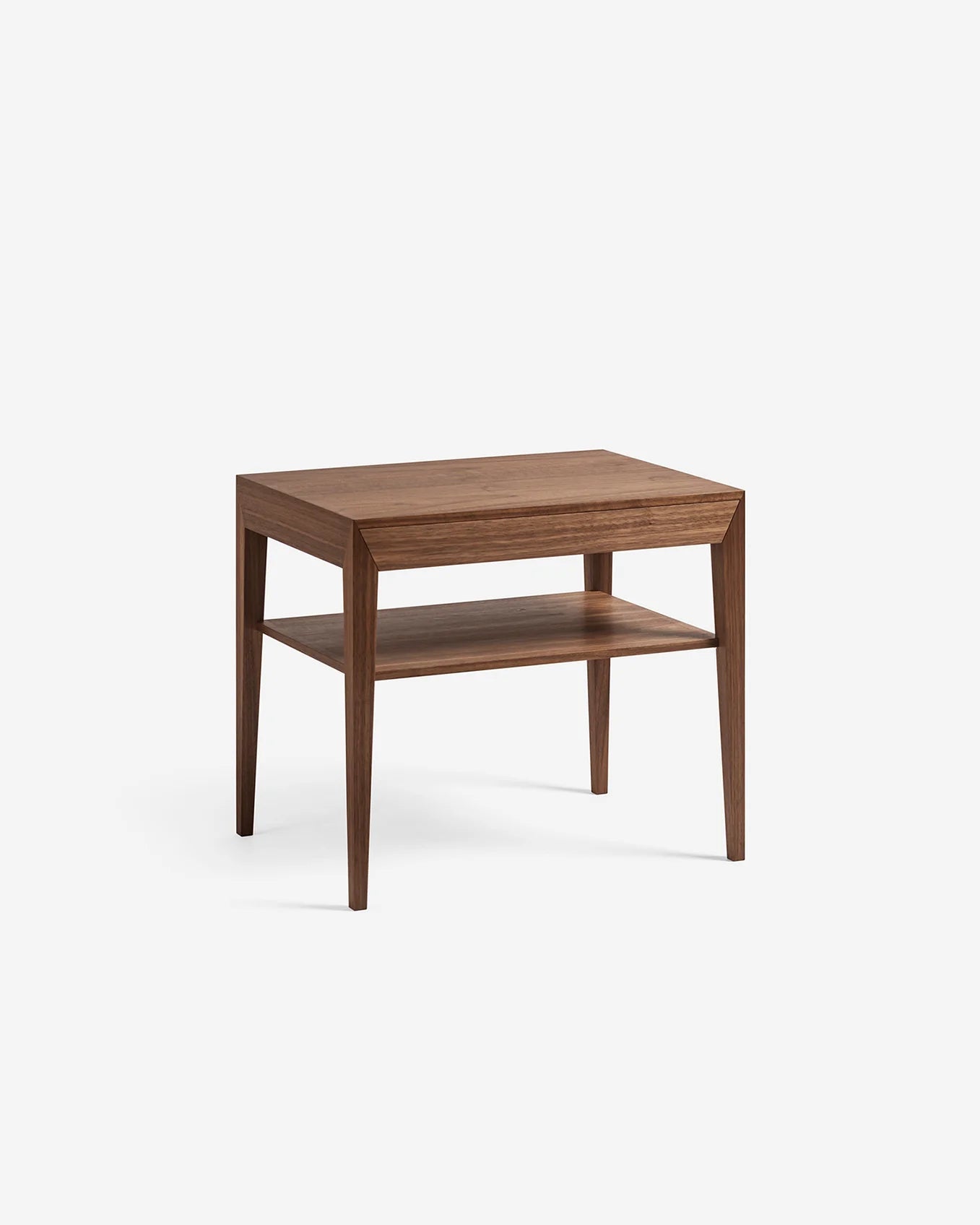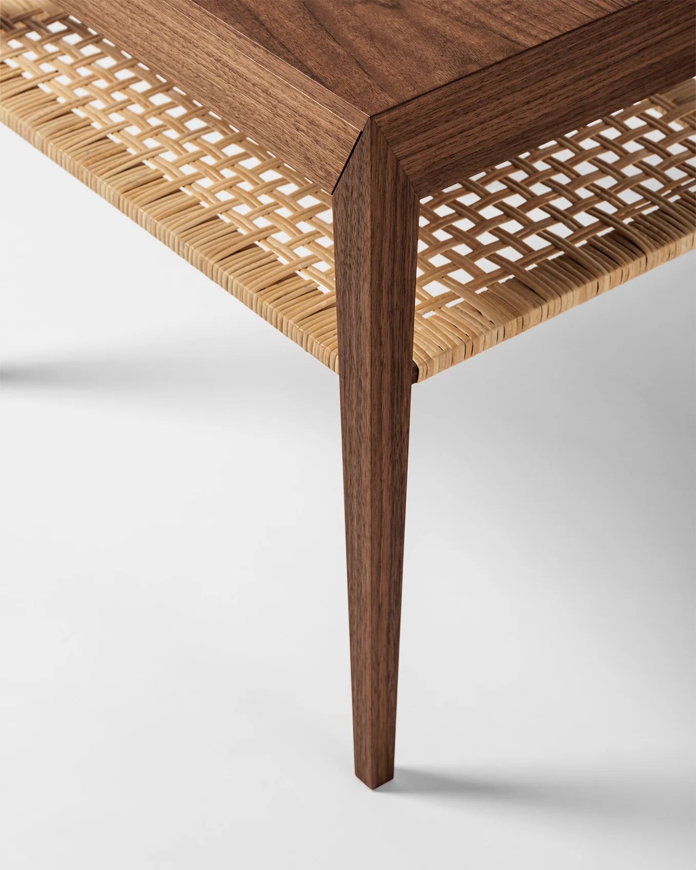 Danish designer Severin Hansen had a fearless approach to design and his forward-thinking concepts quickly captured international attention. Reissued as part of the Margrethe Collection, these elegant Margrethe Bedside Tables feature Hansen’s signature 3-way mitred joints and tapering legs. Available in oak or walnut, with a choice of wood or cane shelf options.