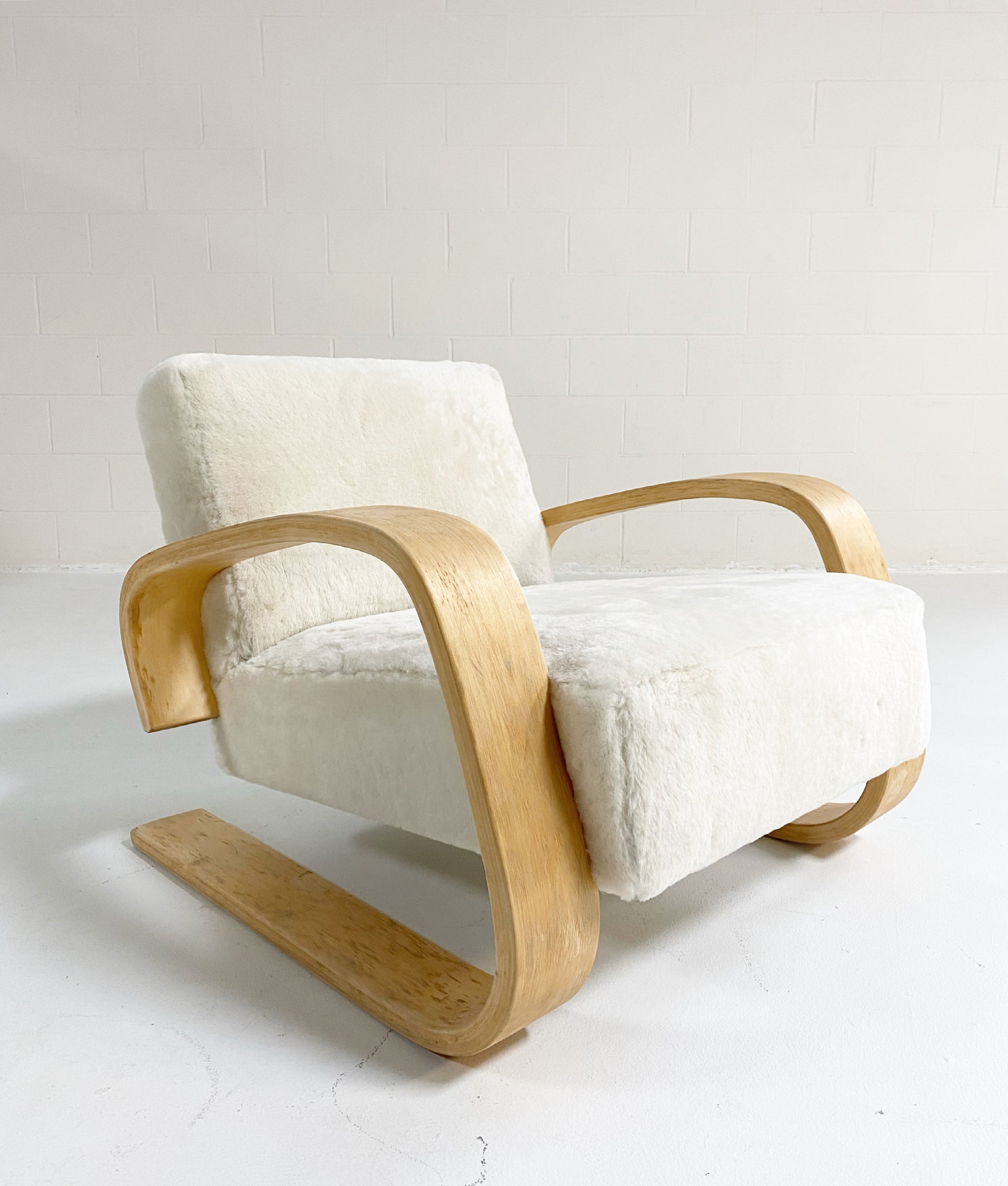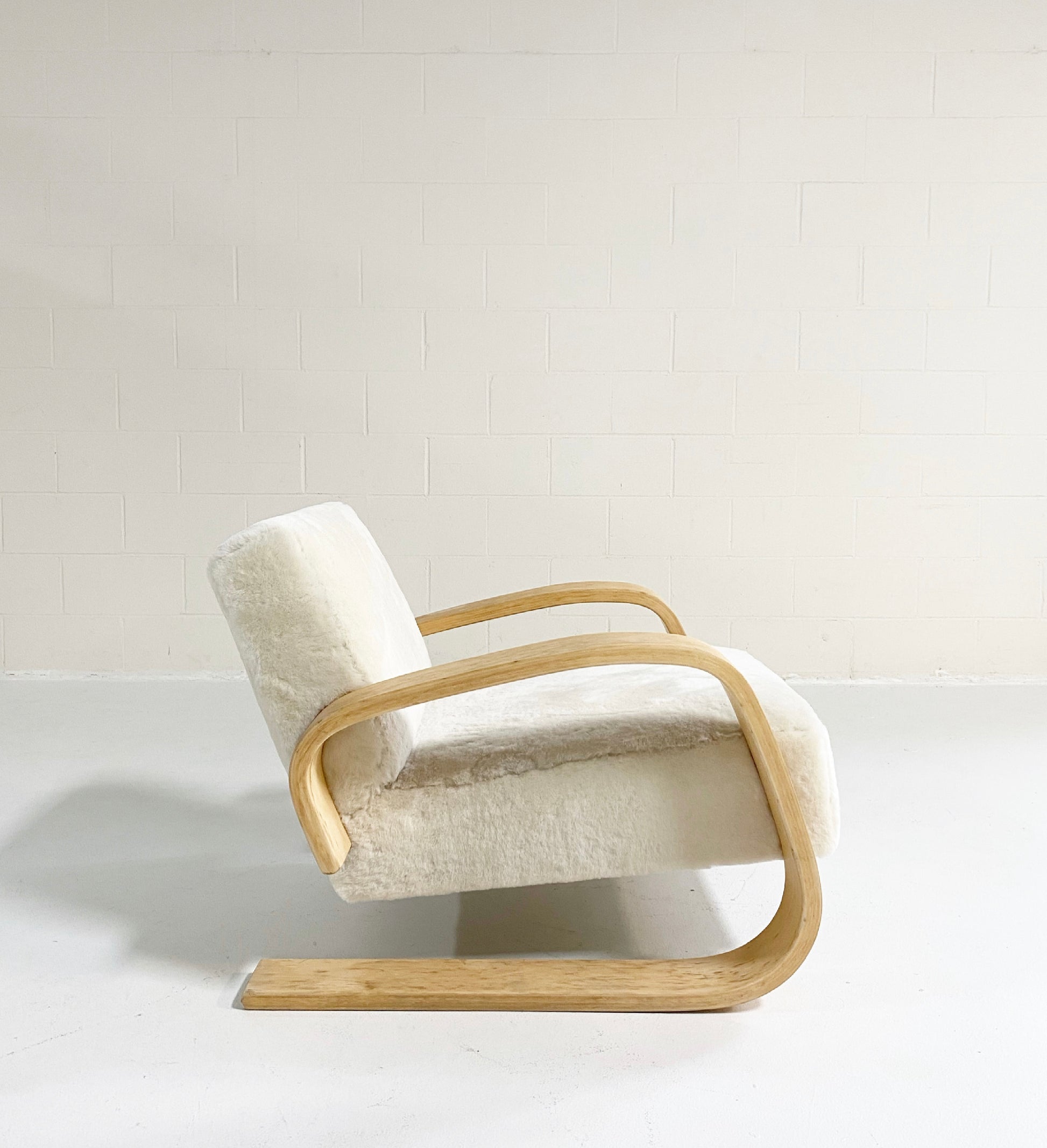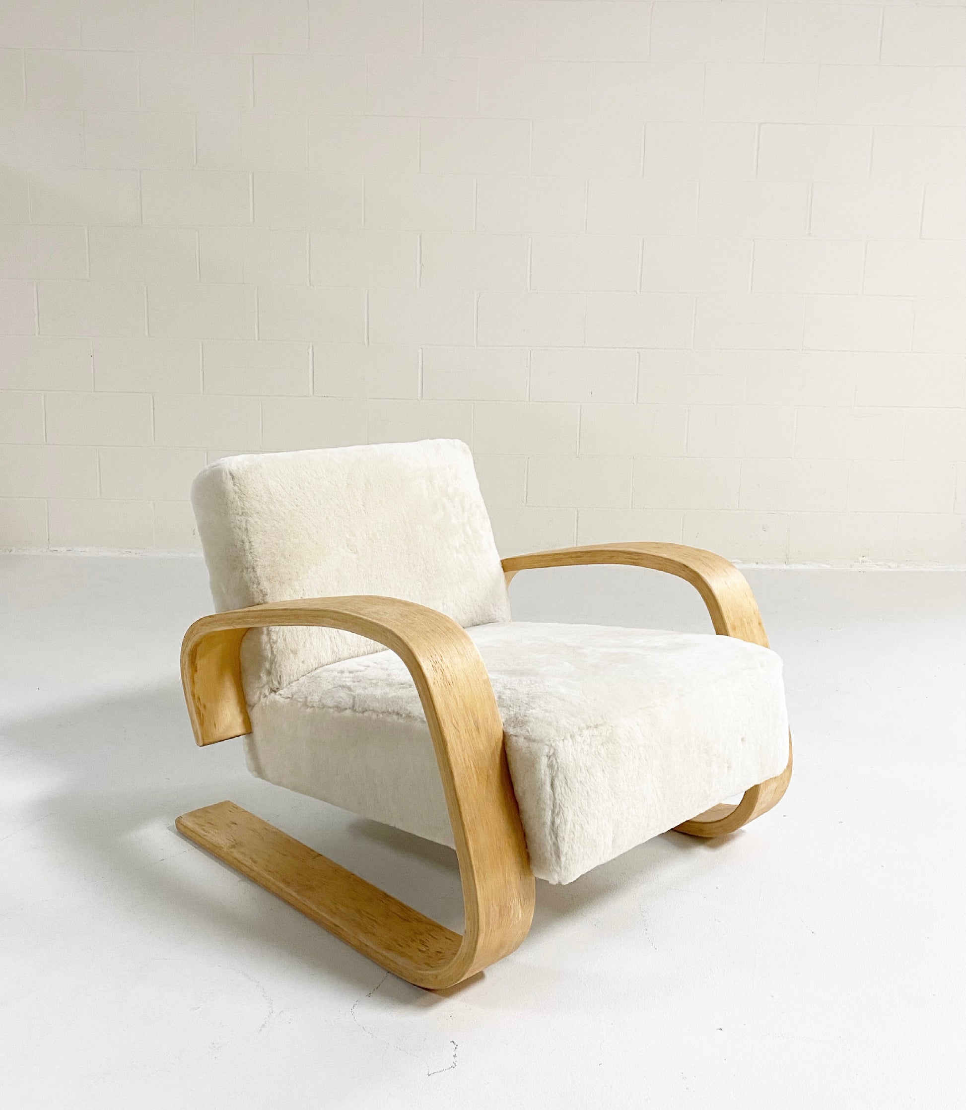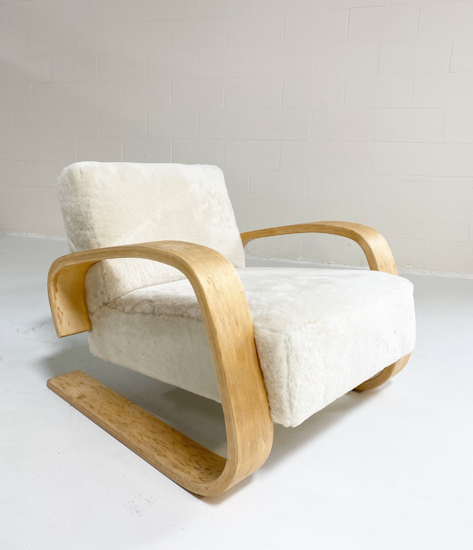 A beautiful Tank armchair, masterfully restored in ivory shearling. The Armchair 400 or "Tank Chair" is one of Alvar Aalto's best known works. The sculptural cantilever design showcases the beauty of bent plywood. The chair alone is one of the most comfortable chairs of mid-century design with the wide, deep seat. With the addition of soft as cashmere shearling, this chair rockets into the next level of comfort. We love the beautiful combination of natural blond birch wood with the texture and color of ivory shearling too. A match made in dreamland.