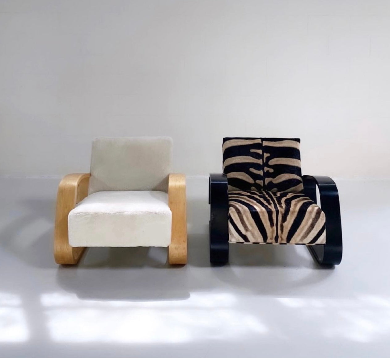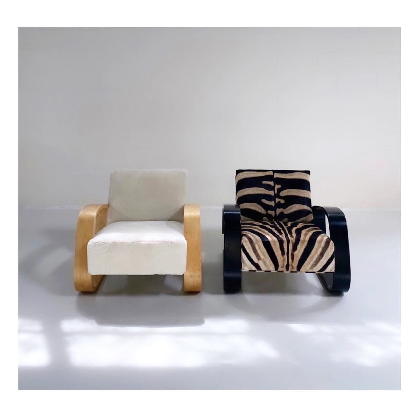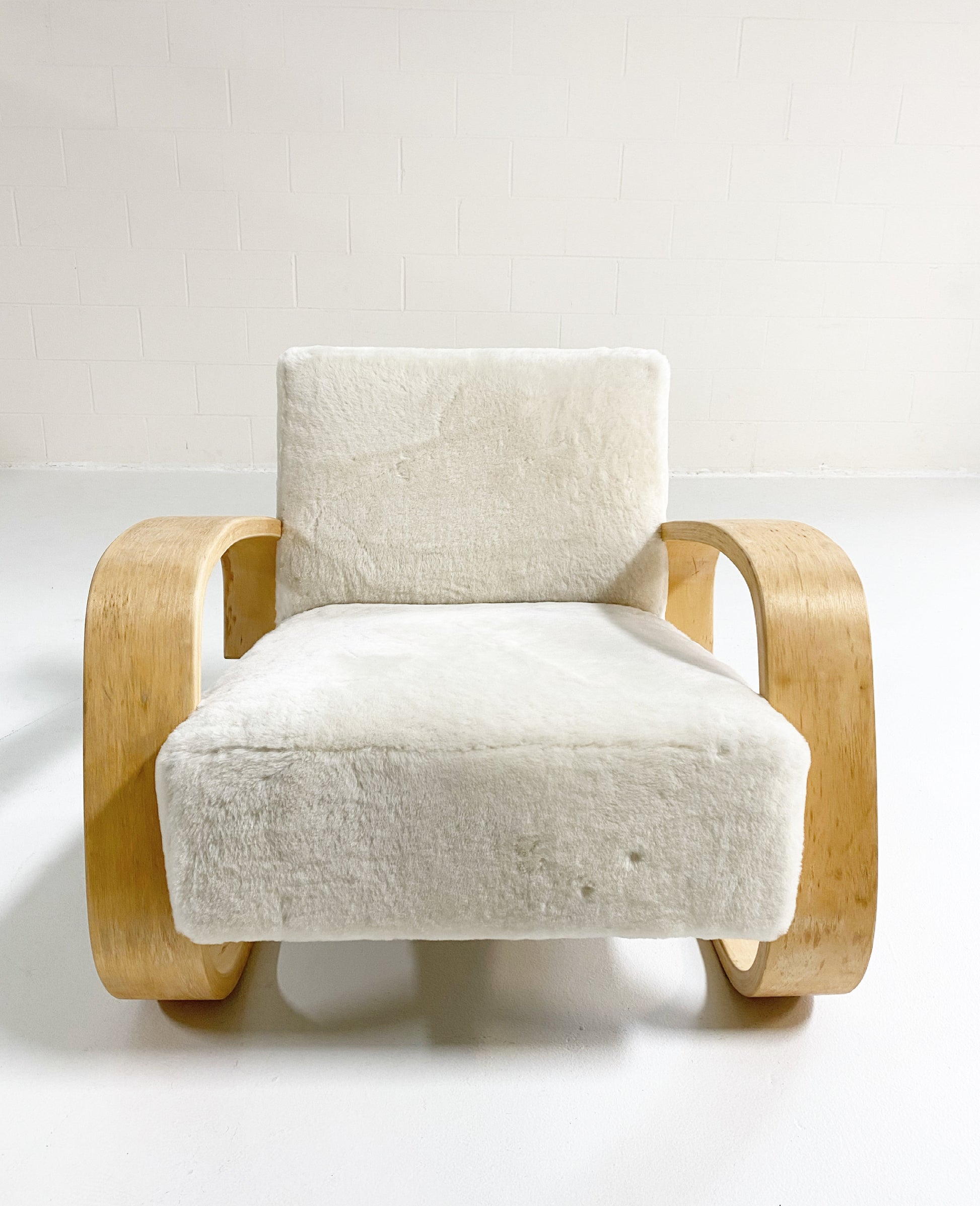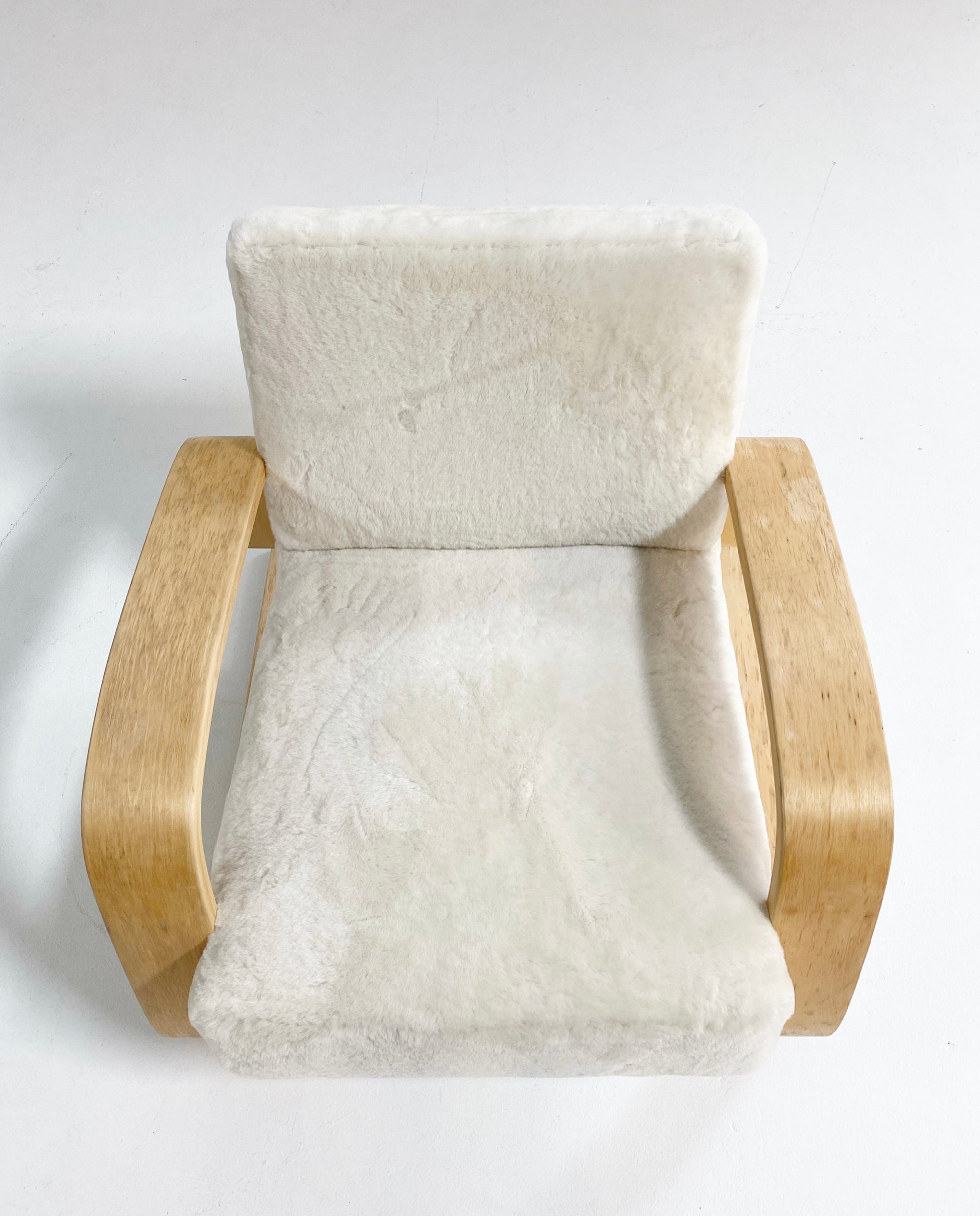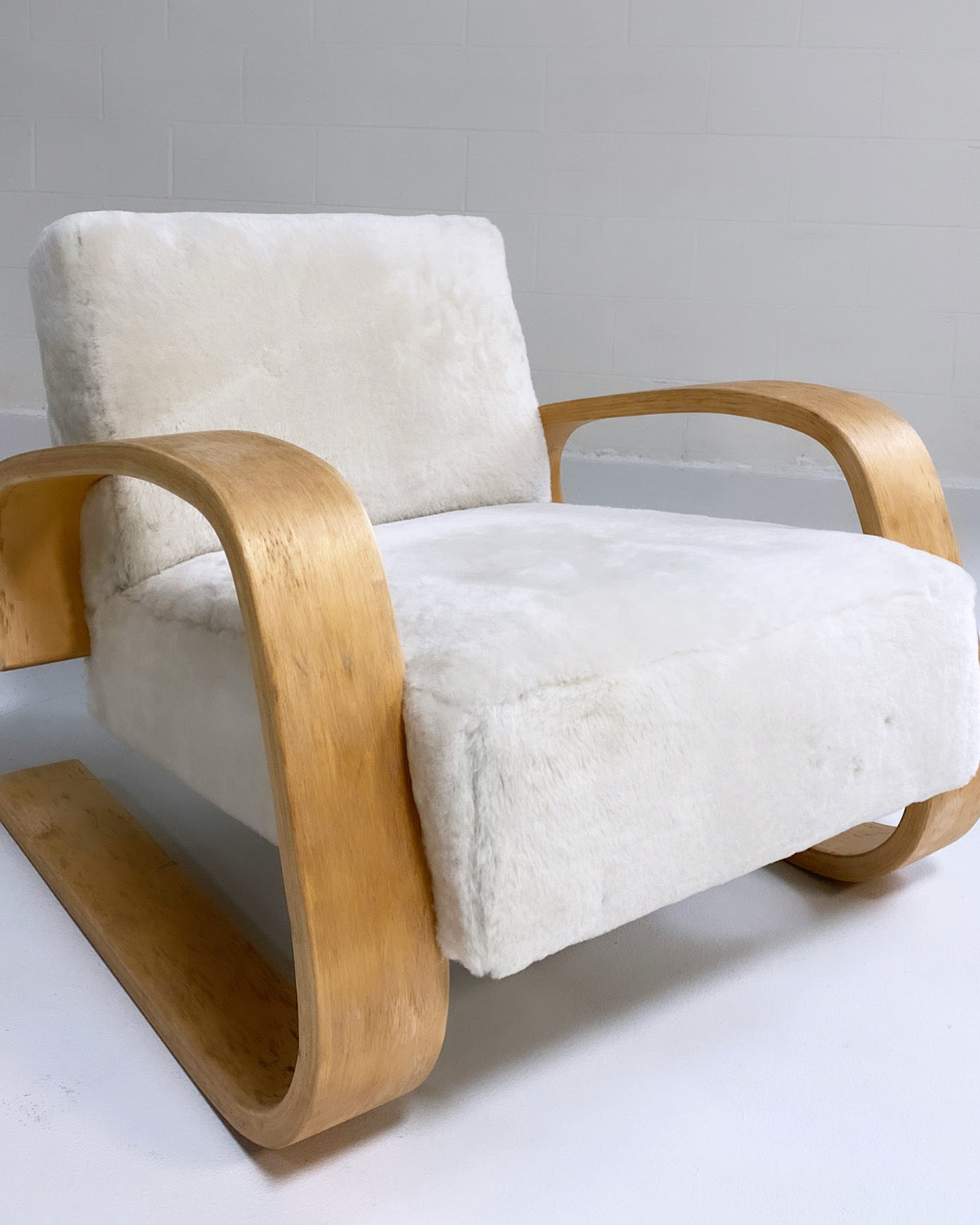 A beautiful Tank armchair, masterfully restored in ivory shearling. The Armchair 400 or "Tank Chair" is one of Alvar Aalto's best known works. The sculptural cantilever design showcases the beauty of bent plywood. The chair alone is one of the most comfortable chairs of mid-century design with the wide, deep seat. With the addition of soft as cashmere shearling, this chair rockets into the next level of comfort. We love the beautiful combination of natural blond birch wood with the texture and color of ivory shearling too. A match made in dreamland.