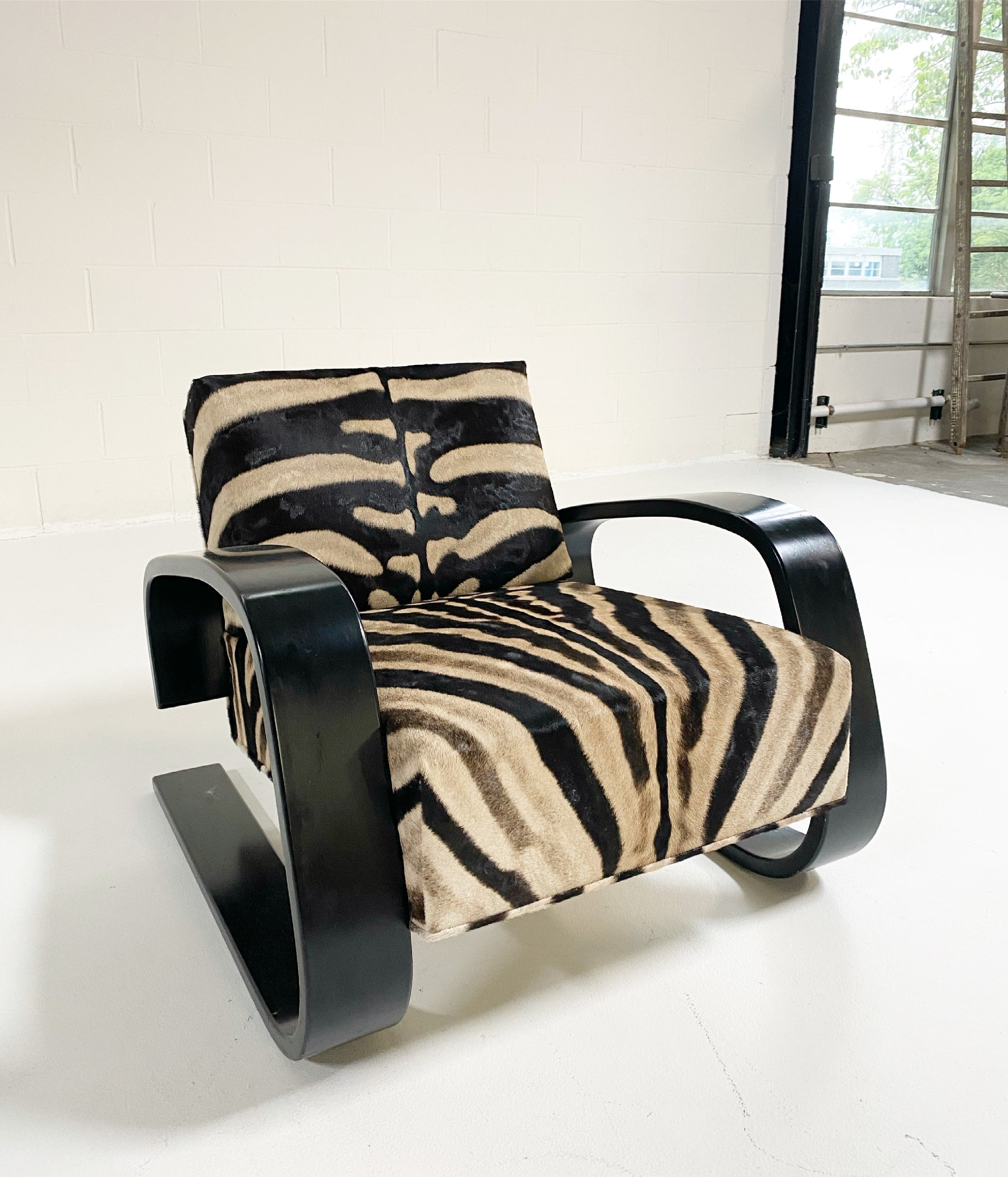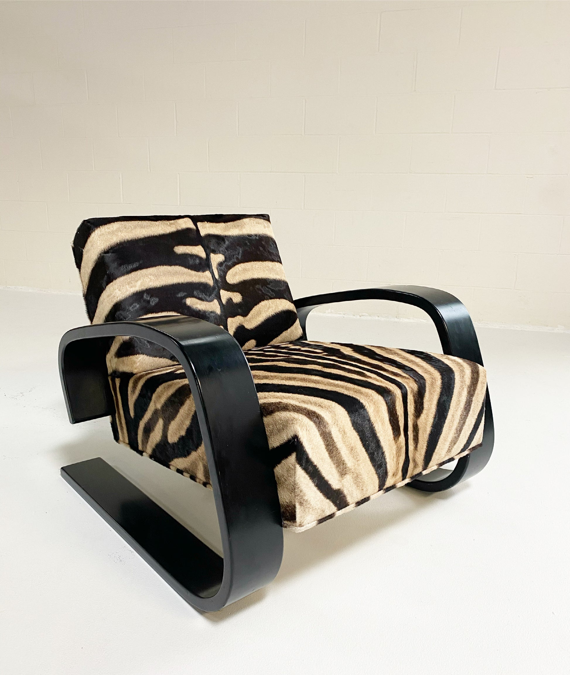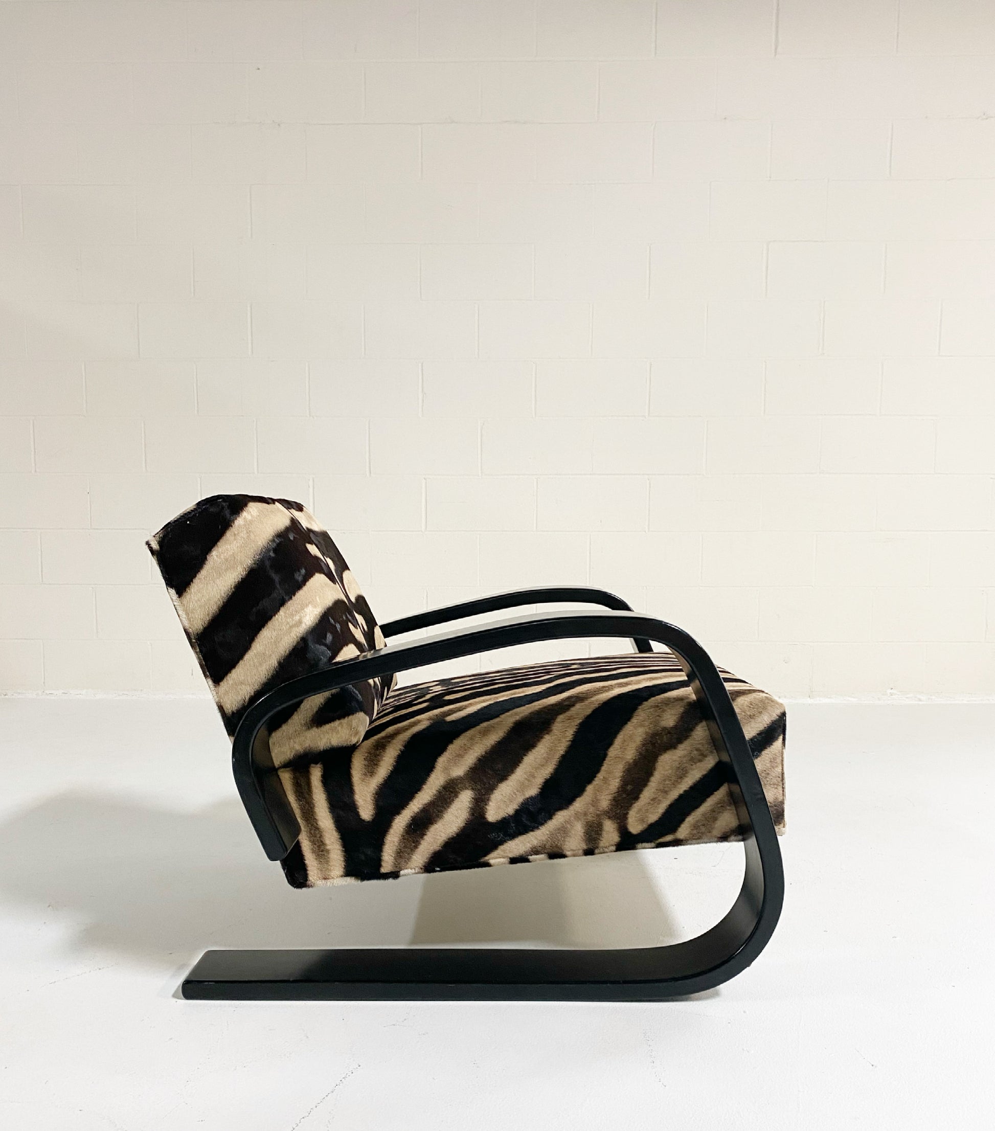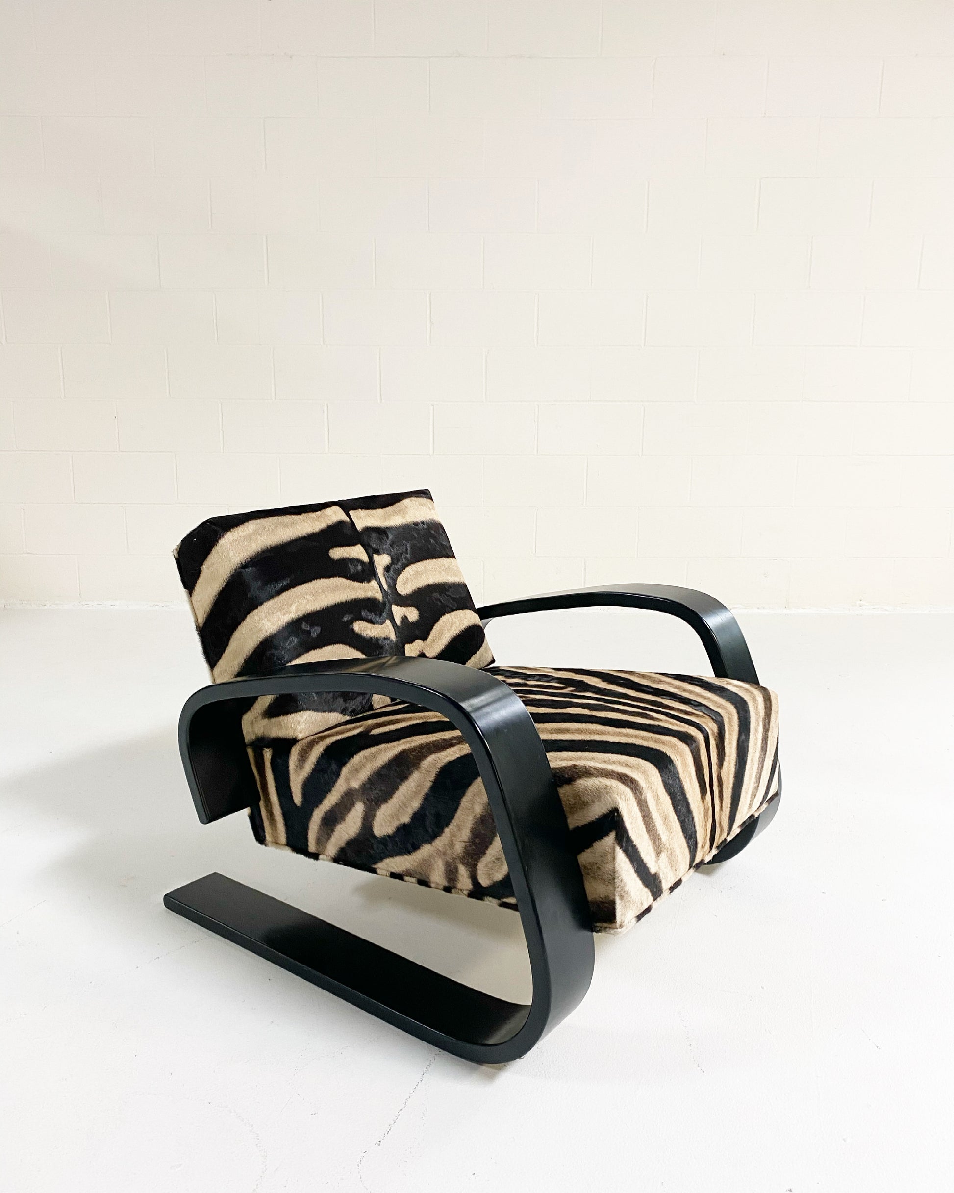 A beautiful Tank armchair, masterfully restored in zebra hide. The Armchair 400 or "Tank Chair" is one of Alvar Aalto's best known works. The sculptural cantilever design showcases the beauty of bent plywood. The chair alone is one of the most comfortable chairs of mid-century design with the wide, deep seat. It has been a dream to restore a Tank chair in zebra hide to mimic the original zebra fabric so loved by Alvar's wife, Aino, that accompanied the original Tank design. We also love the zebra with the laminated black birch. Forever chic.