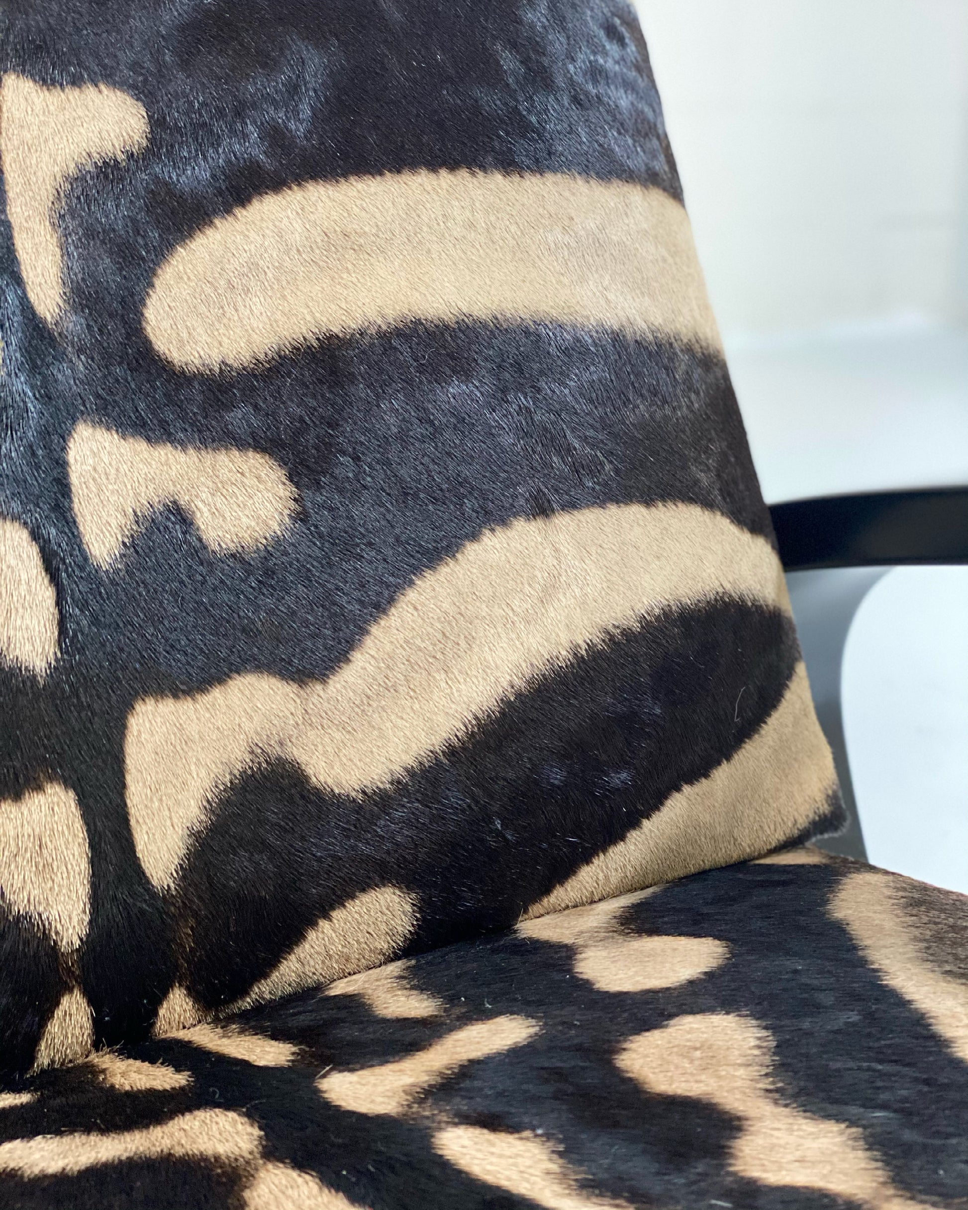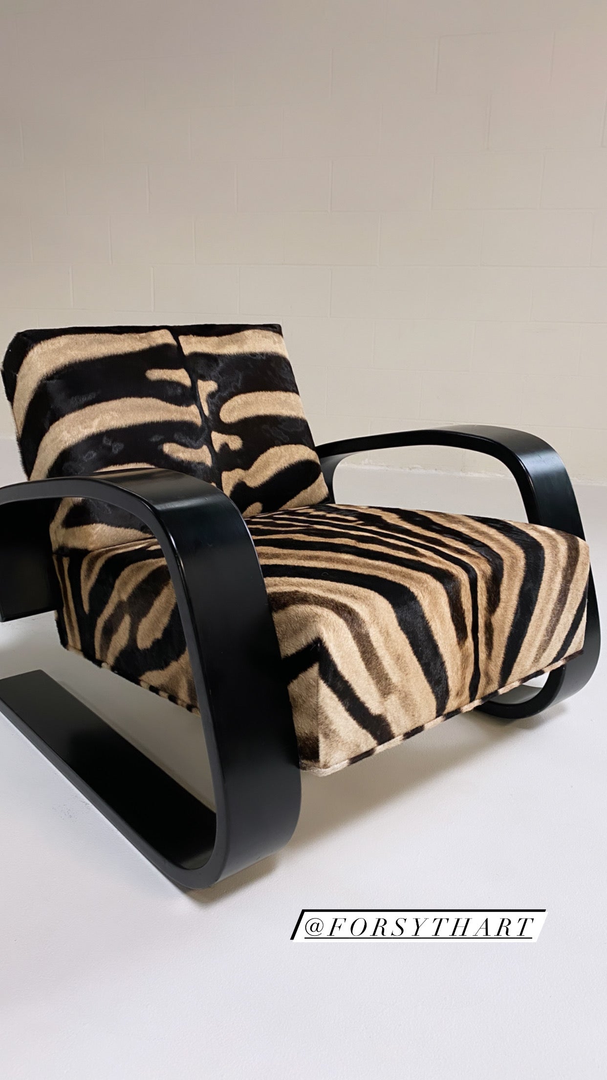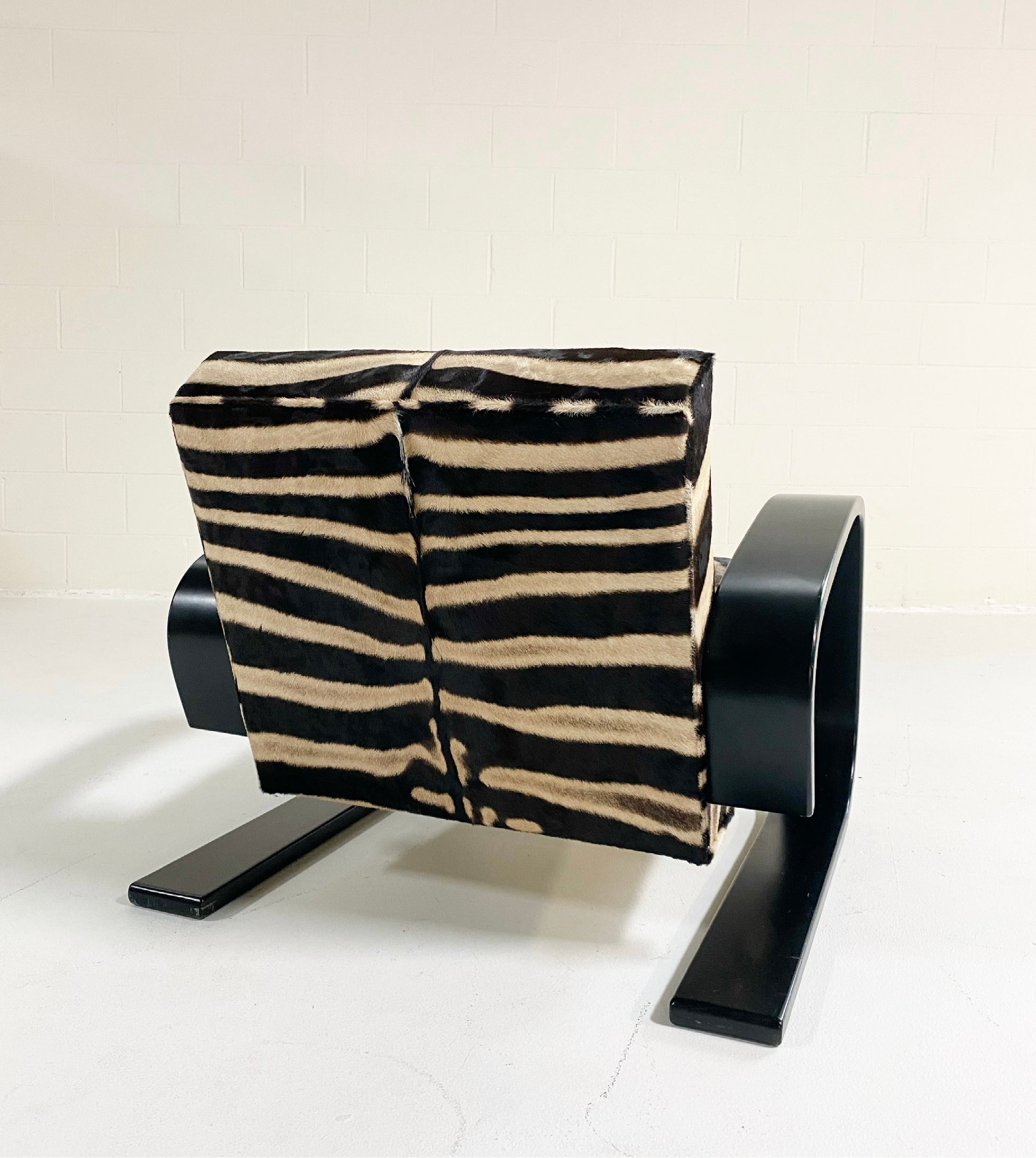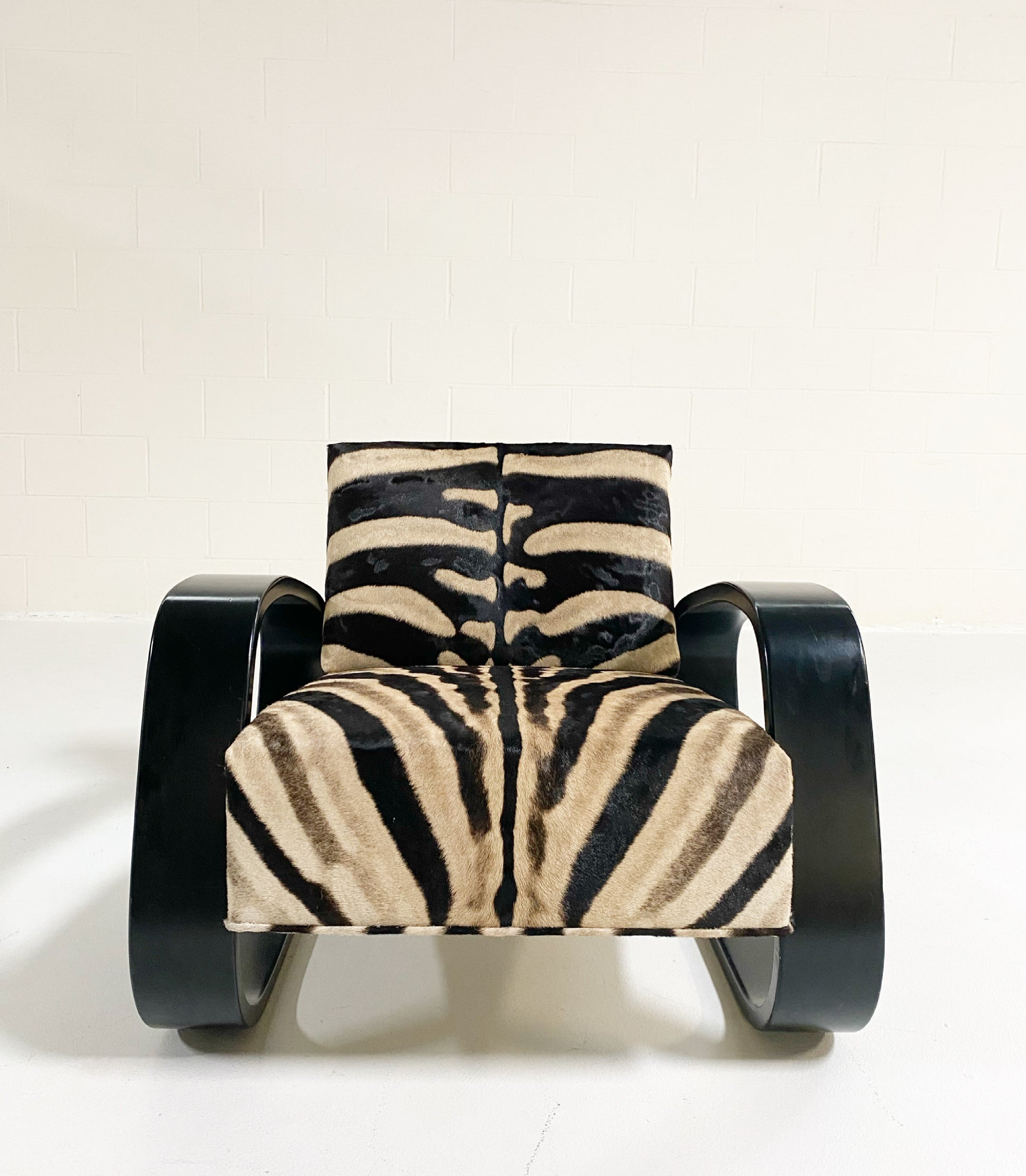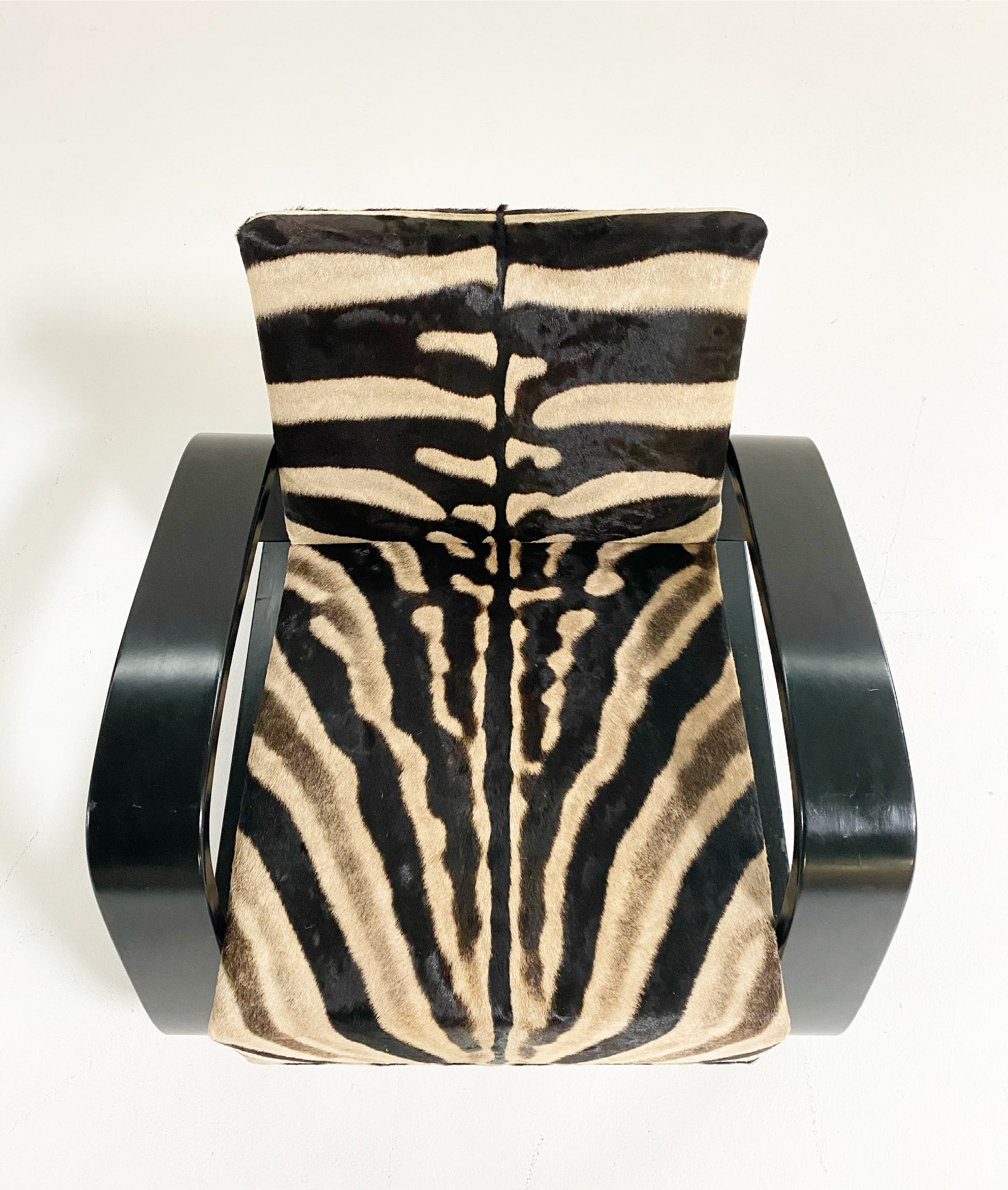 A beautiful Tank armchair, masterfully restored in zebra hide. The Armchair 400 or "Tank Chair" is one of Alvar Aalto's best known works. The sculptural cantilever design showcases the beauty of bent plywood. The chair alone is one of the most comfortable chairs of mid-century design with the wide, deep seat. It has been a dream to restore a Tank chair in zebra hide to mimic the original zebra fabric so loved by Alvar's wife, Aino, that accompanied the original Tank design. We also love the zebra with the laminated black birch. Forever chic.