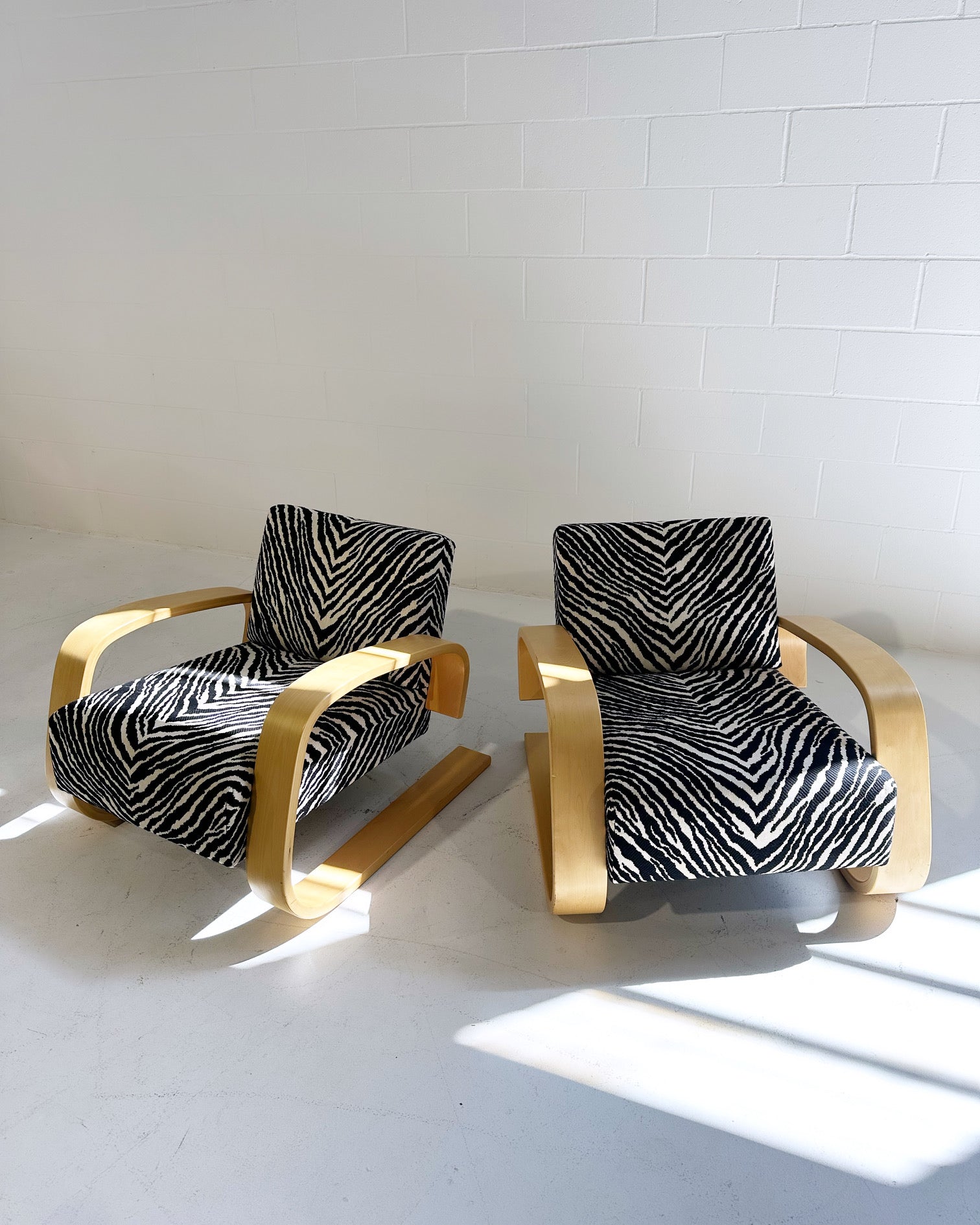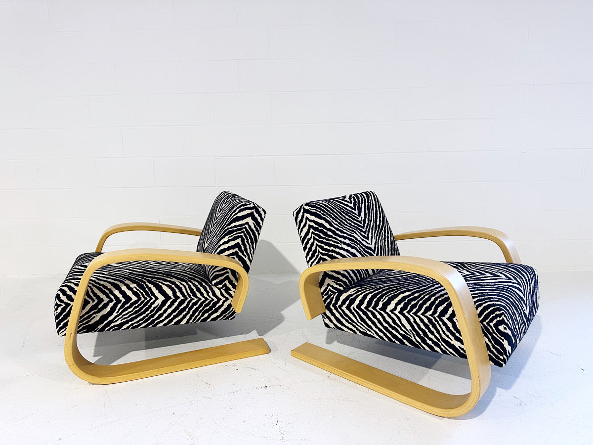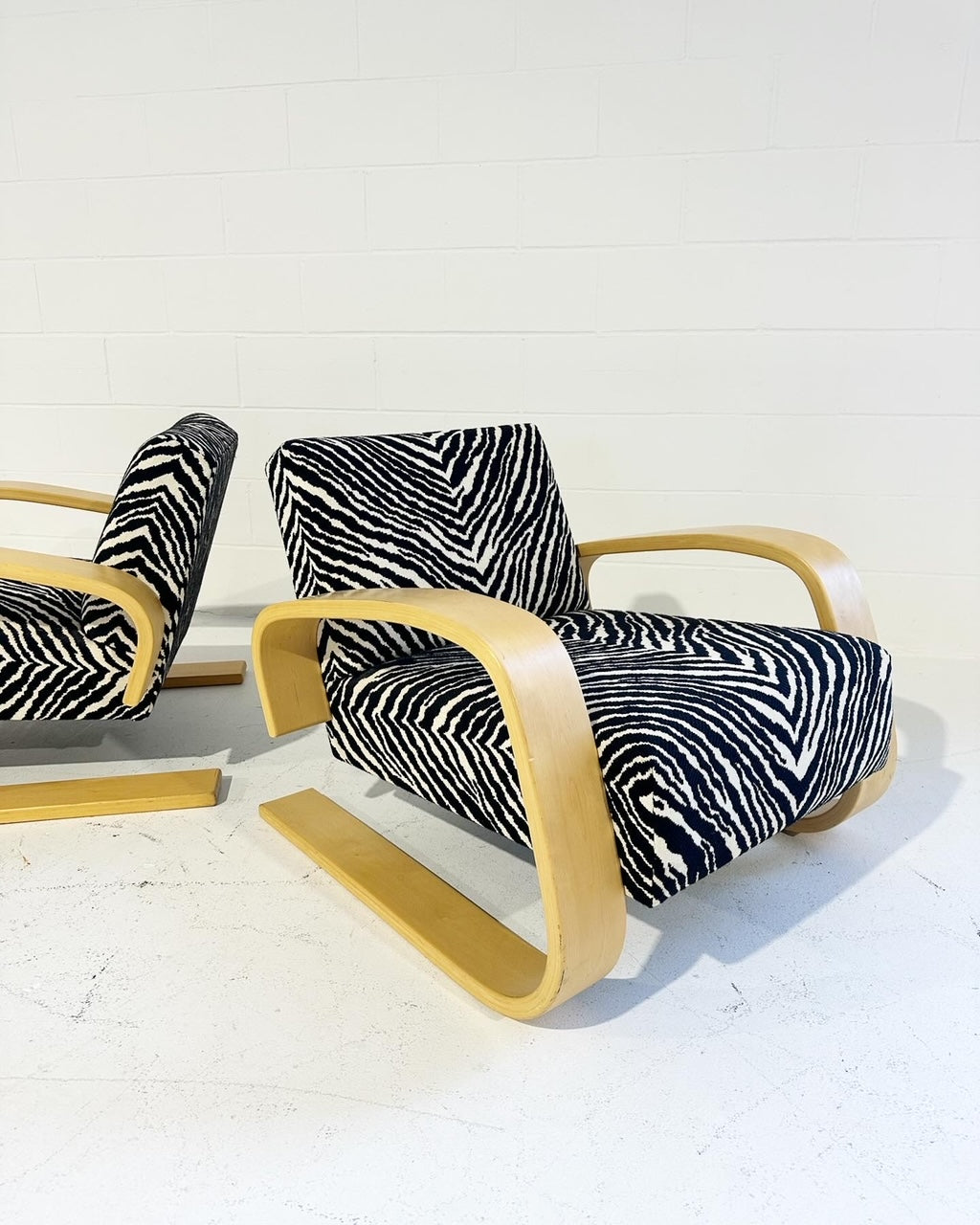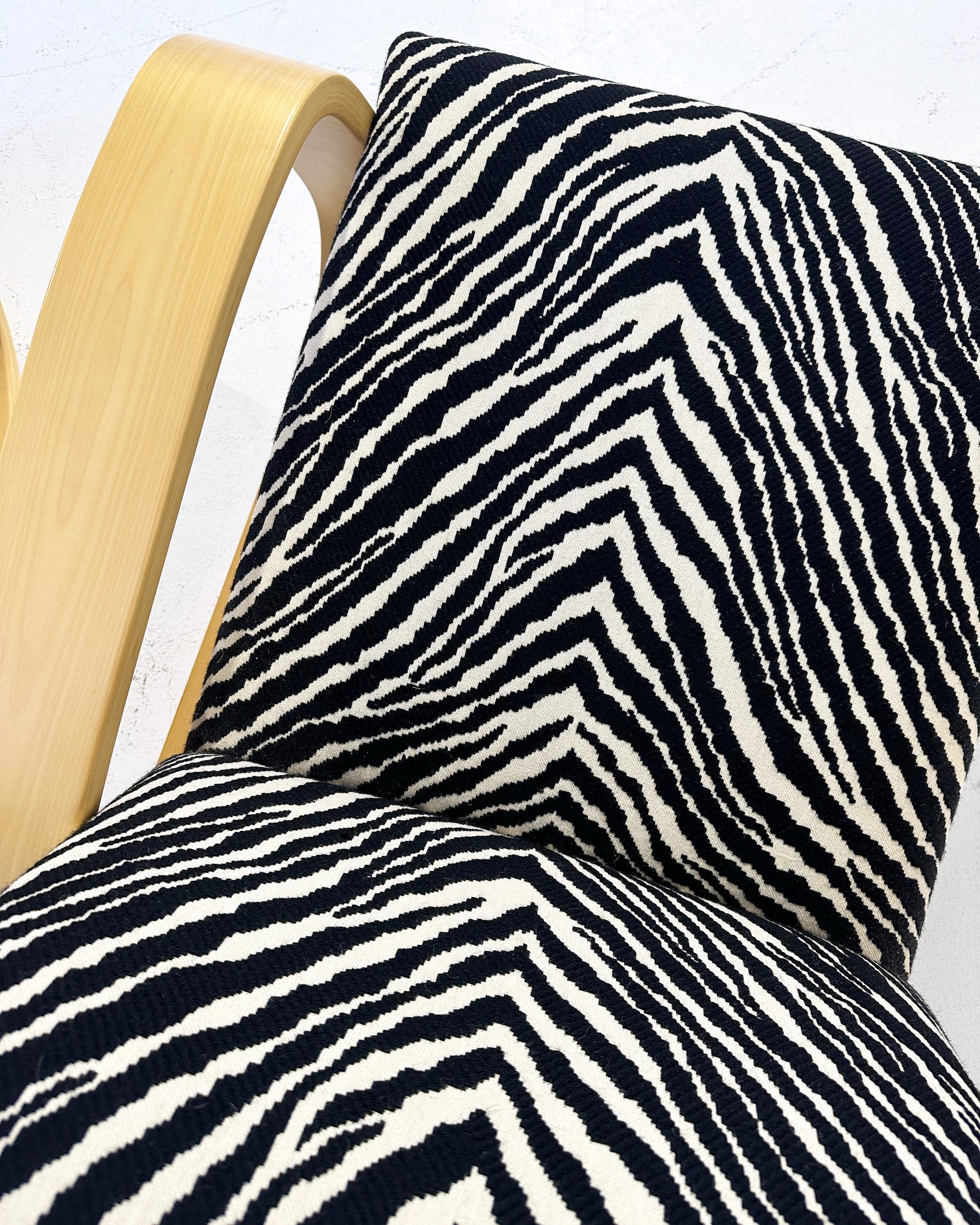 The Armchair 400 or "Tank Chair" is one of Alvar Aalto's best known works. The sculptural cantilever design showcases the beauty of bent plywood. The chair is one of the the most comfortable chair of mid-century design with the wide, deep seat. Upholstered in its original fabric, the famous Artek Zebra.