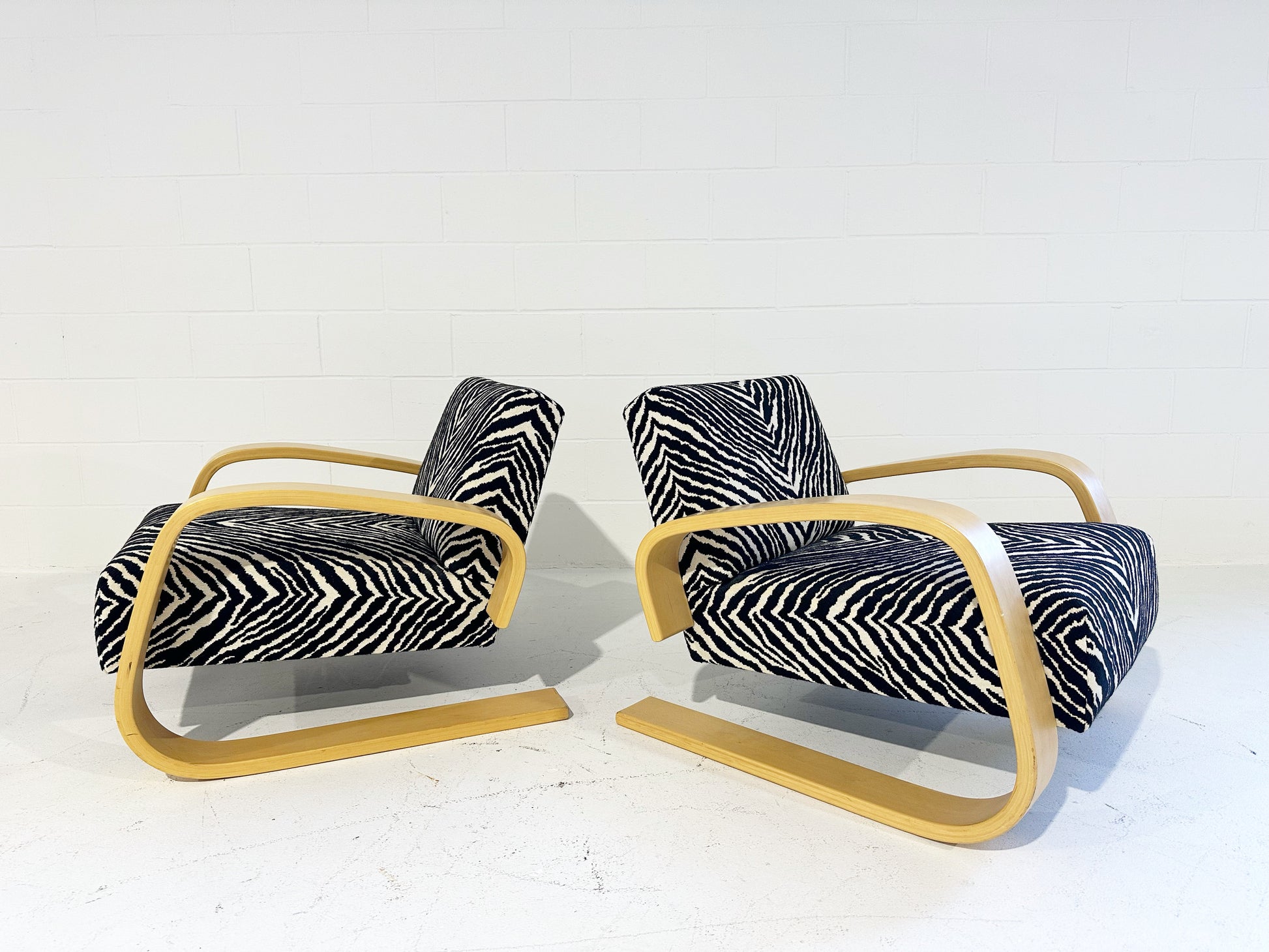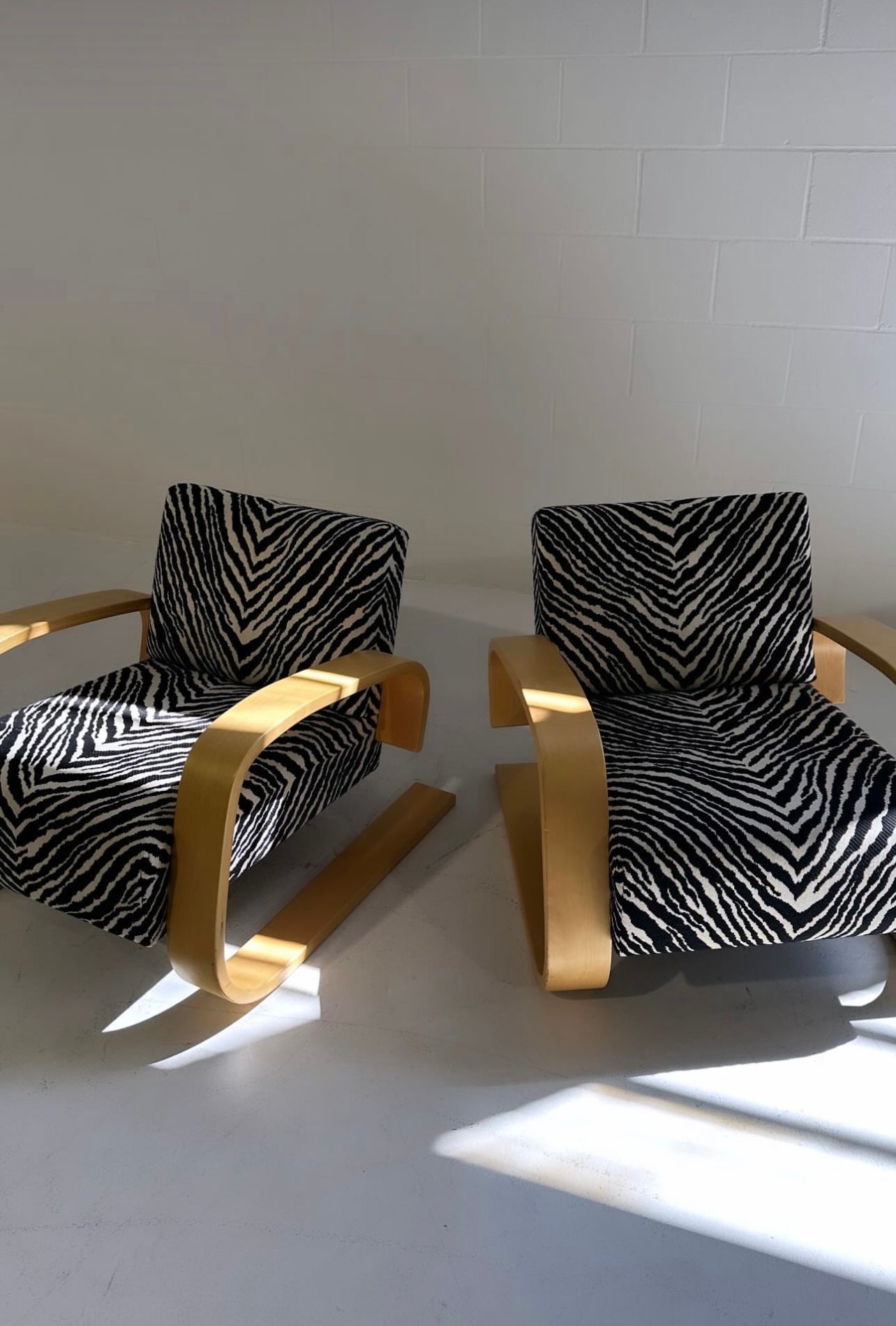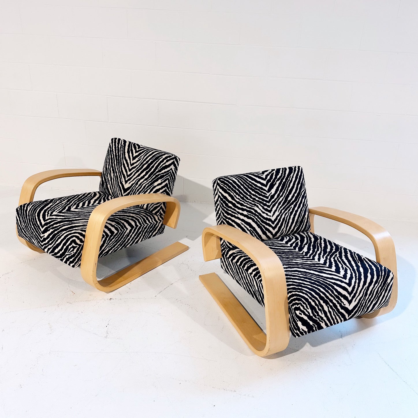 The Armchair 400 or "Tank Chair" is one of Alvar Aalto's best known works. The sculptural cantilever design showcases the beauty of bent plywood. The chair is one of the the most comfortable chair of mid-century design with the wide, deep seat. Upholstered in its original fabric, the famous Artek Zebra.