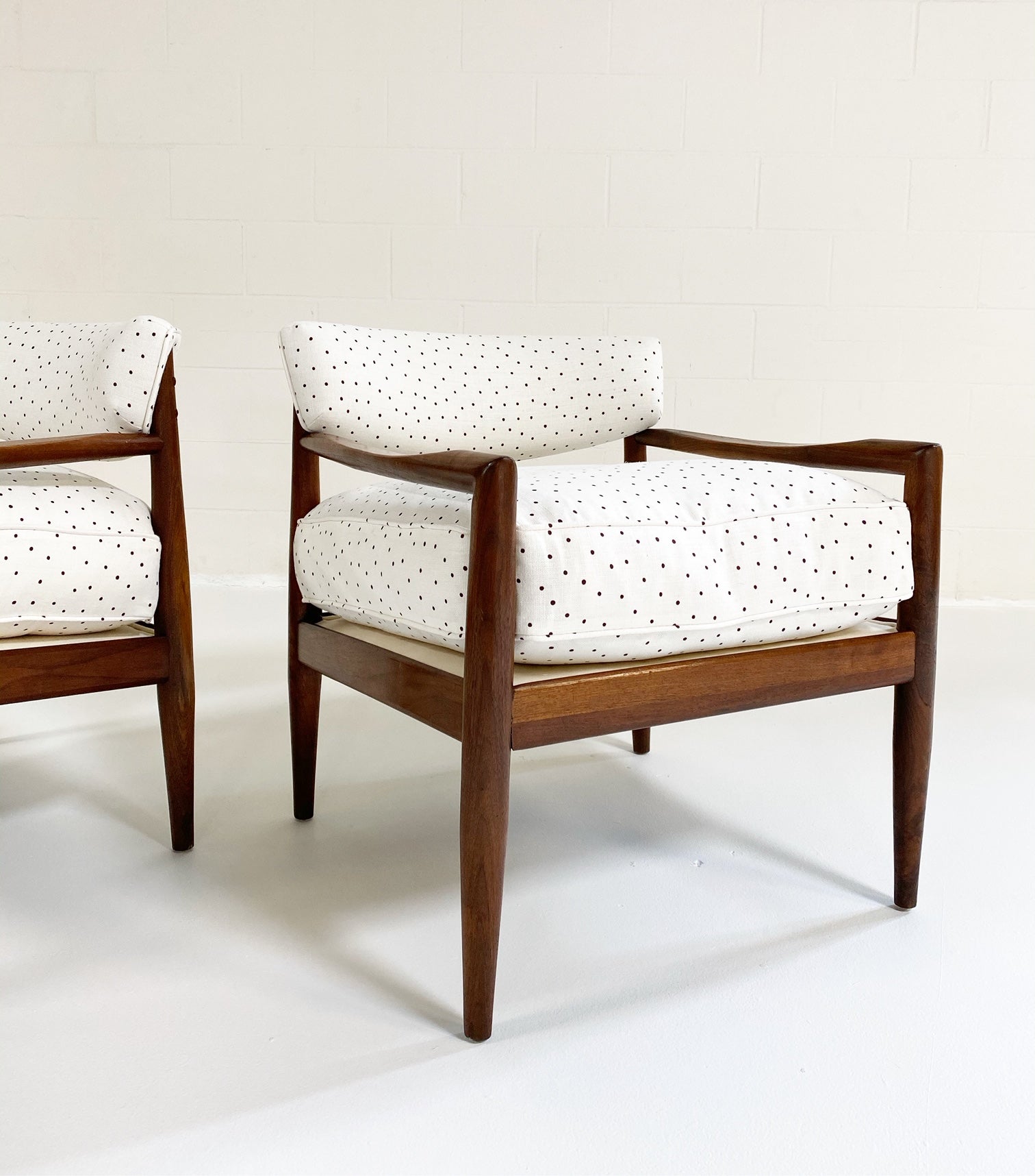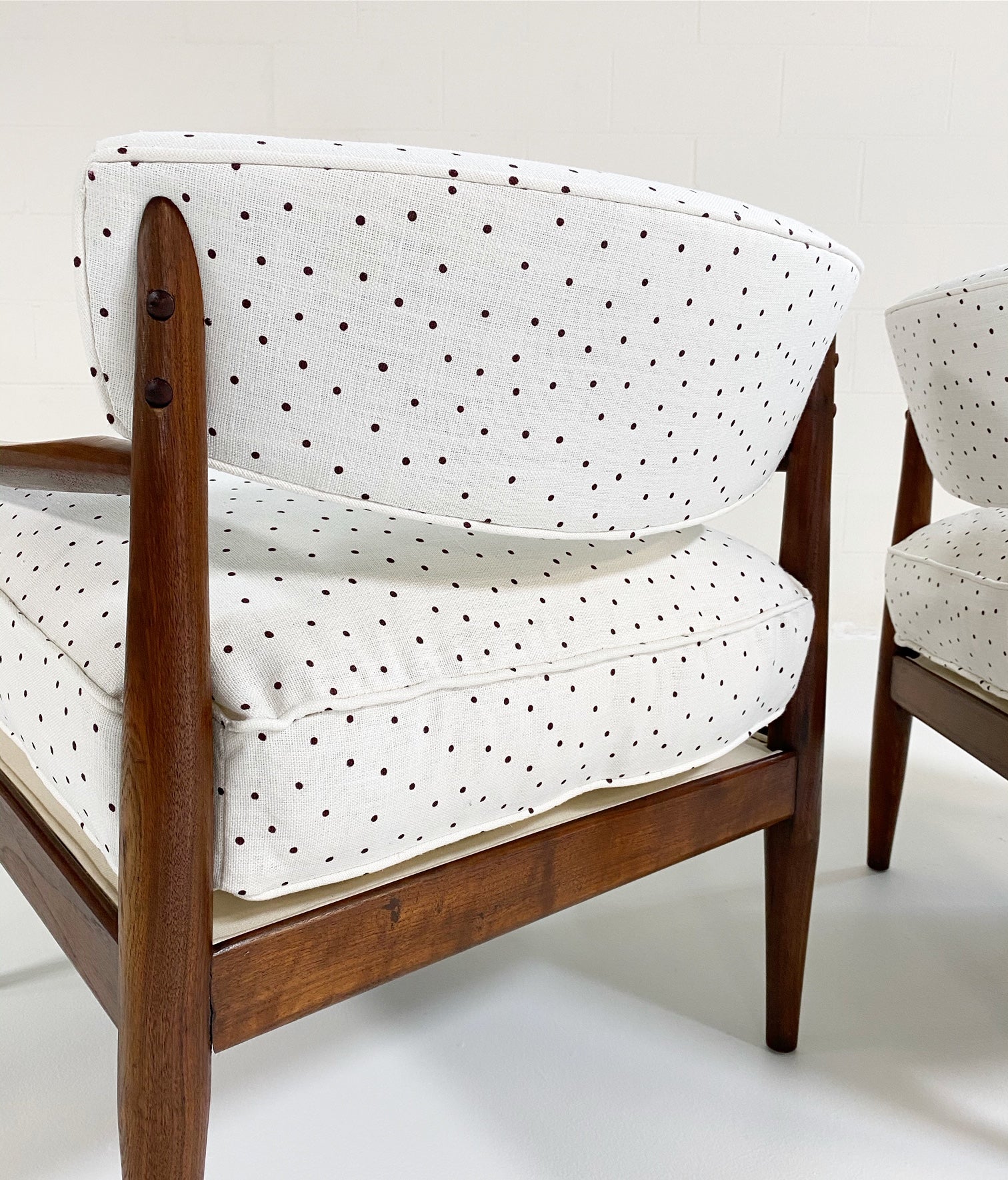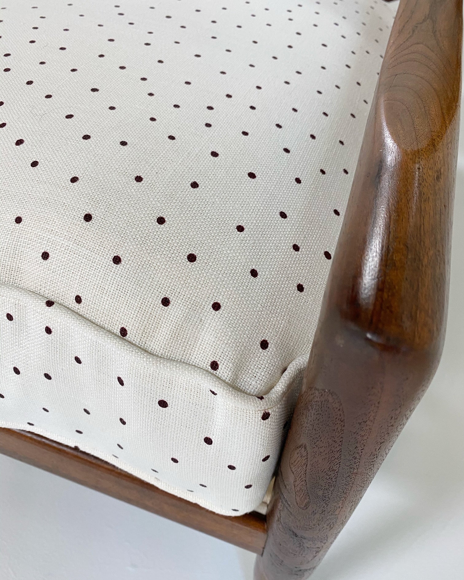 Rose Uniacke's line of fabrics is simple, straightforward, and sophisticated. We love this fabric. The printed deep burgundy dots are so cute. And it pairs perfectly with the beautiful walnut frame of this vintage Pearsall classic. We made the 100% feather seat cushion extra high for added comfort.