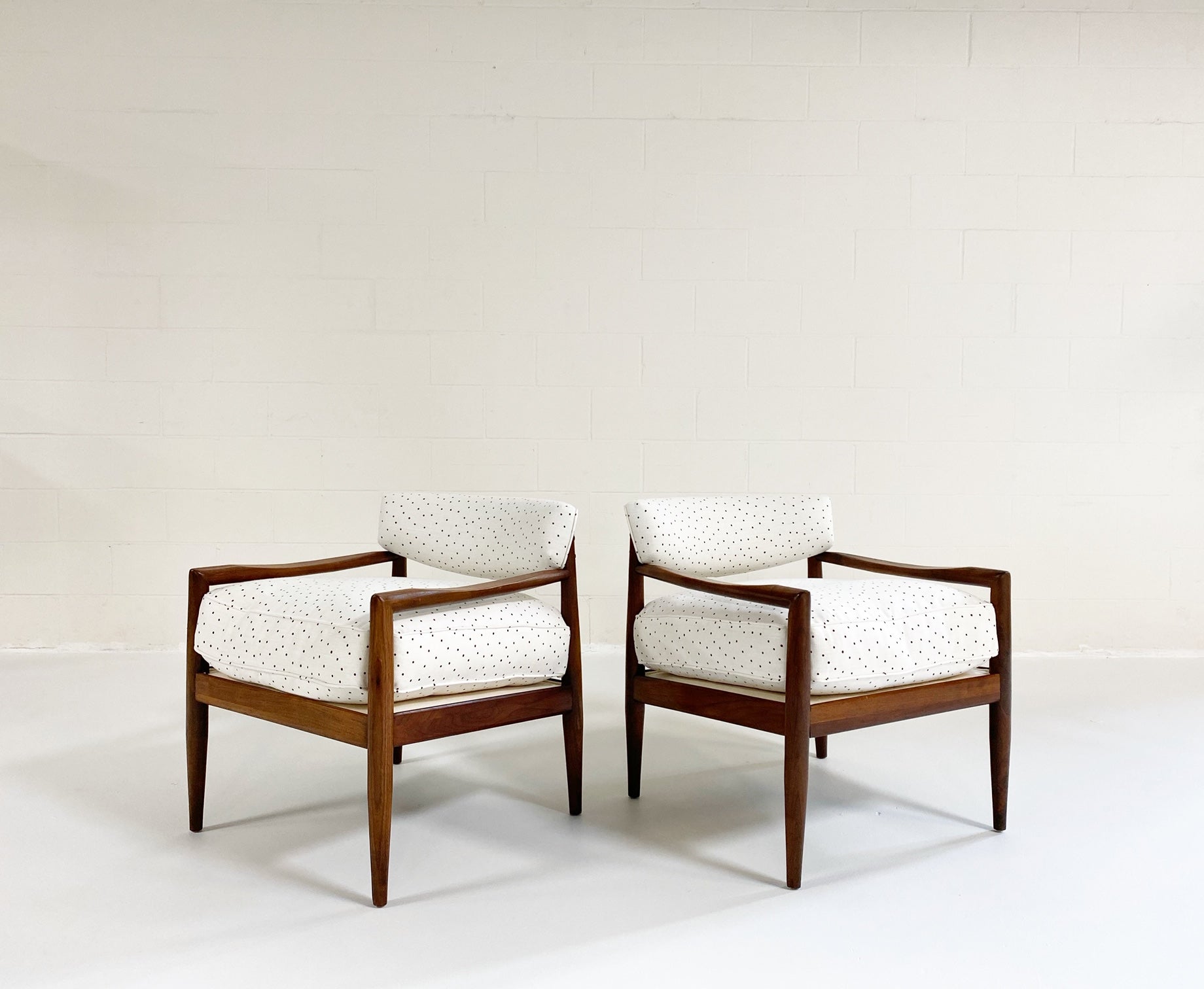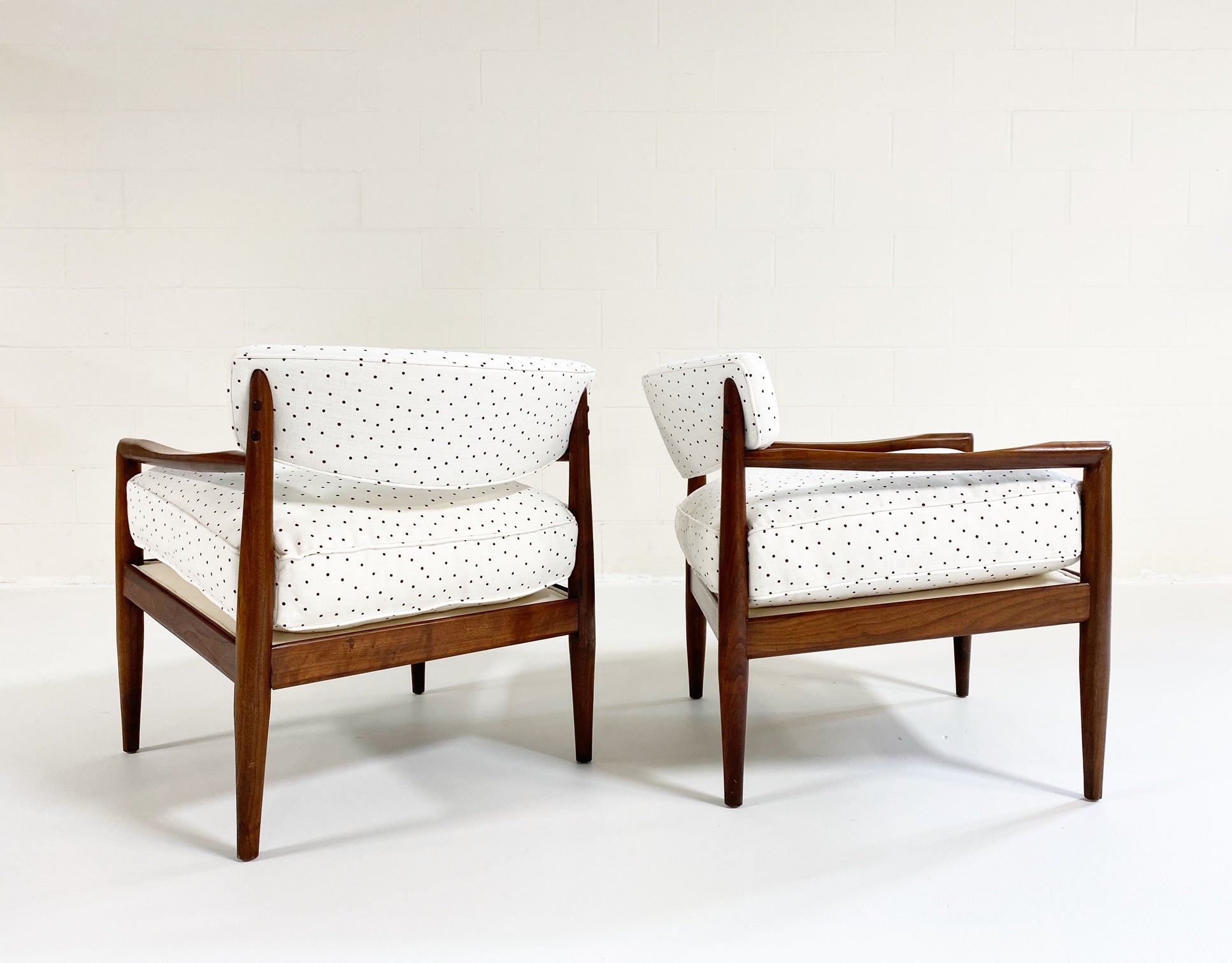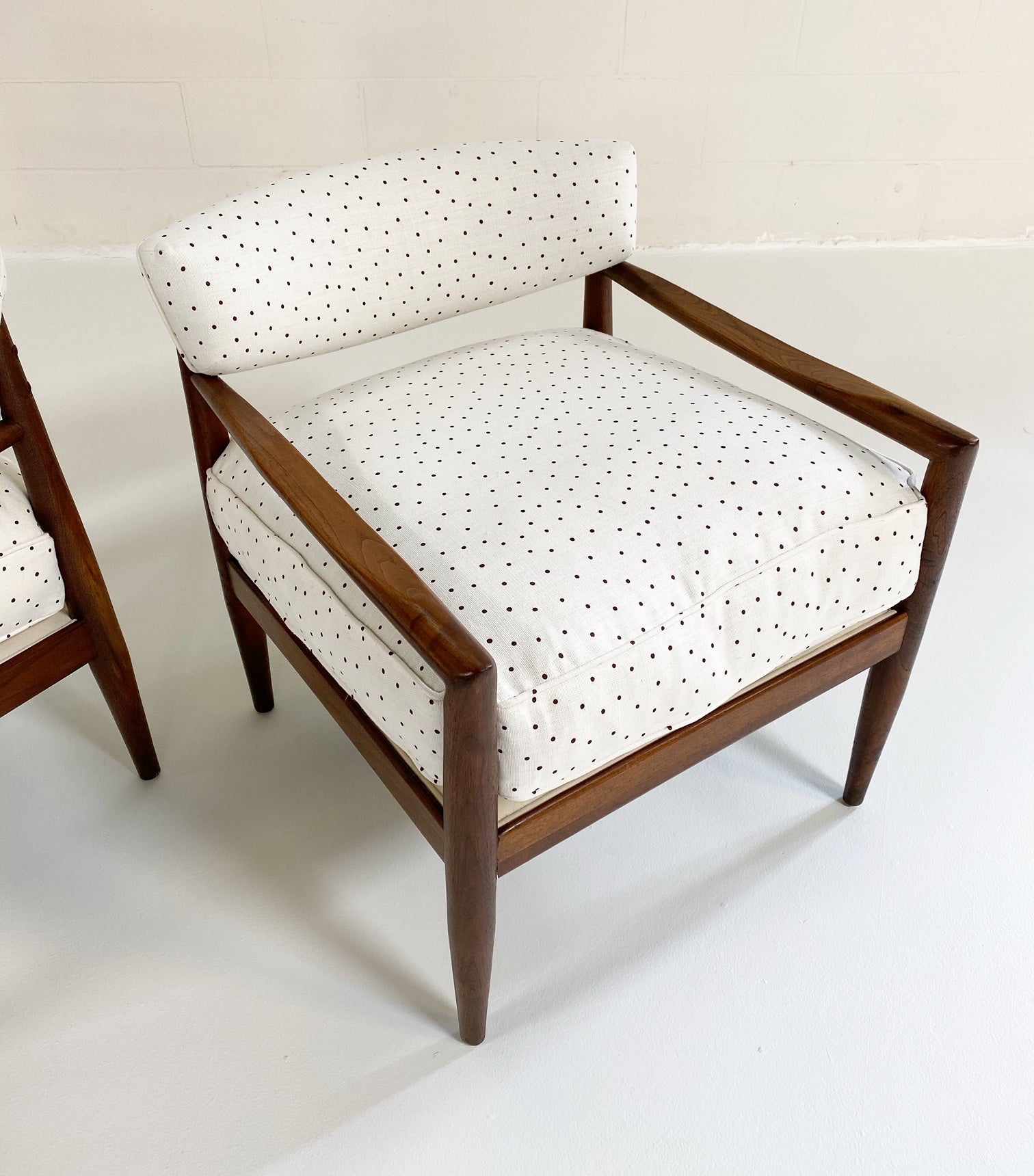 Rose Uniacke's line of fabrics is simple, straightforward, and sophisticated. We love this fabric. The printed deep burgundy dots are so cute. And it pairs perfectly with the beautiful walnut frame of this vintage Pearsall classic. We made the 100% feather seat cushion extra high for added comfort.