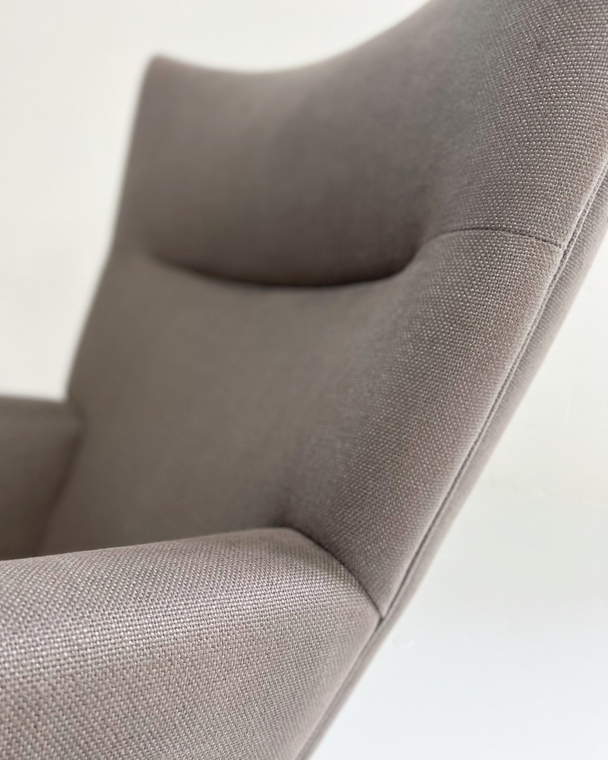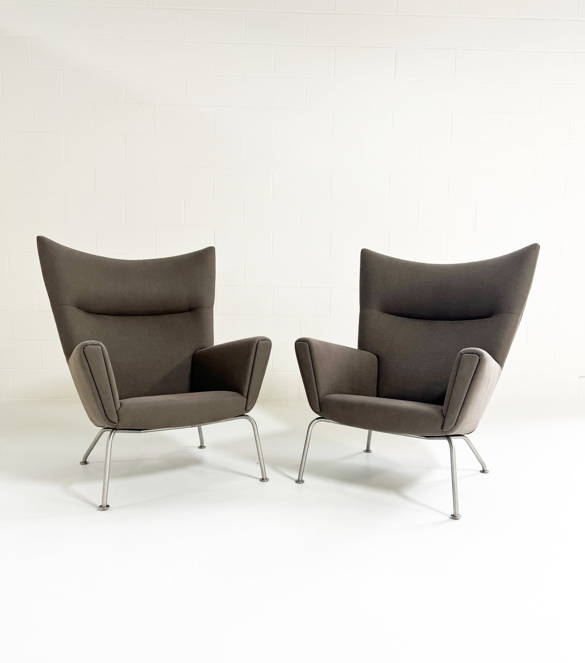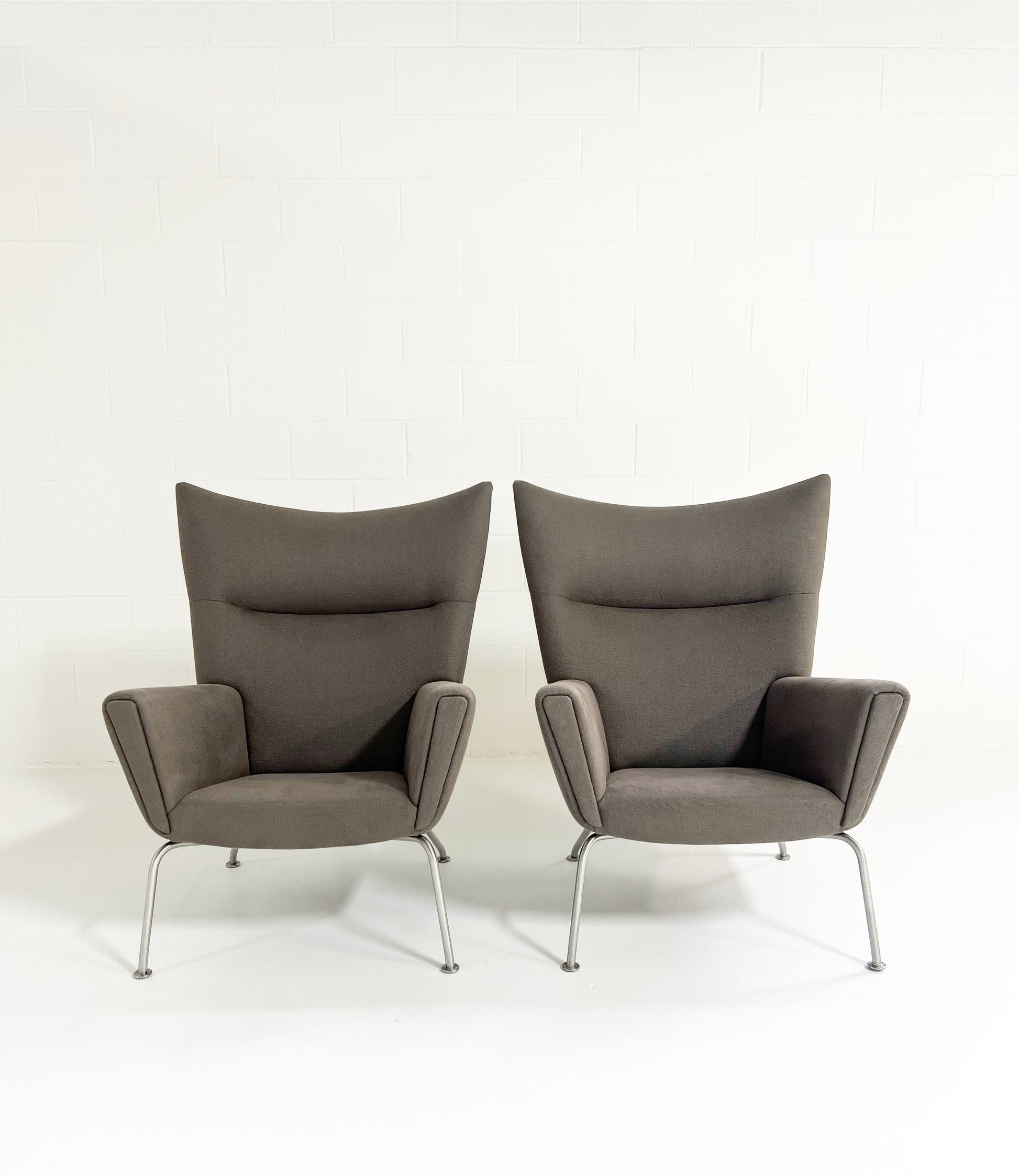 From Carl Hansen & Søn website: The CH445 Wing Chair is a high-backed, upholstered armchair with a stainless steel frame. Hans J. Wegner’s expertise for sculptured design and demand for quality craftsmanship is clearly expressed in this dramatic looking chair. We did not do the upholstery work on these. It is the original fabric, a gorgeous gunmetal basketweave linen which is in great shape. These tall, substantial, modern wingbacks are so cool and comfortable.