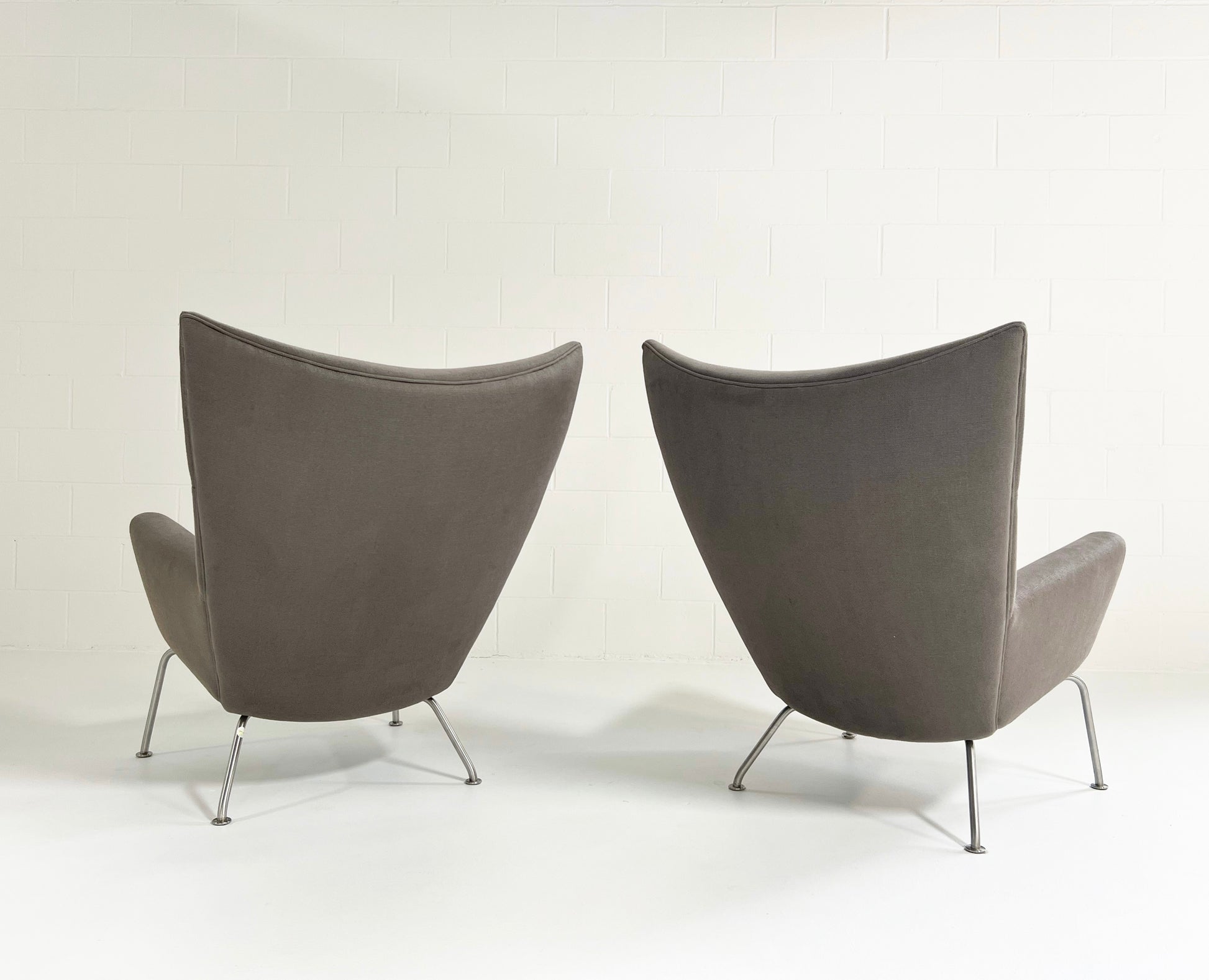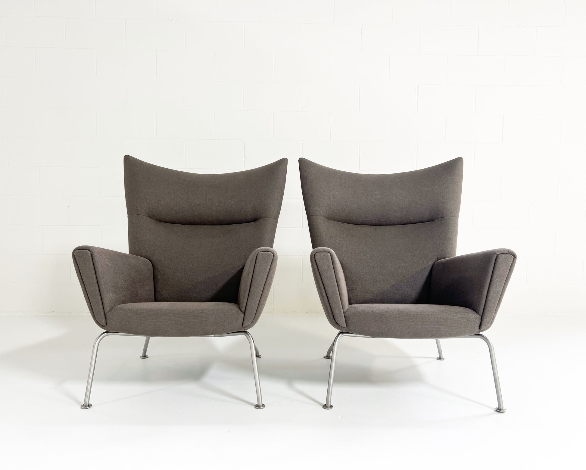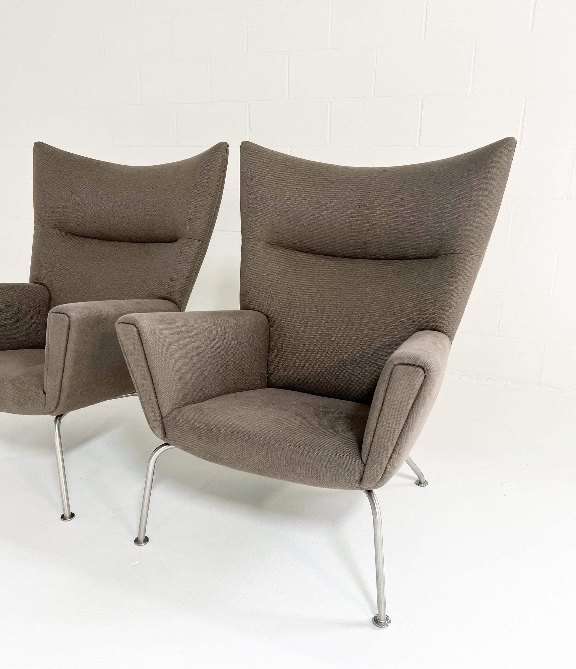 From Carl Hansen & Søn website: The CH445 Wing Chair is a high-backed, upholstered armchair with a stainless steel frame. Hans J. Wegner’s expertise for sculptured design and demand for quality craftsmanship is clearly expressed in this dramatic looking chair. We did not do the upholstery work on these. It is the original fabric, a gorgeous gunmetal basketweave linen which is in great shape. These tall, substantial, modern wingbacks are so cool and comfortable.