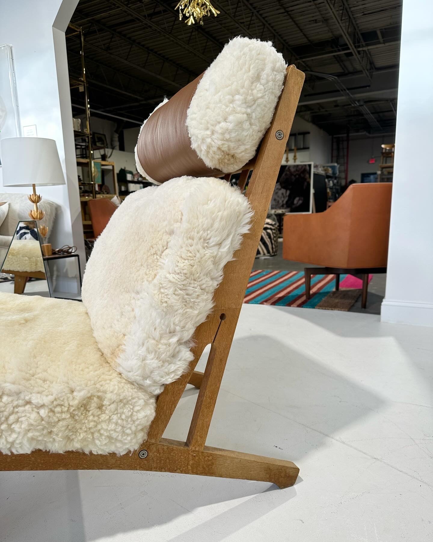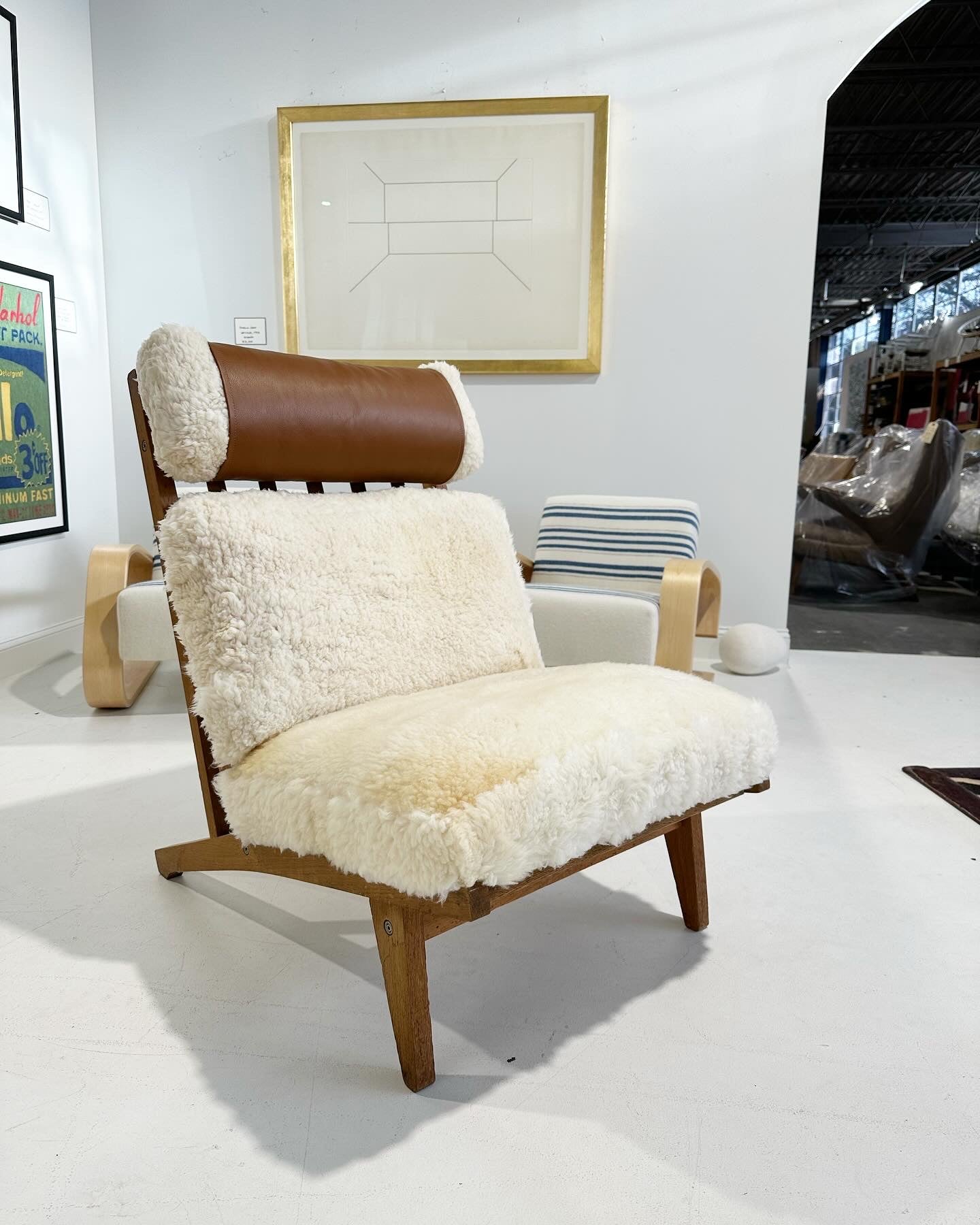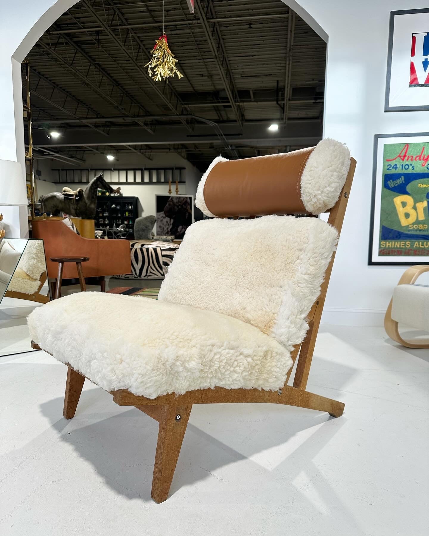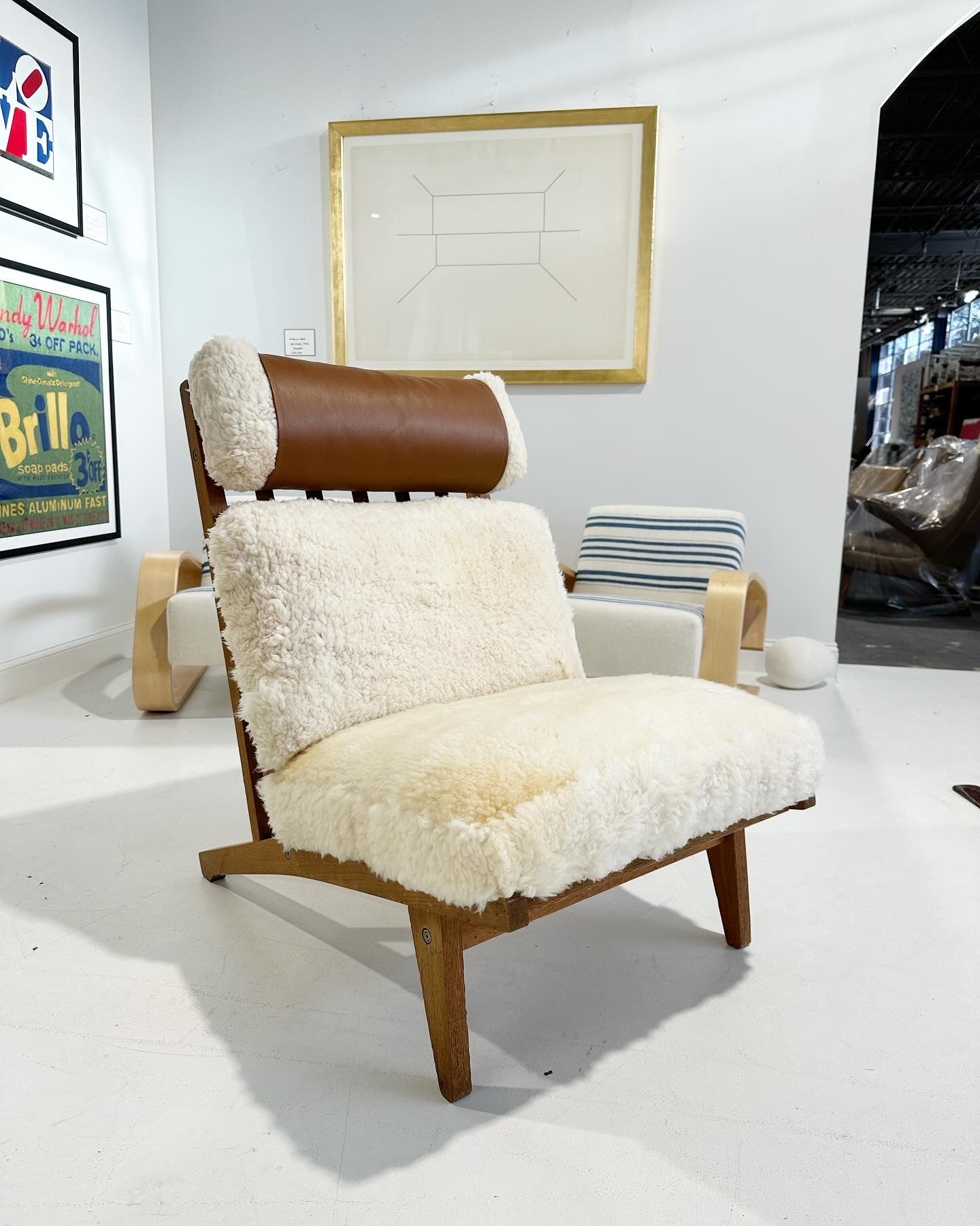 With gorgeous patinaed oak, custom California sheepskin cushions, and a finishing touch of beautiful Loro Piana leather, this Hans Wegner lounge chair is incredible. And so comfortable.