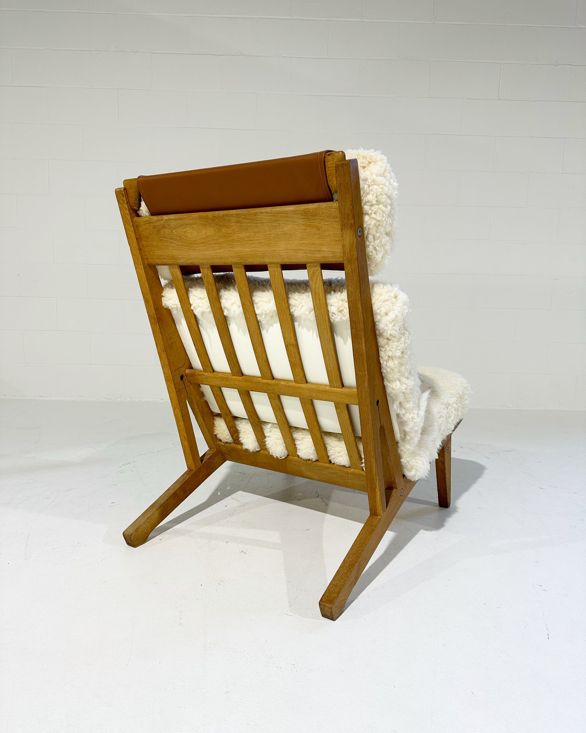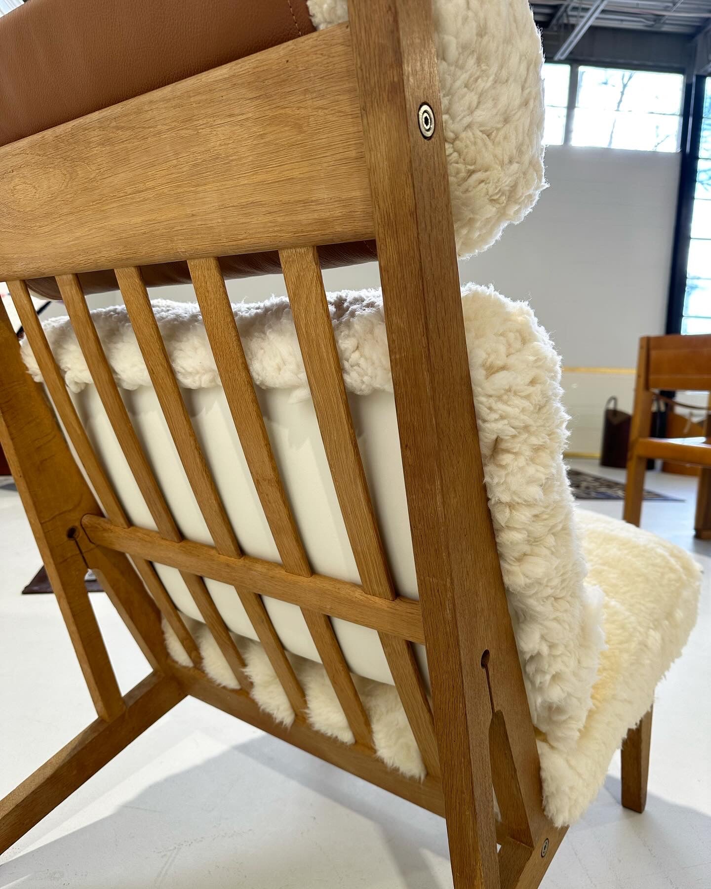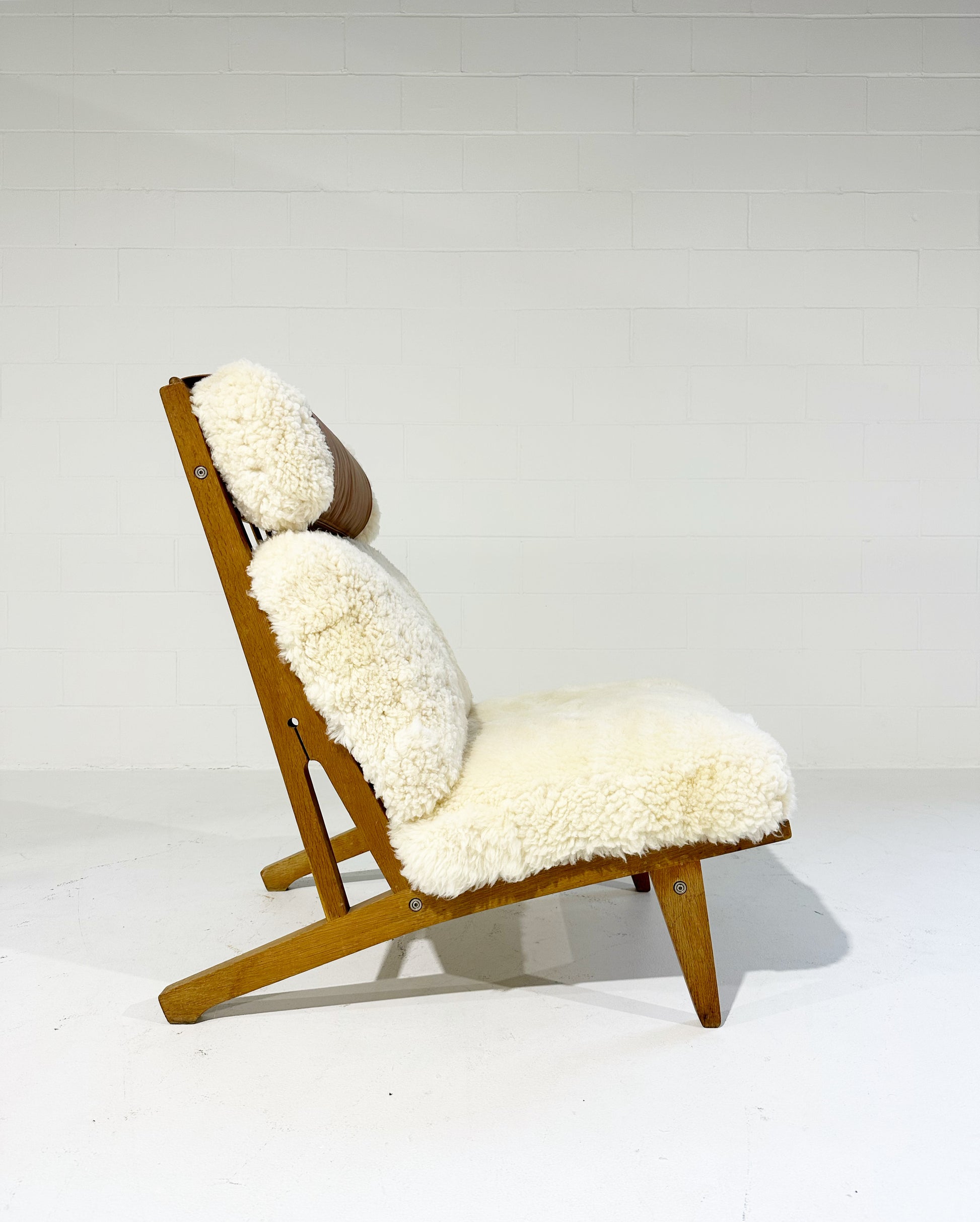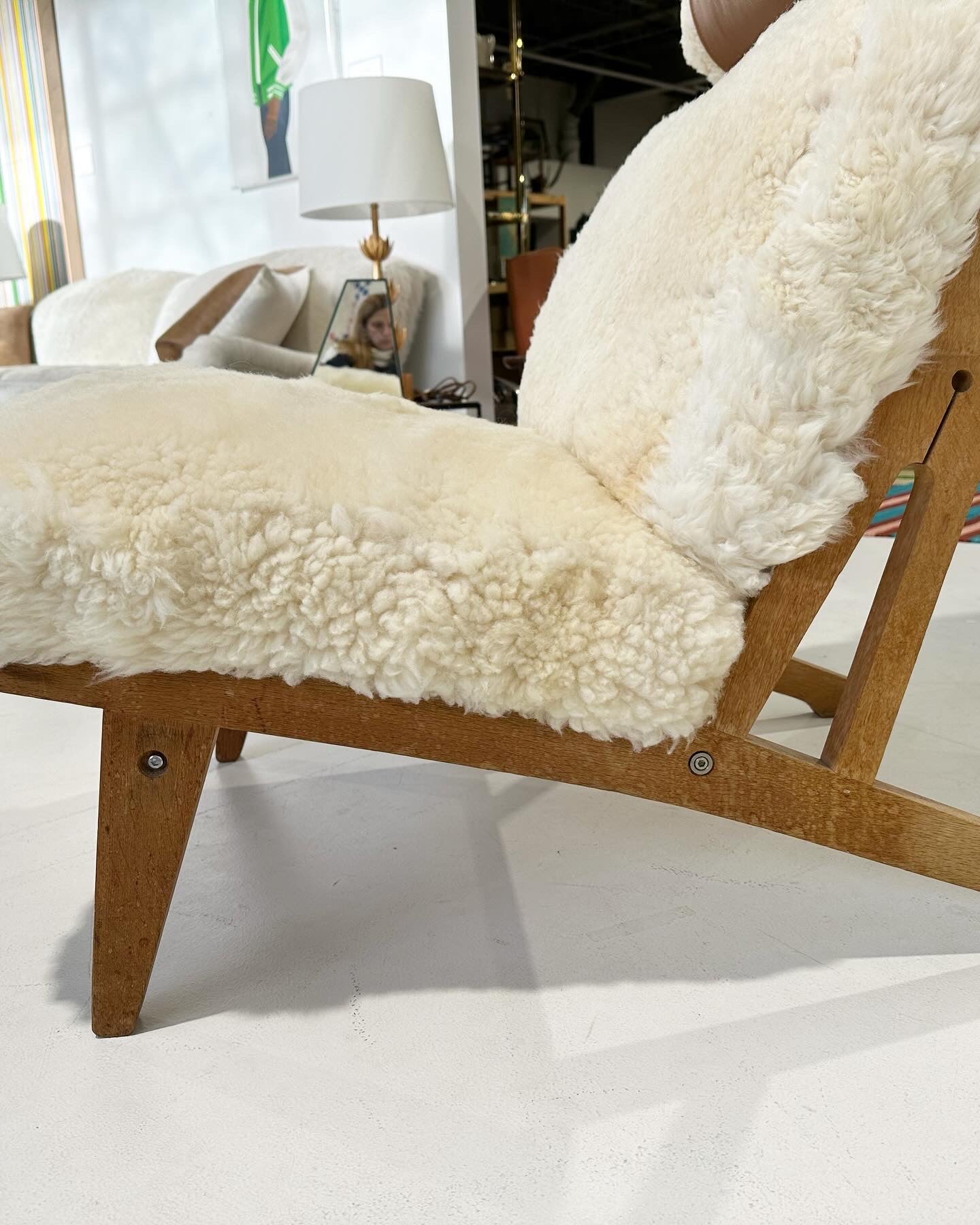 With gorgeous patinaed oak, custom California sheepskin cushions, and a finishing touch of beautiful Loro Piana leather, this Hans Wegner lounge chair is incredible. And so comfortable.