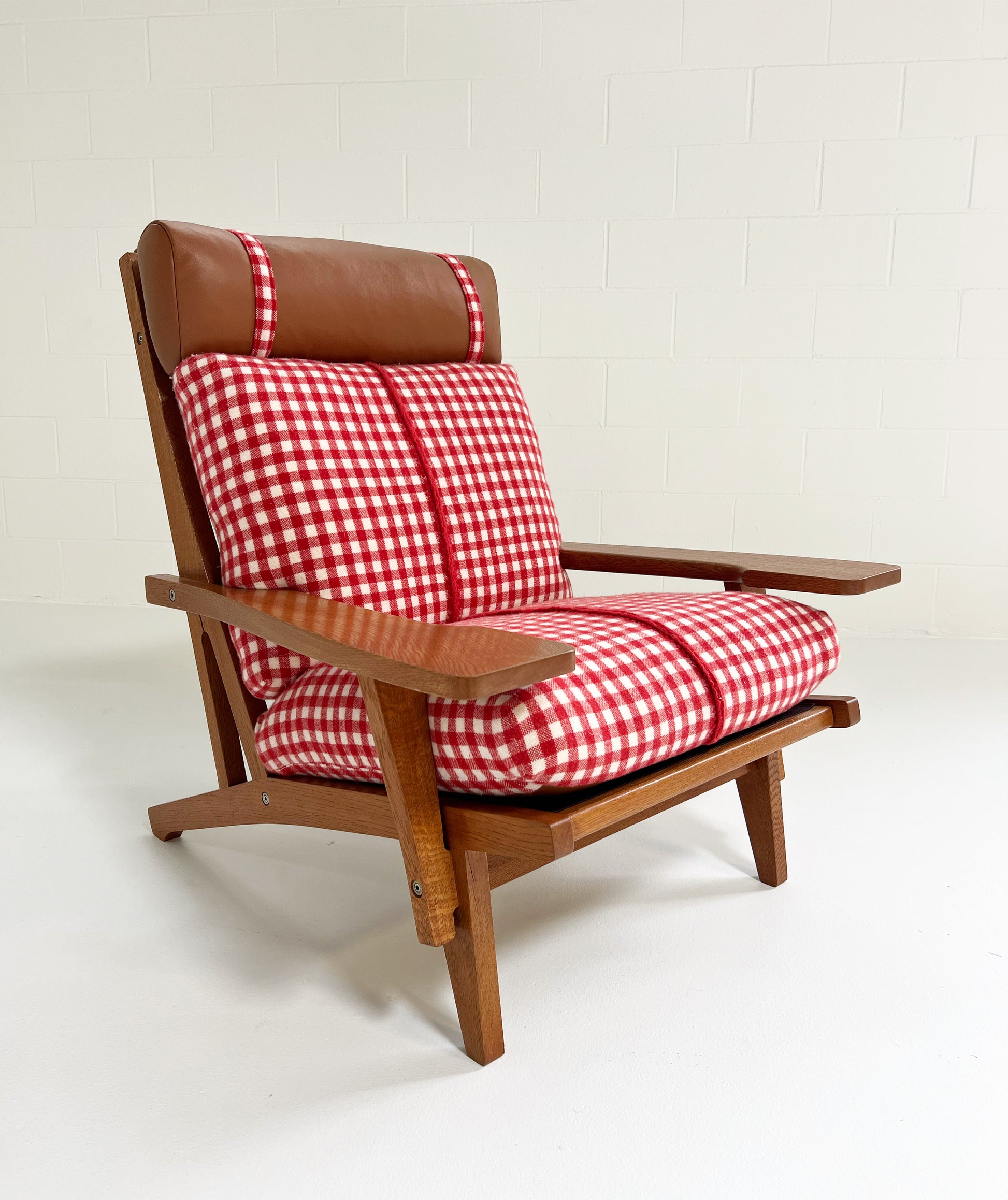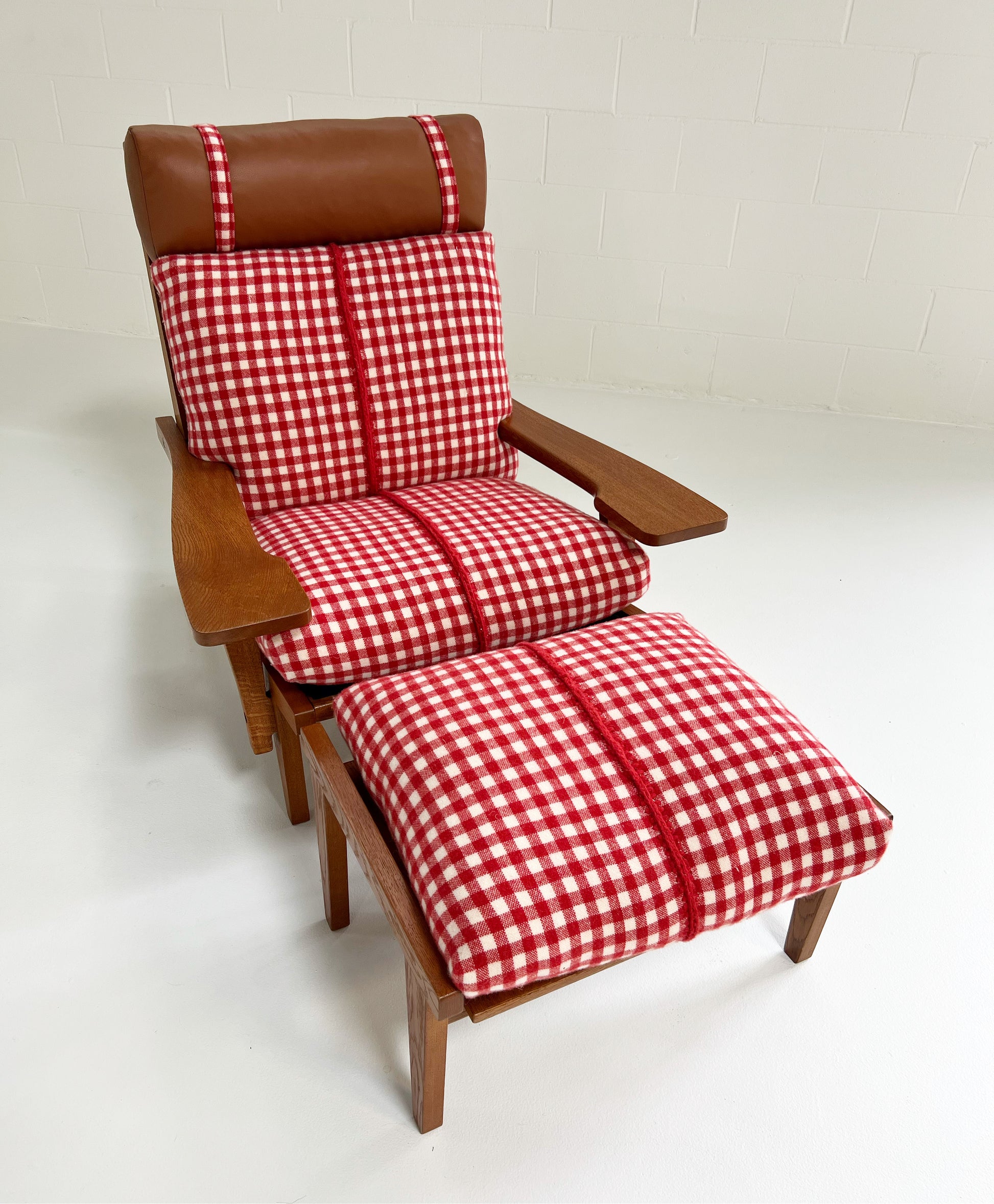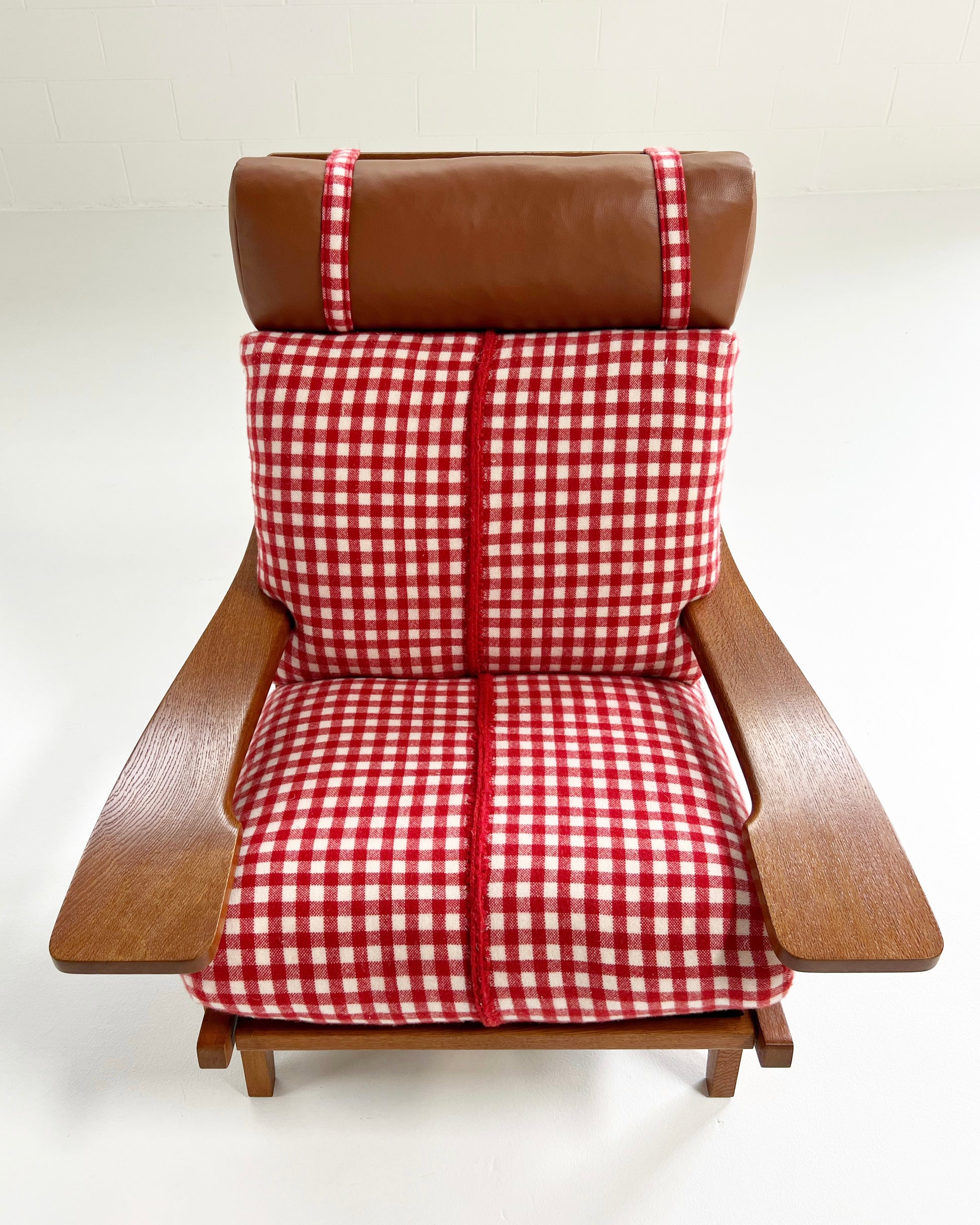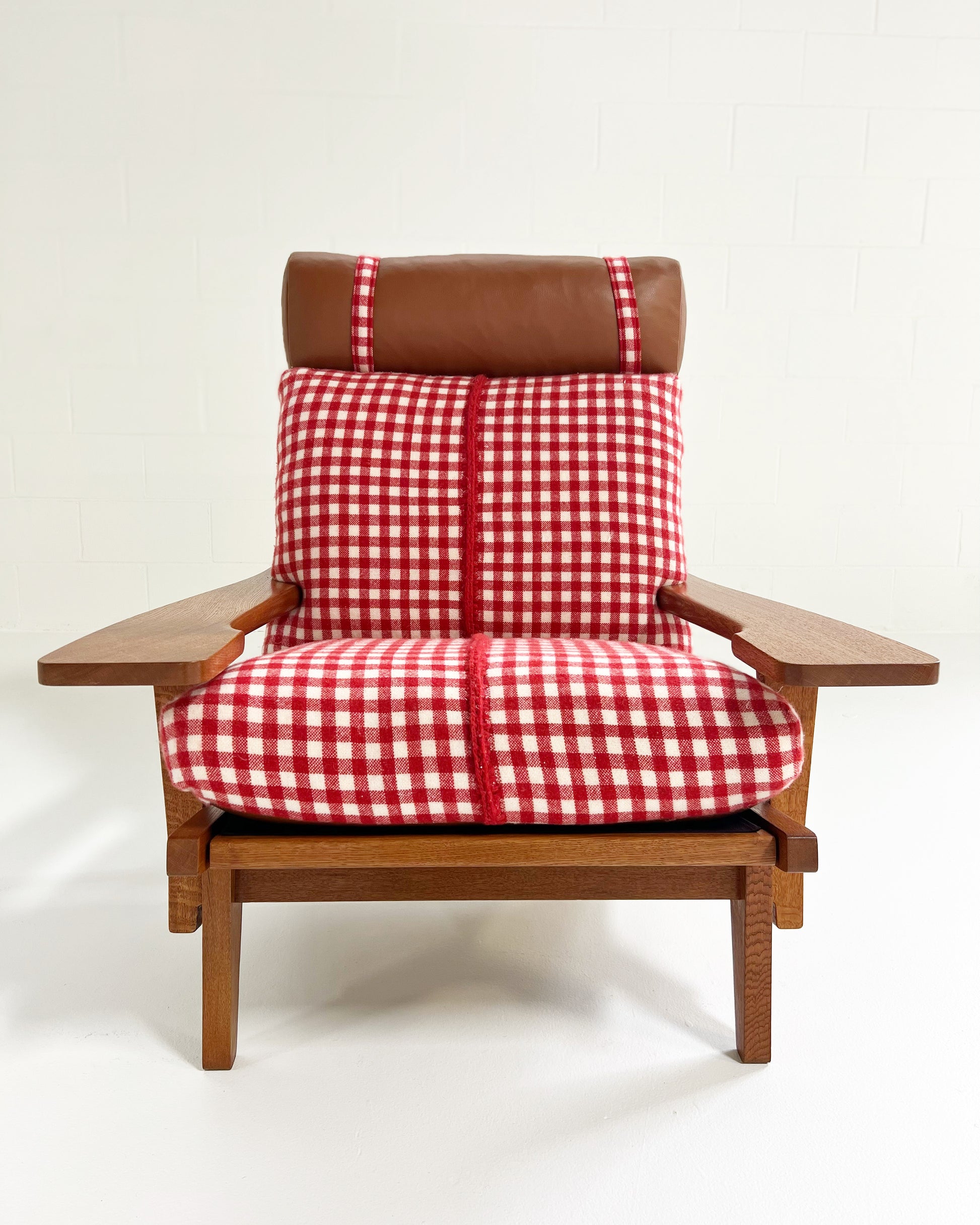 With gorgeous patinaed oak, custom cushions handcrafted from cashmere throws by cult-favorite fashion label, The Elder Statesman, and a finishing touch of beautiful Loro Piana caramel leather, this one-of-a-kind Hans Wegner lounge and ottoman set is incredible. The leather and red gingham give it total camp vibes. The Model GE 375 Chair is nicknamed the "Paddle" for its widened arms, perfect for holding a cocktail. This lounge is supremely comfortable with cushions filled with feathers for that signature Forsyth sink-into feel.