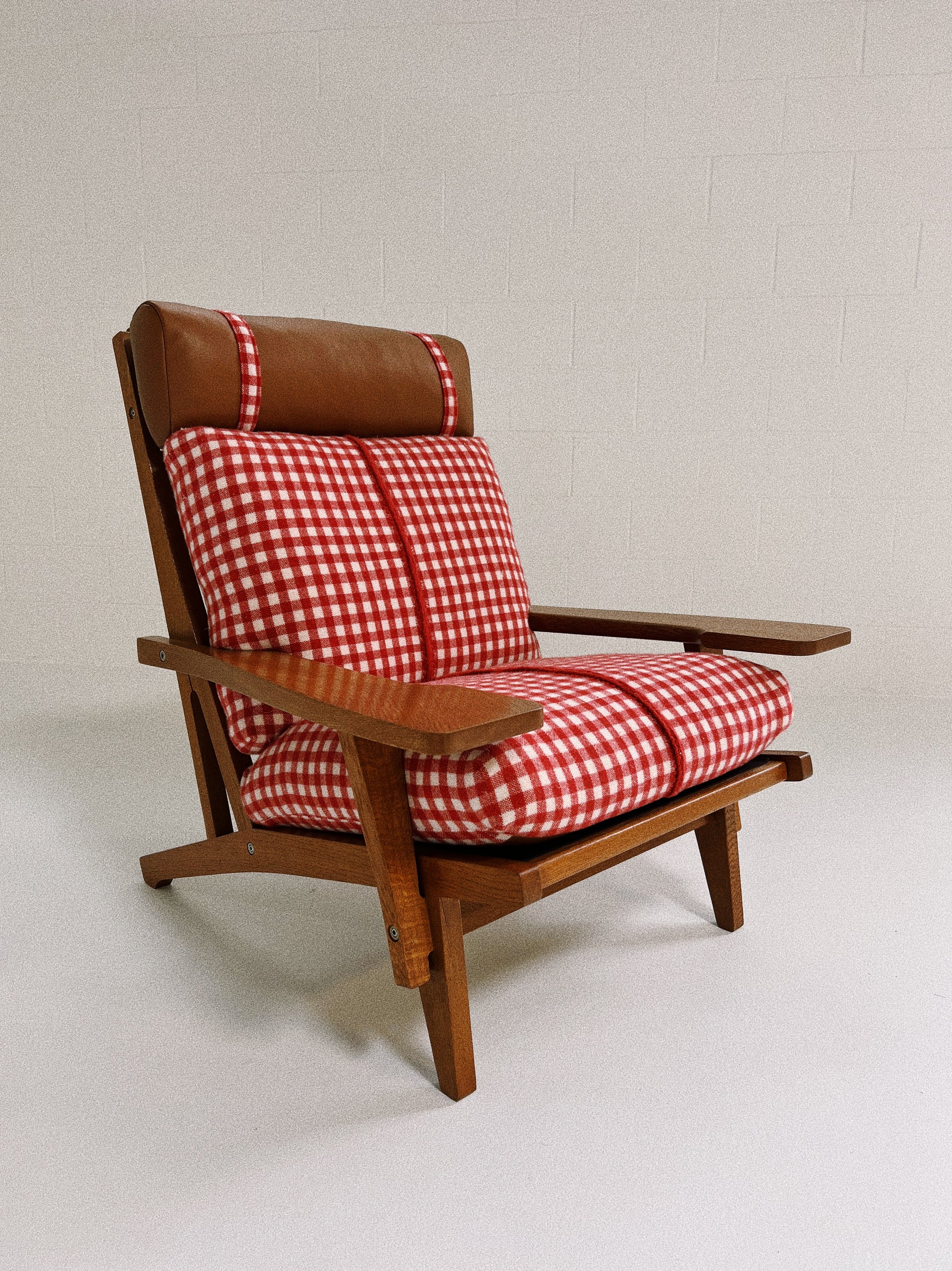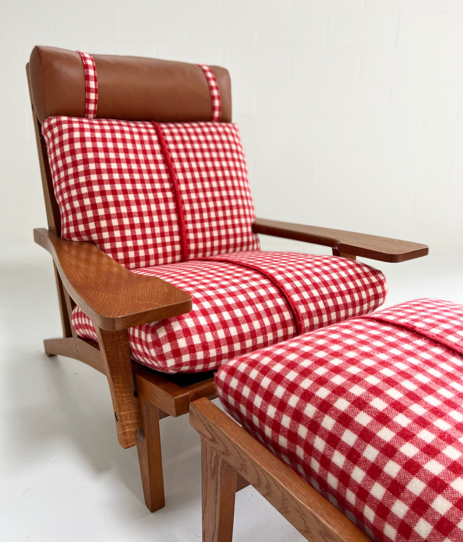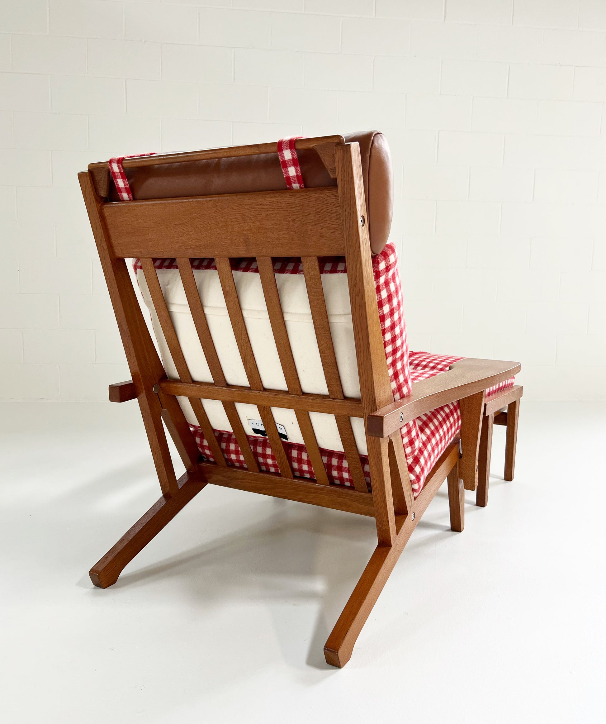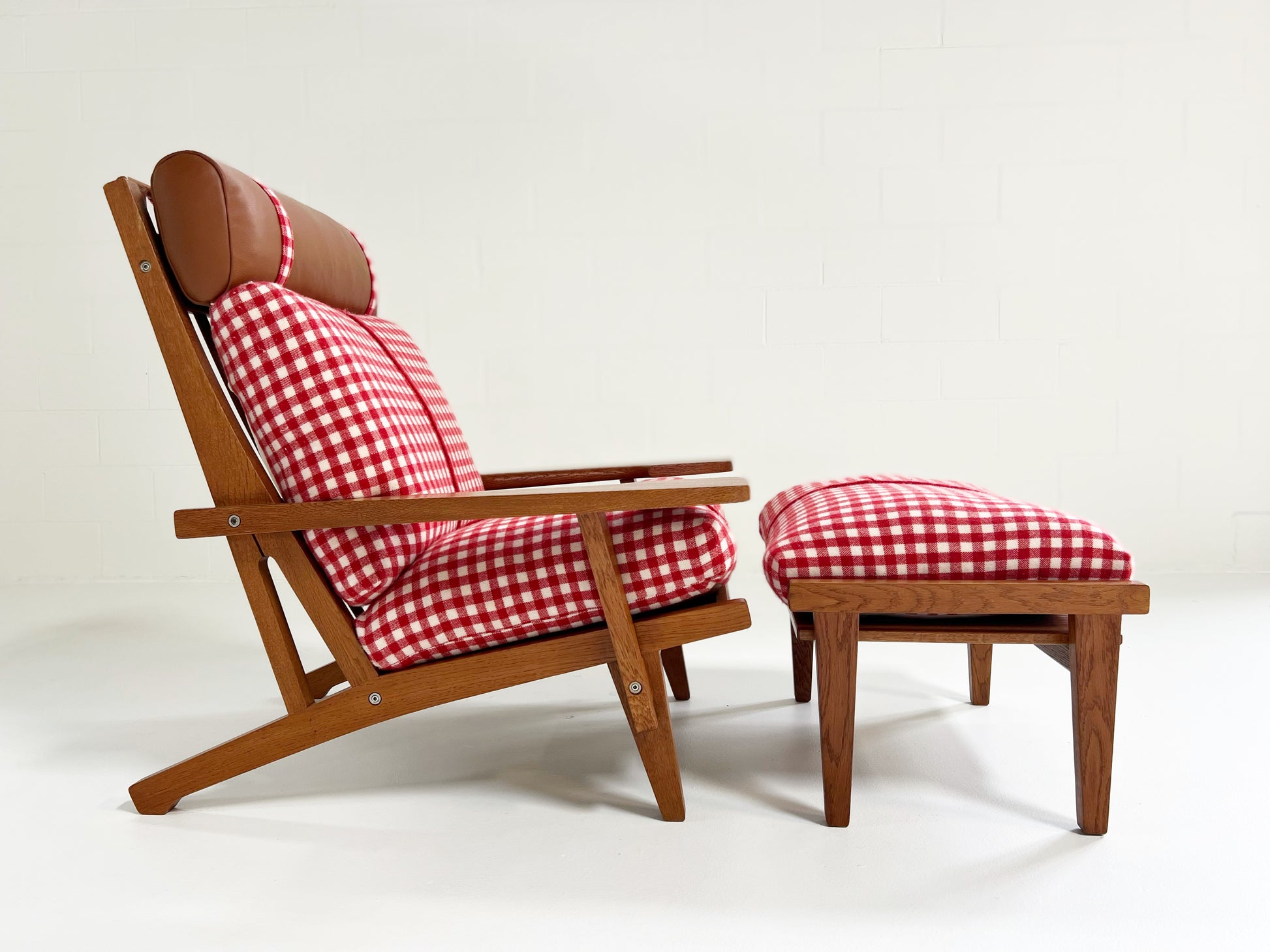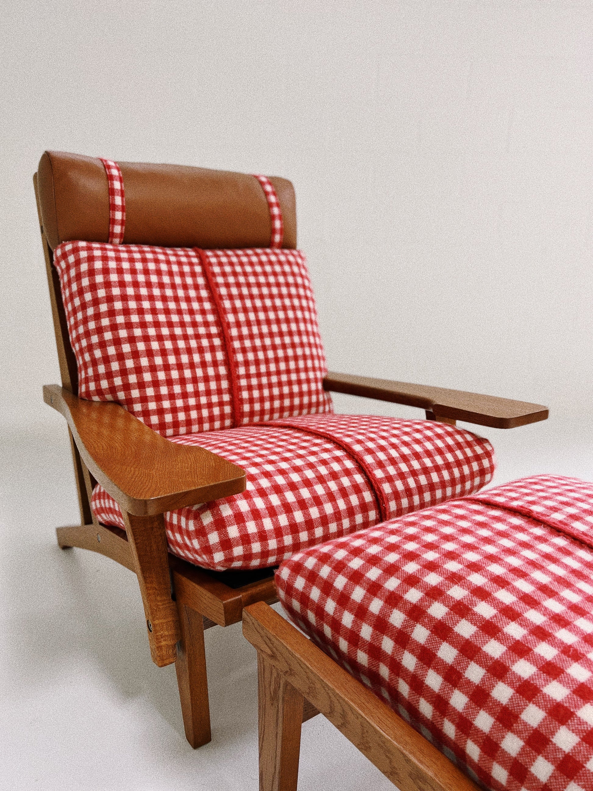 With gorgeous patinaed oak, custom cushions handcrafted from cashmere throws by cult-favorite fashion label, The Elder Statesman, and a finishing touch of beautiful Loro Piana caramel leather, this one-of-a-kind Hans Wegner lounge and ottoman set is incredible. The leather and red gingham give it total camp vibes. The Model GE 375 Chair is nicknamed the "Paddle" for its widened arms, perfect for holding a cocktail. This lounge is supremely comfortable with cushions filled with feathers for that signature Forsyth sink-into feel.
