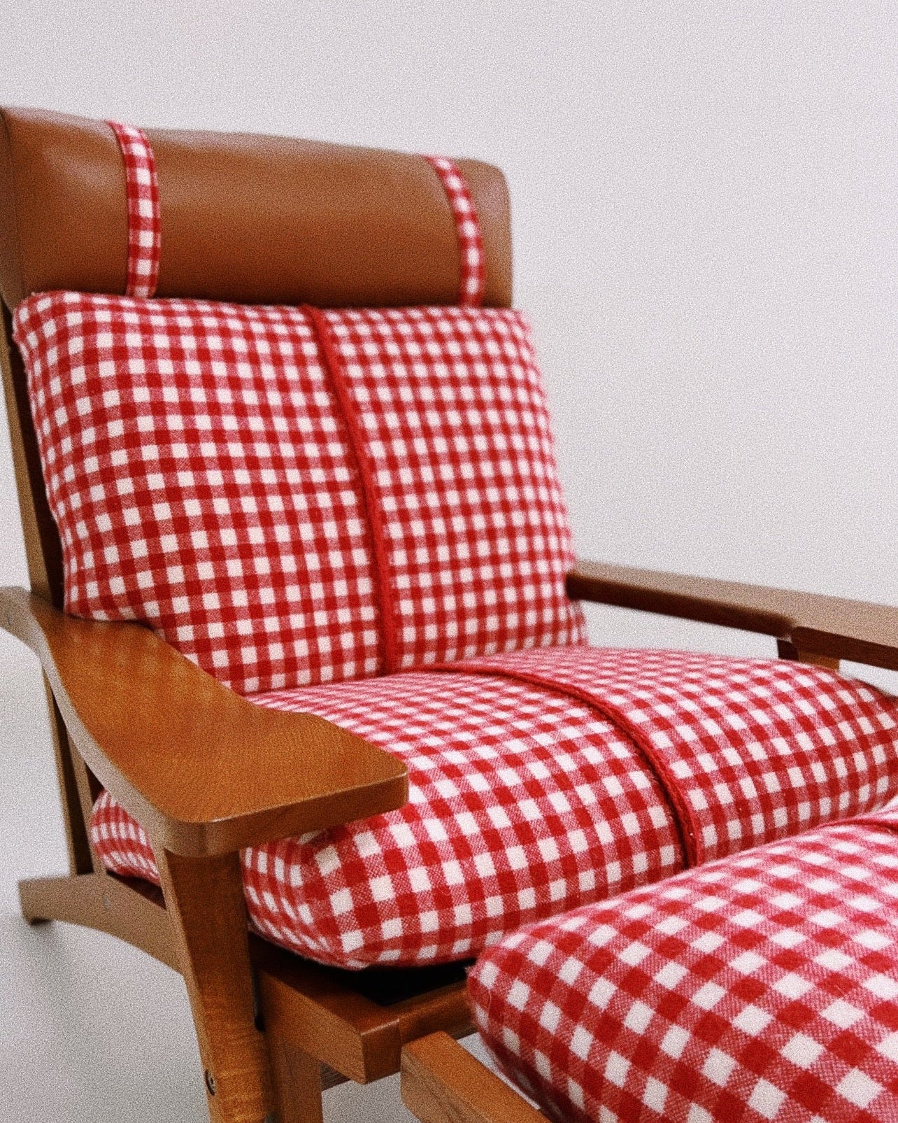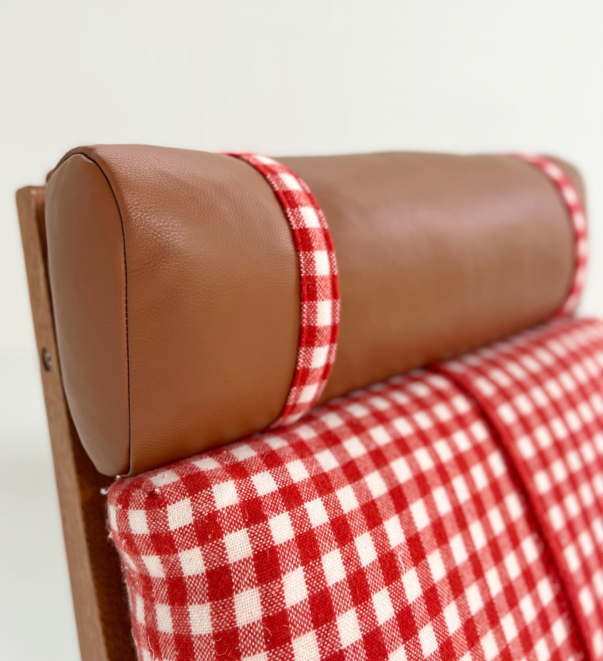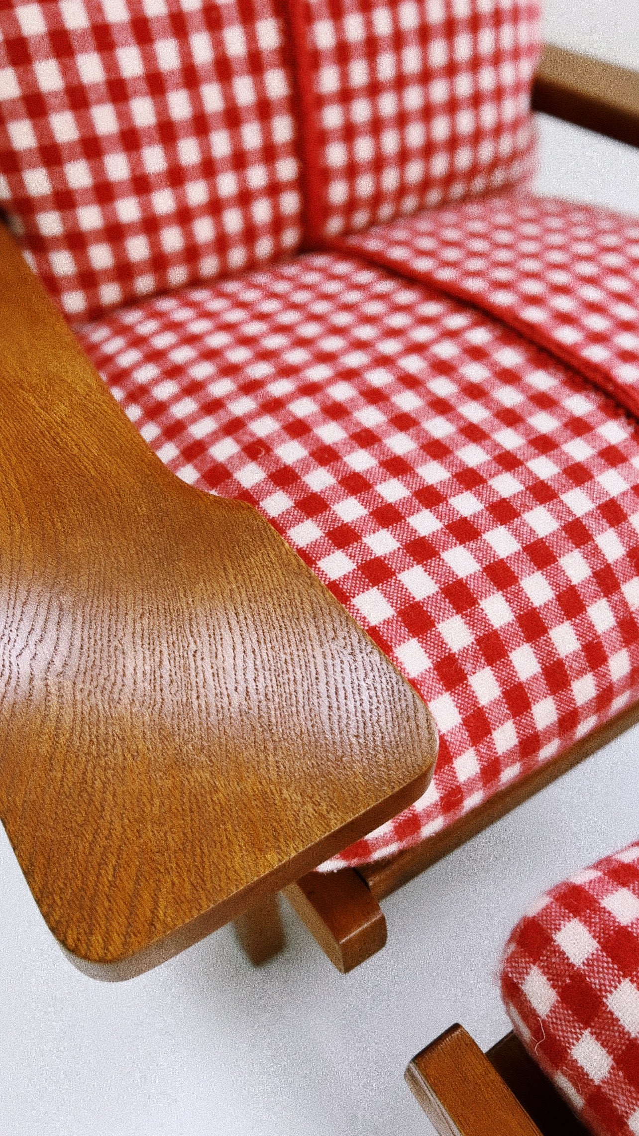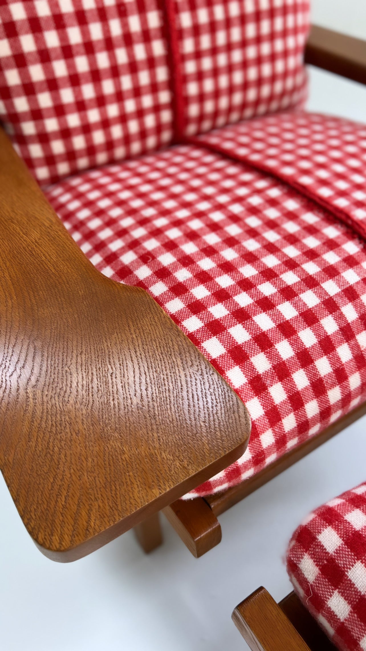 With gorgeous patinaed oak, custom cushions handcrafted from cashmere throws by cult-favorite fashion label, The Elder Statesman, and a finishing touch of beautiful Loro Piana caramel leather, this one-of-a-kind Hans Wegner lounge and ottoman set is incredible. The leather and red gingham give it total camp vibes. The Model GE 375 Chair is nicknamed the "Paddle" for its widened arms, perfect for holding a cocktail. This lounge is supremely comfortable with cushions filled with feathers for that signature Forsyth sink-into feel.