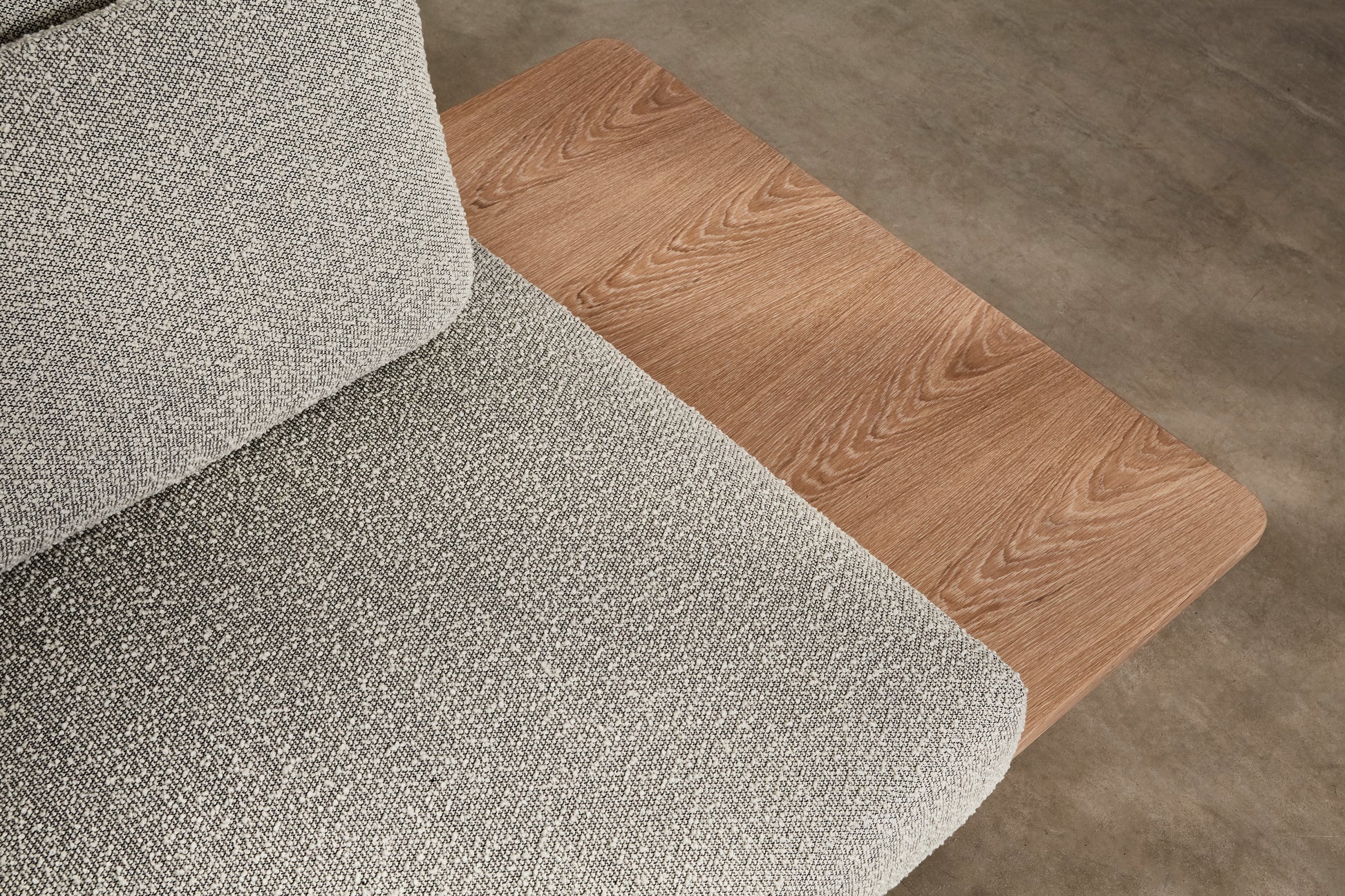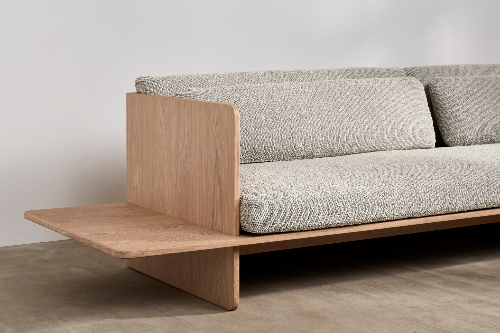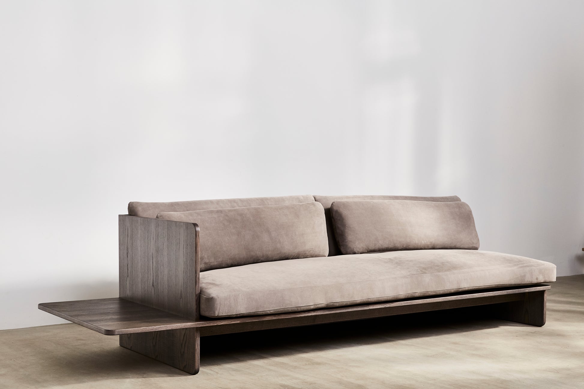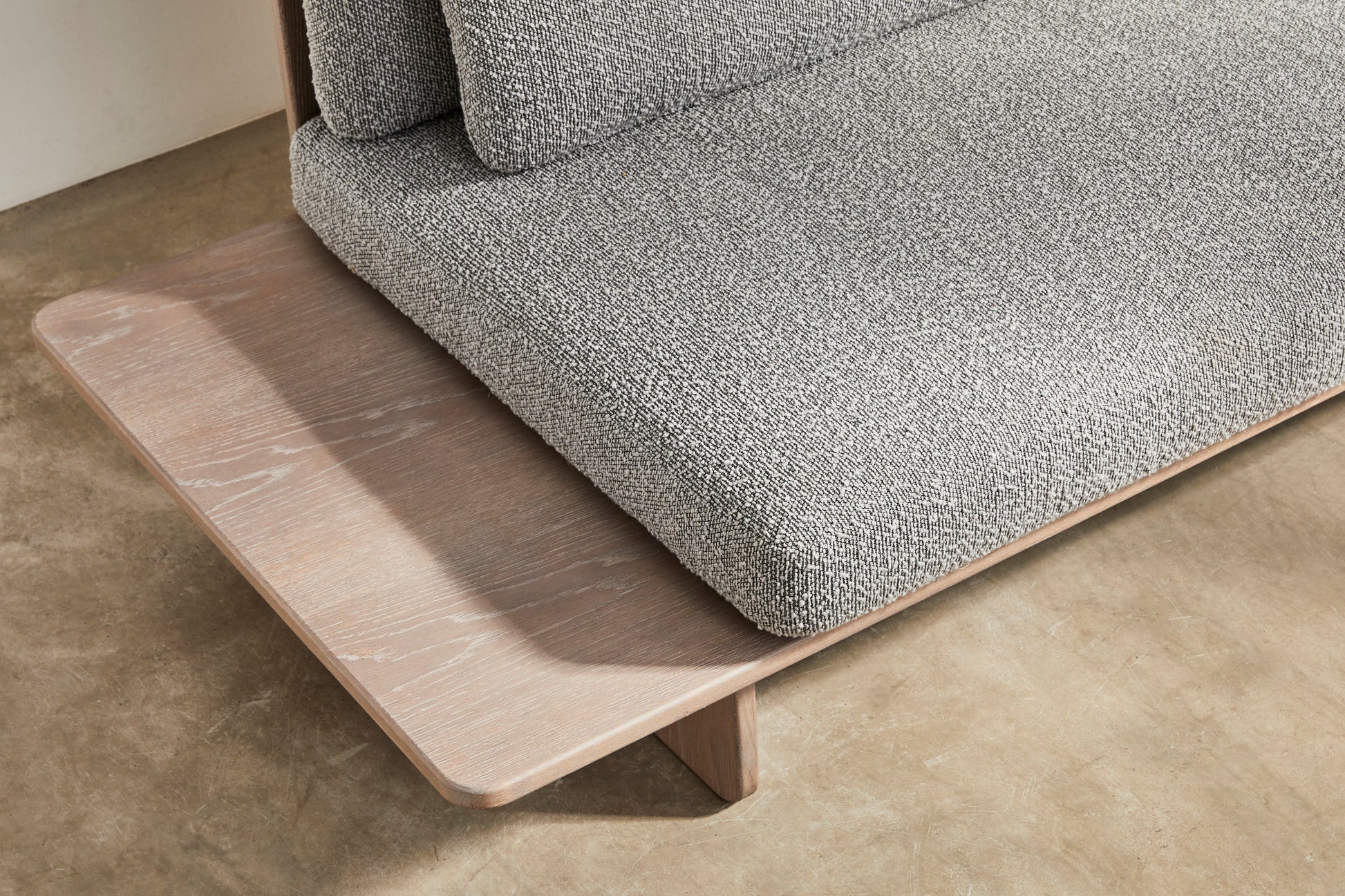 The Muse Sofa is designed for cozy and relaxed lounging. Minimalist in design, the frame is made from oak with a choice of subtly toned finishes that allow the beauty of the grain to be exposed. It is offered with side tables at one or both ends; or alternatively it can be specified without tables with one or two arms. Where just one side table is required, it can be specified as right hand or left hand.