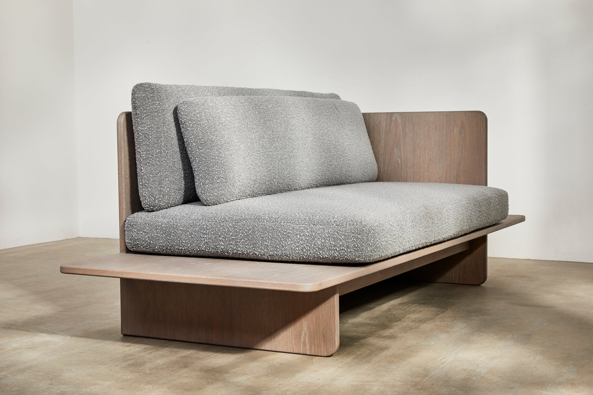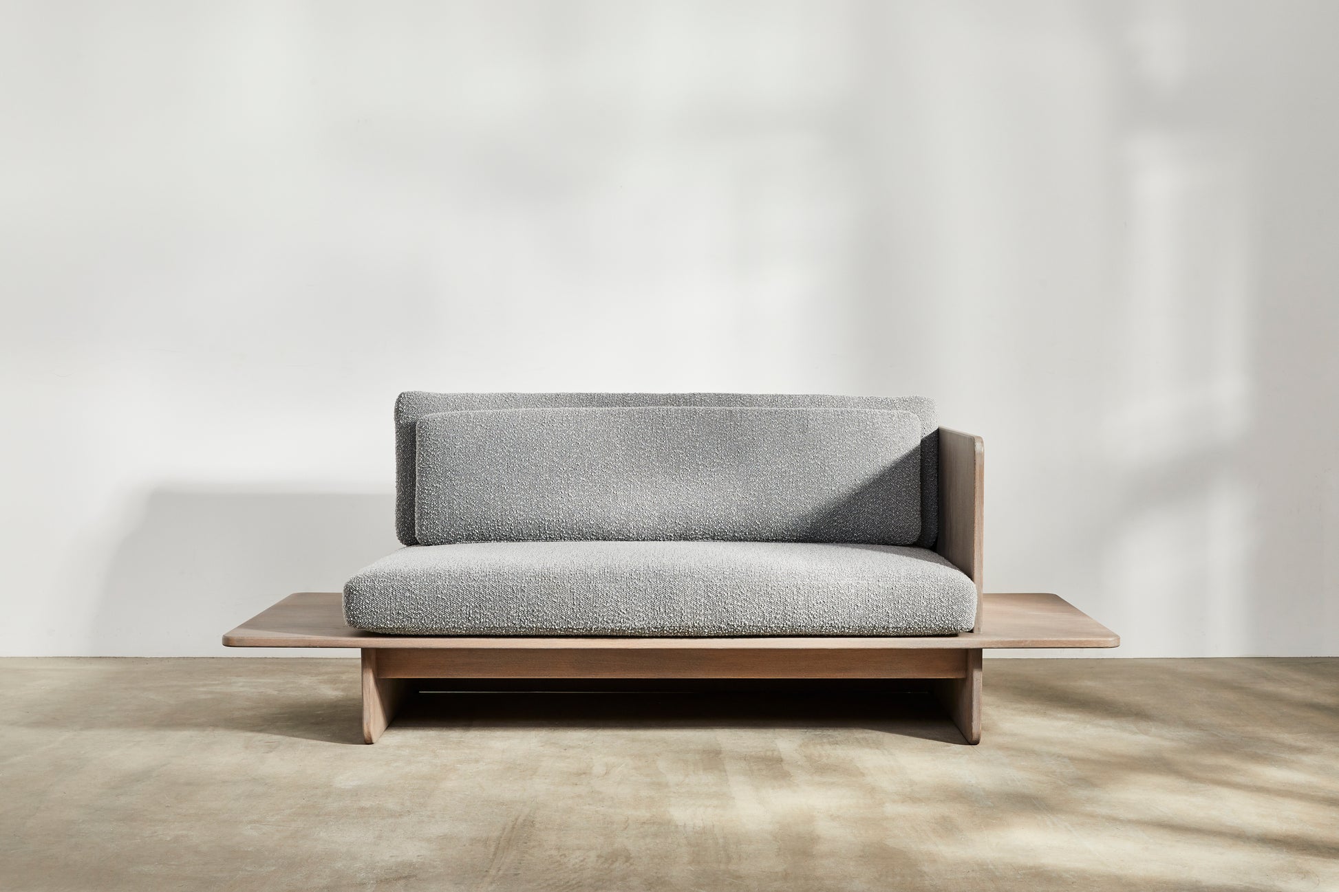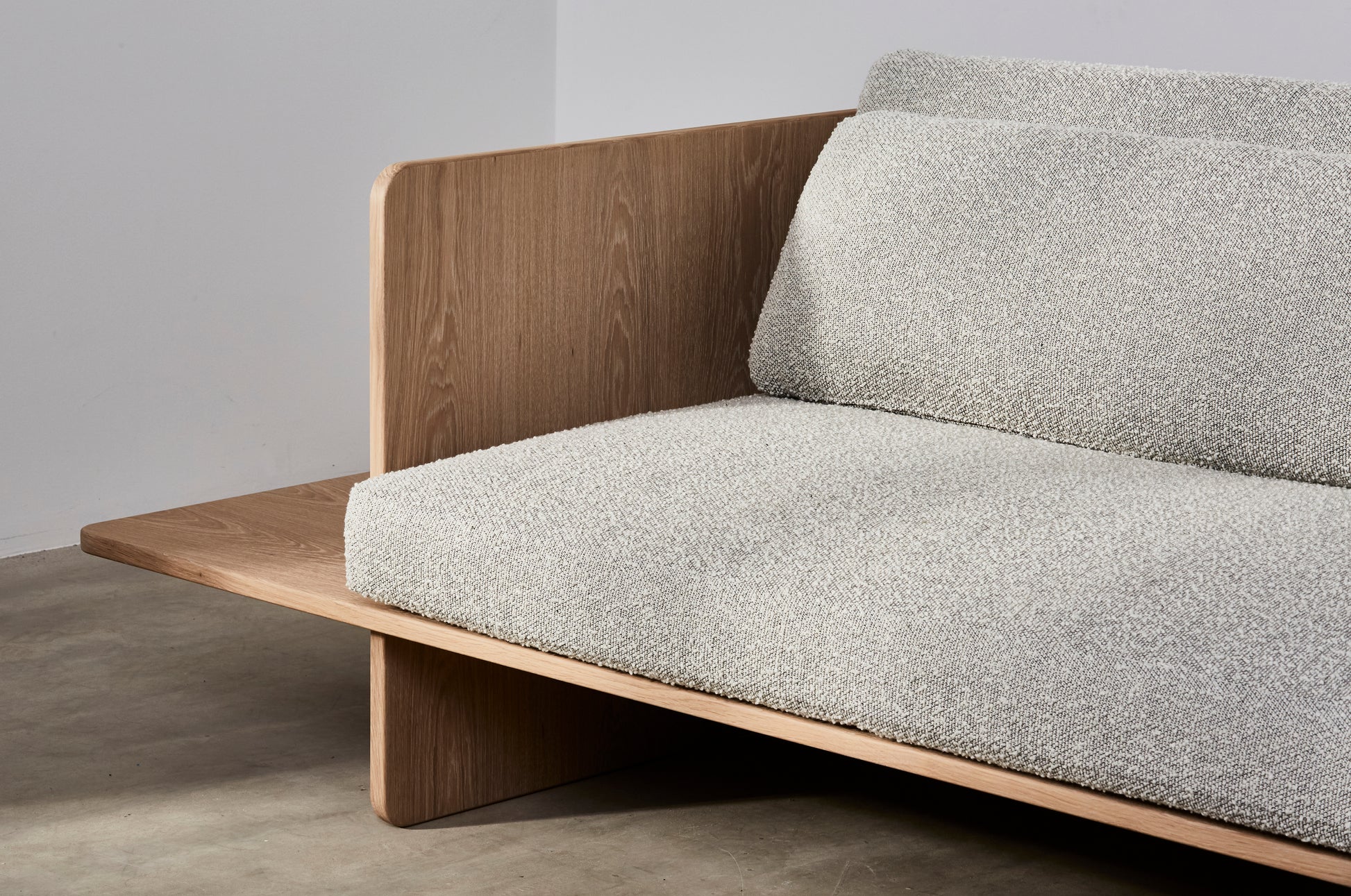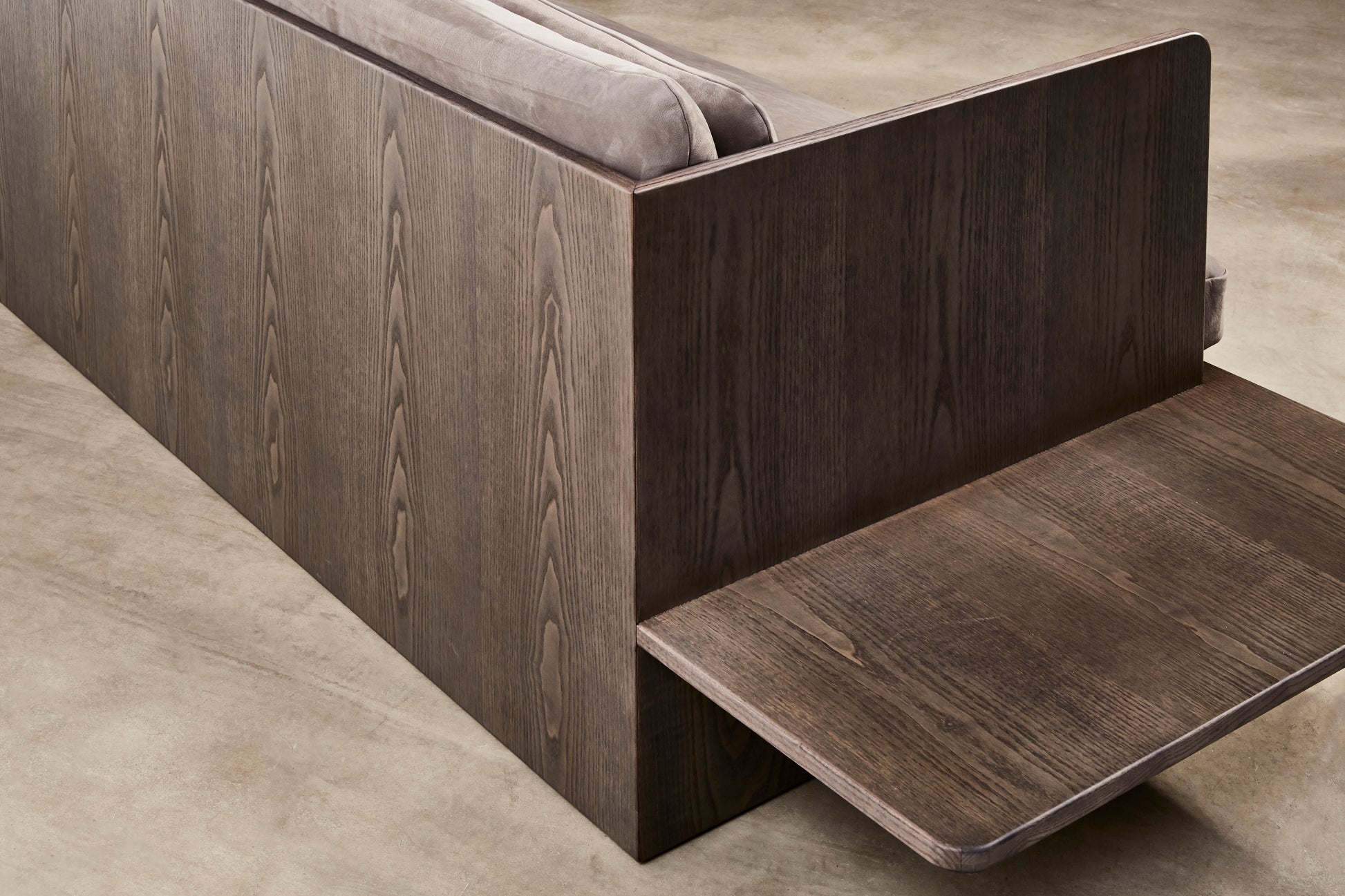 The Muse Sofa is designed for cozy and relaxed lounging. Minimalist in design, the frame is made from oak with a choice of subtly toned finishes that allow the beauty of the grain to be exposed. It is offered with side tables at one or both ends; or alternatively it can be specified without tables with one or two arms. Where just one side table is required, it can be specified as right hand or left hand.