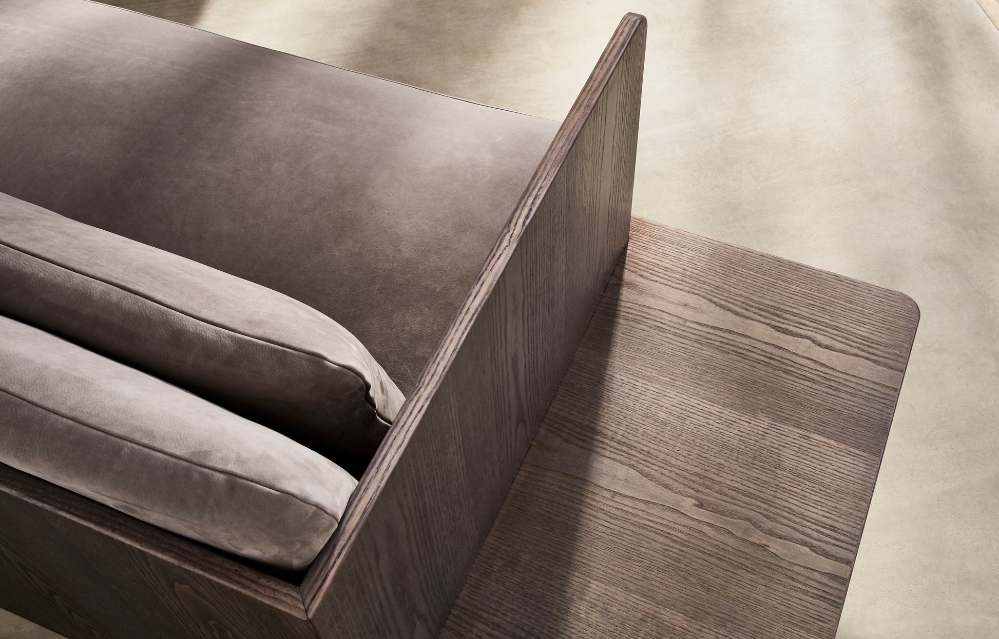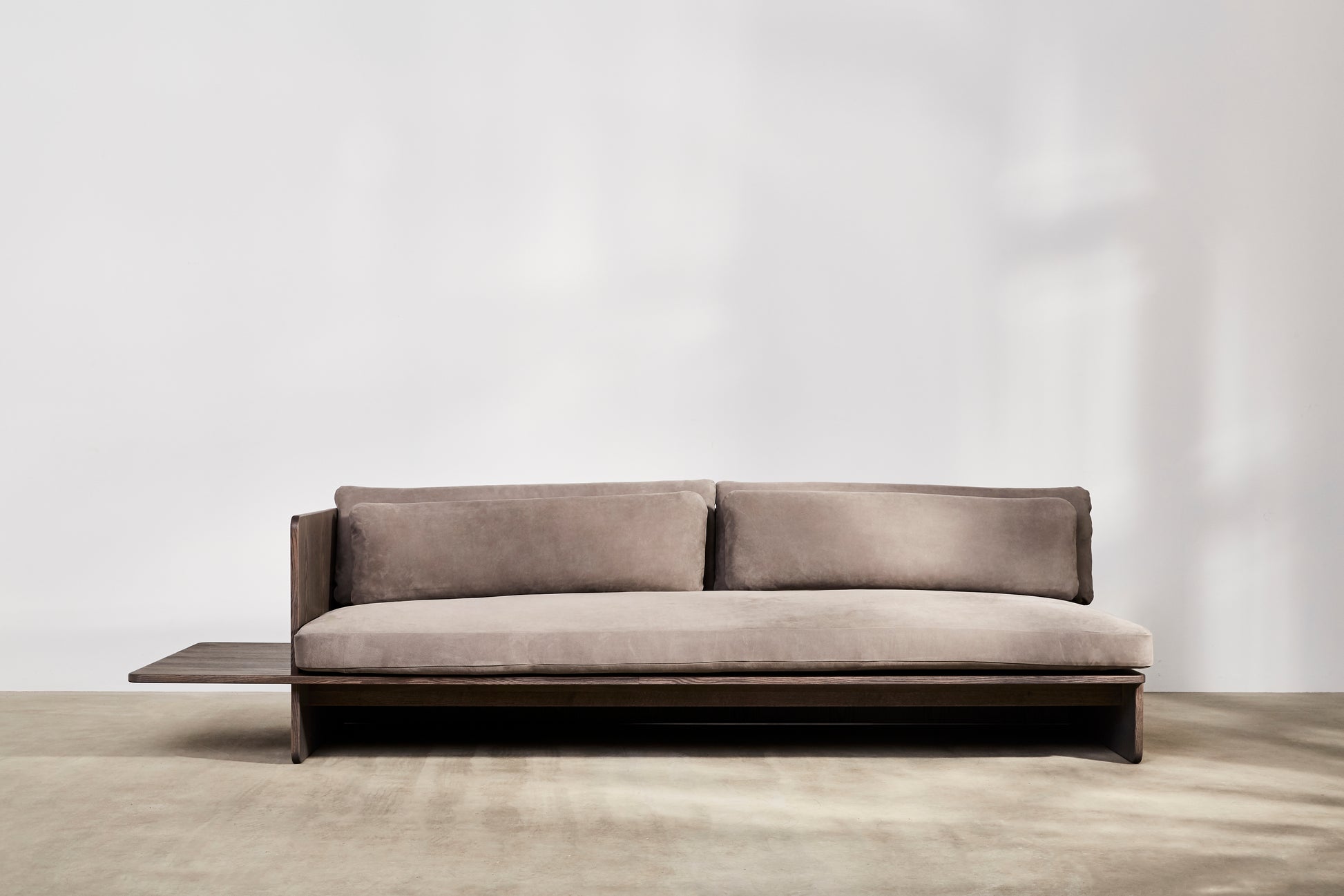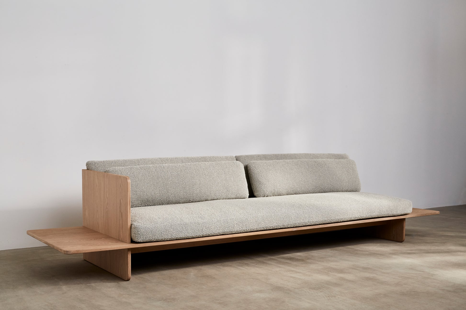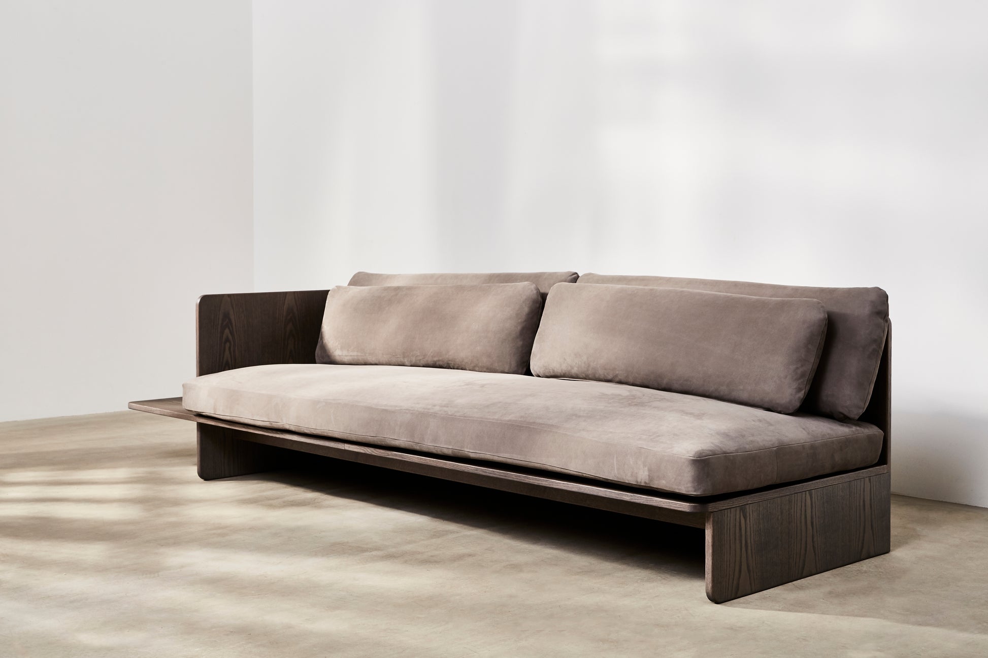 The Muse Sofa is designed for cozy and relaxed lounging. Minimalist in design, the frame is made from oak with a choice of subtly toned finishes that allow the beauty of the grain to be exposed. It is offered with side tables at one or both ends; or alternatively it can be specified without tables with one or two arms. Where just one side table is required, it can be specified as right hand or left hand.
