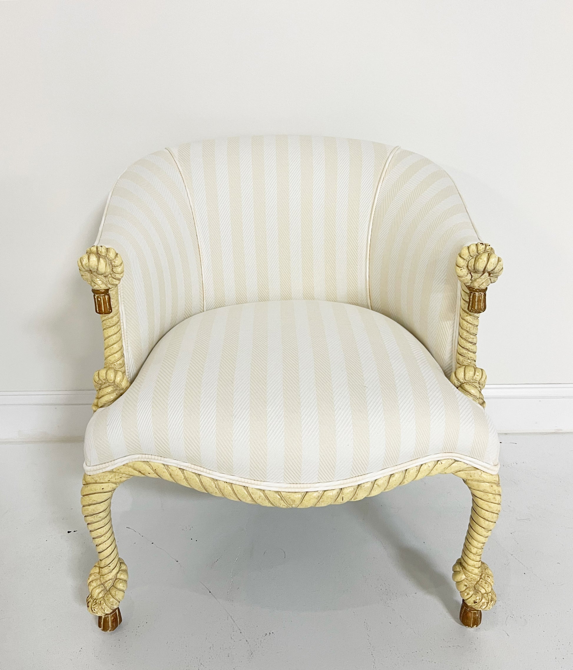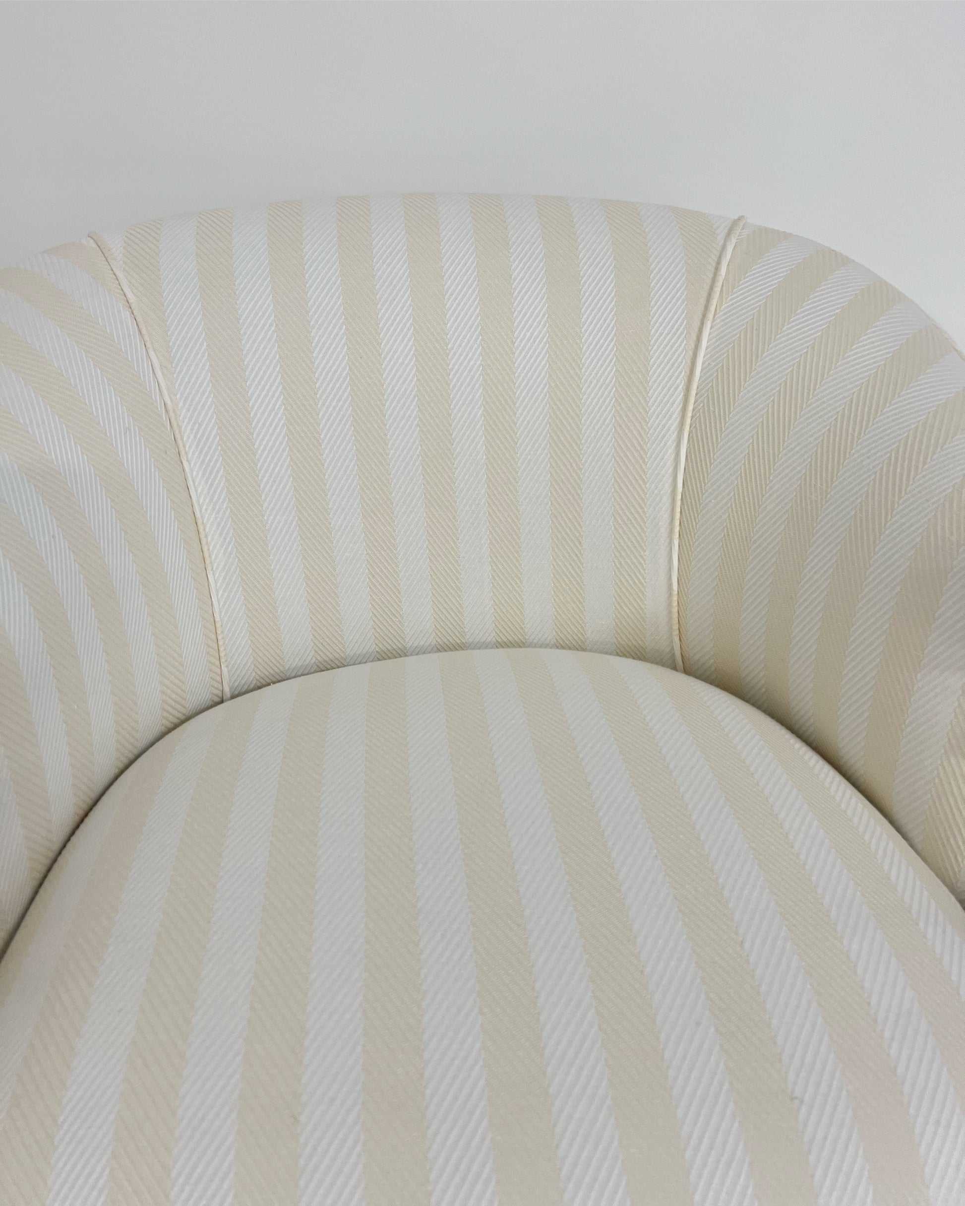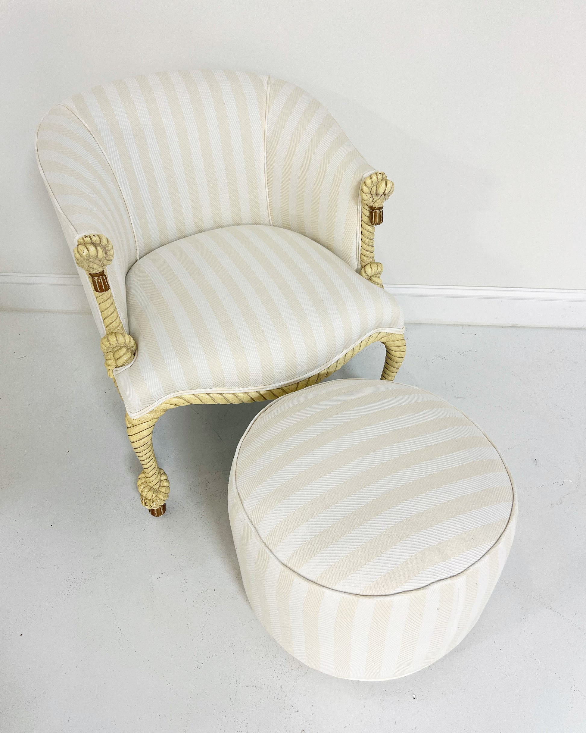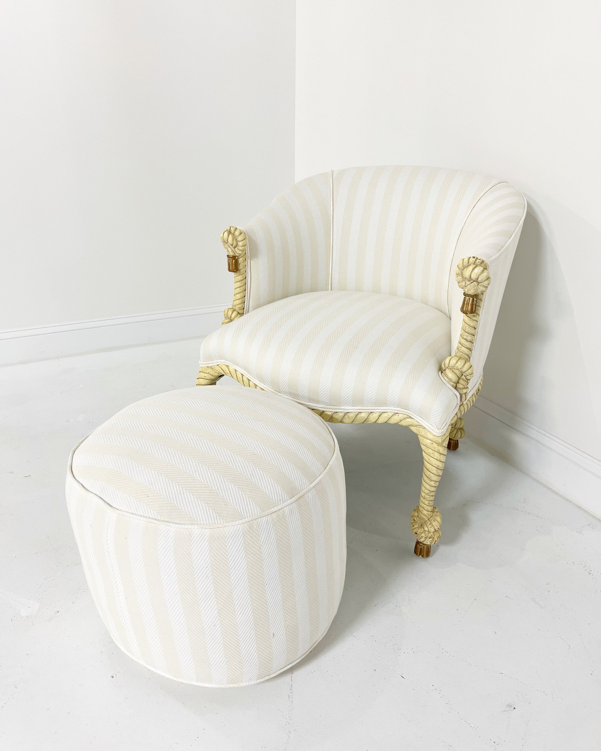 We upholstered this piece in a cotton and linen tonal cream stripe from the Summer '22 collection of our favorite, Attersee. The chair comes as a set with a matching Forsyth pouf ottoman.