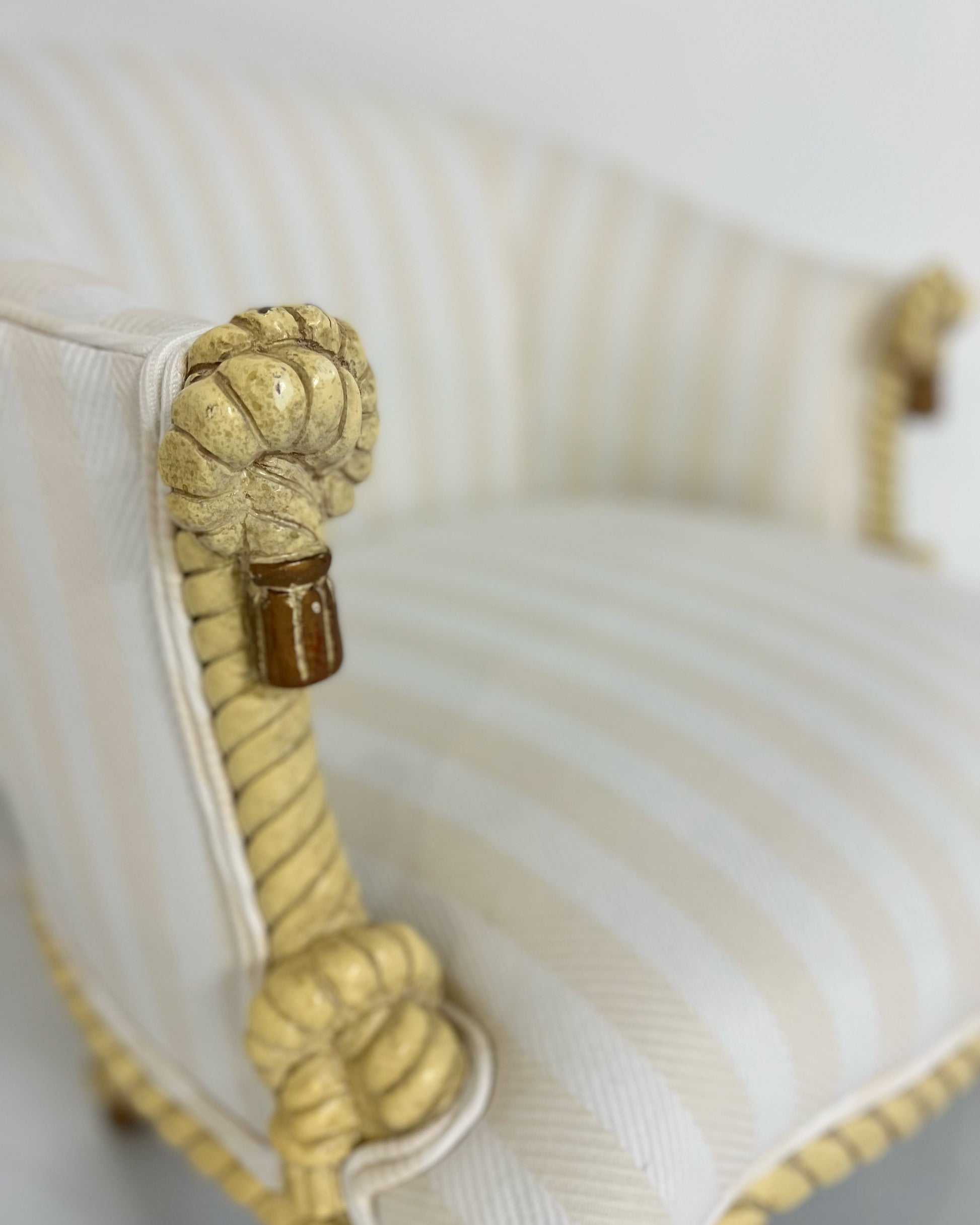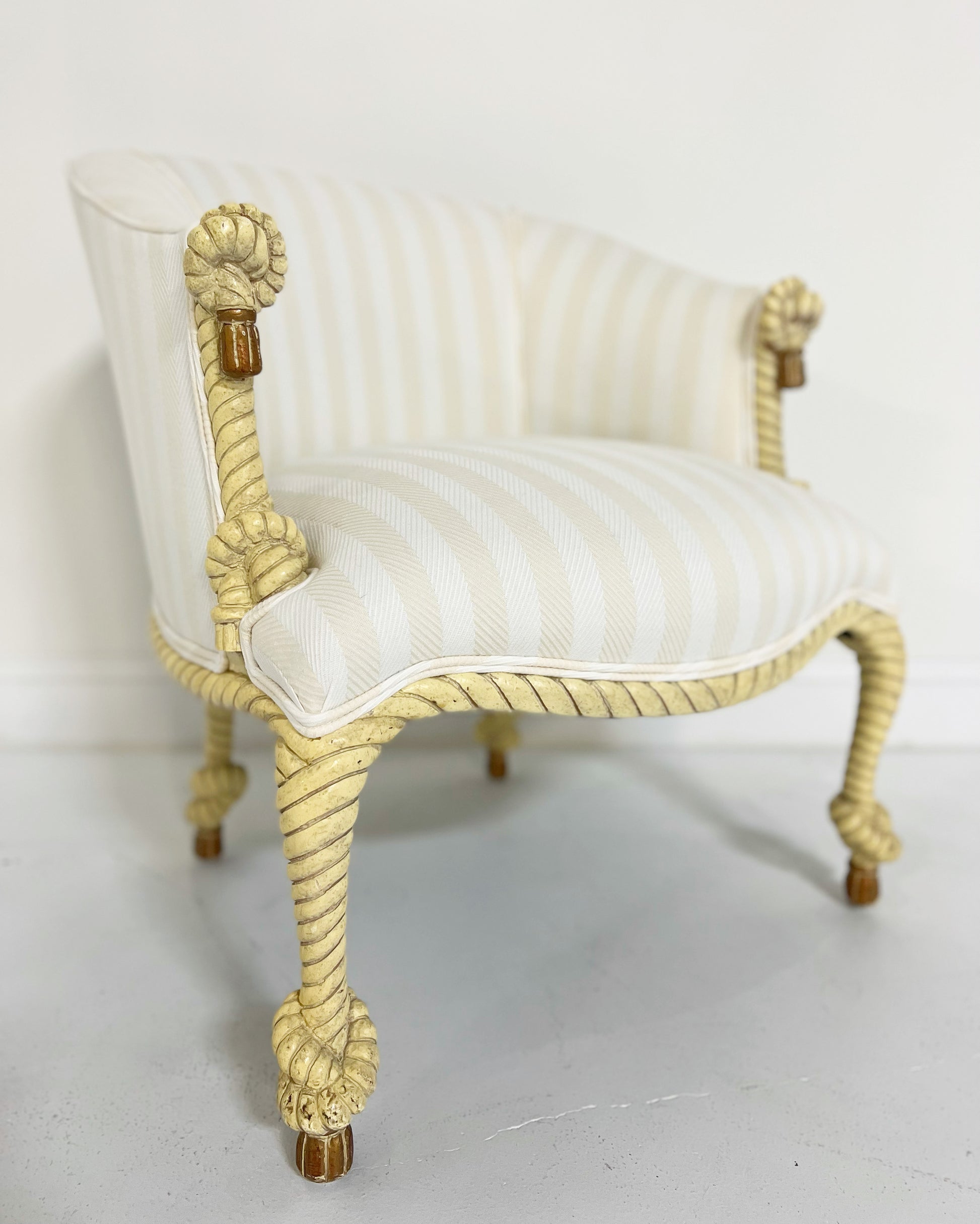 A beautiful carved rope and tassel Napoleon III style armchair and ottoman. The illusion of twisted and knotted rope is often associated with the work of the Parisian upholsterer A. M. E. Fournier, who worked at the Boulevard Beaumarchais, from 1850 onwards. Fournier was famed for his exceptional upholstered pieces.