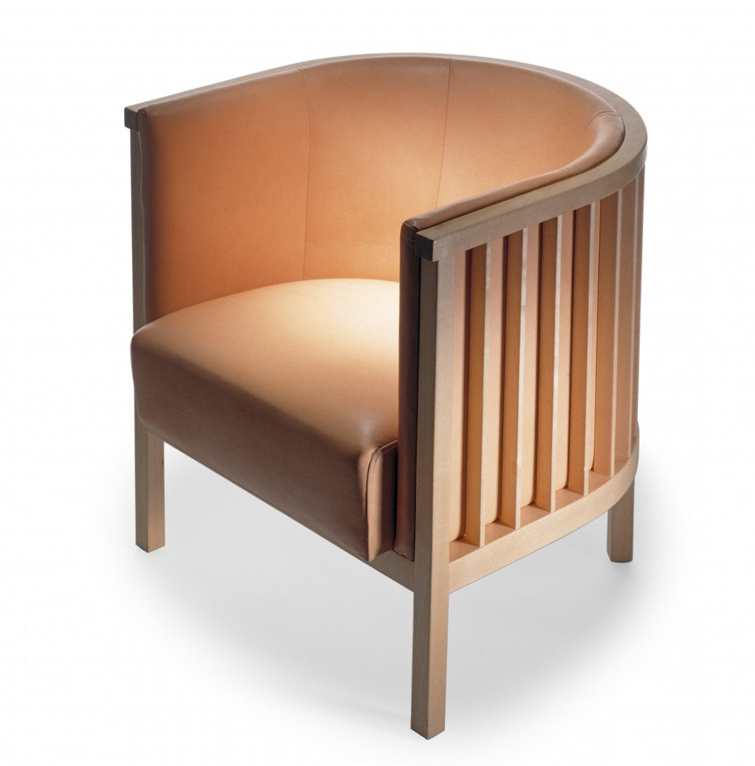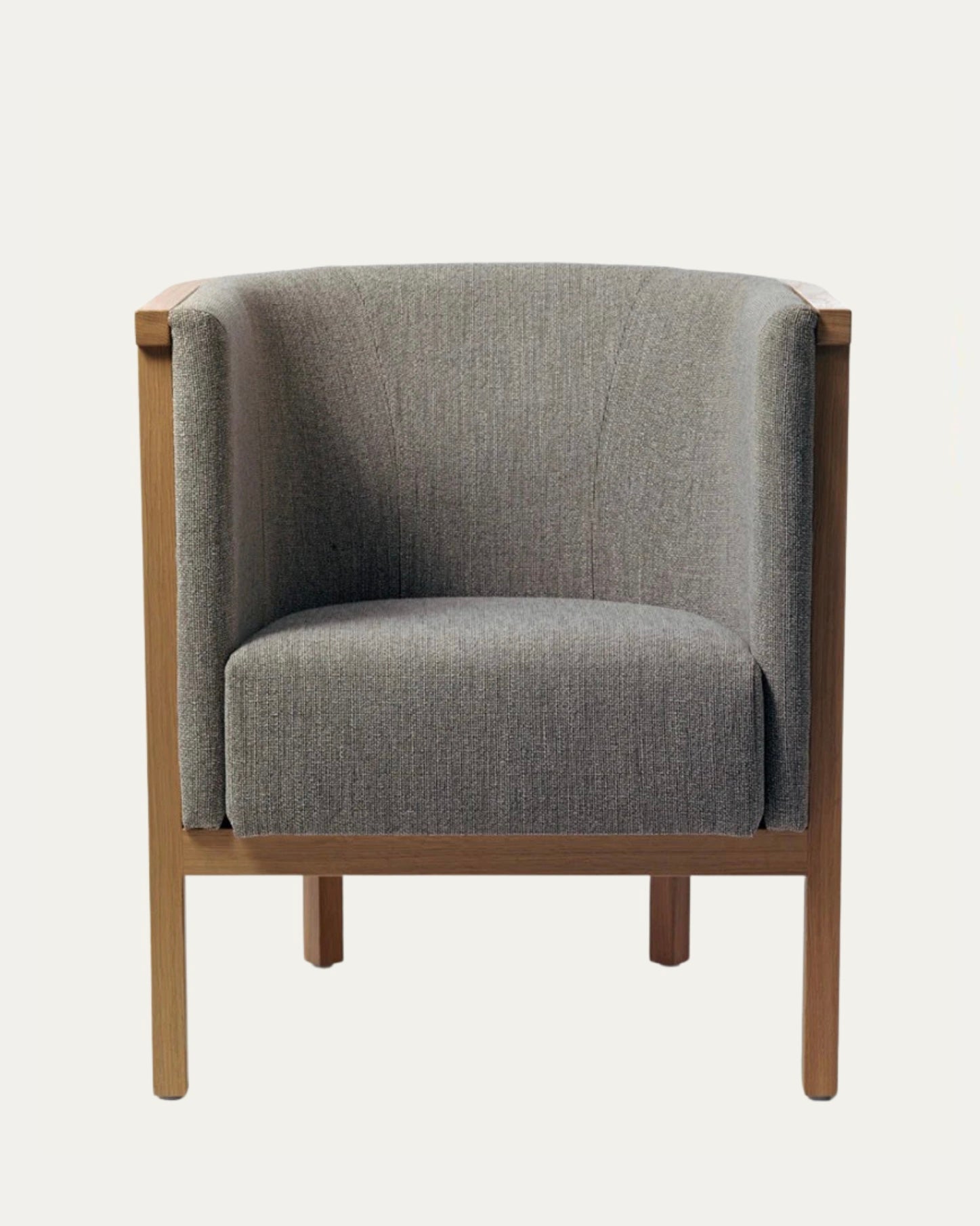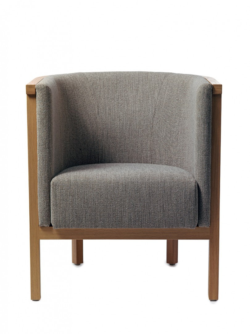 Easy chair with frame in solid oak. Upholstered in fabric or leather. Plastic glides.