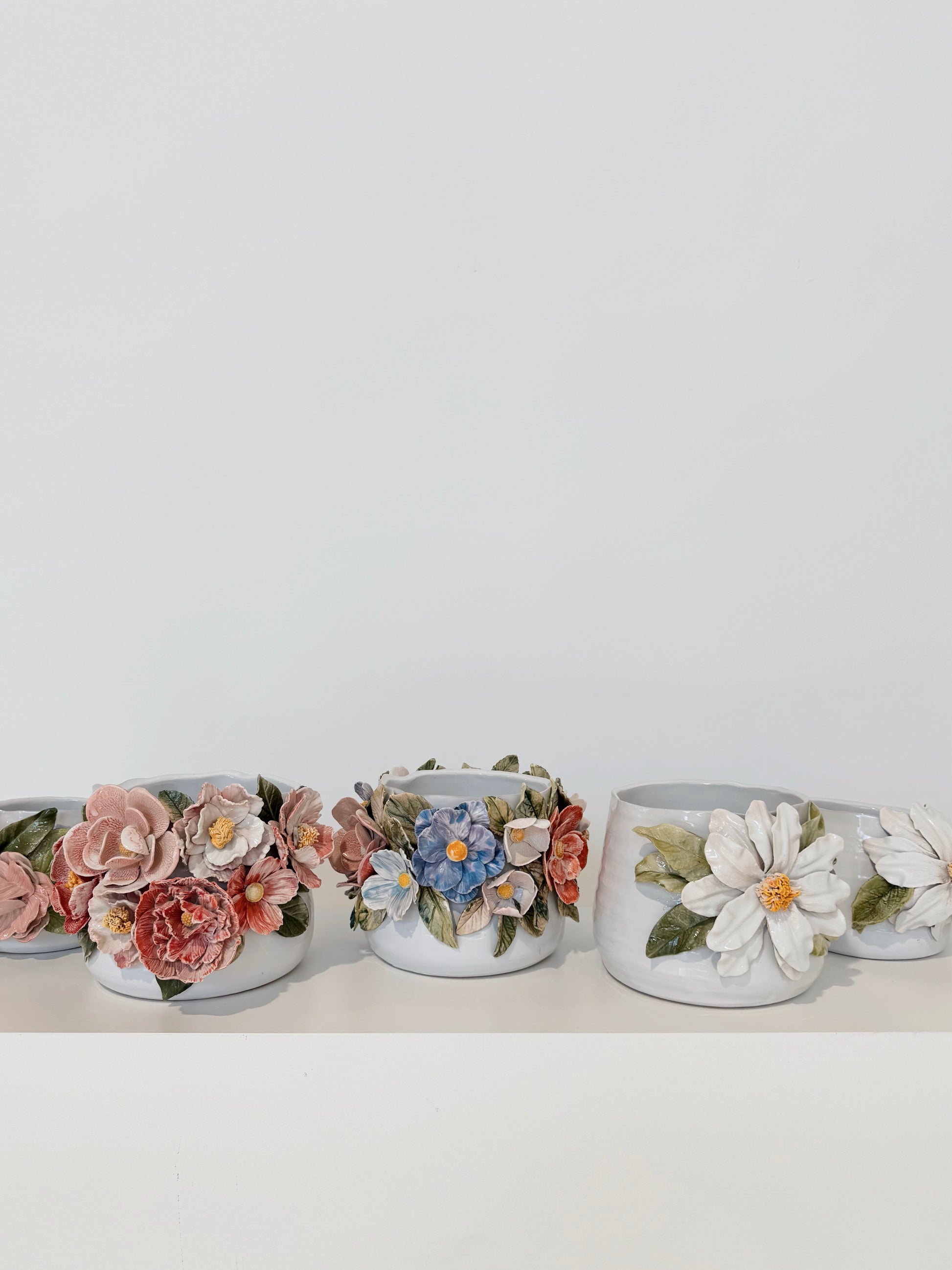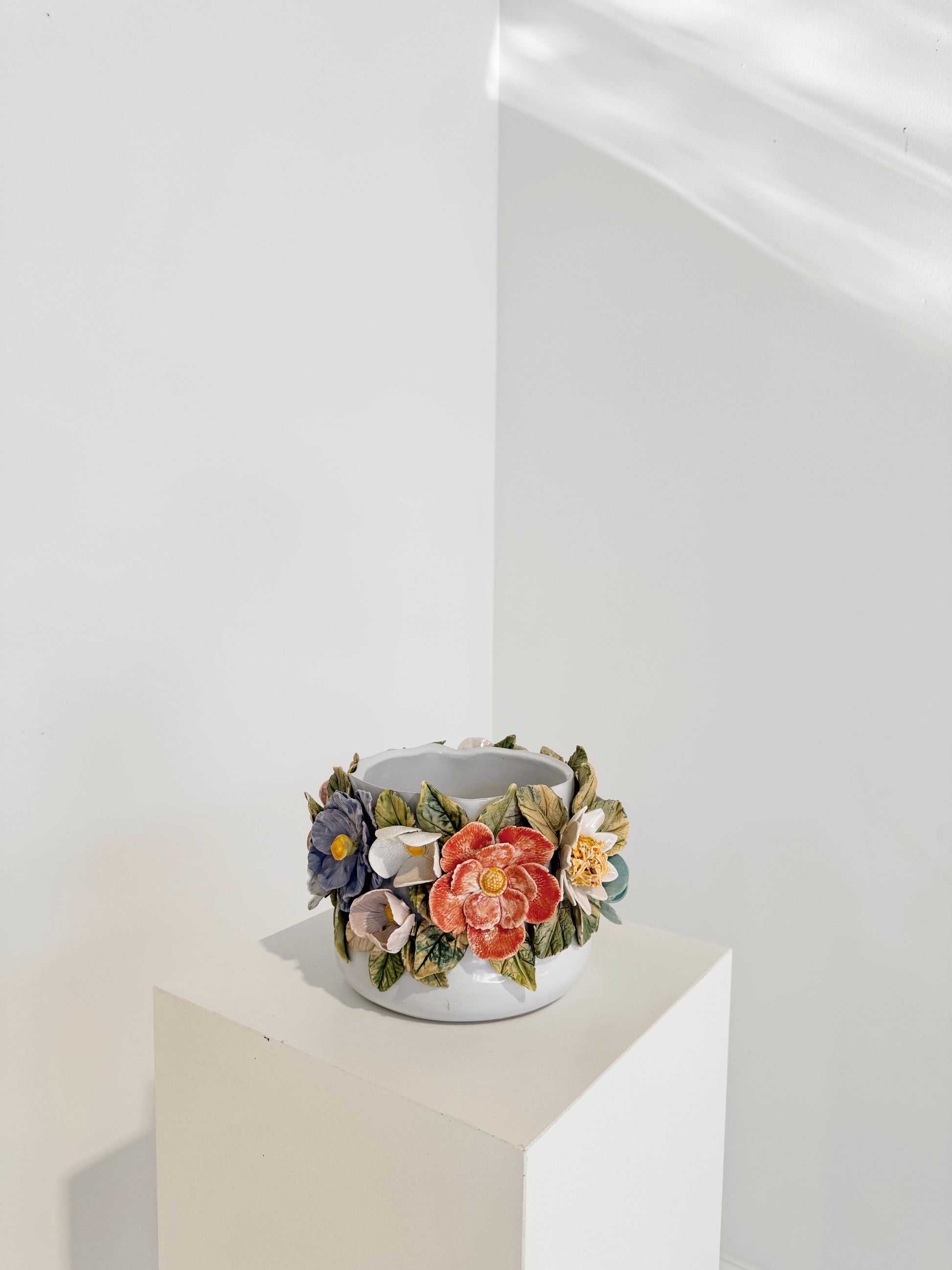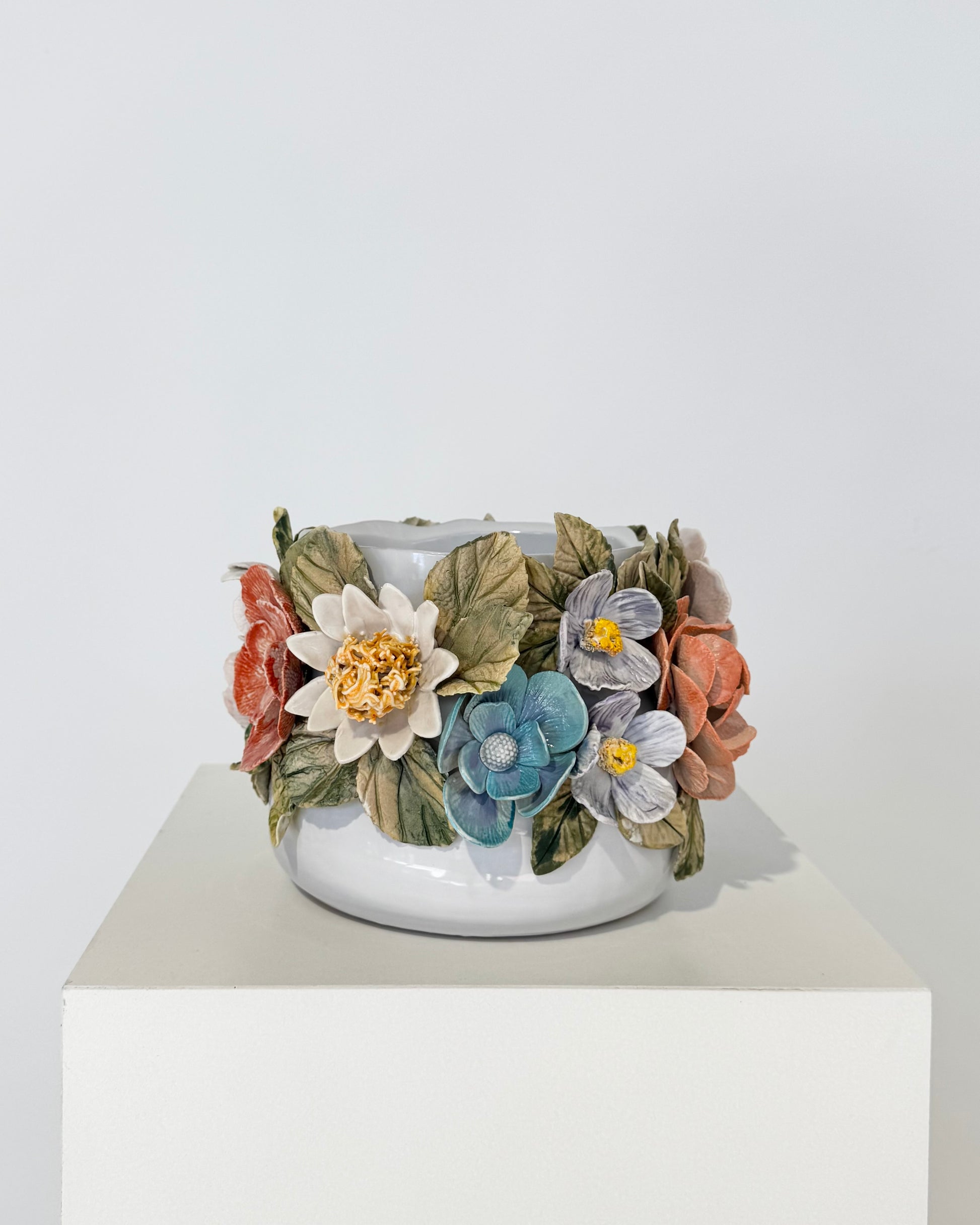 English Porcelain vessel, hand-built and hand-painted flowers.