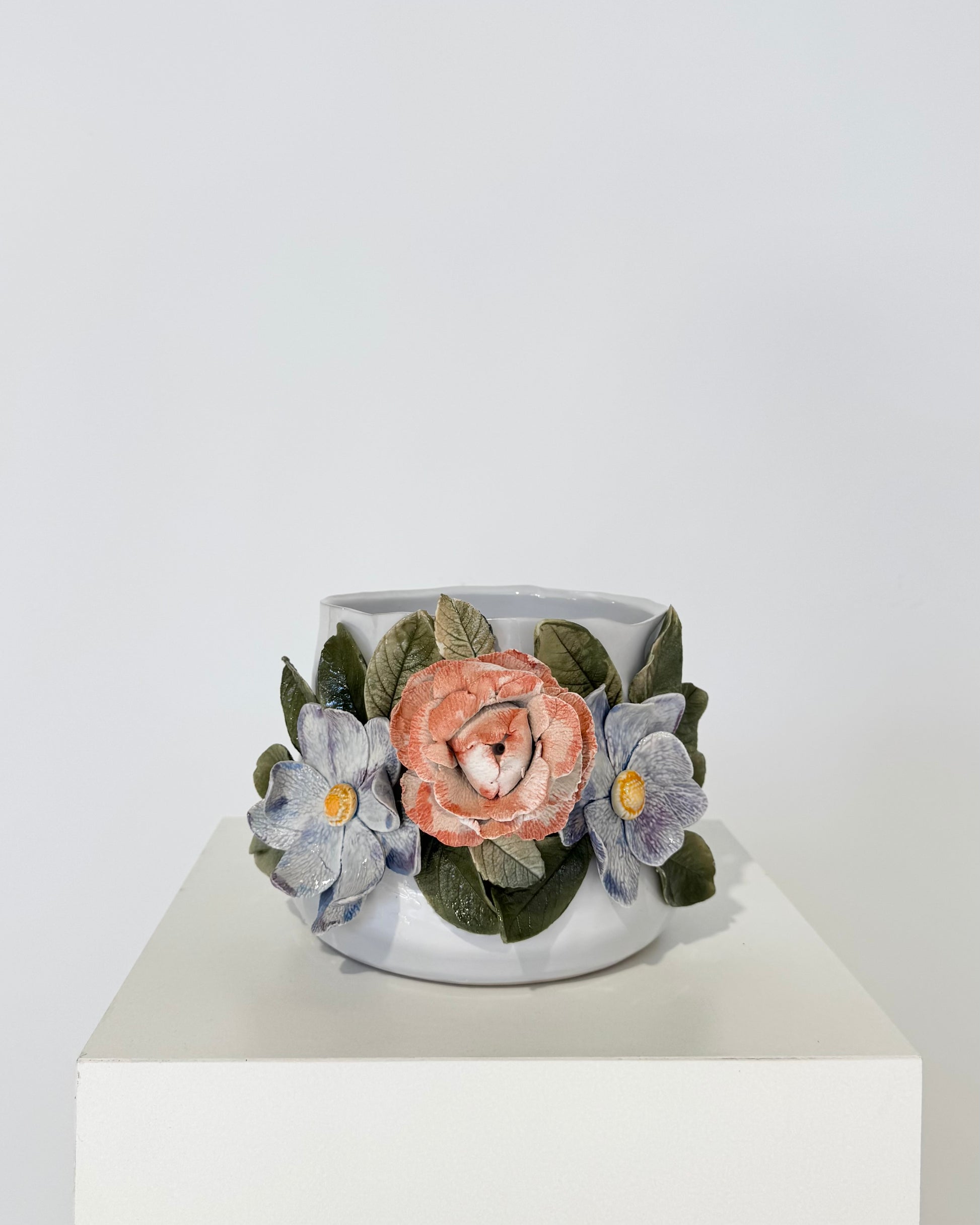 English Porcelain vessel, hand-built and hand-painted flowers.