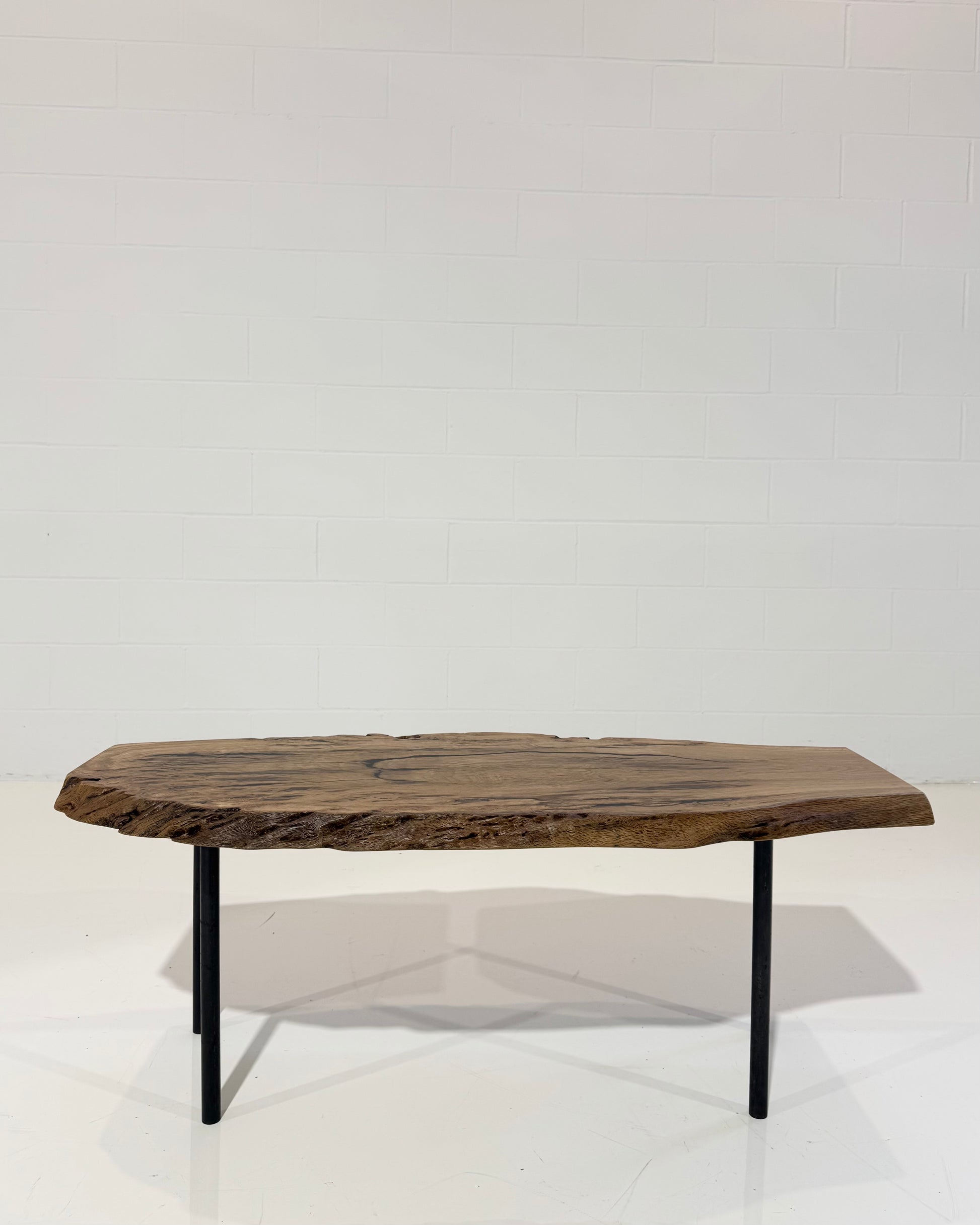 A beautiful coffee table crafted from a live-edge oak burl top and finished with steel legs. Would make a cool bench too.