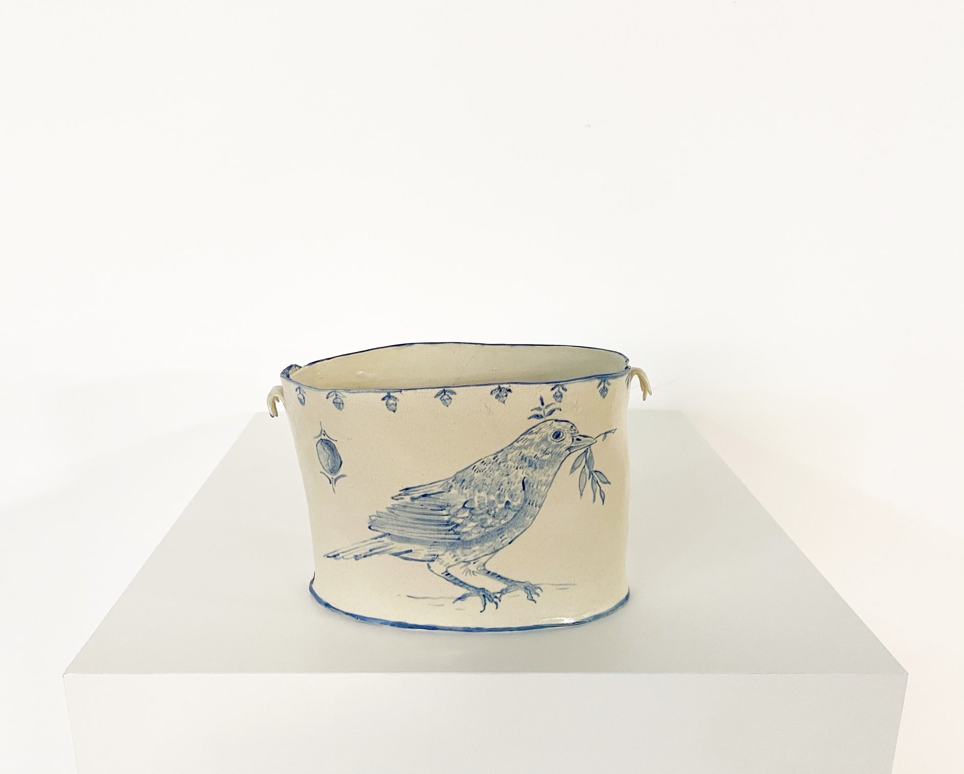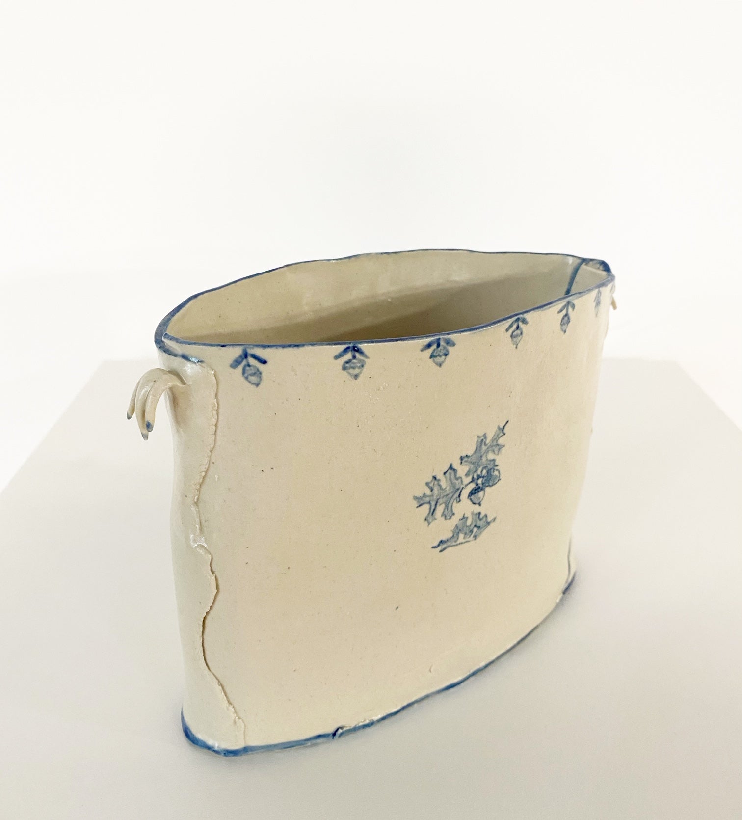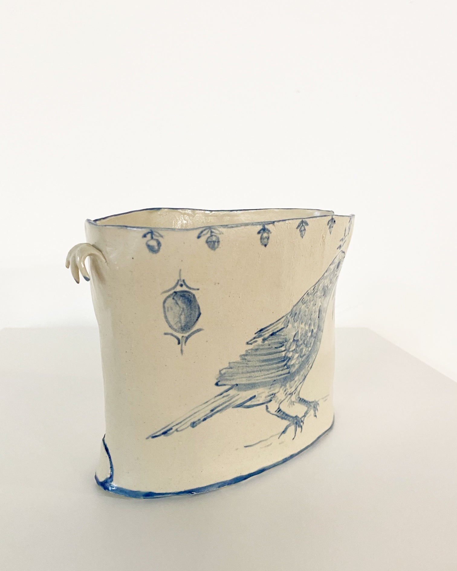 The Country Gentleman Collection by artist Maggie Robertson is a beautiful series of one-of-a-kind stoneware vessels. Each unique piece embraces the seams and irregularities of her hand-built technique complemented by intricate, hand-painted scenes of the English countryside in classic blue and white. The vessels are water tight and food safe, microwaveable and dishwasher safe; however, as they are art pieces and fragile, we would recommend hand washing.