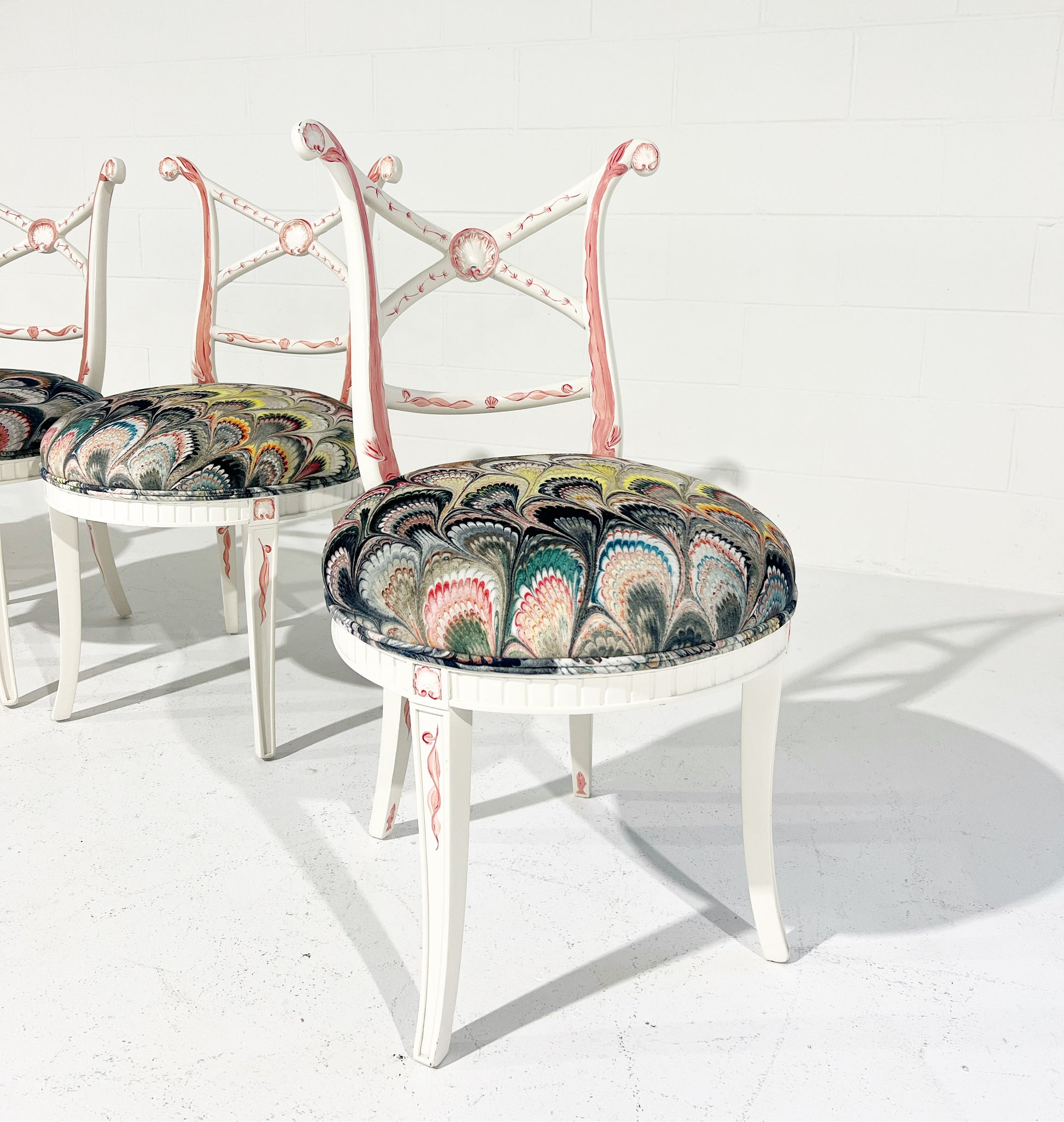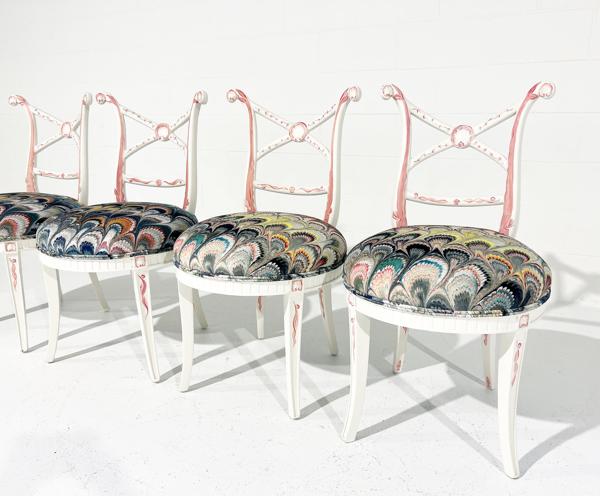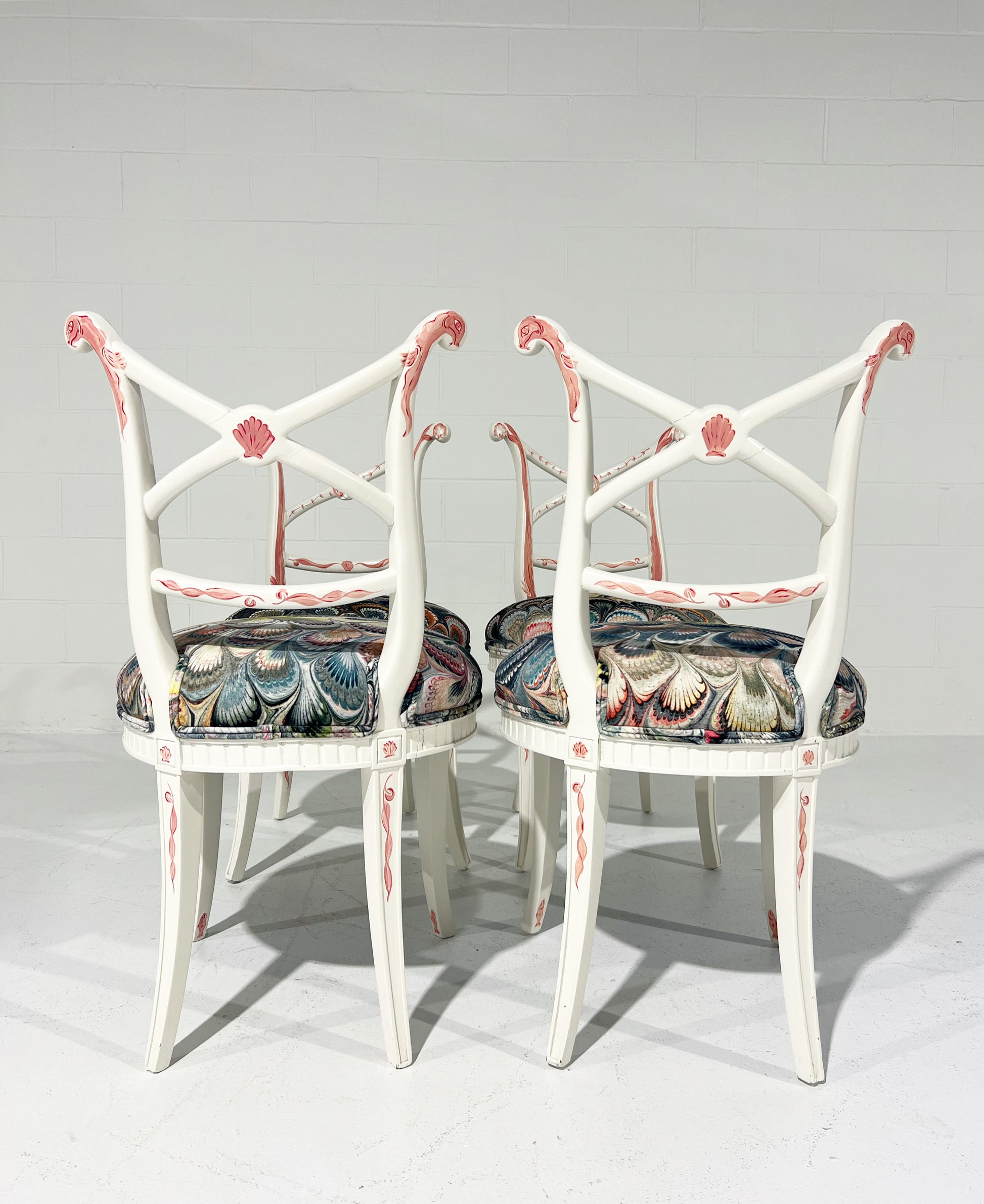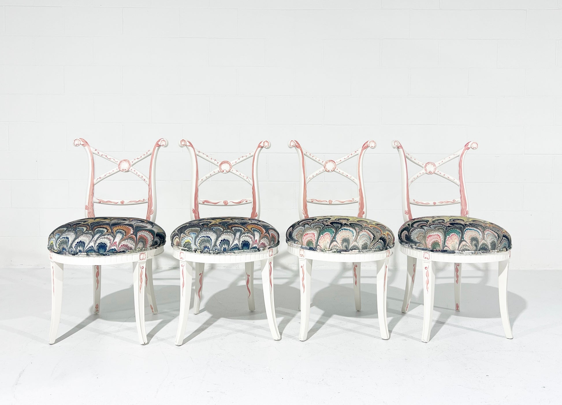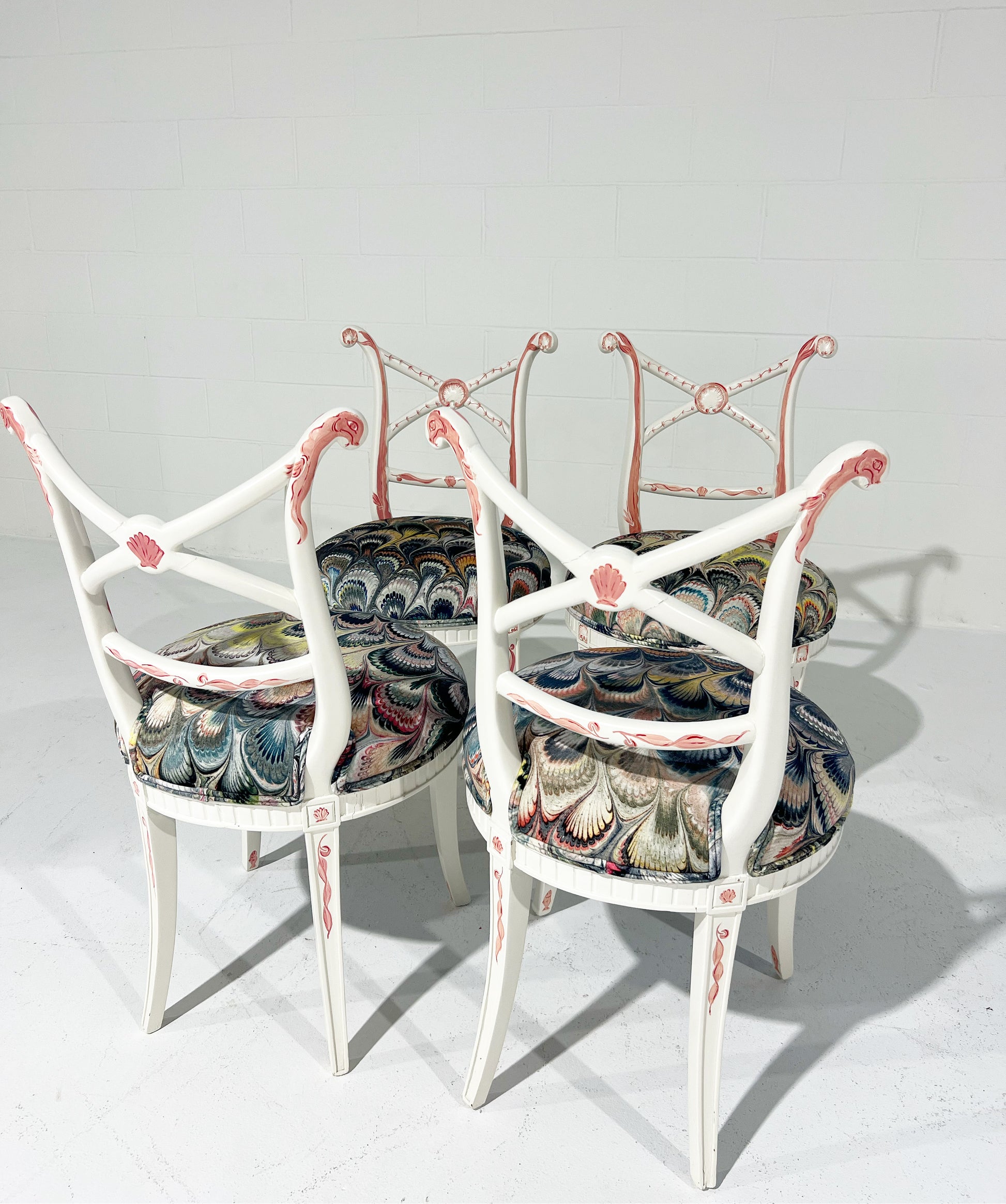 A charming set of 4 chairs in the Hollywood Regency style. Each chair was first stripped and painted a beautiful ivory color, the perfect backdrop for artist Maggie Robertson. Inspired by the chair's design and details, Maggie hand-painted imagery and motifs of the ocean. Sea creatures and shell motifs decorate each chair in a beautiful peachy pink. To complement the shade of pink, the Forsyth team chose the colorful and always popular marbleized velvet from Beata Heuman's collection of incredible fabrics. We think it lends itself perfectly to a sea-inspired chair. These charming chairs are truly one-of-a-kind and destined for a very special home.