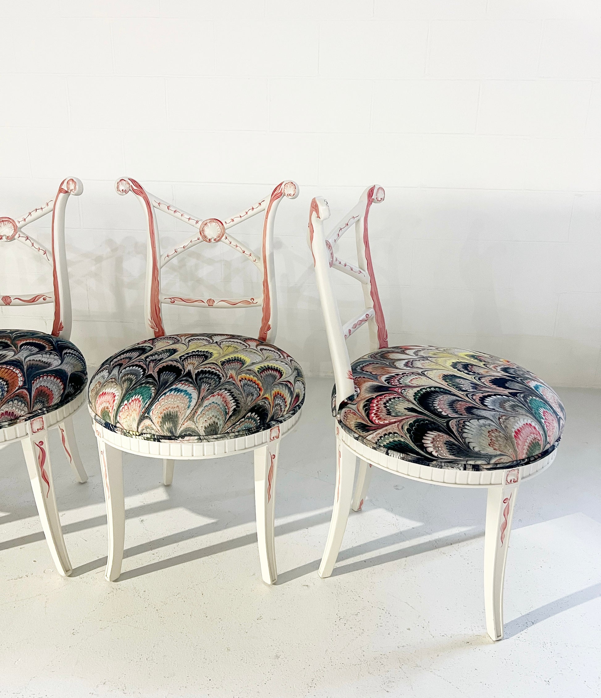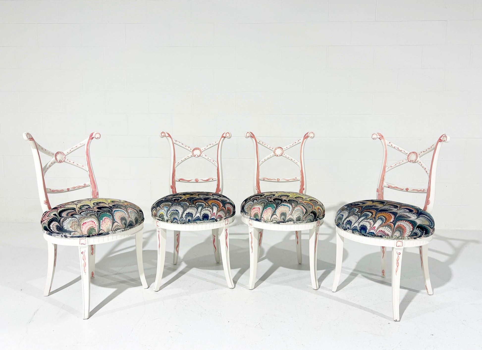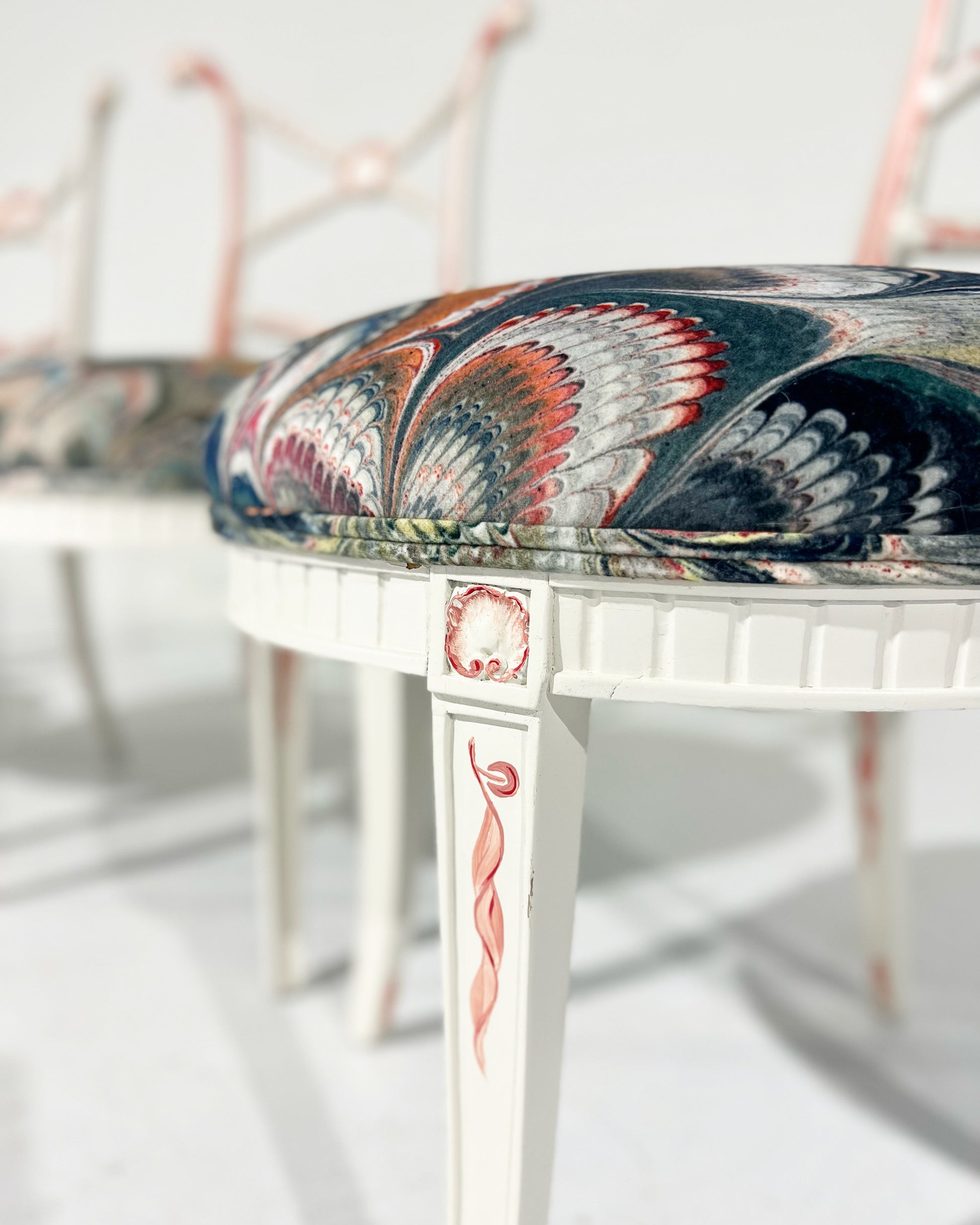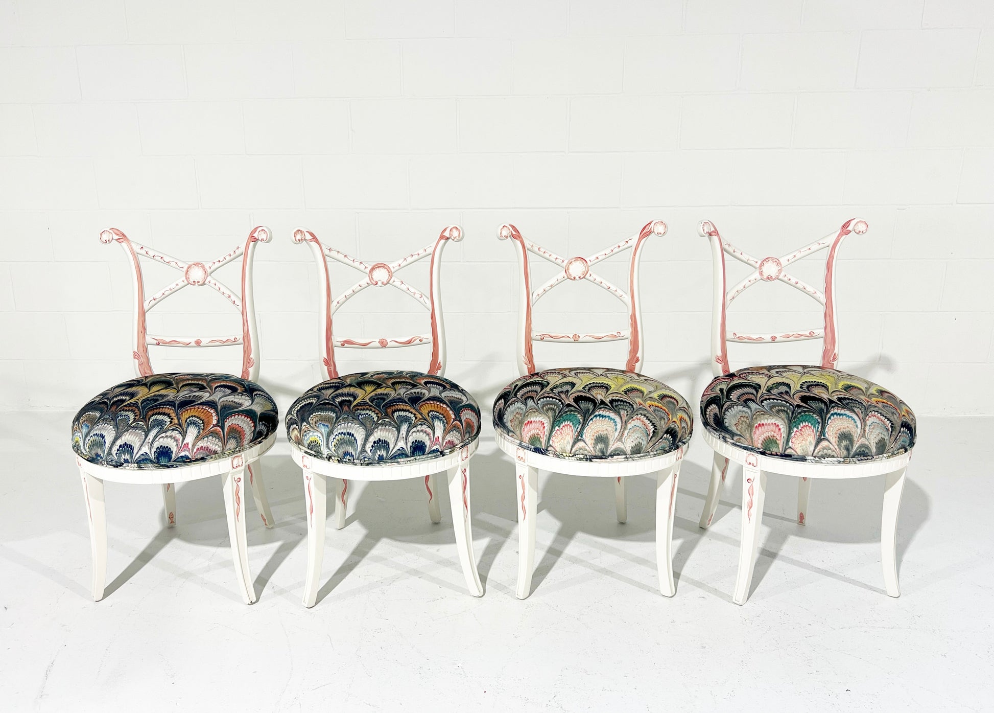 A charming set of 4 chairs in the Hollywood Regency style. Each chair was first stripped and painted a beautiful ivory color, the perfect backdrop for artist Maggie Robertson. Inspired by the chair's design and details, Maggie hand-painted imagery and motifs of the ocean. Sea creatures and shell motifs decorate each chair in a beautiful peachy pink. To complement the shade of pink, the Forsyth team chose the colorful and always popular marbleized velvet from Beata Heuman's collection of incredible fabrics. We think it lends itself perfectly to a sea-inspired chair. These charming chairs are truly one-of-a-kind and destined for a very special home.