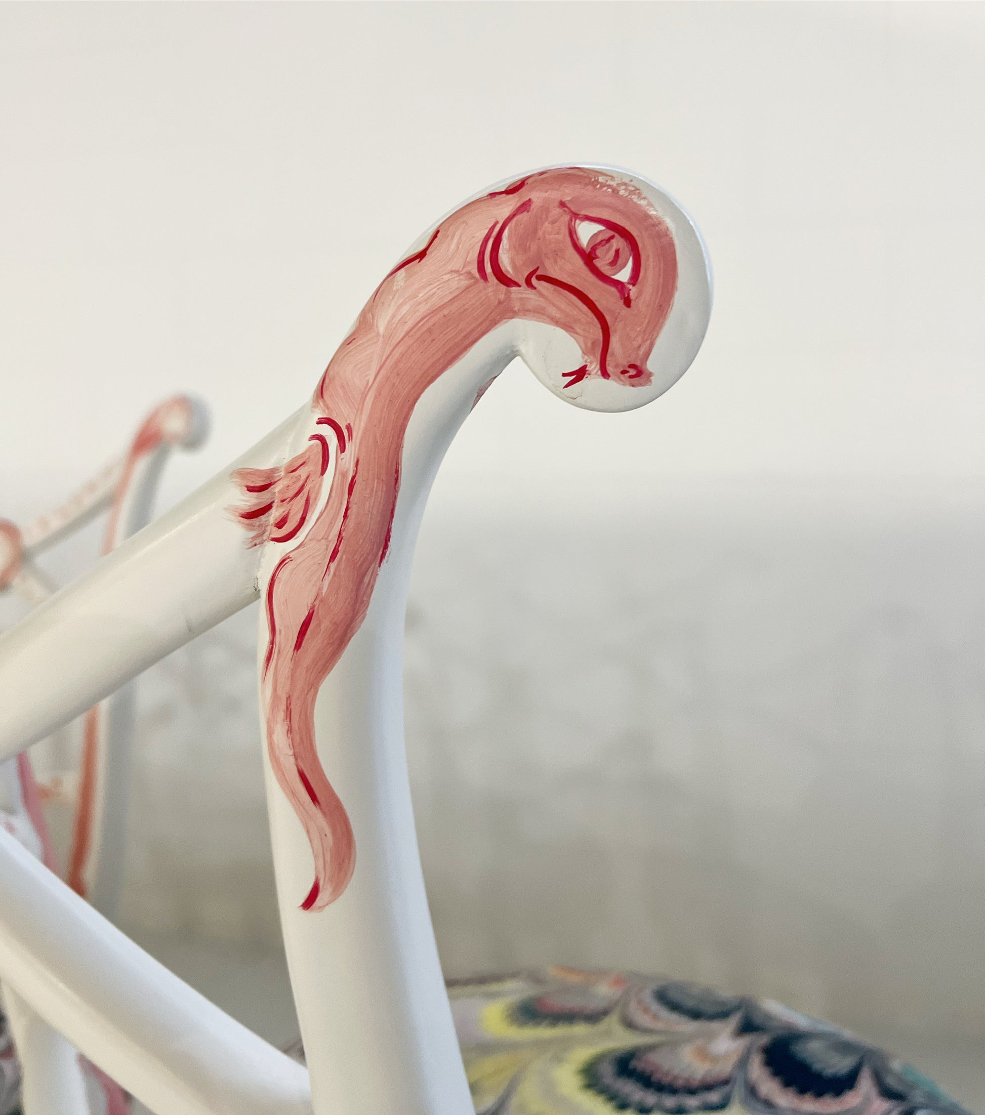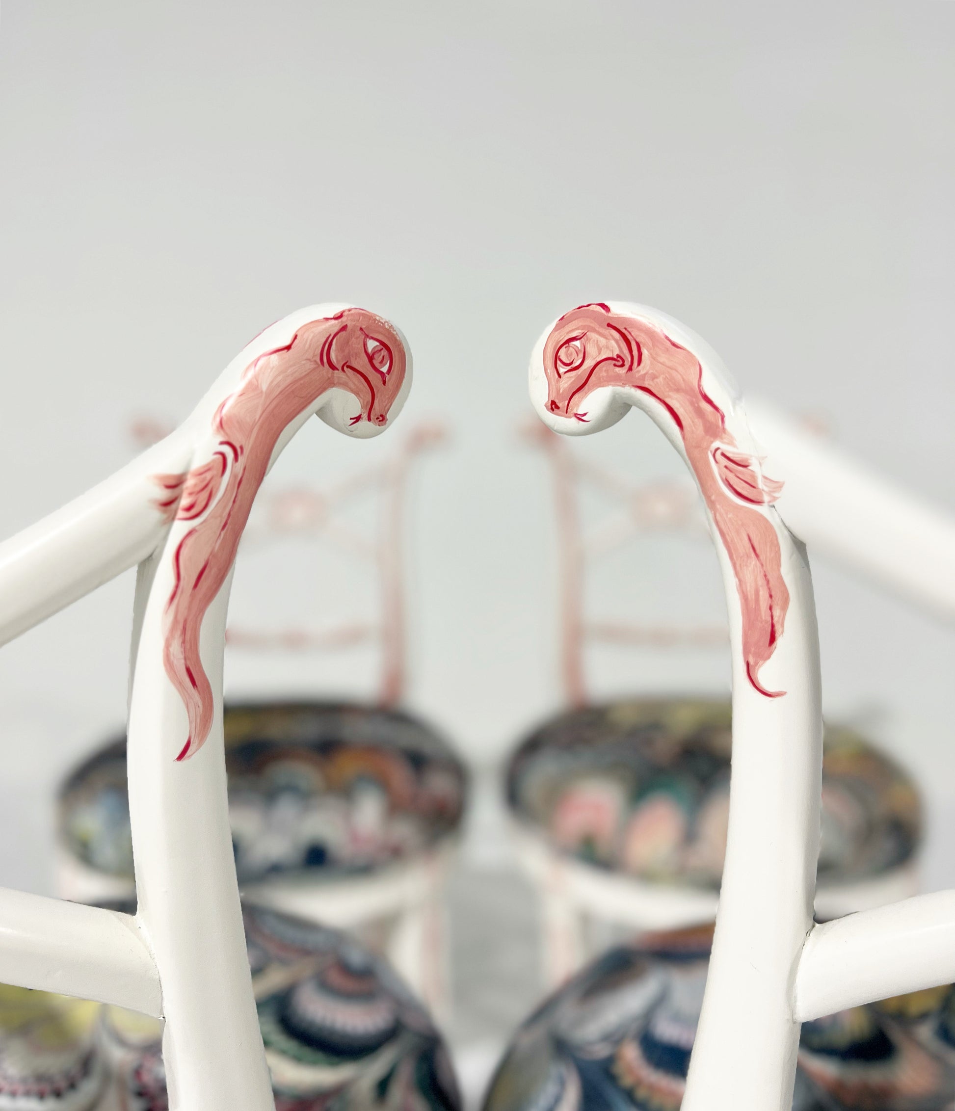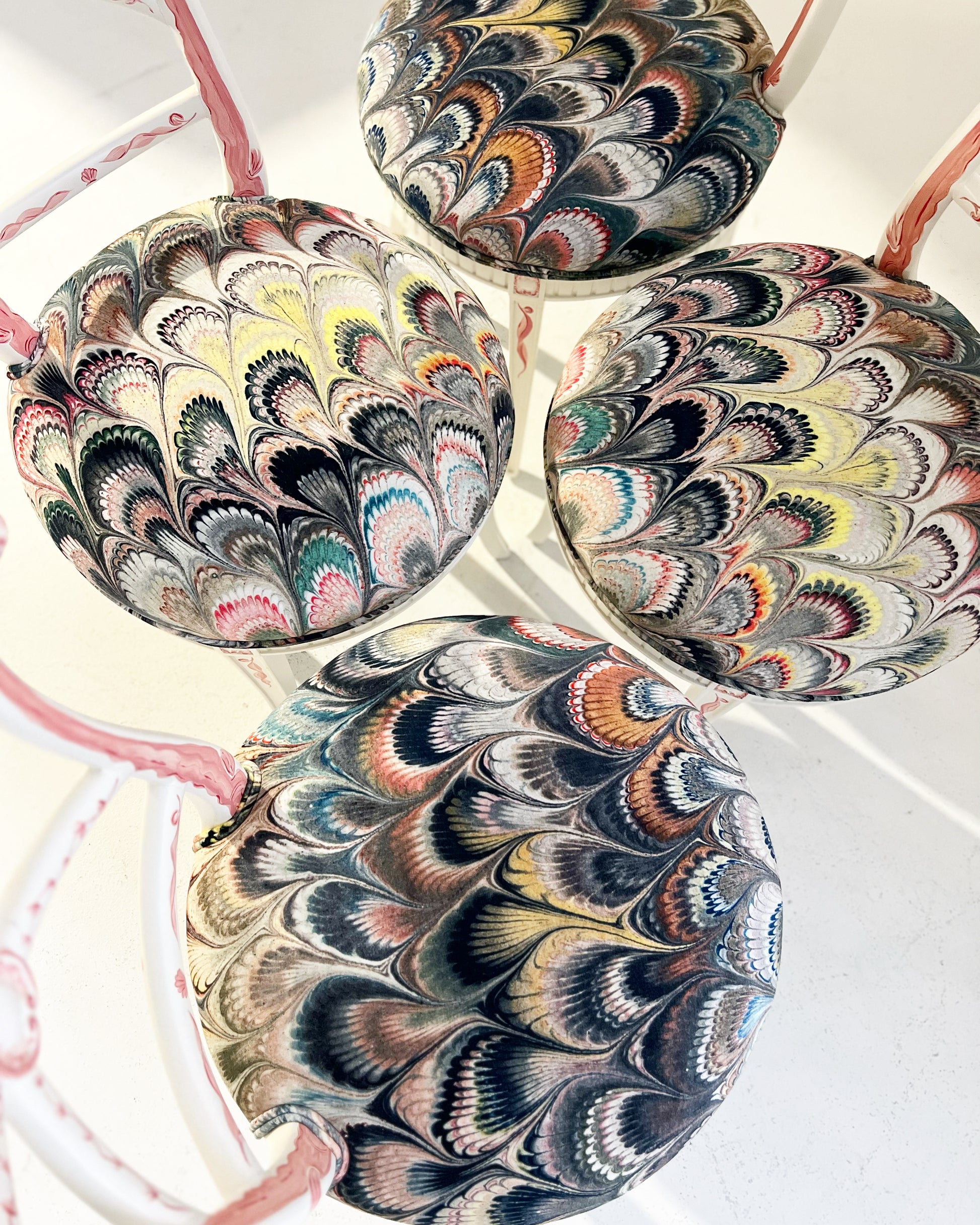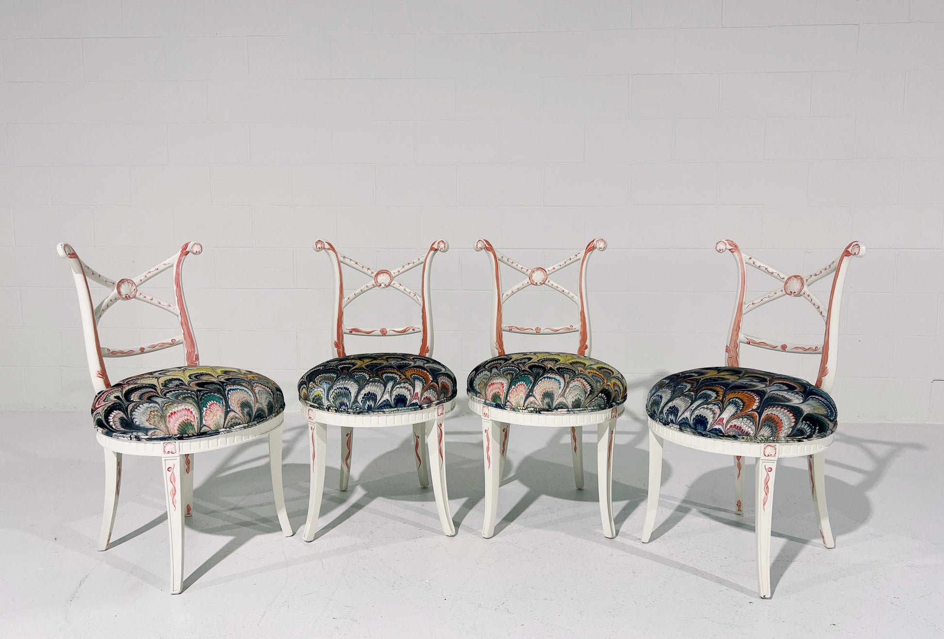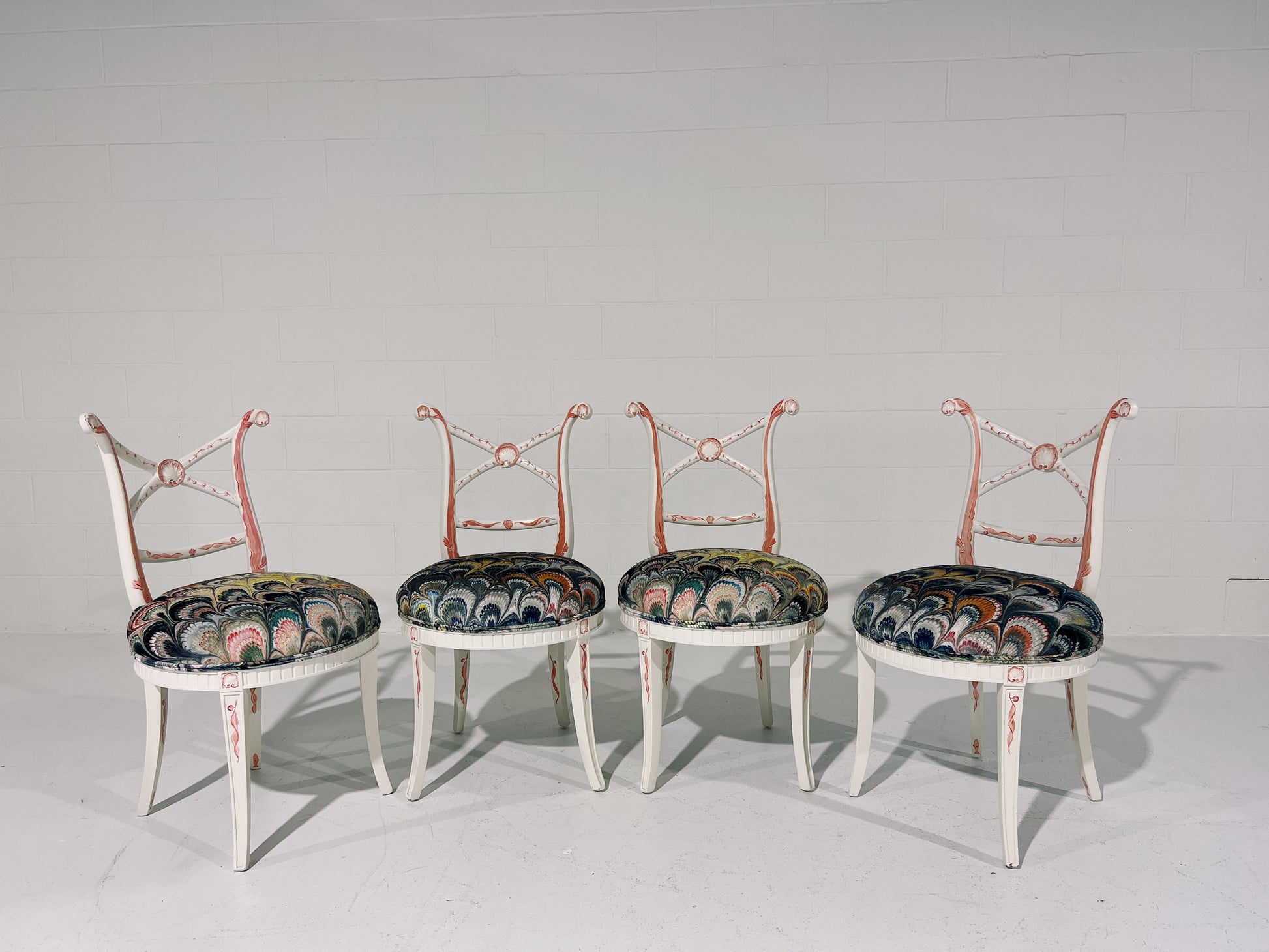 A charming set of 4 chairs in the Hollywood Regency style. Each chair was first stripped and painted a beautiful ivory color, the perfect backdrop for artist Maggie Robertson. Inspired by the chair's design and details, Maggie hand-painted imagery and motifs of the ocean. Sea creatures and shell motifs decorate each chair in a beautiful peachy pink. To complement the shade of pink, the Forsyth team chose the colorful and always popular marbleized velvet from Beata Heuman's collection of incredible fabrics. We think it lends itself perfectly to a sea-inspired chair. These charming chairs are truly one-of-a-kind and destined for a very special home.