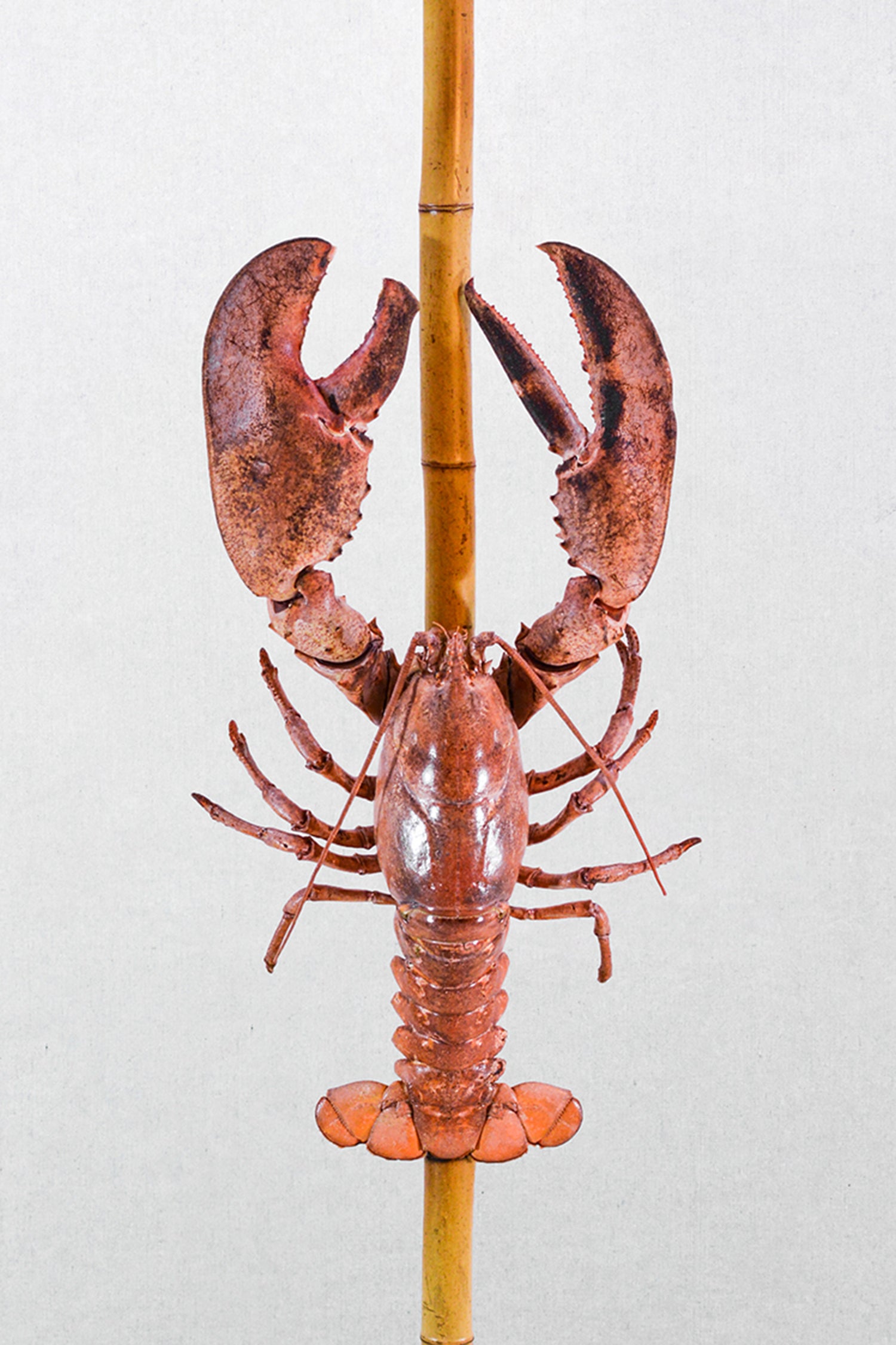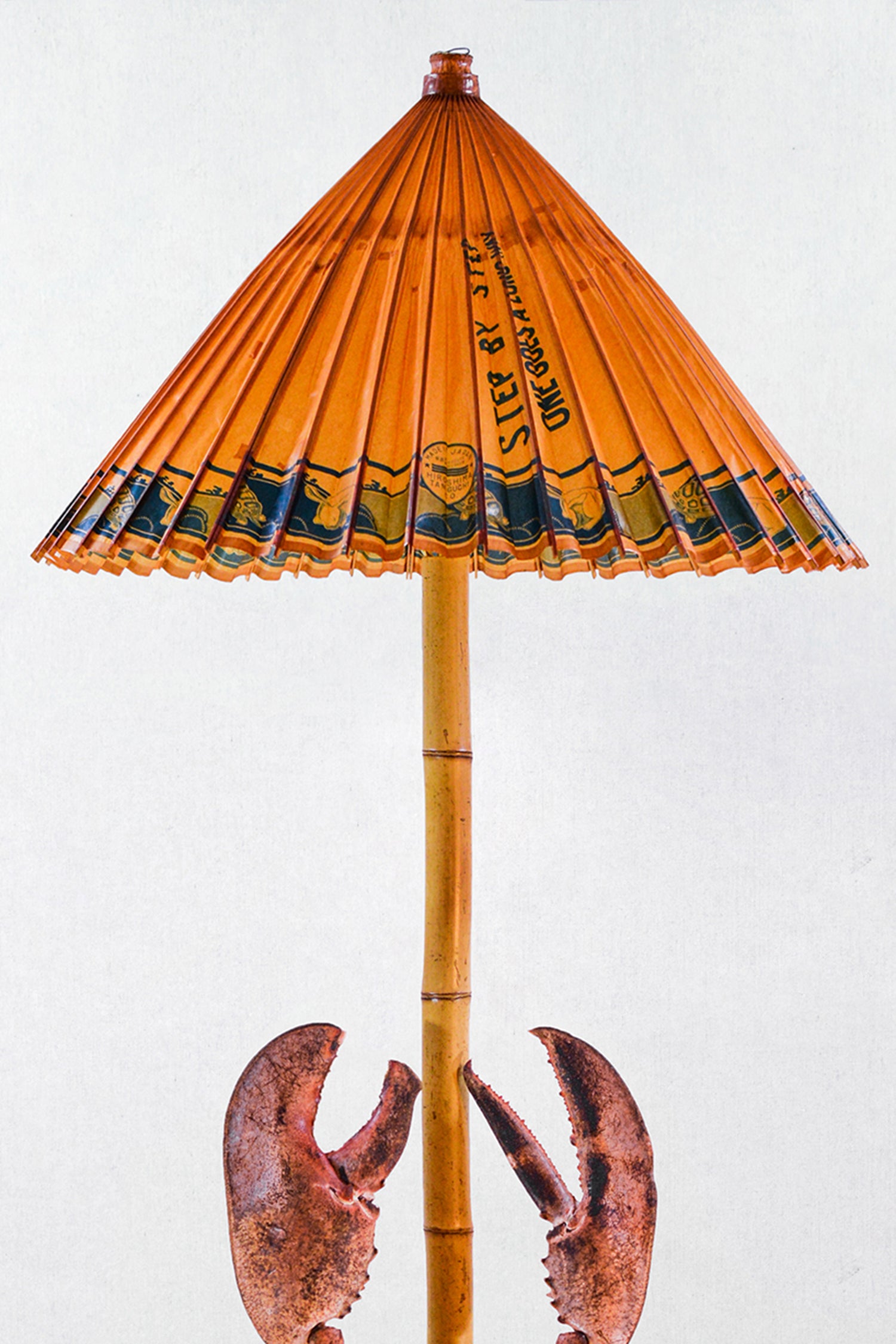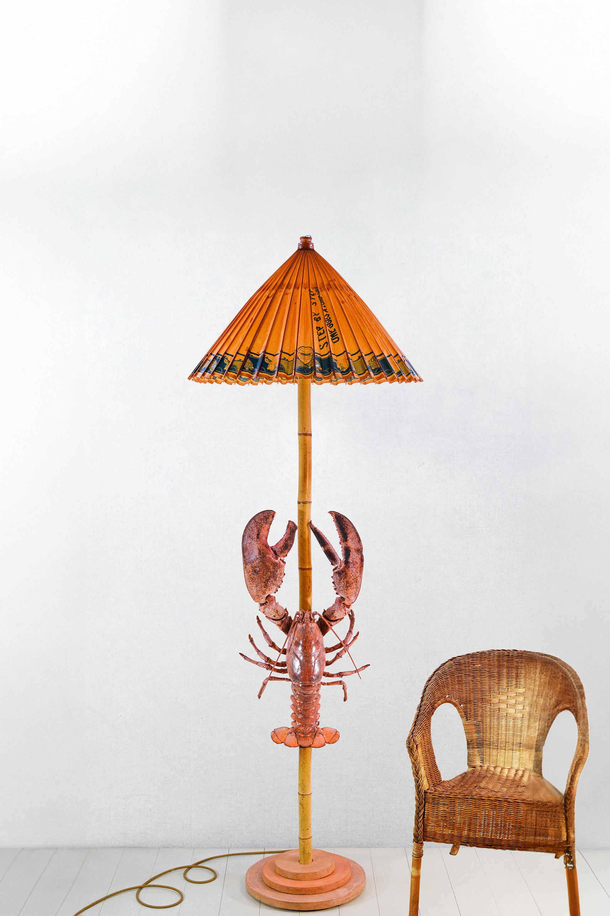 Materials: Vintage Japanese oil paper, preserved lobster exoskeleton, backyard bamboo, tinted cement, brass fittings, lamp wire, cotton cord, 40w bulb, acrylic polymer, shellac.