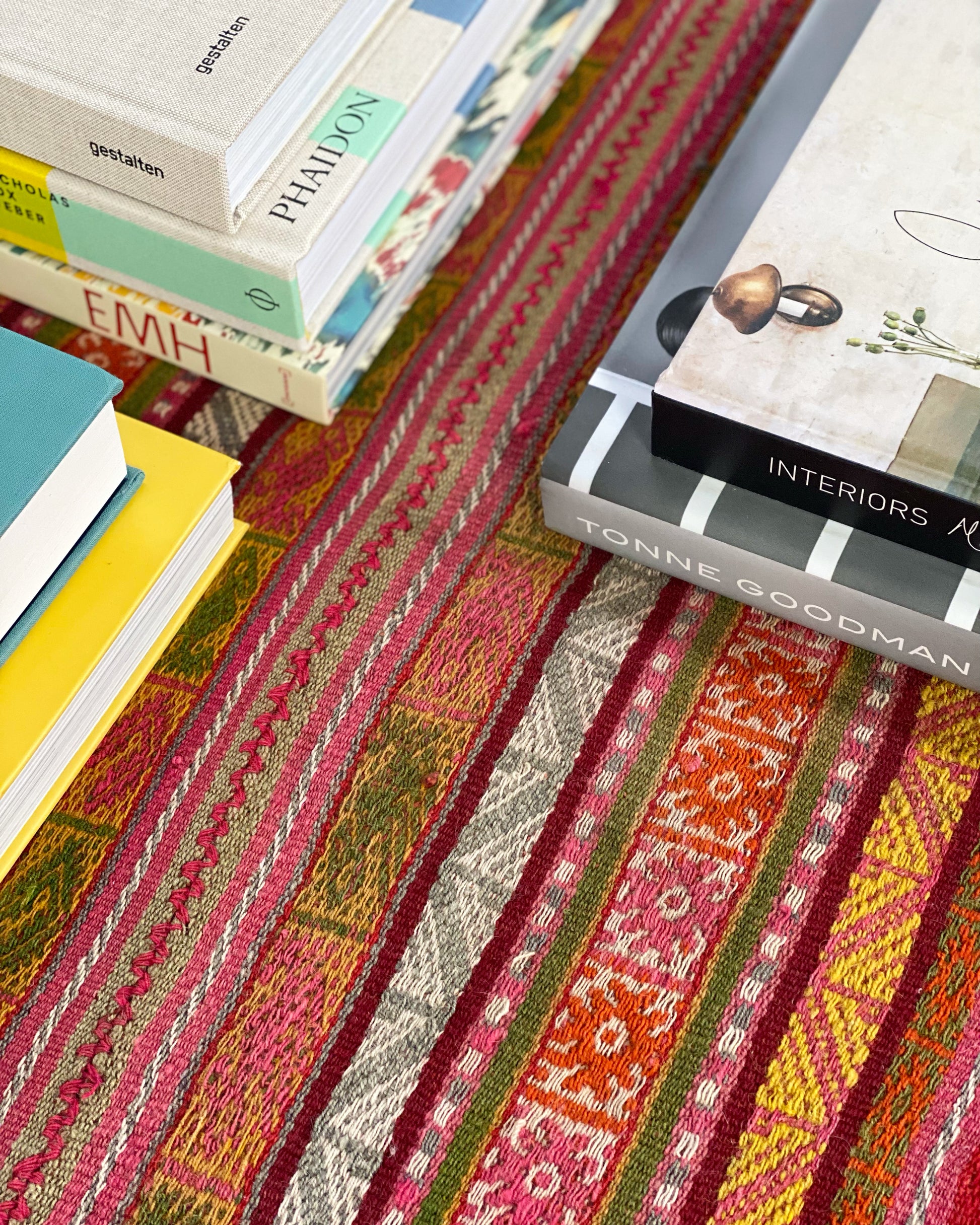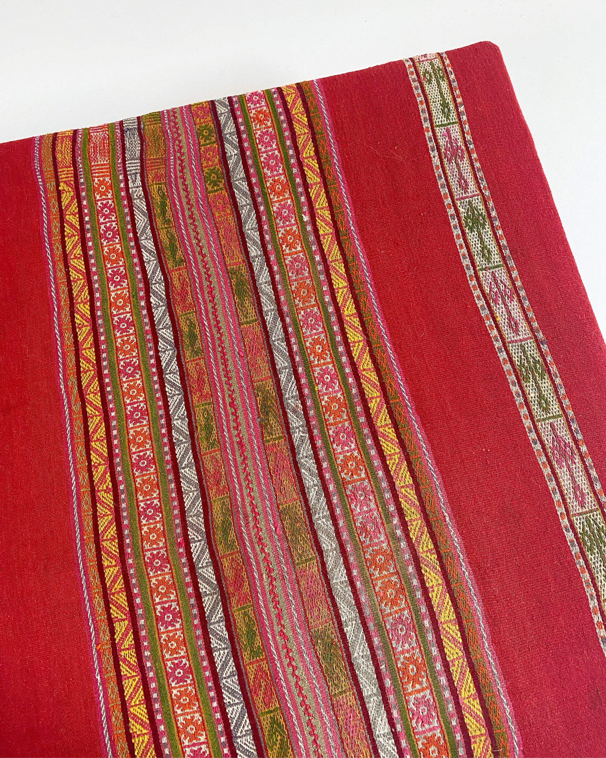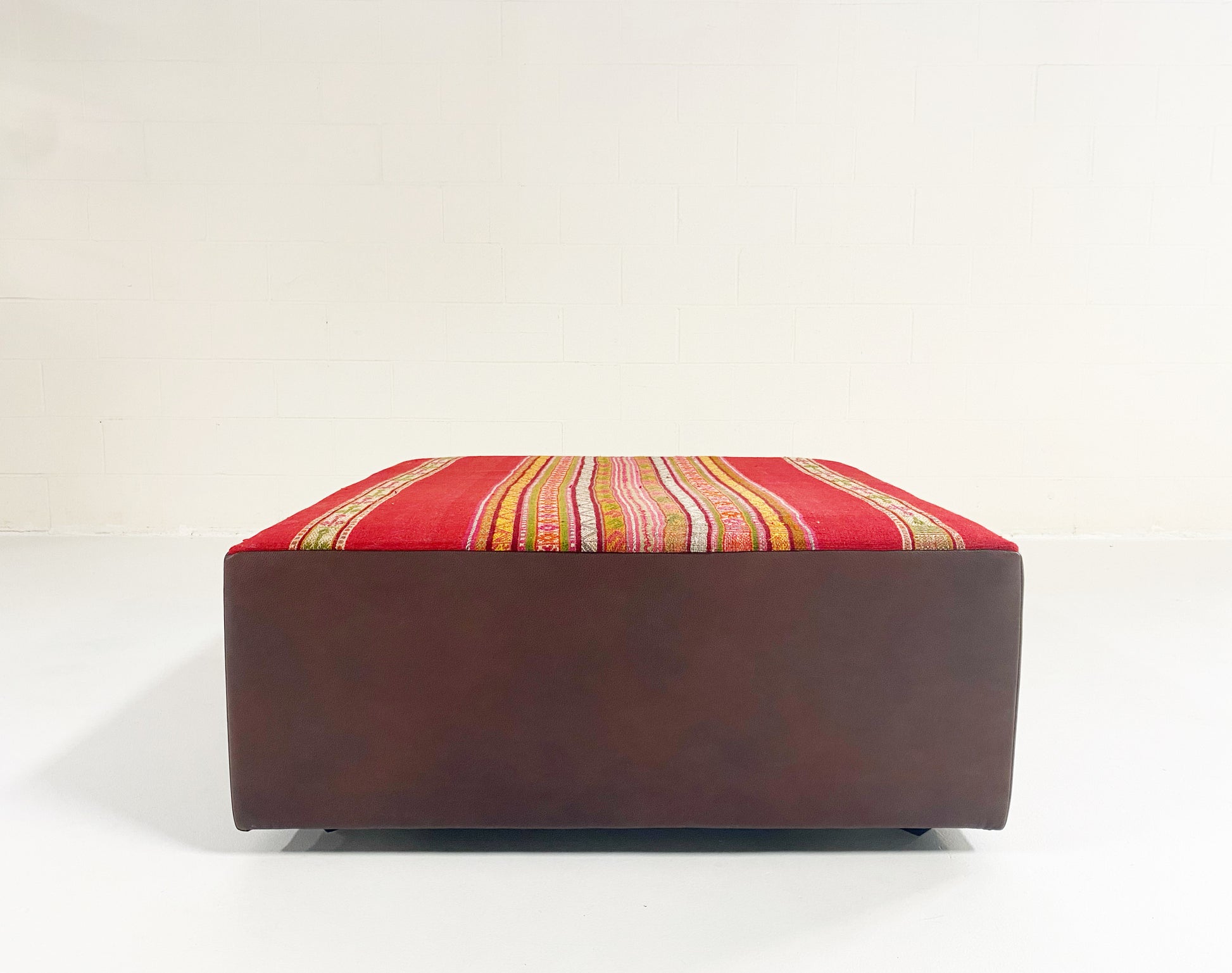 A one-of-a-kind ottoman designed by Forsyth and beautifully handmade using a vintage textile from Peru. The textile is finished with luxurious leather sides. The perfect coffee table, ottoman, or extra seating. We love the bohemian aesthetic and rich colors found in South American textiles.