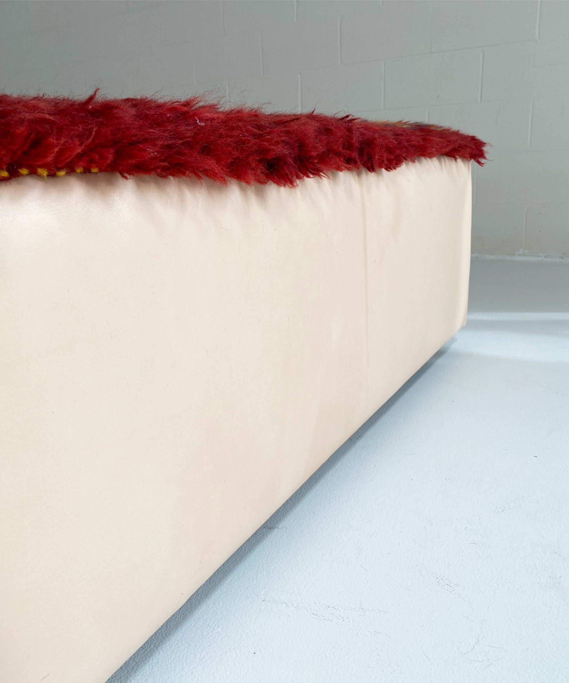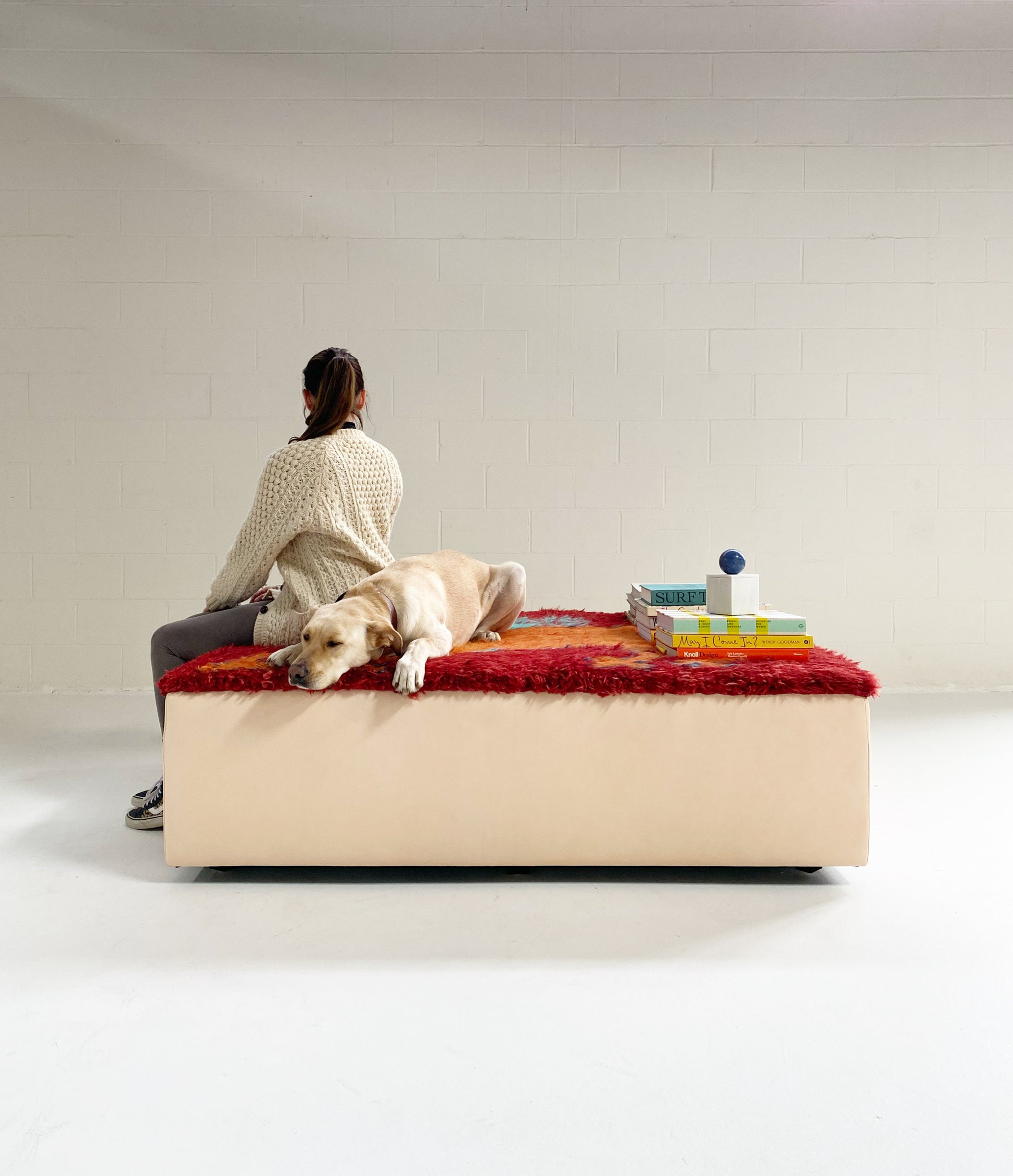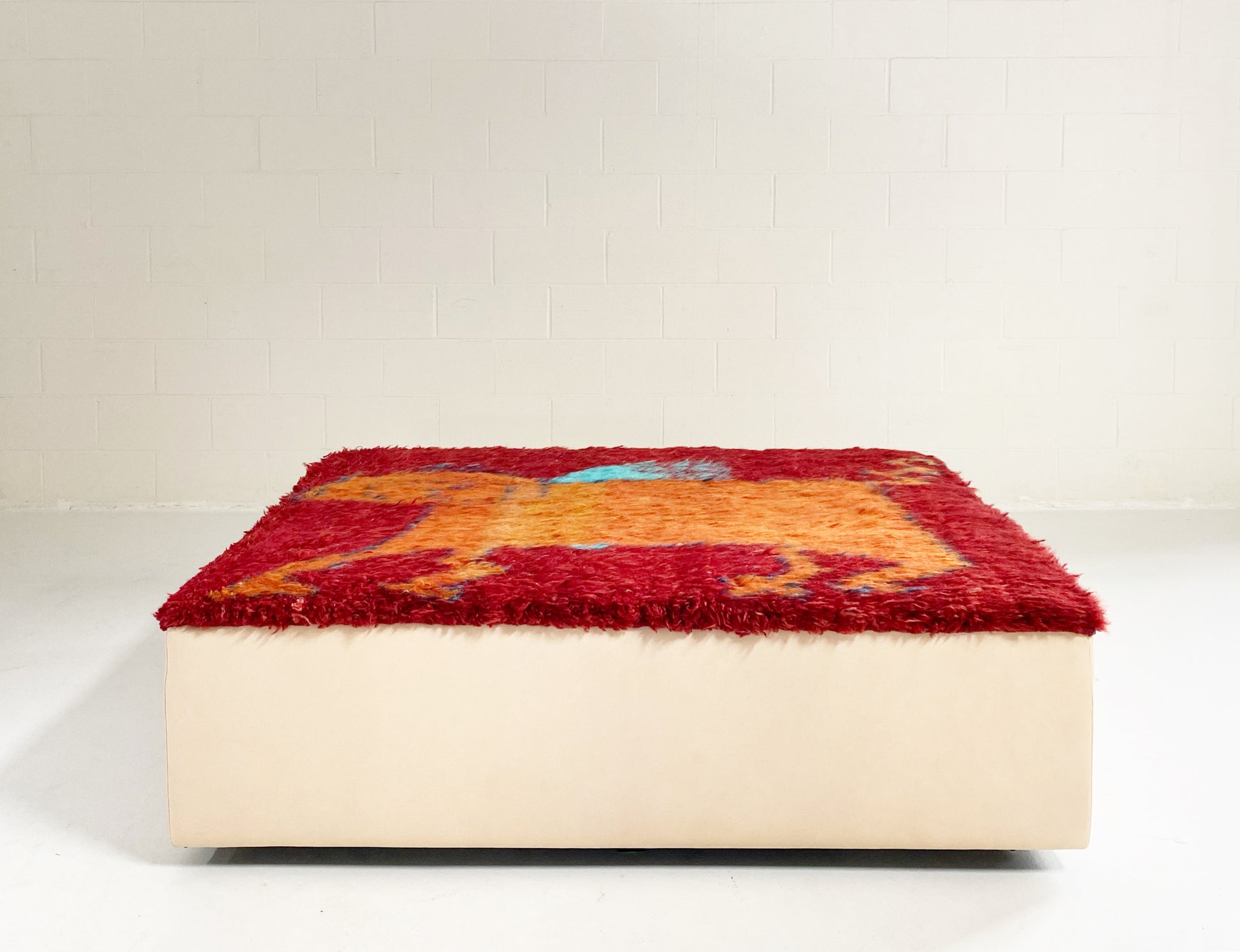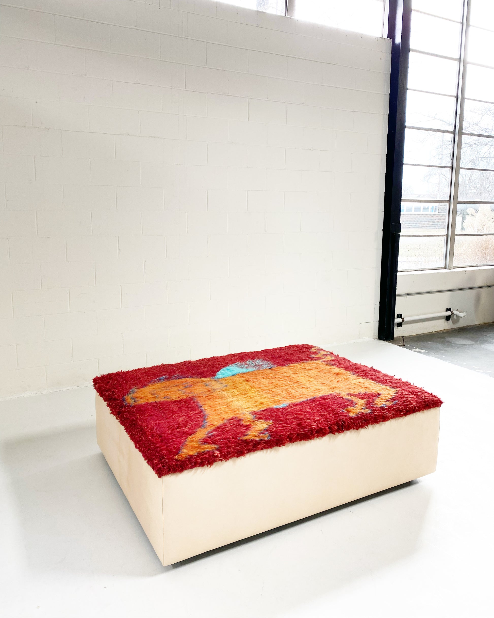 A one-of-a-kind ottoman designed by Forsyth and beautifully handmade using a vintage Iranian gabbeh rug (100% hand-spun sheep wool). The rug is finished with luxurious vegetable tanned leather sides. The leather will patina beautifully. The perfect coffee table, ottoman, or extra seating.