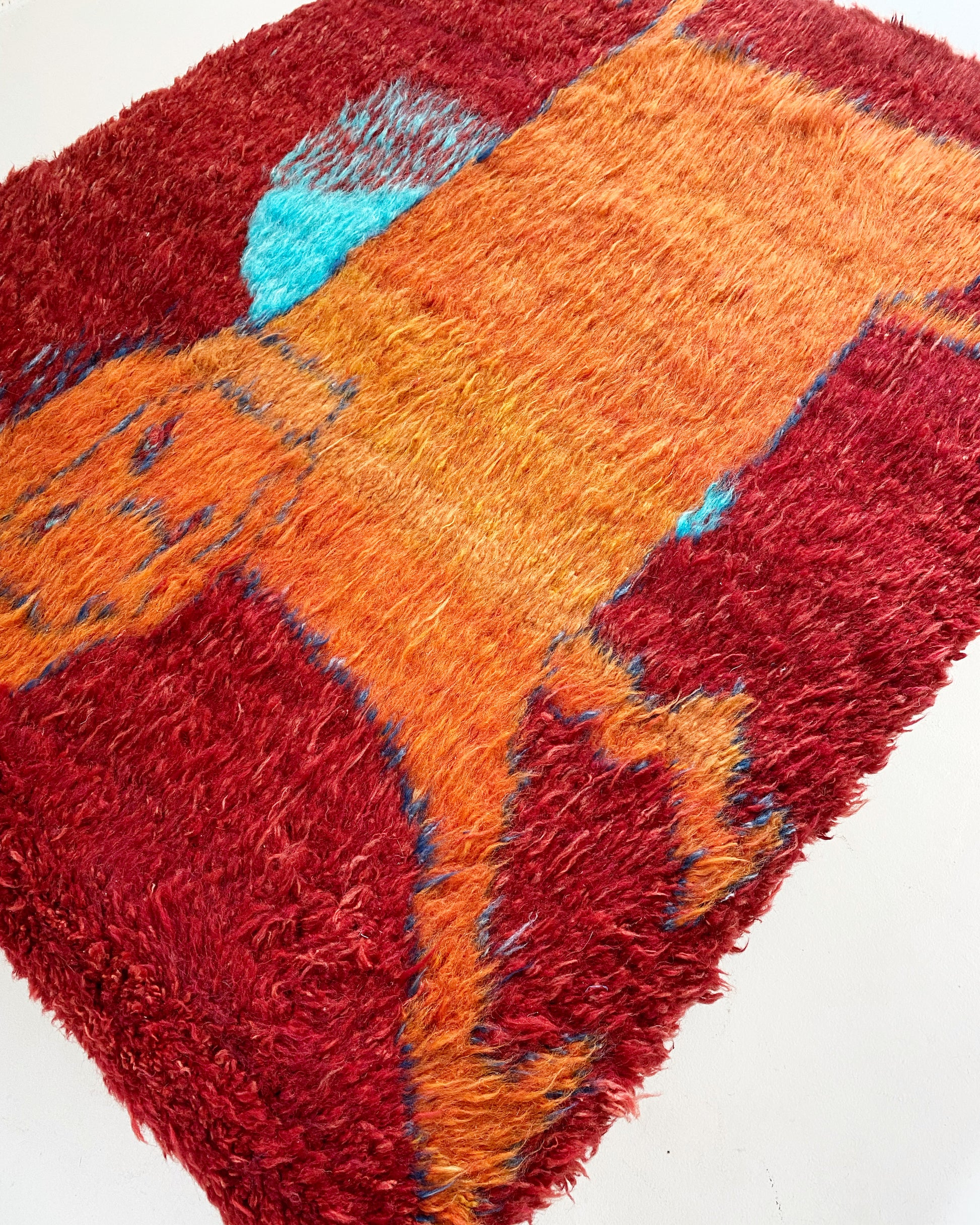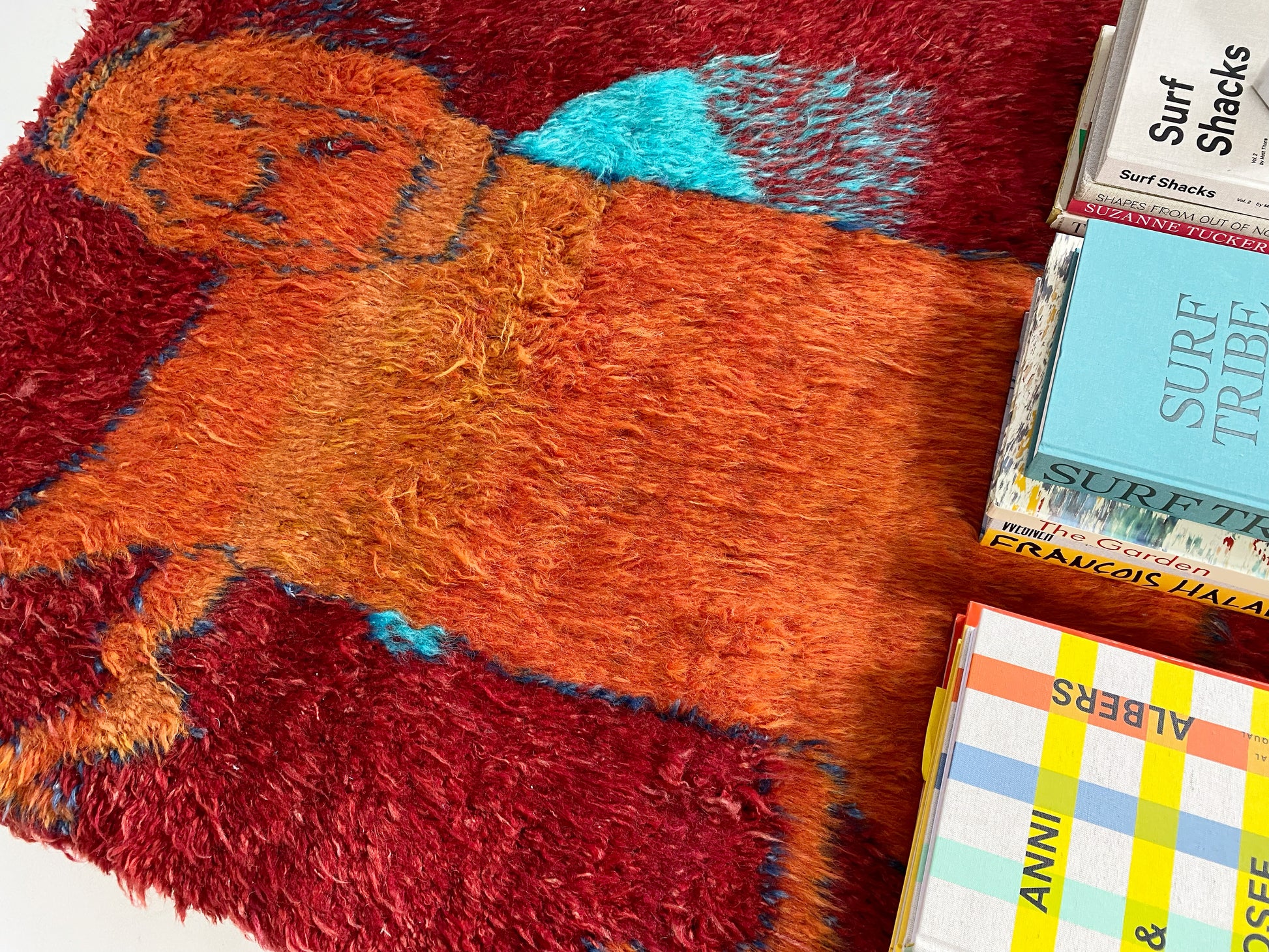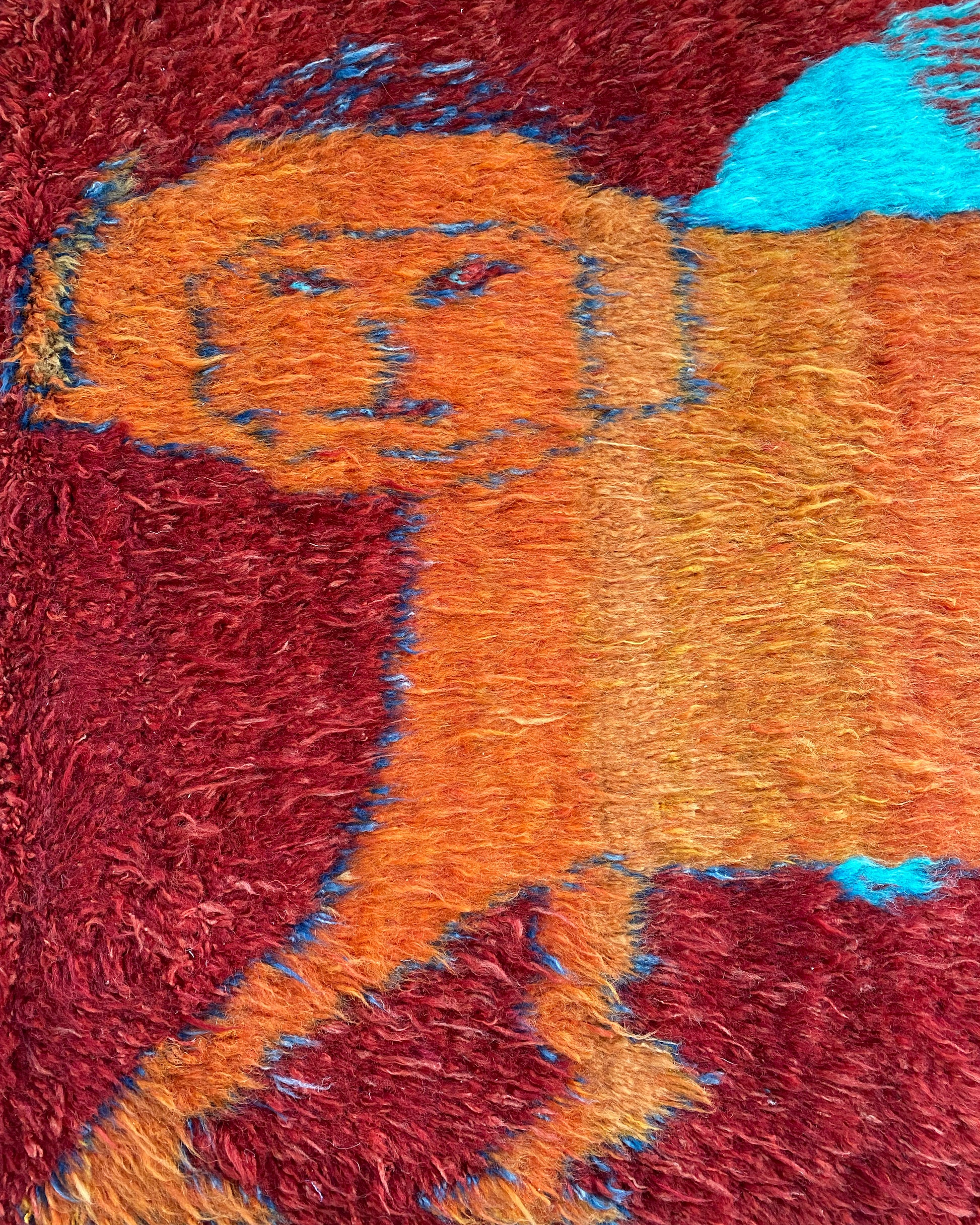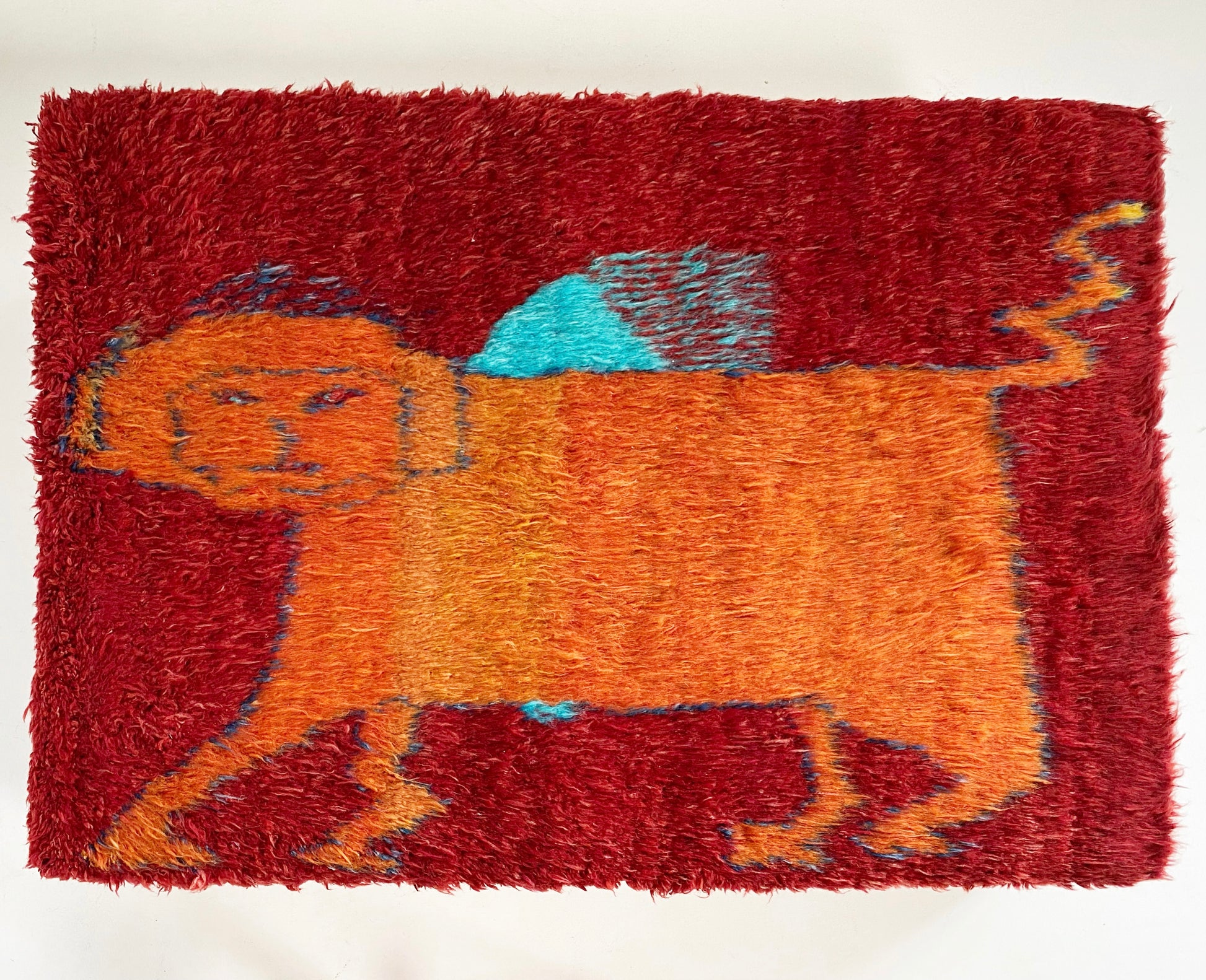 A one-of-a-kind ottoman designed by Forsyth and beautifully handmade using a vintage Iranian gabbeh rug (100% hand-spun sheep wool). The rug is finished with luxurious vegetable tanned leather sides. The leather will patina beautifully. The perfect coffee table, ottoman, or extra seating.