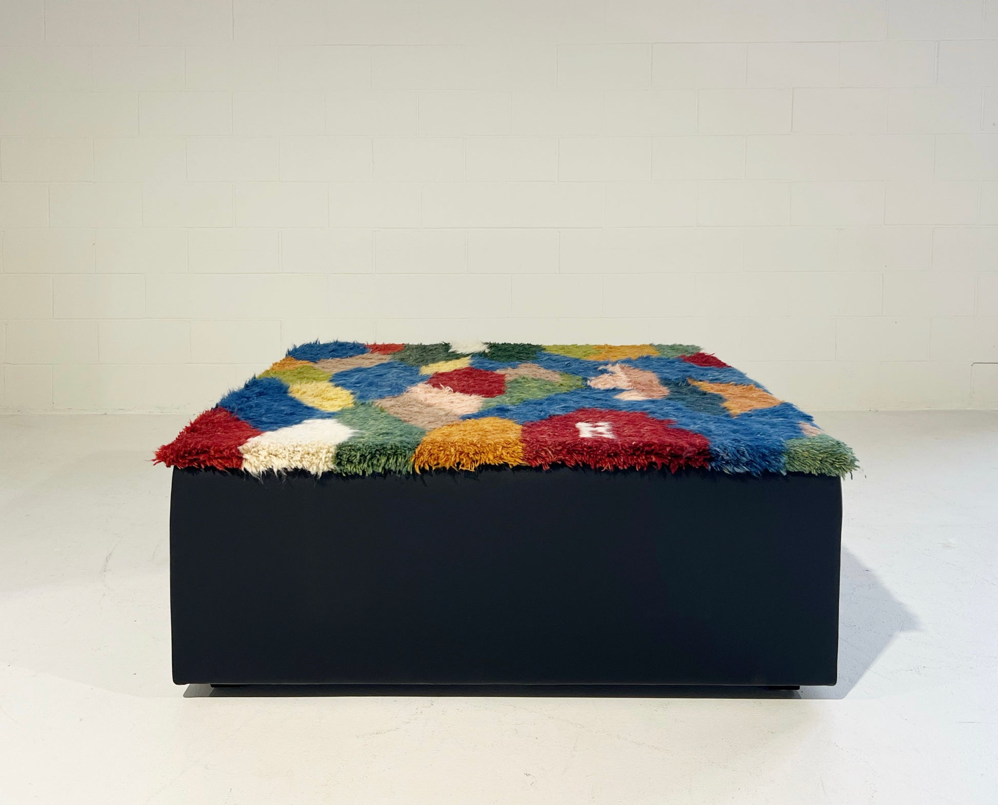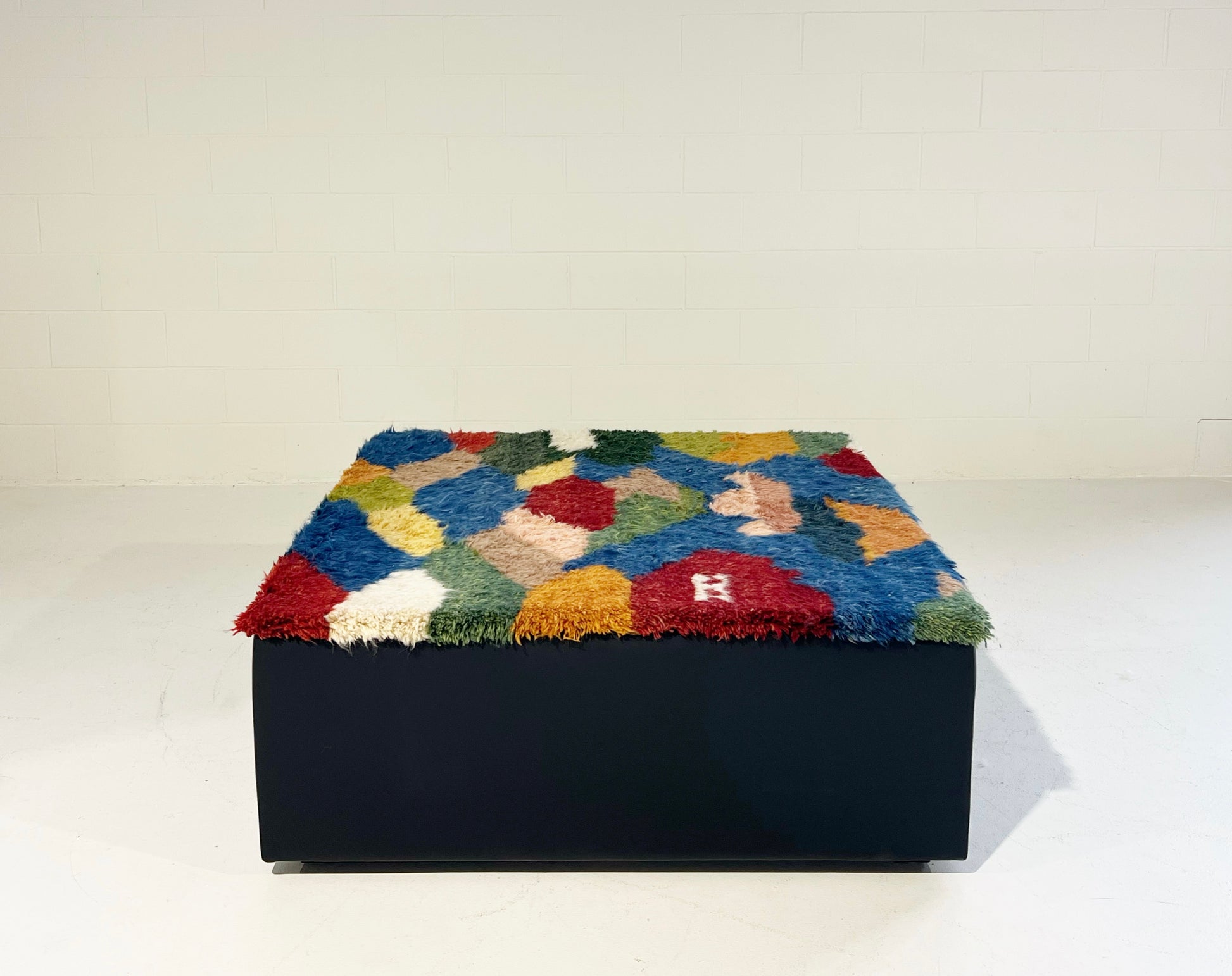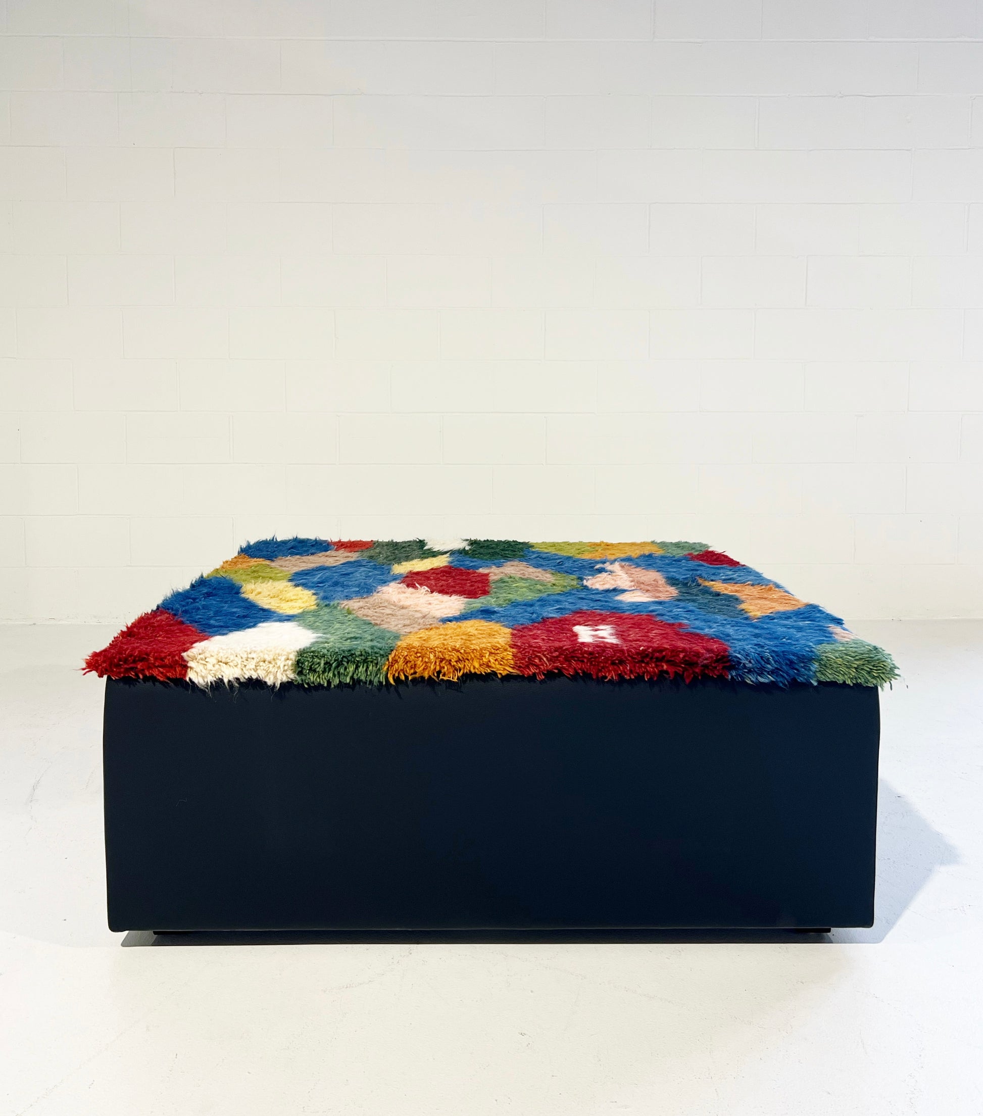 A one-of-a-kind ottoman designed by Forsyth and beautifully handmade using a vintage Iranian gabbeh rug (100% hand-spun sheep wool). The rug is finished with luxurious Italian black leather sides. The perfect coffee table, ottoman, or extra seating.
