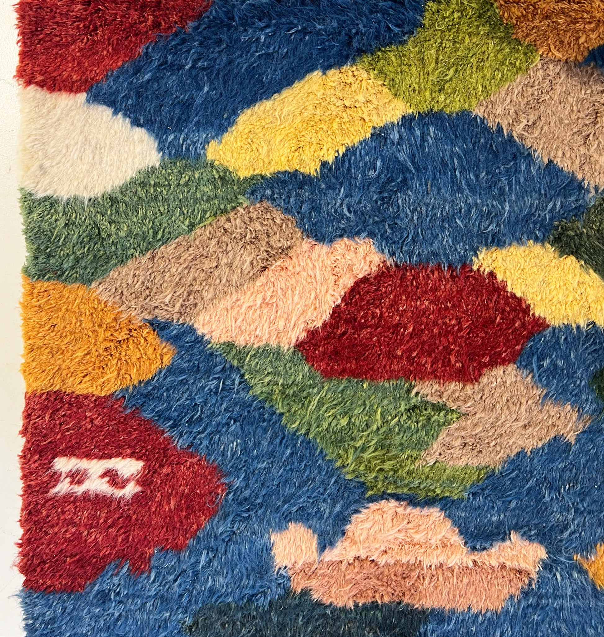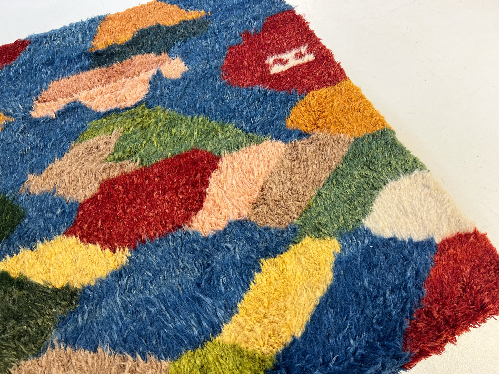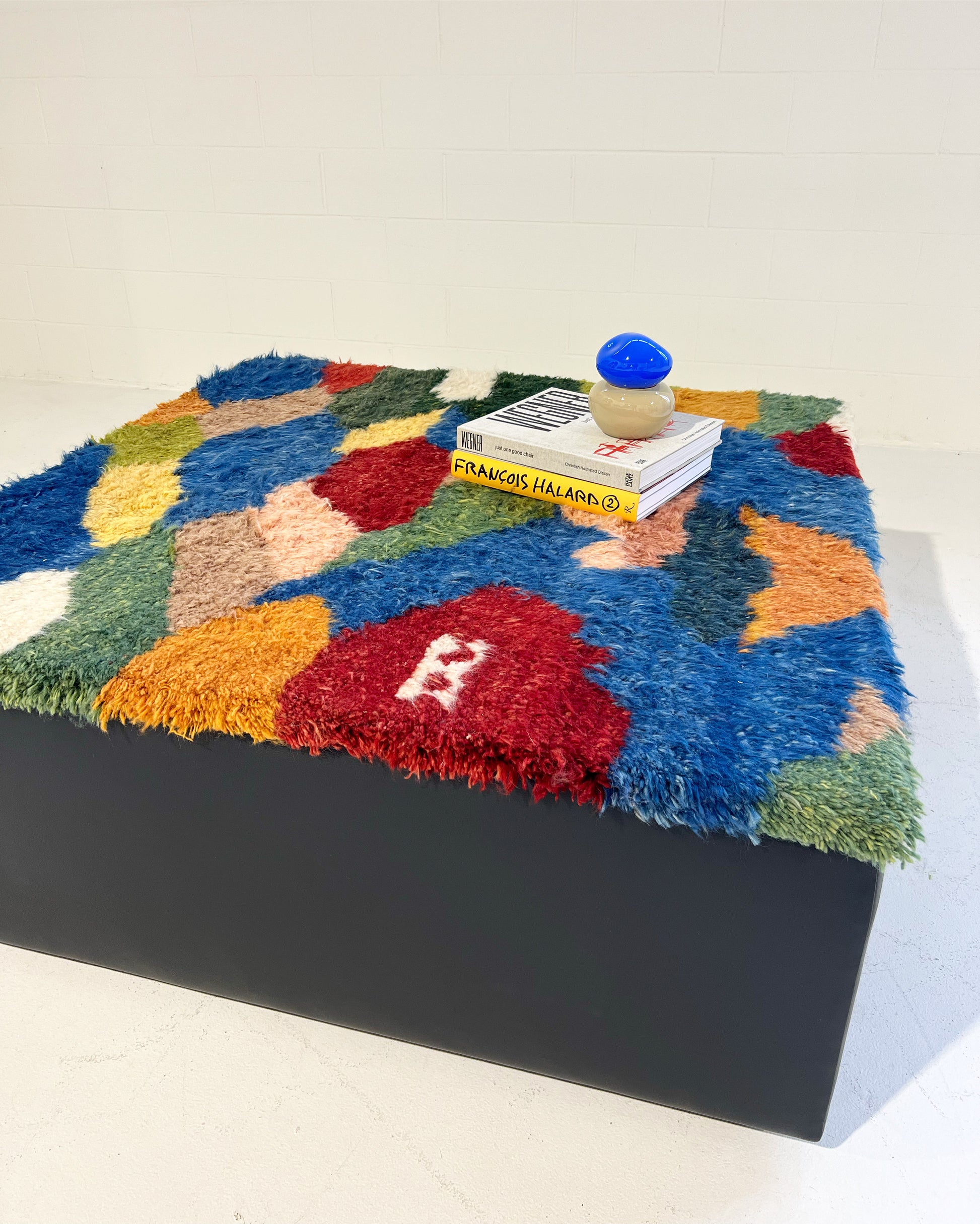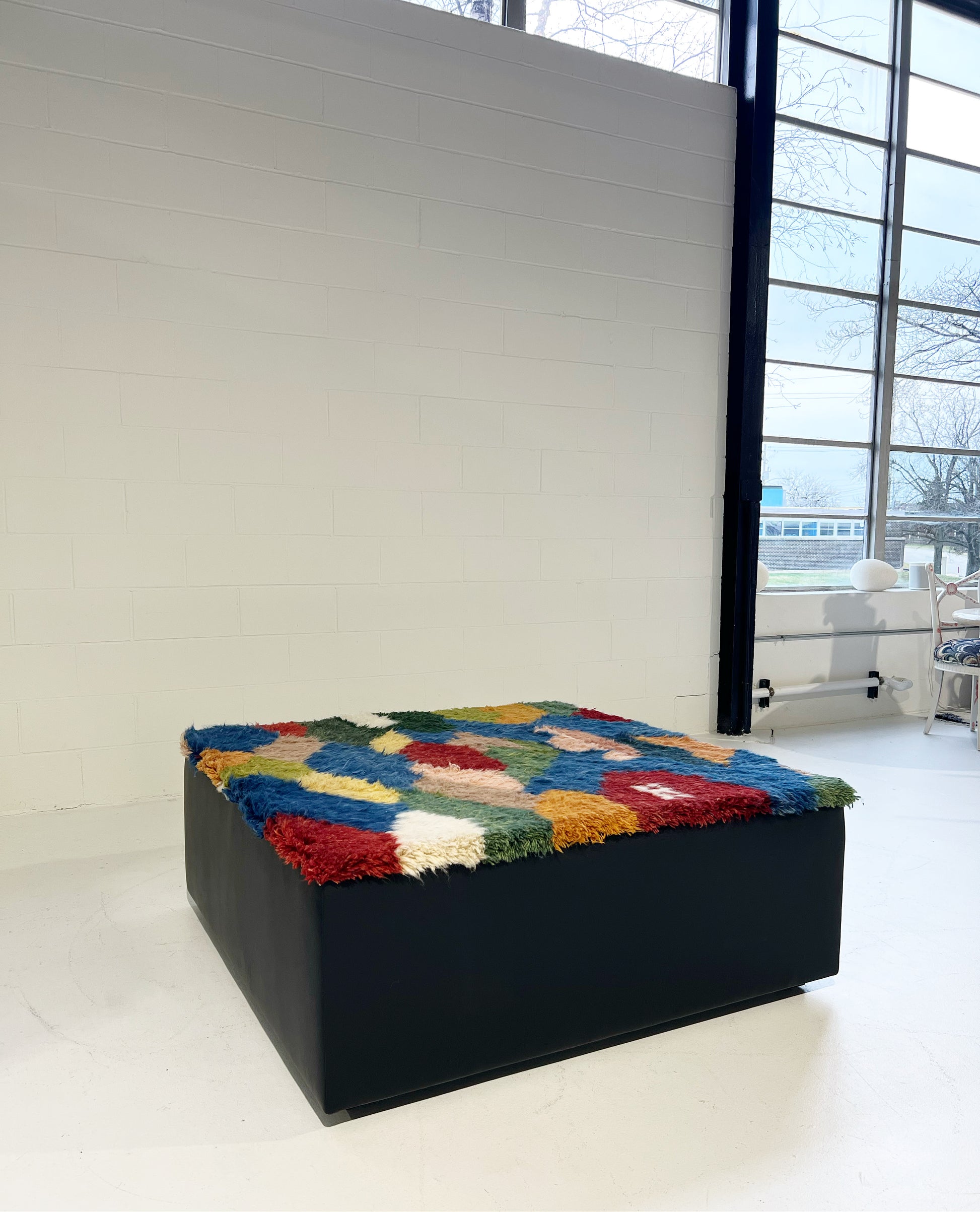 A one-of-a-kind ottoman designed by Forsyth and beautifully handmade using a vintage Iranian gabbeh rug (100% hand-spun sheep wool). The rug is finished with luxurious Italian black leather sides. The perfect coffee table, ottoman, or extra seating.