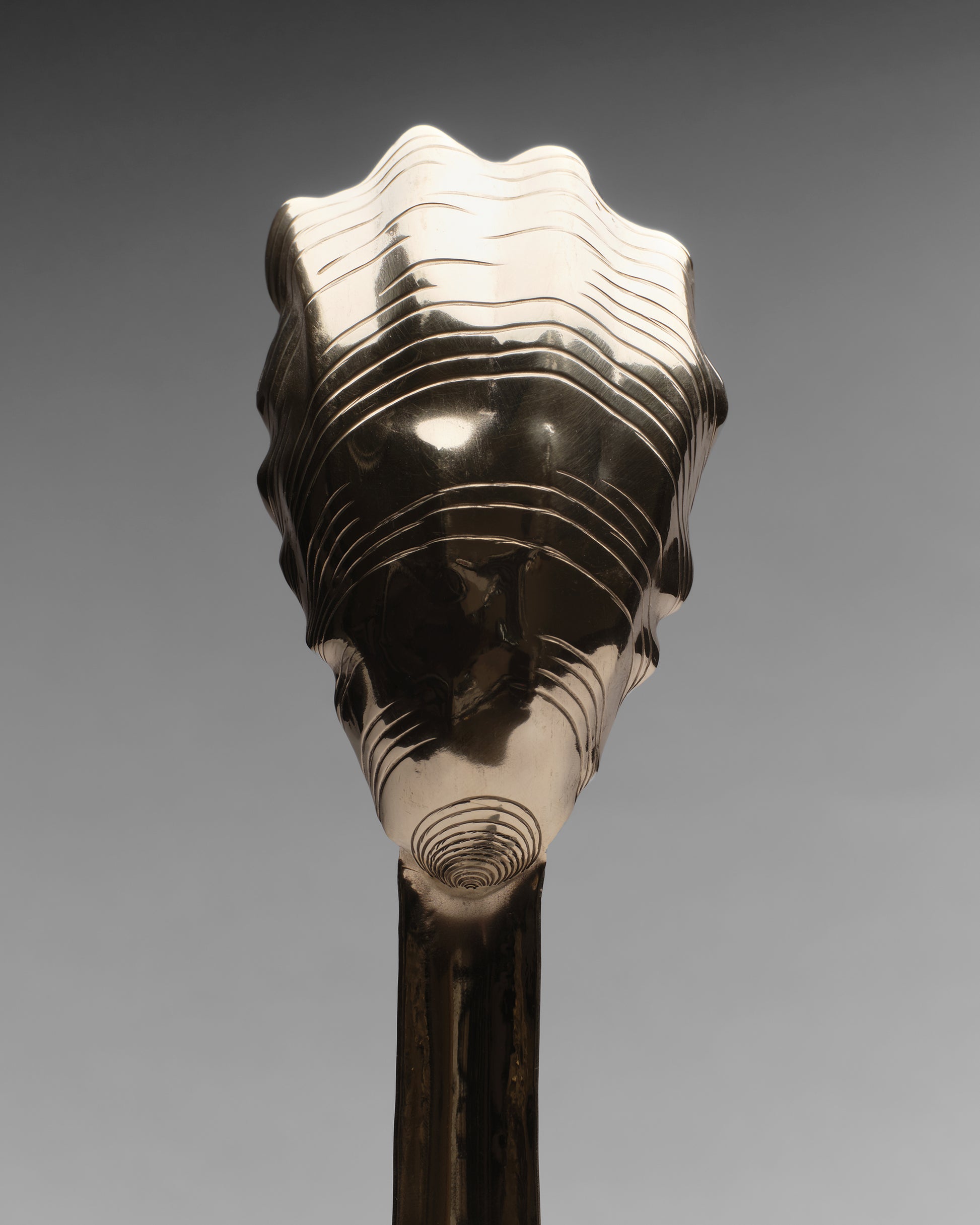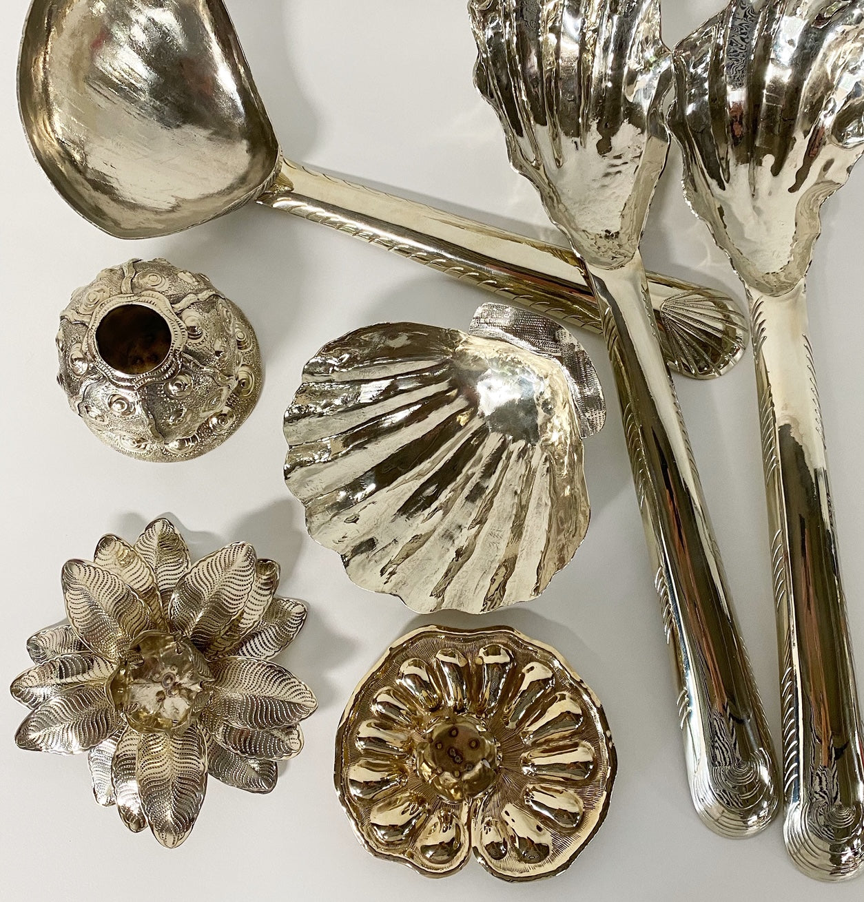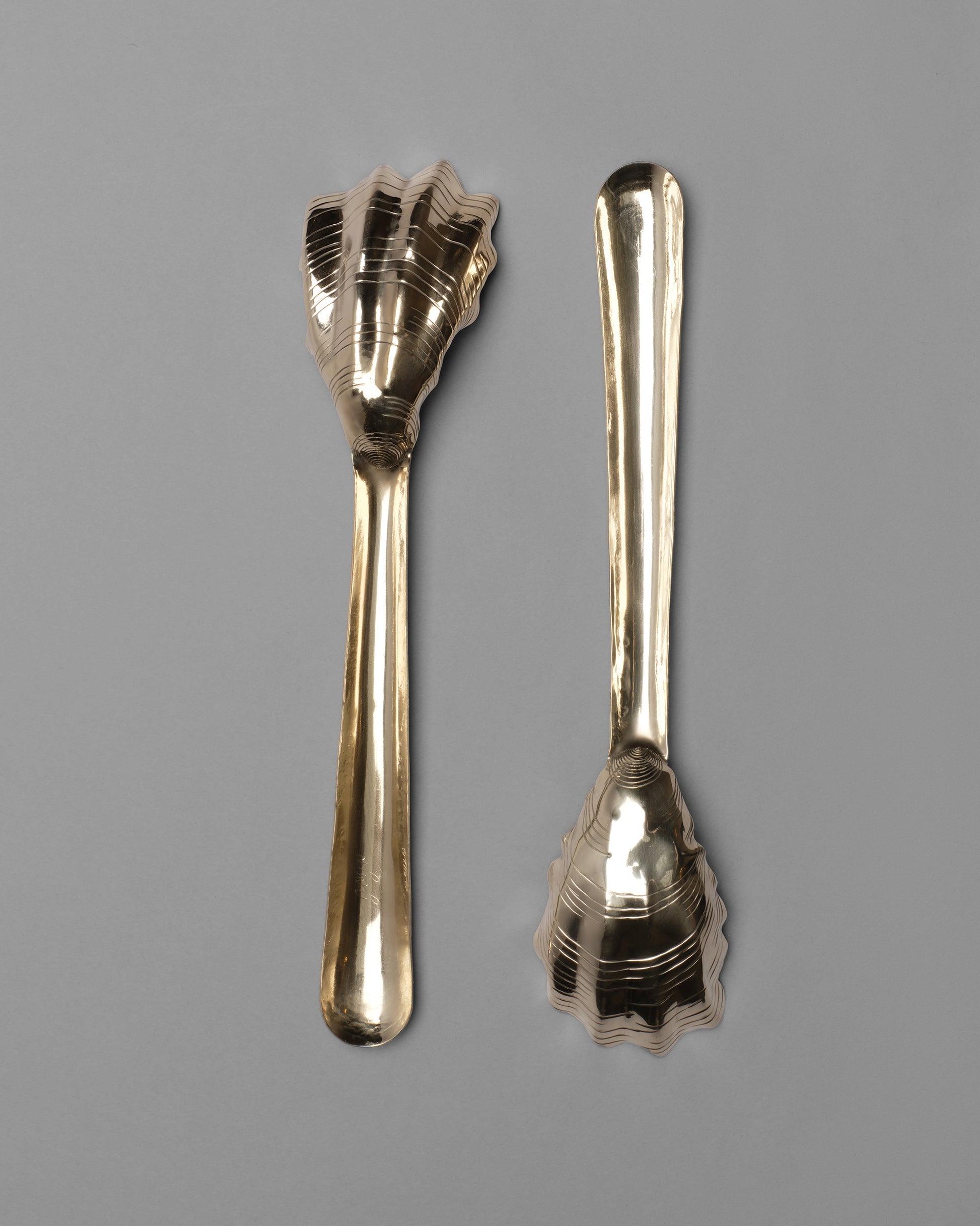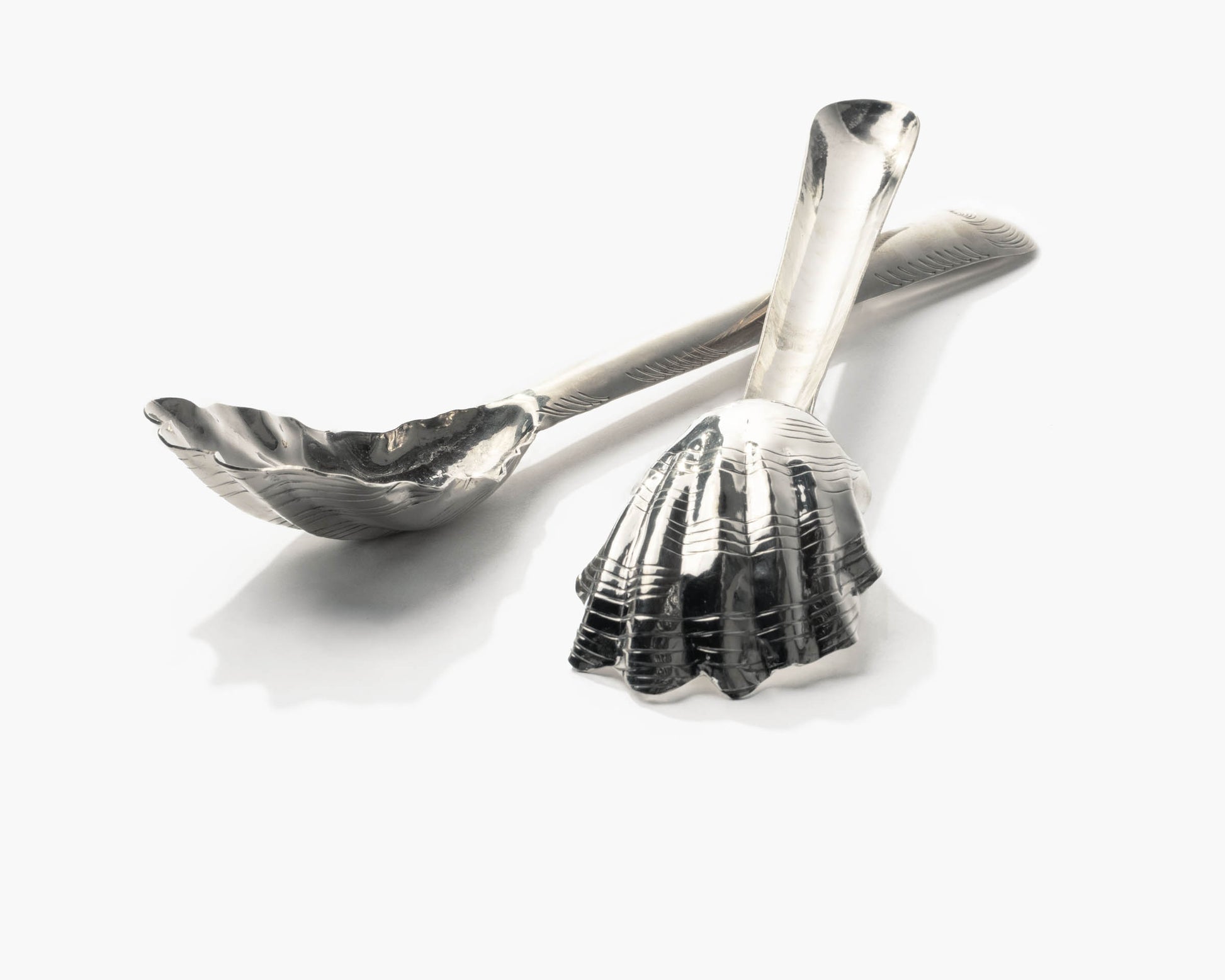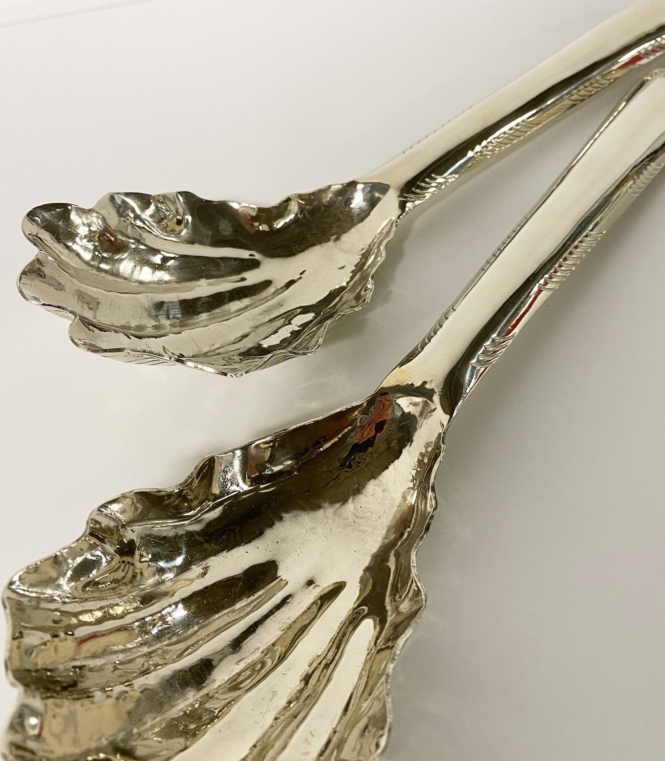 This beautiful serving set is hand forged in Mexican silver alloy known as Alpaca. These are not only aesthetically elegant as servers, the idea that these shells were used for thousands of years for the same utilitarian purpose by the indigenous Tumucua Native Americans is something special.