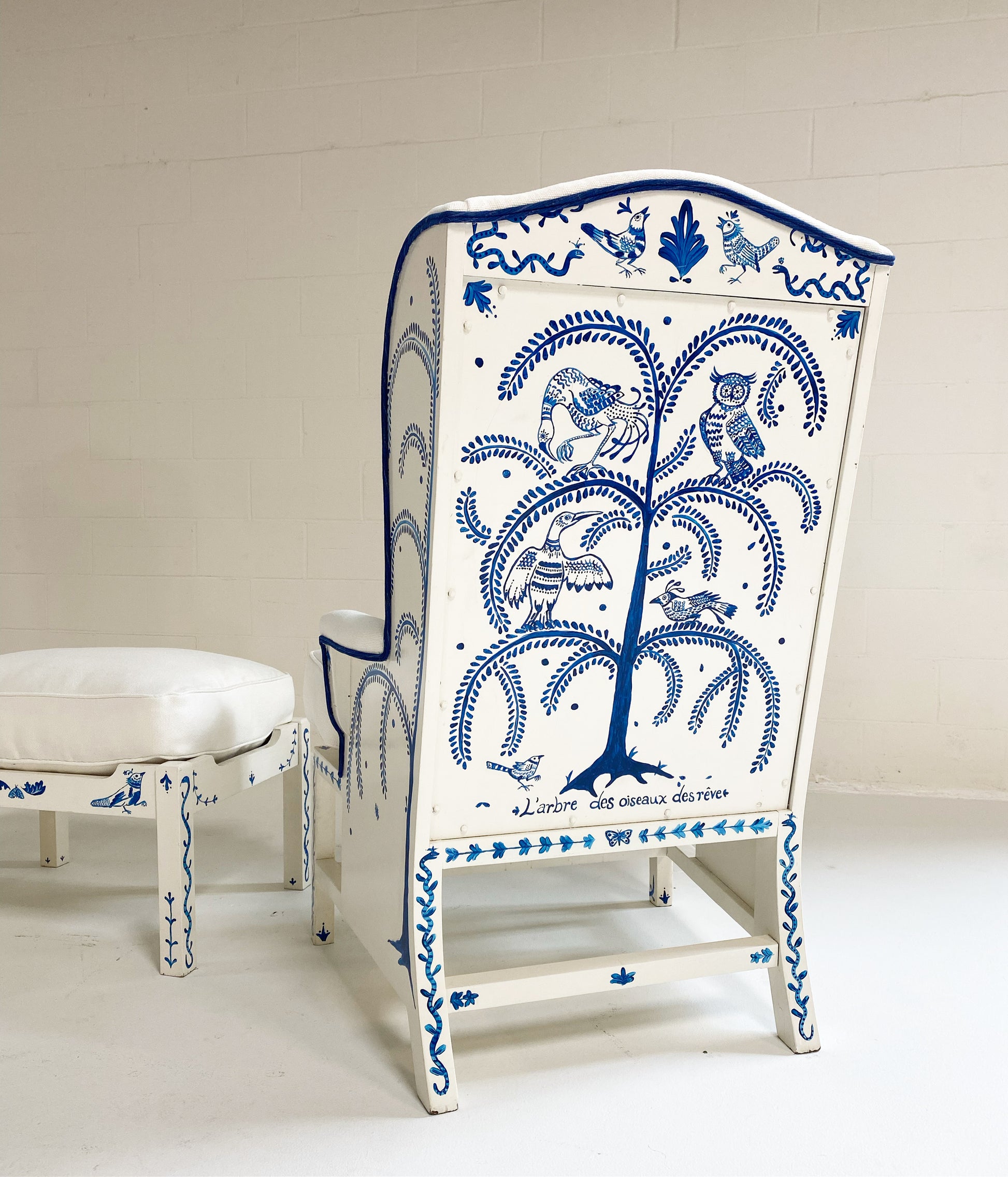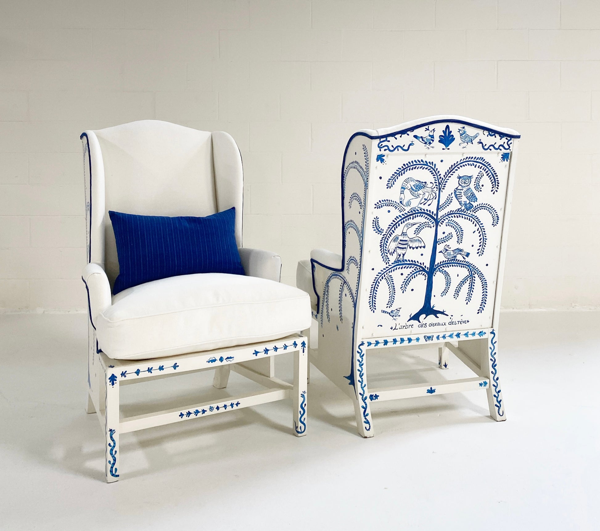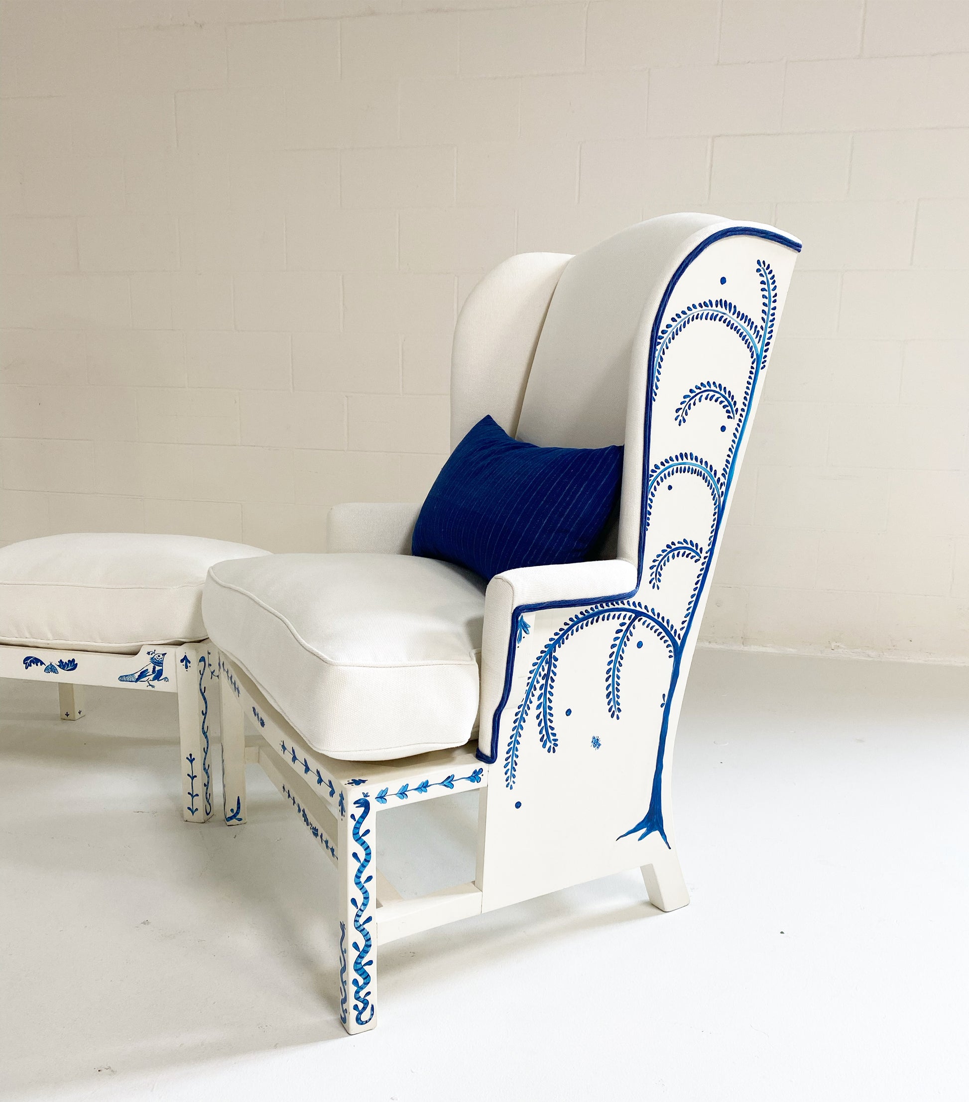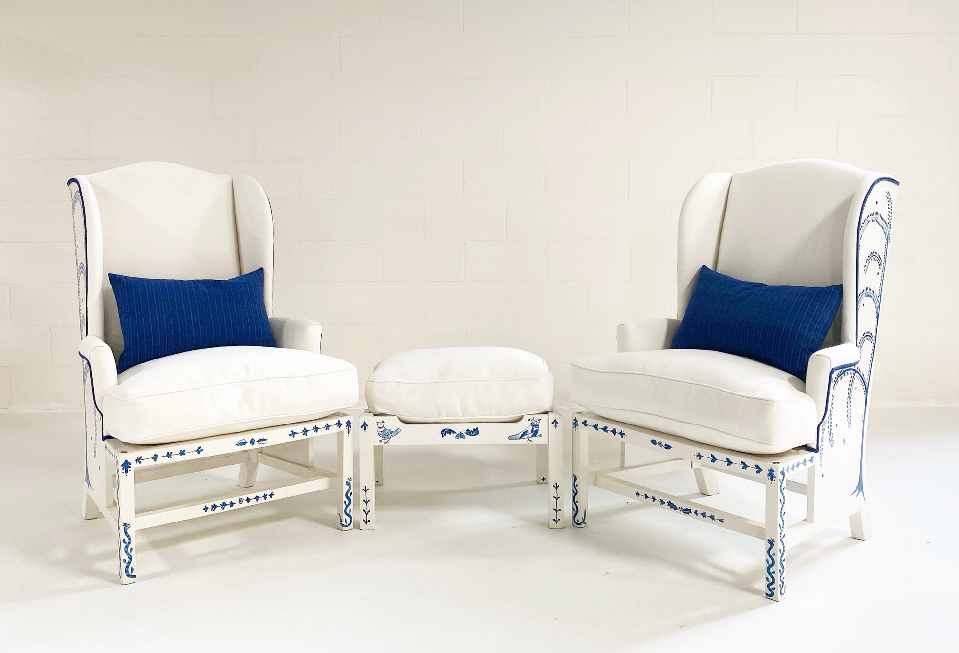 One day as we were collecting images for our weekly Saturday Marnin Cartoons email, we came across a beautiful image of a little old lady hand-painting the outside of her small cottage with blue floral designs. It stuck with us. When we began selling the darling hand-painted ceramics of artist Maggie Robertson, we knew one day we wanted her to hand-paint furniture for us to evoke the same charm and detail as seen in that image. There is something so special about a hand-painted chair. We collected this classic wingback set and knew this was the perfect canvas for Maggie to work her magic. To begin, each chair and the ottoman were stripped and painted a beautiful ivory color. Maggie then painted one of her signature motifs, The Tree of Dream Birds, on each chair. For the upholstery, we chose a chic heavy weight linen in bone by Rose Uniacke. Each seat cushion and ottoman cushion is 100% feather-filled. Finishing the upholstery is a double welt crafted from vintage indigo fabric to complement the blue painting. A pair of lumbar pillows in the same indigo fabric add the perfect touch. These are truly one of a kind and destined for a very special home.