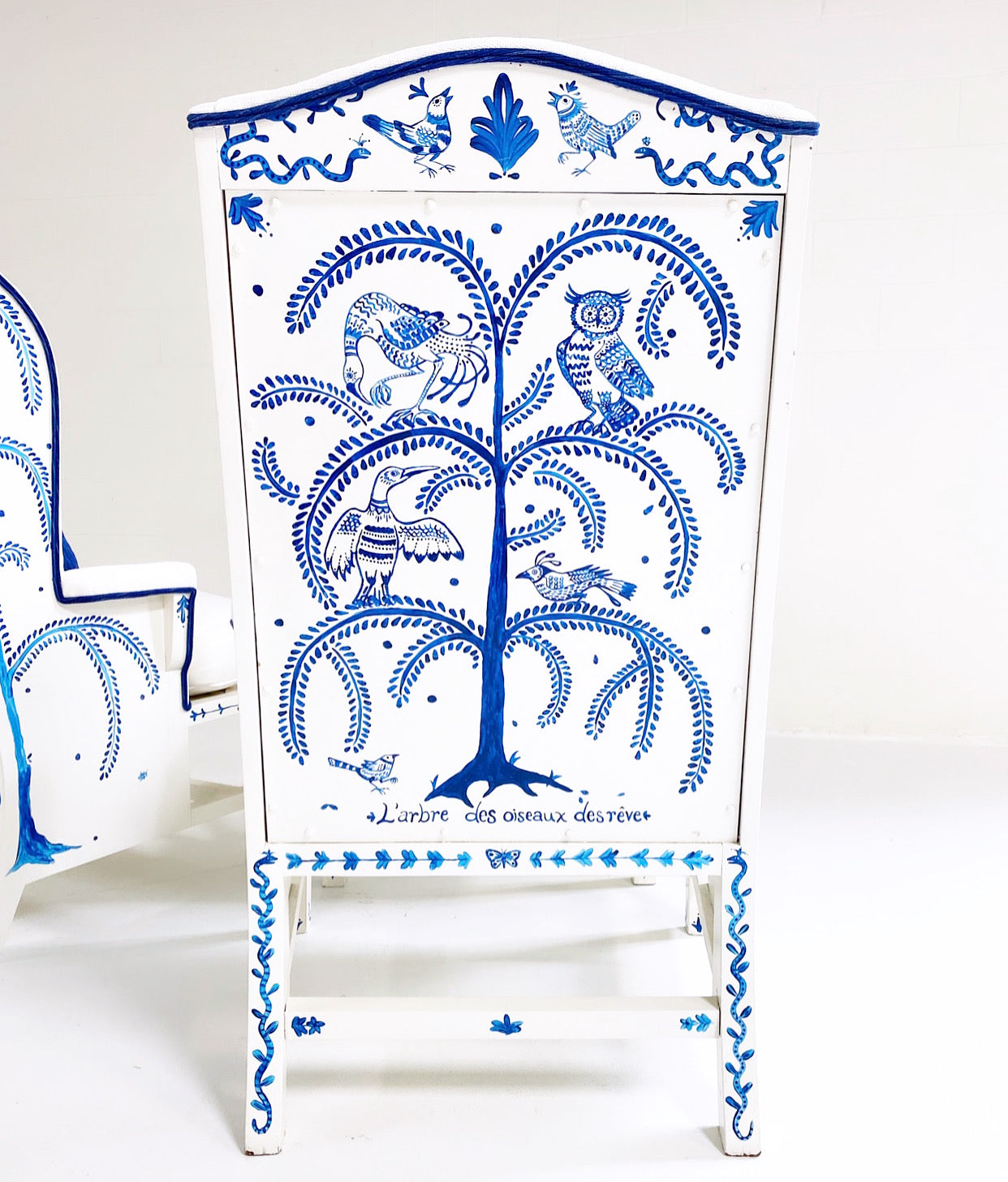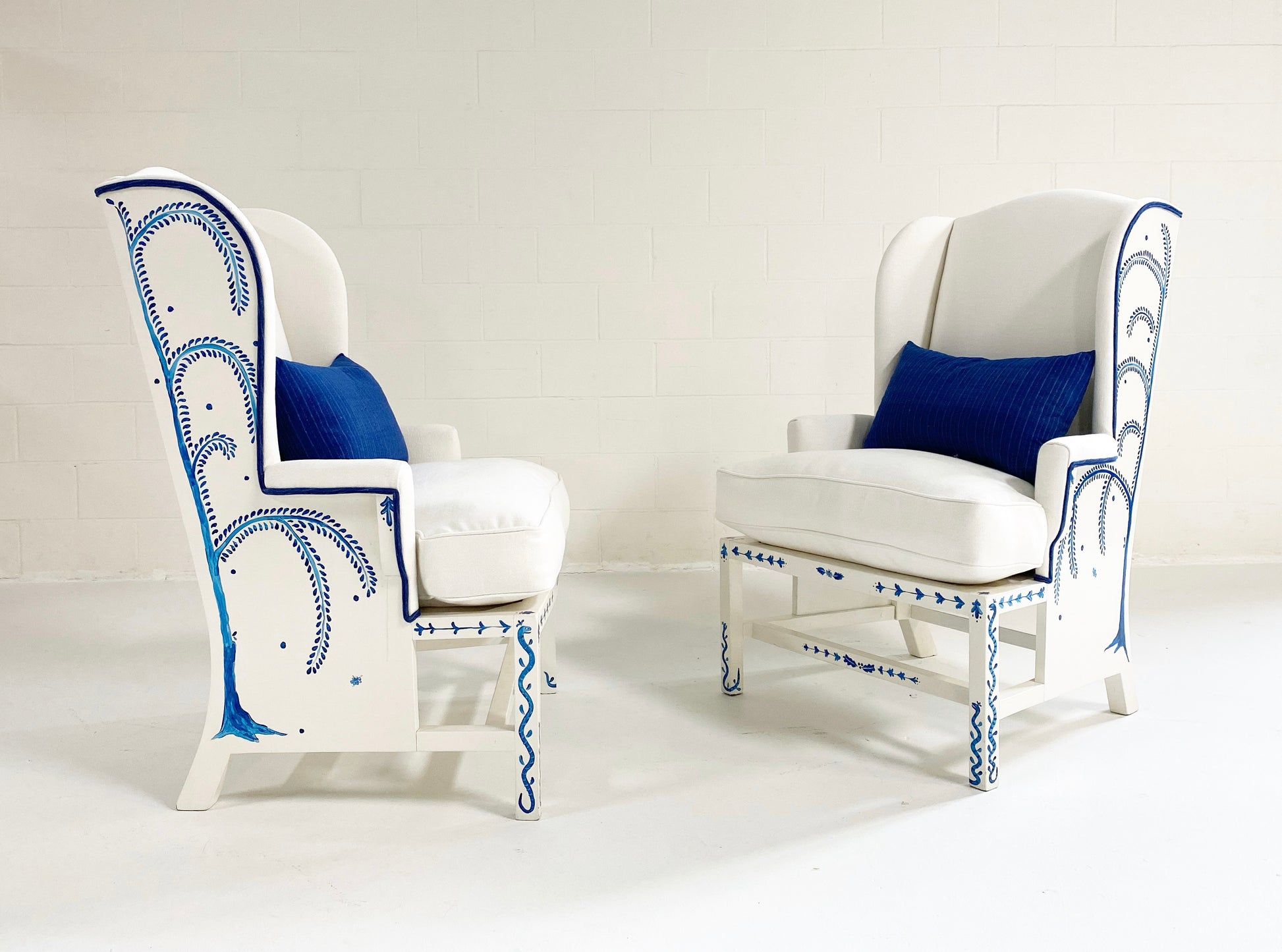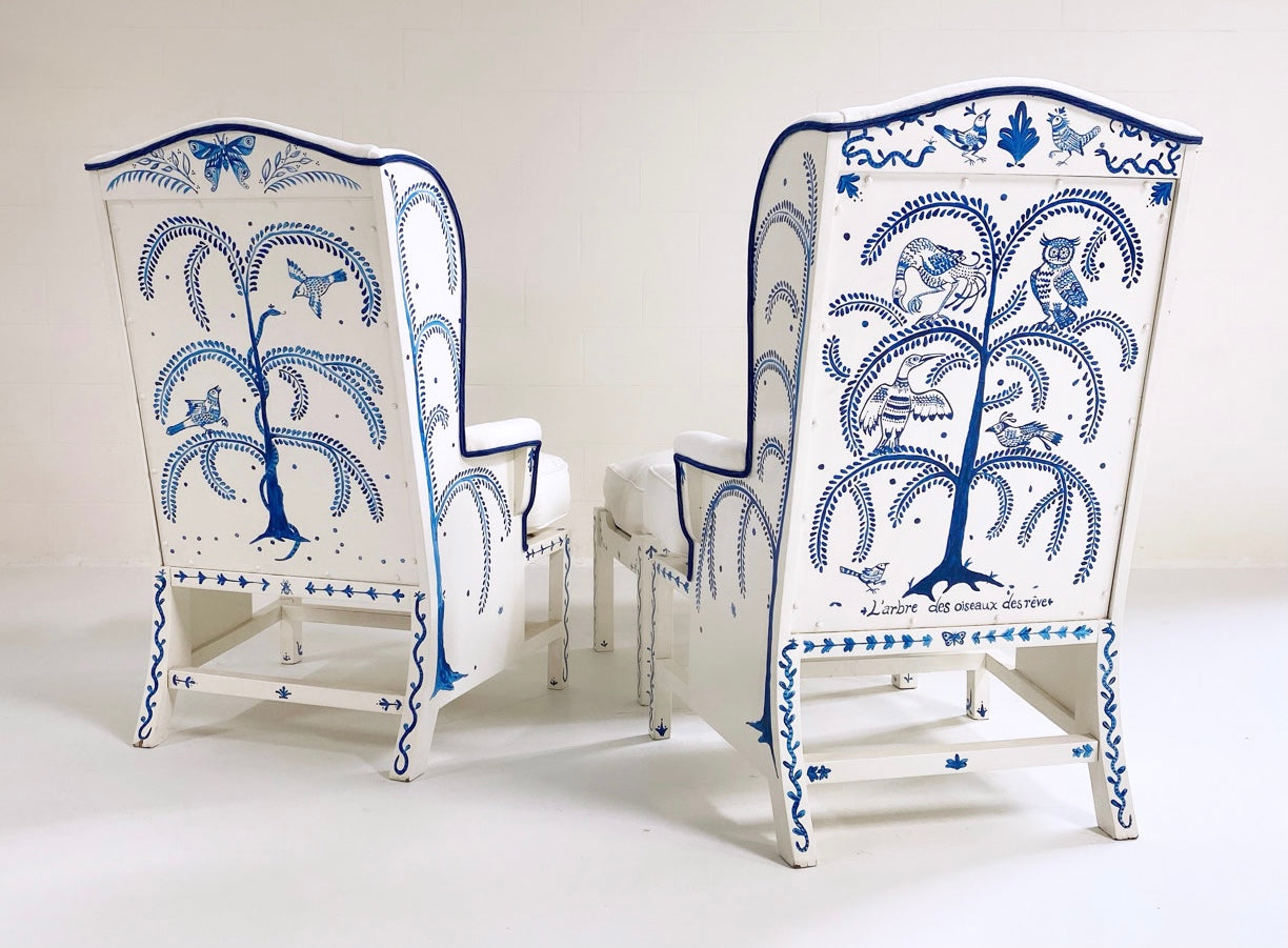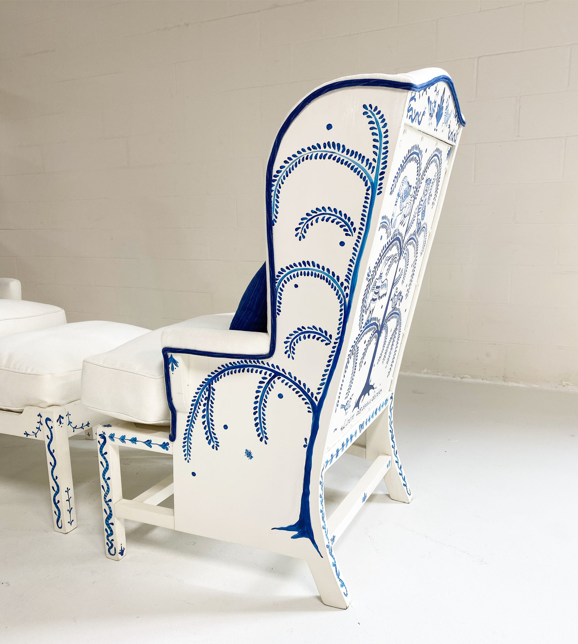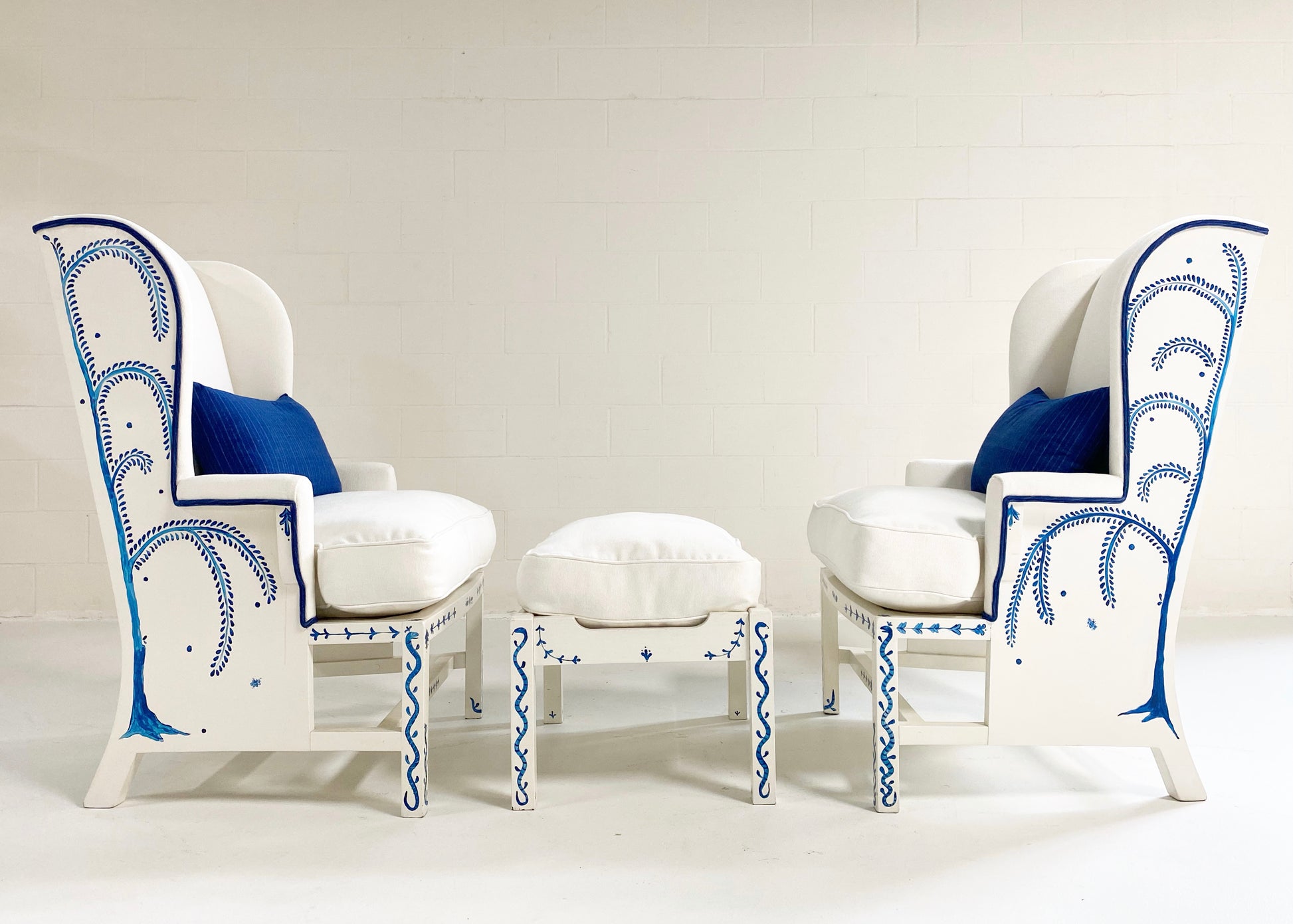 One day as we were collecting images for our weekly Saturday Marnin Cartoons email, we came across a beautiful image of a little old lady hand-painting the outside of her small cottage with blue floral designs. It stuck with us. When we began selling the darling hand-painted ceramics of artist Maggie Robertson, we knew one day we wanted her to hand-paint furniture for us to evoke the same charm and detail as seen in that image. There is something so special about a hand-painted chair. We collected this classic wingback set and knew this was the perfect canvas for Maggie to work her magic. To begin, each chair and the ottoman were stripped and painted a beautiful ivory color. Maggie then painted one of her signature motifs, The Tree of Dream Birds, on each chair. For the upholstery, we chose a chic heavy weight linen in bone by Rose Uniacke. Each seat cushion and ottoman cushion is 100% feather-filled. Finishing the upholstery is a double welt crafted from vintage indigo fabric to complement the blue painting. A pair of lumbar pillows in the same indigo fabric add the perfect touch. These are truly one of a kind and destined for a very special home.