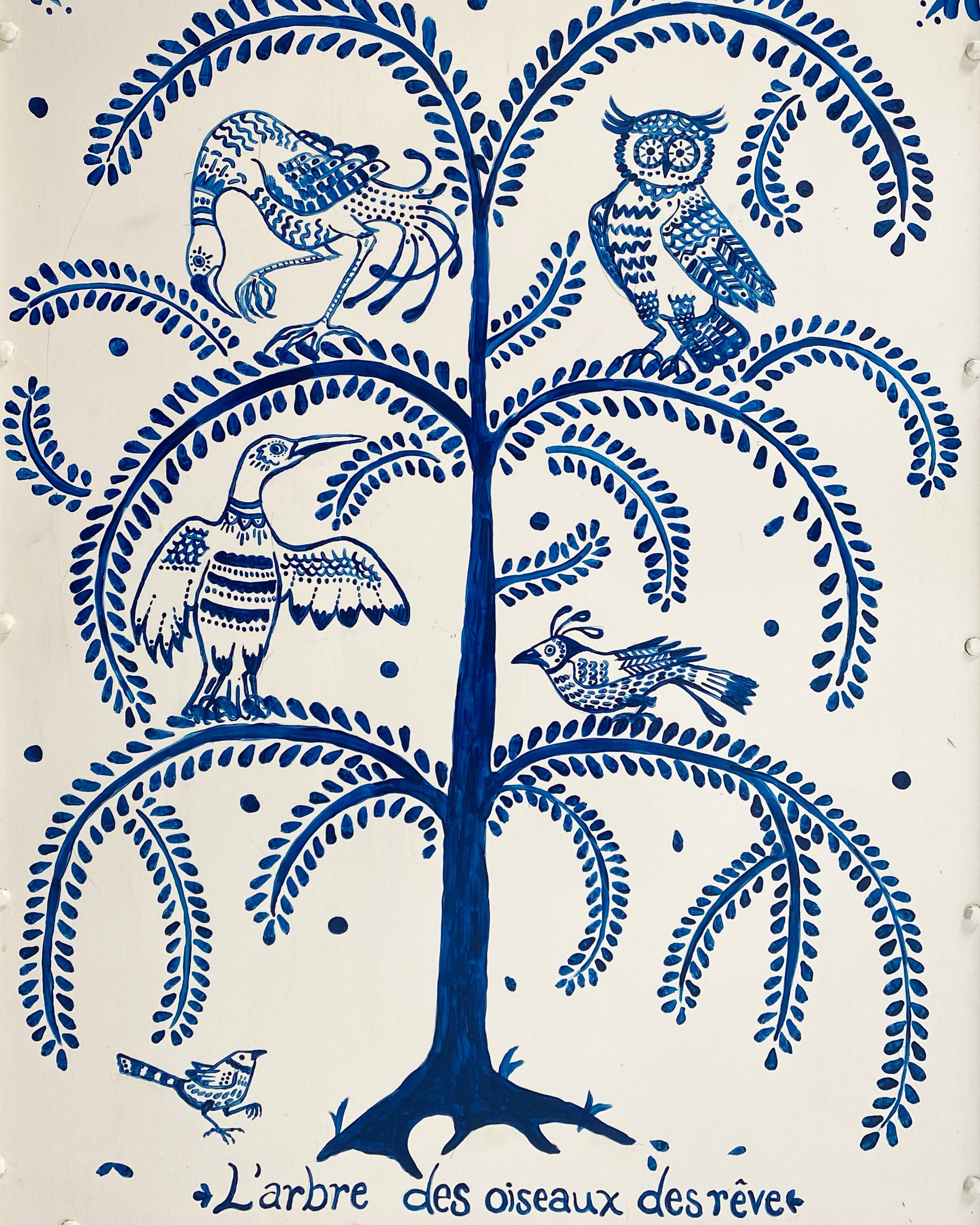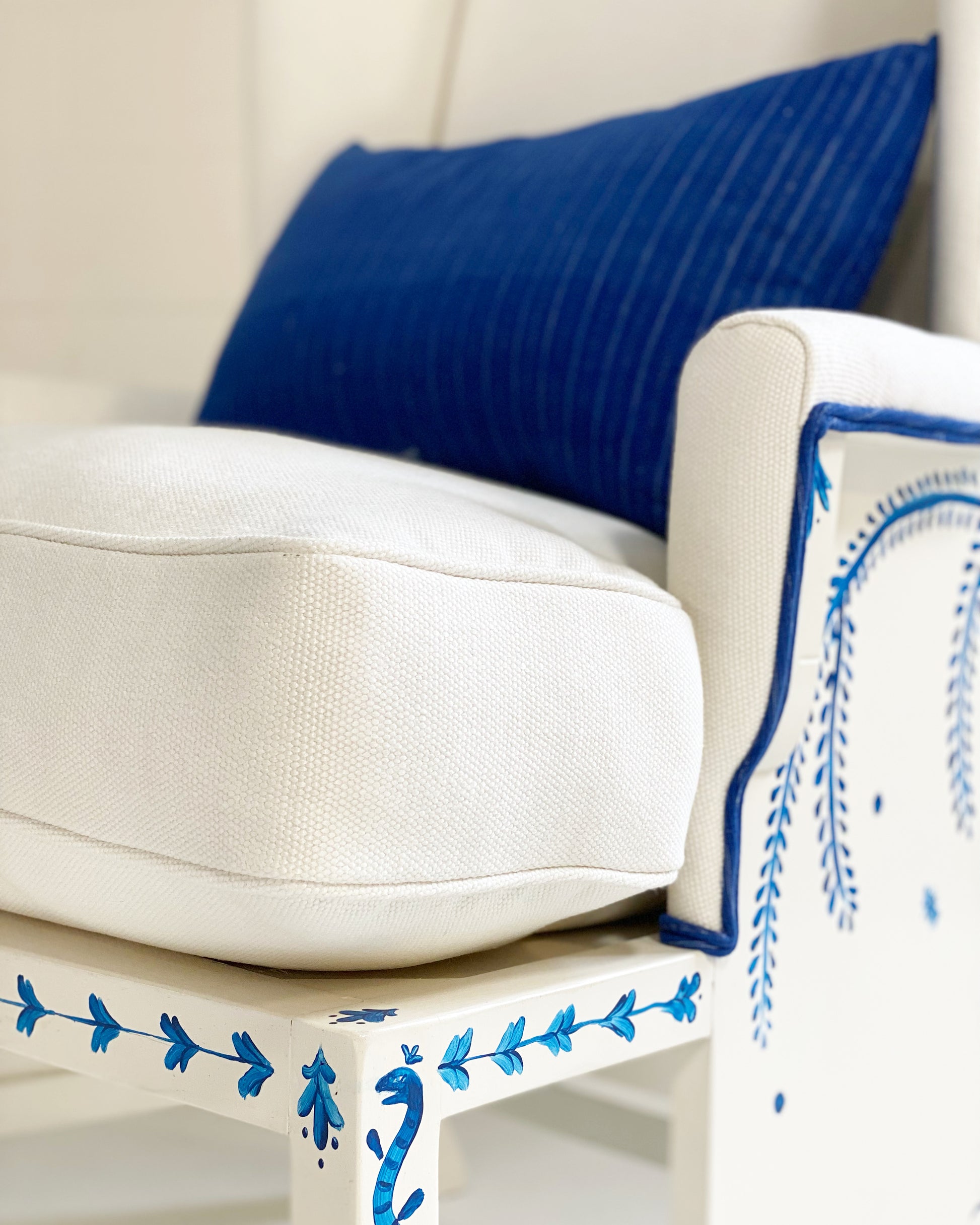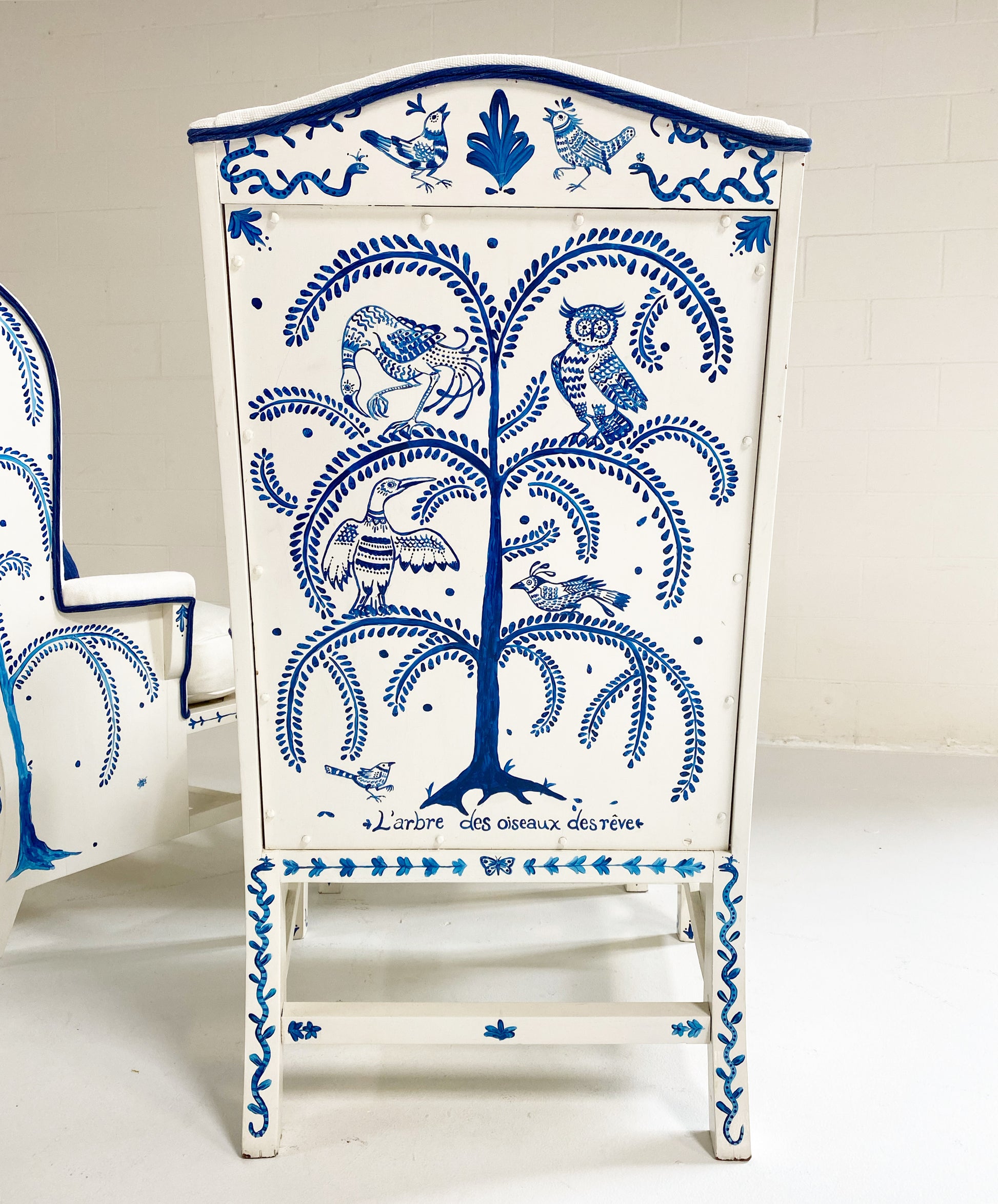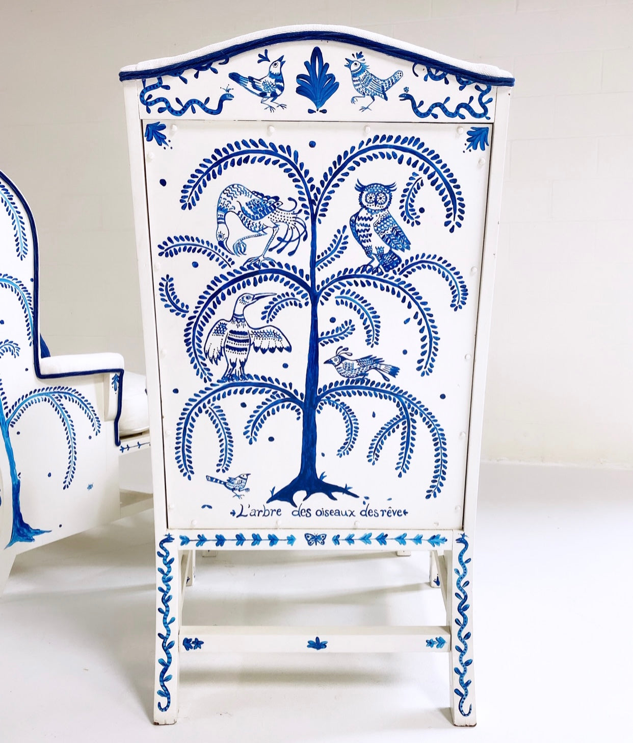 One day as we were collecting images for our weekly Saturday Marnin Cartoons email, we came across a beautiful image of a little old lady hand-painting the outside of her small cottage with blue floral designs. It stuck with us. When we began selling the darling hand-painted ceramics of artist Maggie Robertson, we knew one day we wanted her to hand-paint furniture for us to evoke the same charm and detail as seen in that image. There is something so special about a hand-painted chair. We collected this classic wingback set and knew this was the perfect canvas for Maggie to work her magic. To begin, each chair and the ottoman were stripped and painted a beautiful ivory color. Maggie then painted one of her signature motifs, The Tree of Dream Birds, on each chair. For the upholstery, we chose a chic heavy weight linen in bone by Rose Uniacke. Each seat cushion and ottoman cushion is 100% feather-filled. Finishing the upholstery is a double welt crafted from vintage indigo fabric to complement the blue painting. A pair of lumbar pillows in the same indigo fabric add the perfect touch. These are truly one of a kind and destined for a very special home.