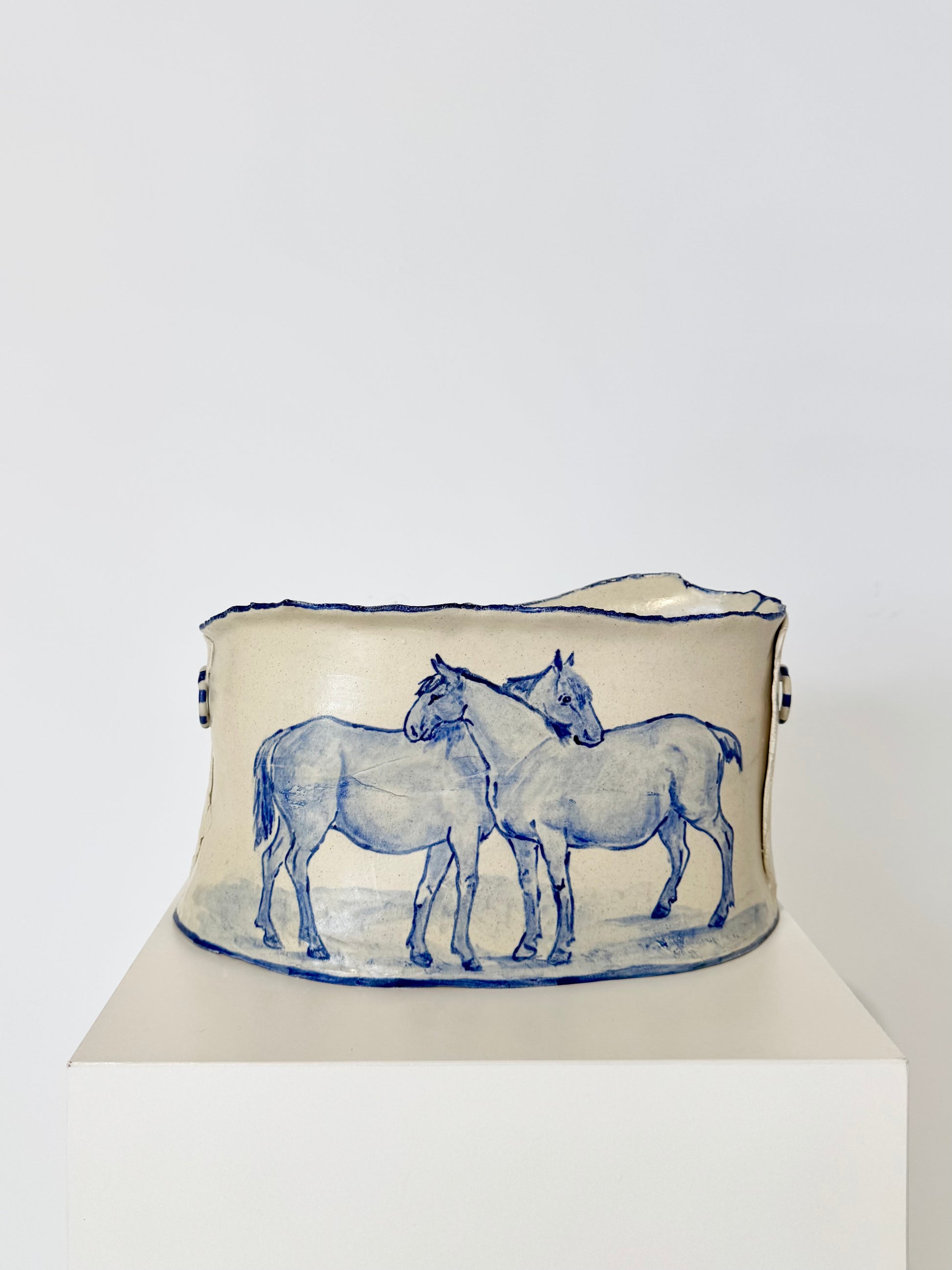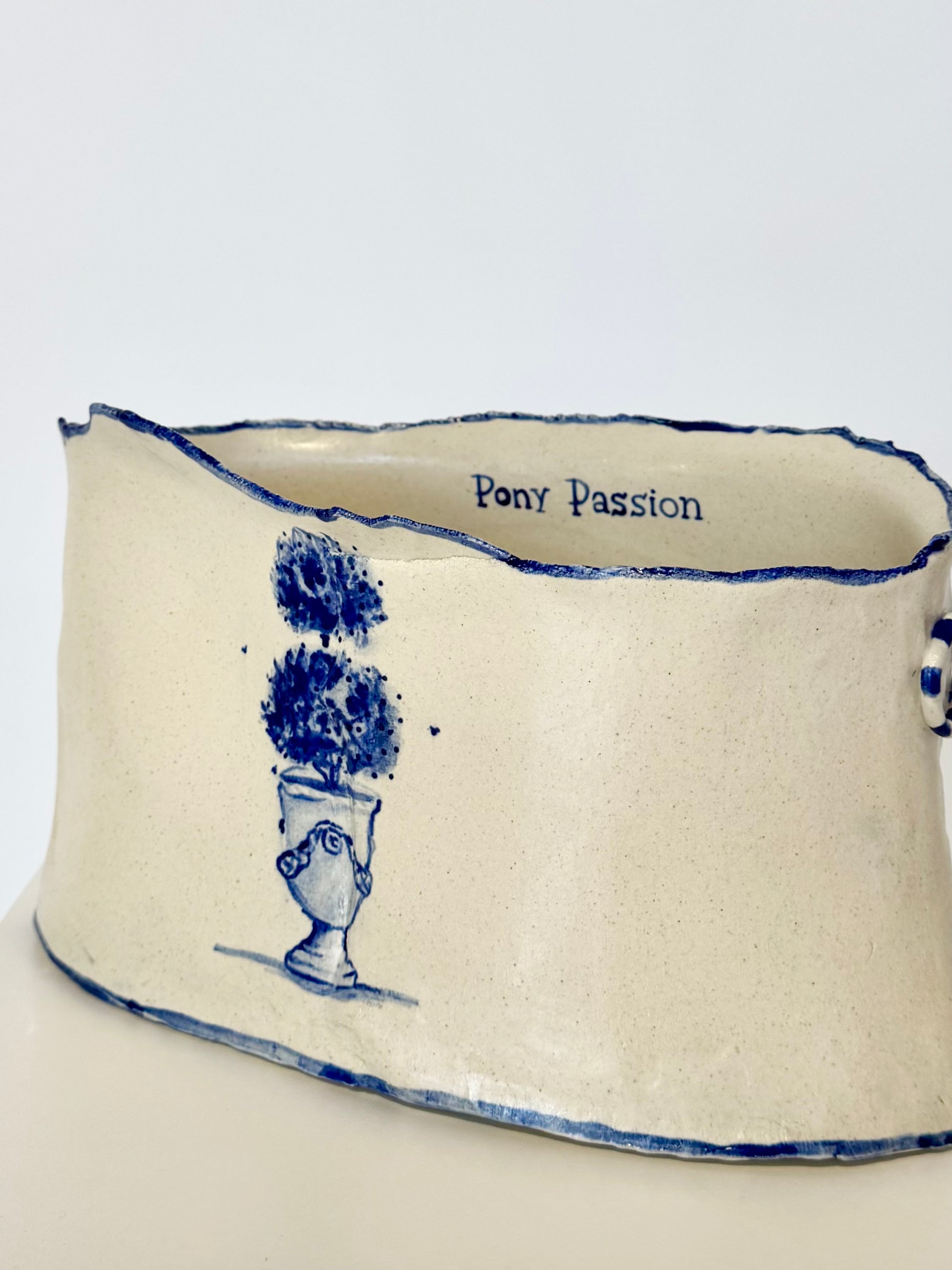 The Country Gentleman Collection by artist Maggie Robertson is a beautiful series of one-of-a-kind stoneware vessels. Each unique piece embraces the seams and irregularities of her hand-built technique complemented by intricate, hand-painted scenes of the English countryside in classic blue and white. The vessels are water tight and food safe, microwaveable and dishwasher safe; however, as they are art pieces and fragile, we would recommend hand washing.