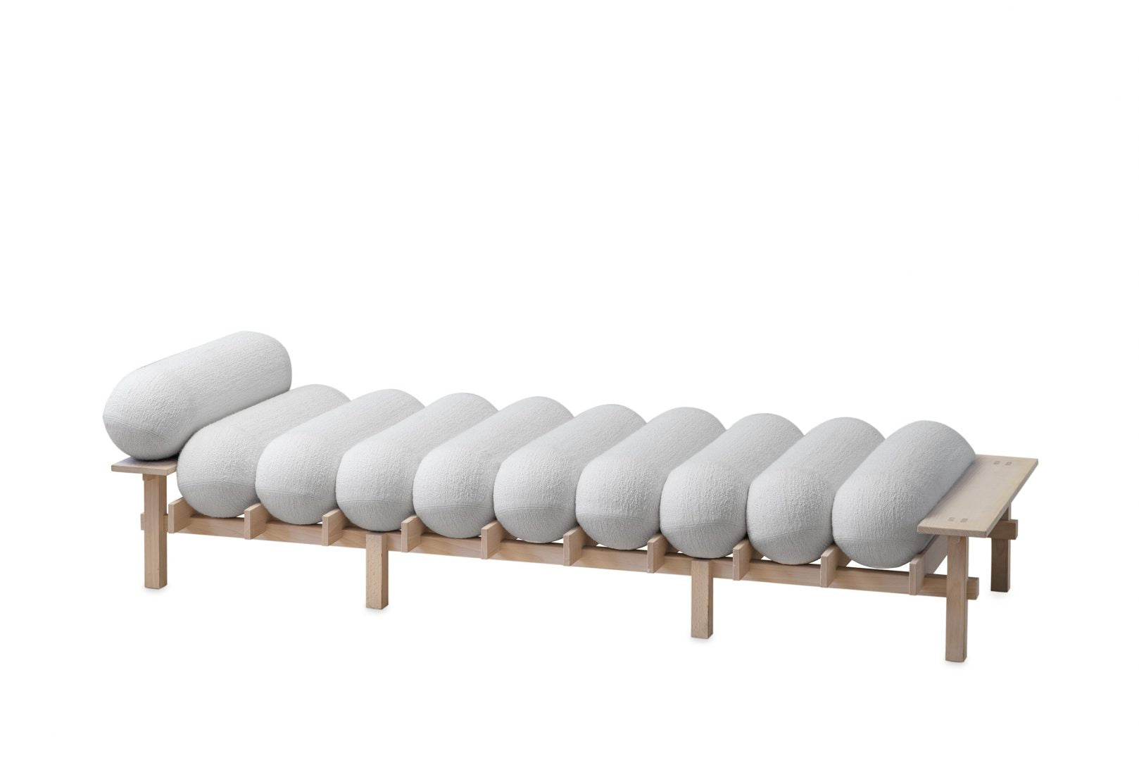 Daybed with the frame structure in solid natural beech. Upholstered mattress of joined cylinder-shaped cushions (reversible).