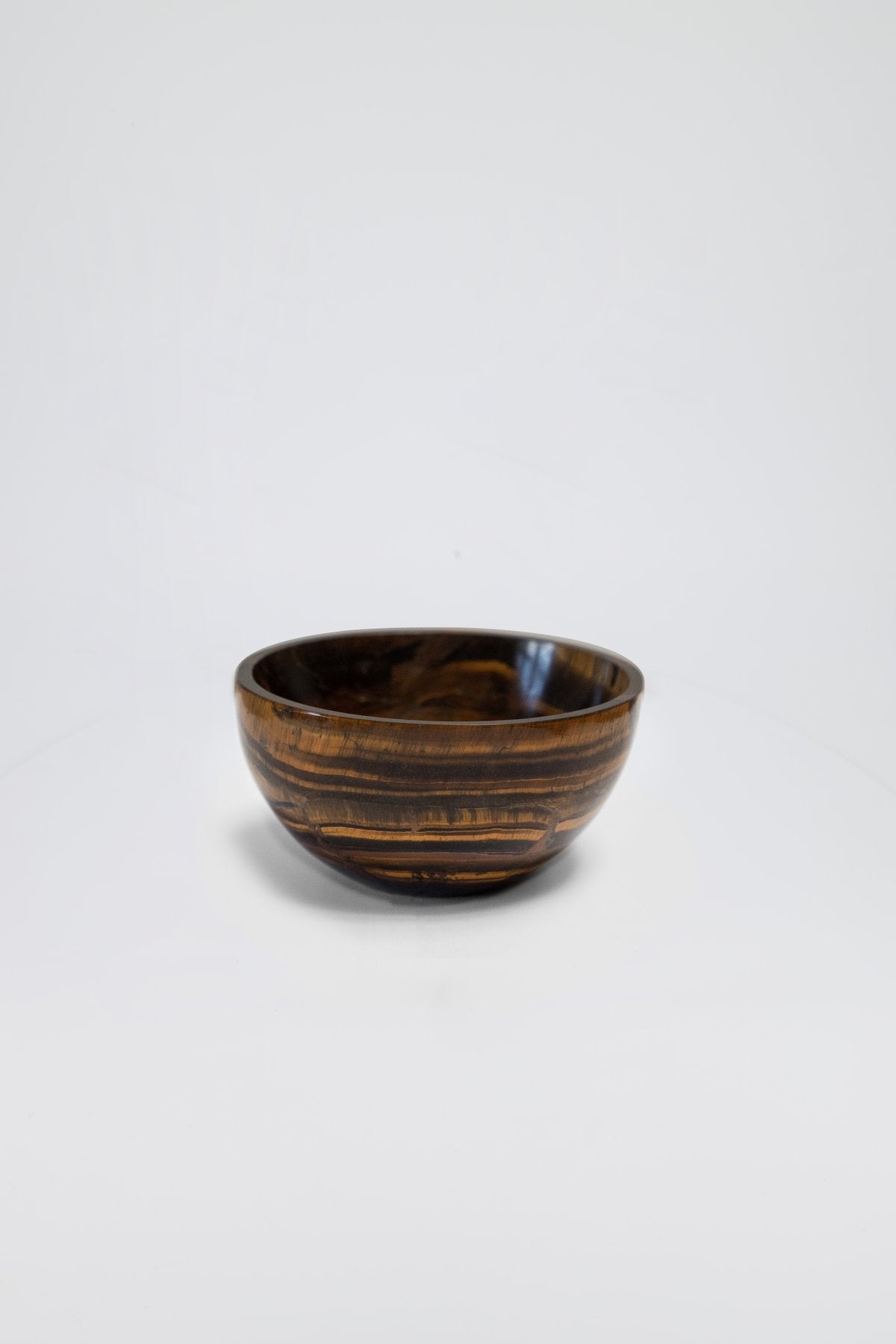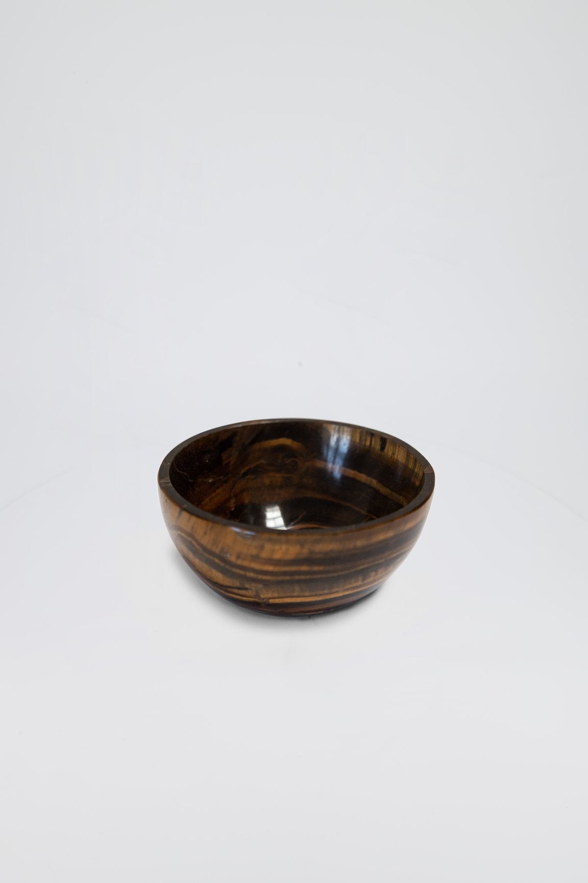 Hand carved bowl from one piece of the semi precious stone, Tiger Eye. Tiger's Eye is said to bring mental clarity, grounding energies, a deeper meditative state and good luck. The bowl explores the full gradient of the captivating hues of the stone. Expect streaks of dark brown, caramel, and golden lustre in each bowl. Due to the nature of the stone, no two bowls are alike. Each bowl is unique due to variances within the stone and the fact that they are hand made.