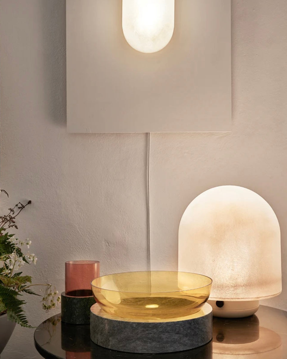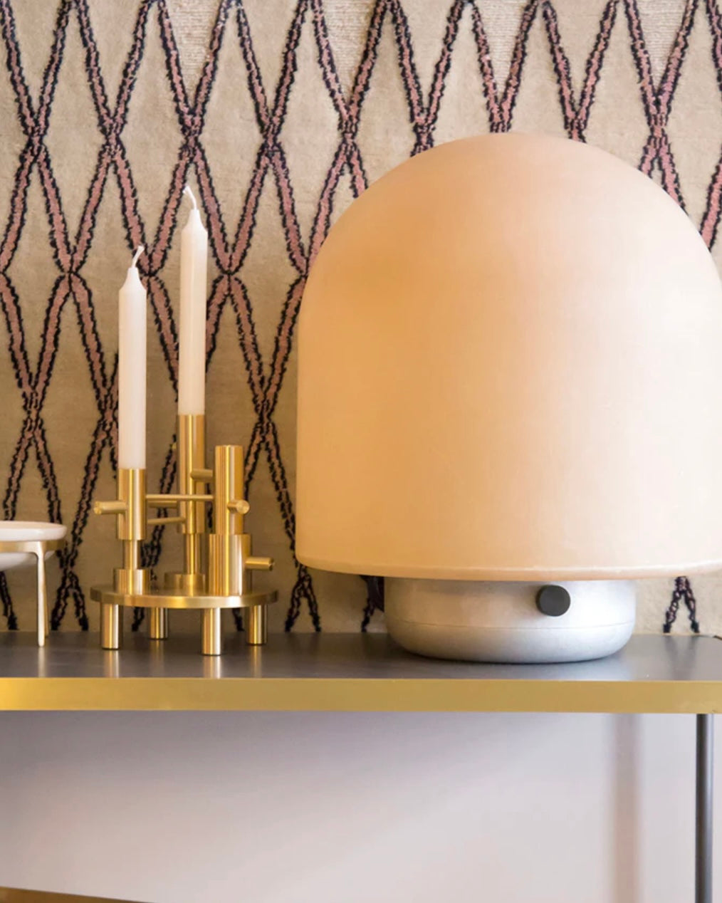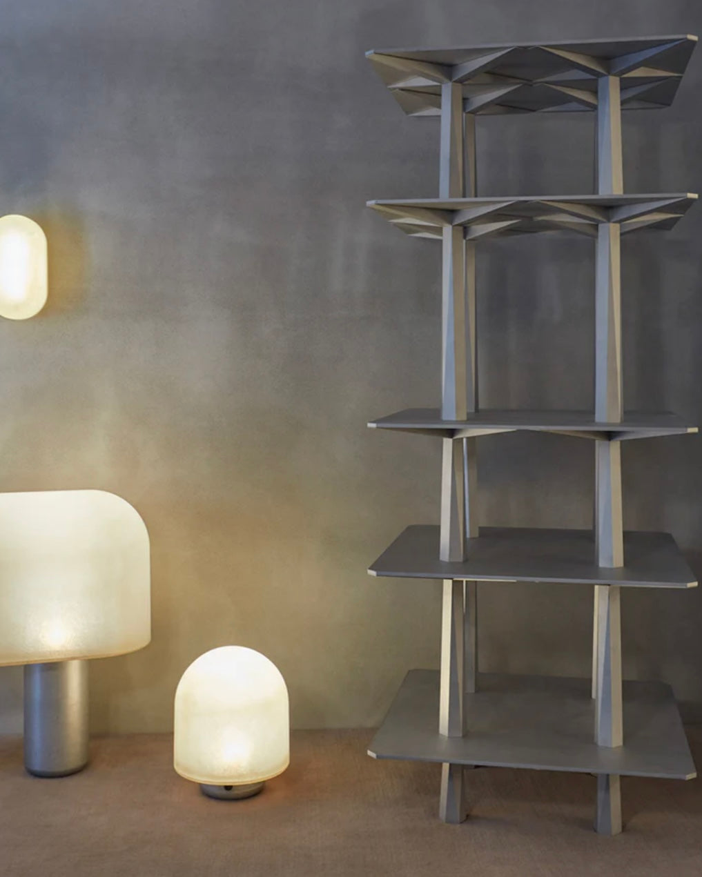 Puffball, a collection of minimal lamps, draws inspiration from the rounded caps and columned stalks of wild mushrooms and toadstools. The chunky silhouettes, made of raw fiberglass and tumbled or painted aluminum, give off a warm luminescent glow.